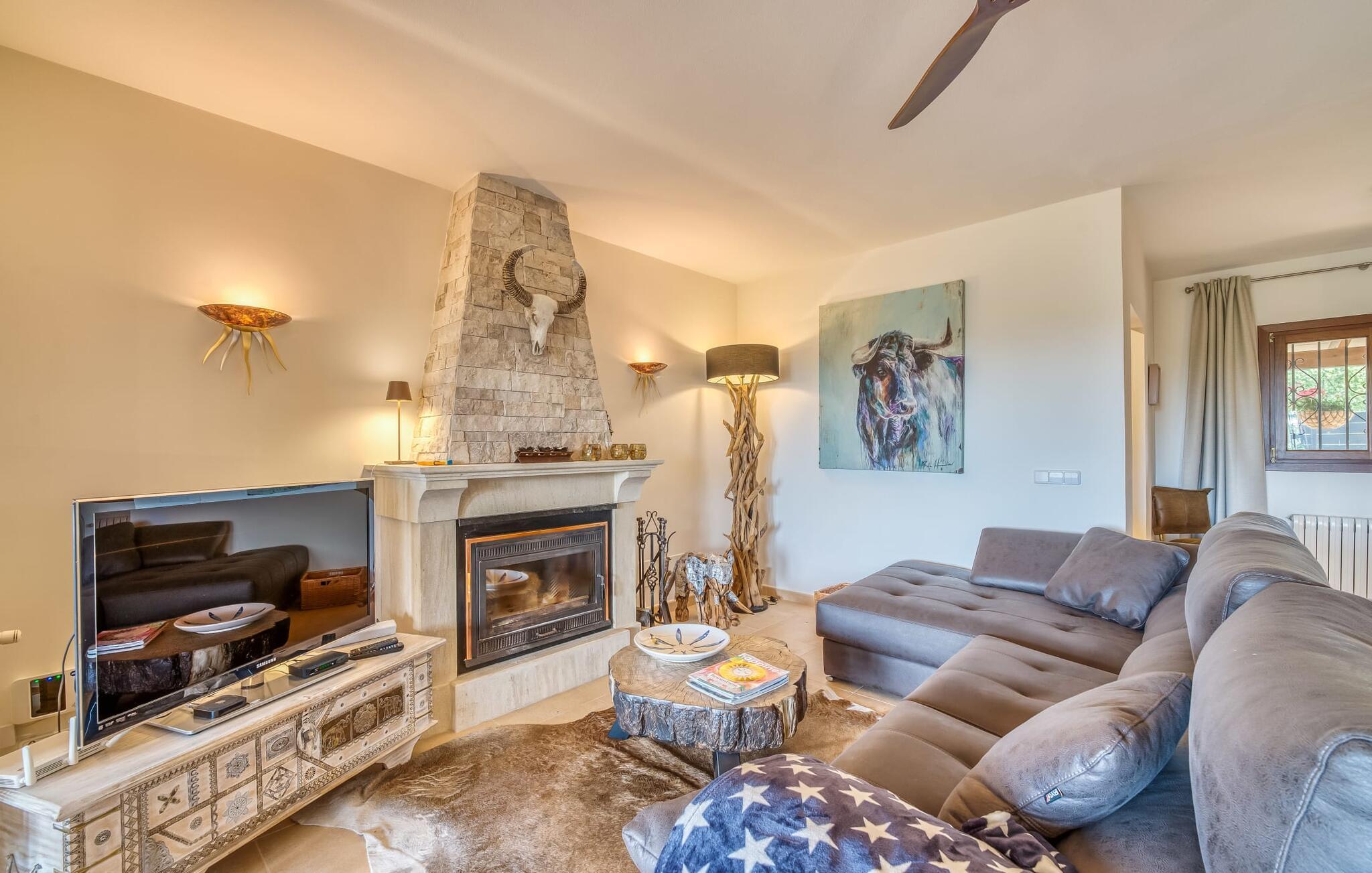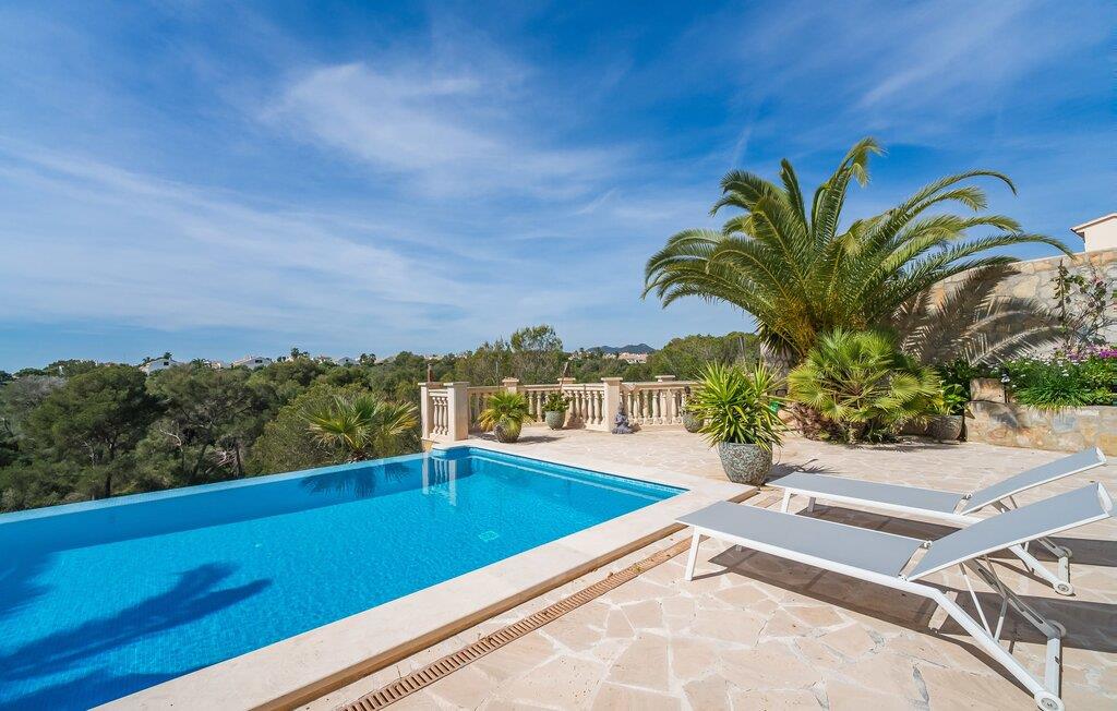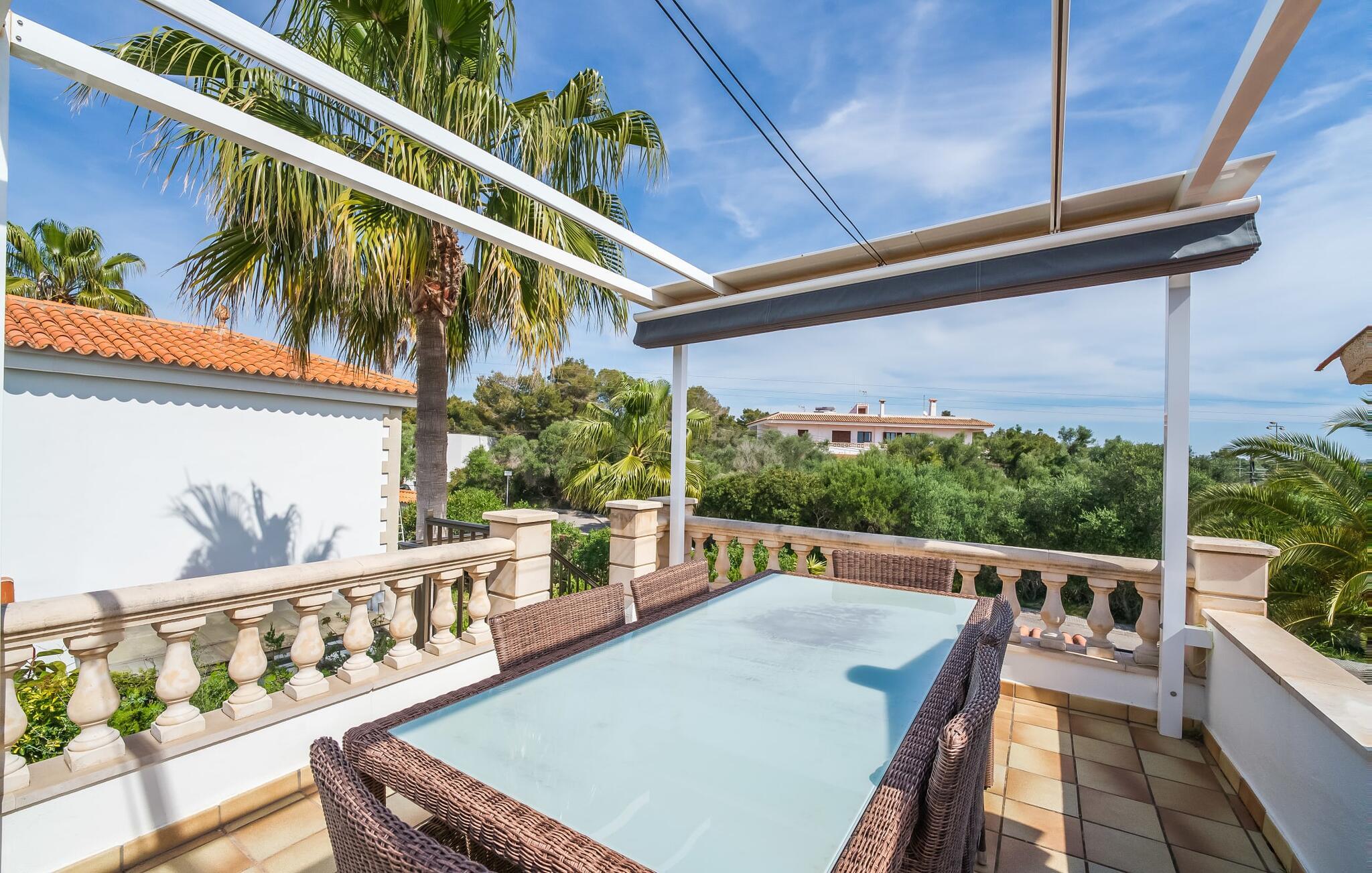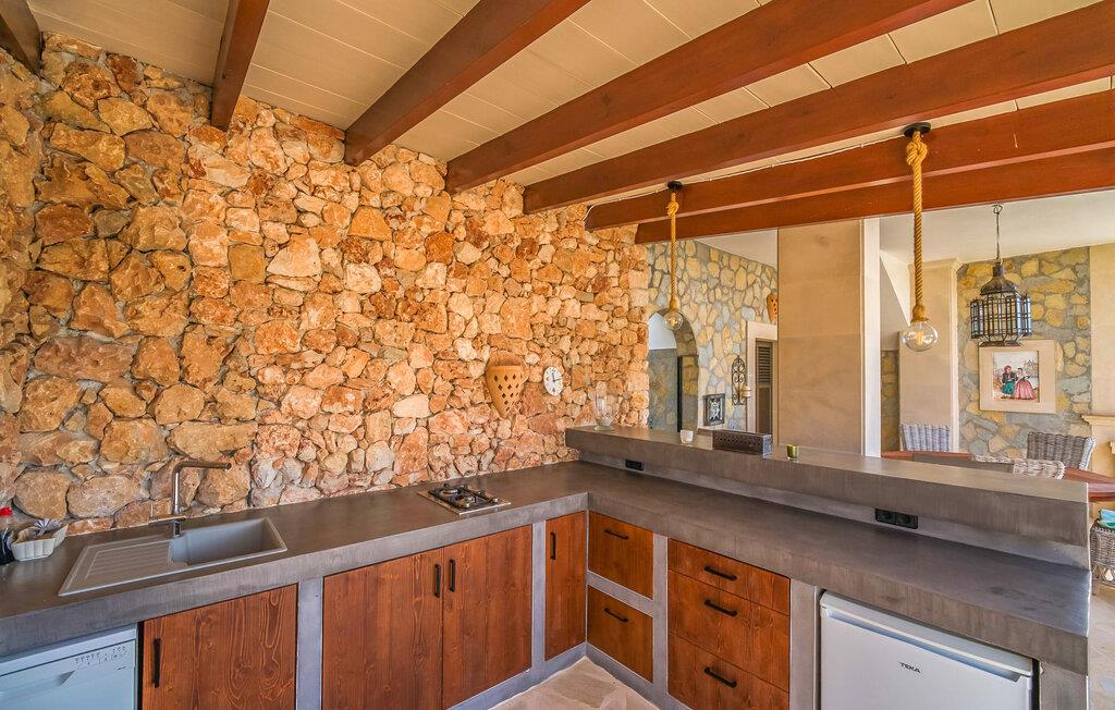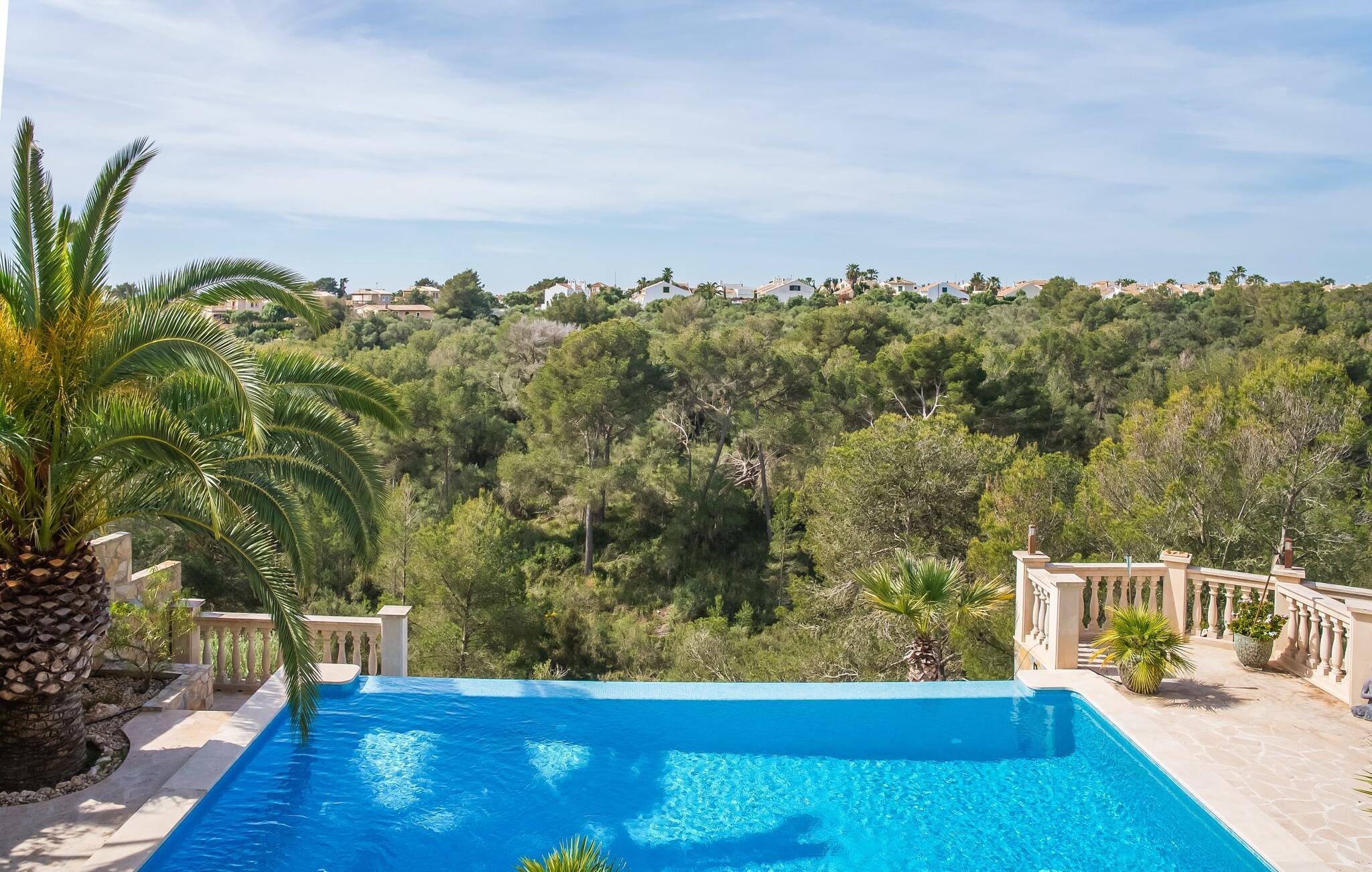 Oplev paradis i den luksuriøse villa "Casa Crefeld Vall d'Aran 21". Denne fantastiske ejendom har et smukt anlagt udendørs område, der er indbegrebet af mallorcansk luksus, komplet med palmer og en betagende udsigt. Nyd den klorfrie infinity-pool med komfortable liggestole og slap af i det udsøgt møblerede overdækkede loungeområde. Det fuldt udstyrede udekøkken med opvaskemaskine, gaskomfur og mobil gasgrill gør selvforplejning til en fornøjelse. To overdækkede terrasser med spisepladser på forskellige niveauer giver god plads til sammenkomster. Ideel til familier eller venner, denne villa ligger tæt på stranden og tilbyder en unik blanding af stil og komfort. Indenfor finder I en hyggelig stue med pejs og spiseplads, som åbner ud til en solrig altan. Det trendy udstyret køkken opfylder de høje standarder for en førsteklasses mallorcansk villa. Privatliv kommer først i denne fuldt klimatiserede bolig. De smukt designede værelser er spredt over forskellige niveauer og har hver et moderne badeværelse. Fordyb jer i en fantastisk atmosfære i "Casa Crefeld Vall d'Aran 21" og nyd en ferie fuld af afslapning og nydelse i det autentiske sydlige Mallorca. Omgivet af palmer og med udsigt over fyrreskoven troner den adelige villa "Casa Crefeld Vall d'Aran 21" over den smukke landsby Cala Murada på det sydlige Mallorca. Indkøbsmuligheder kan findes i det nærliggende landsbycenter. Stranden af samme navn ligger kun 1,7 km væk. Andre dele af det naturligt smukke Calas de Mallorca, herunder Sa Marçal, er omkring 15 minutter væk.
