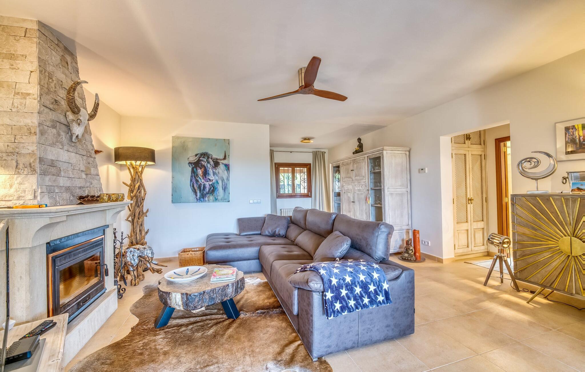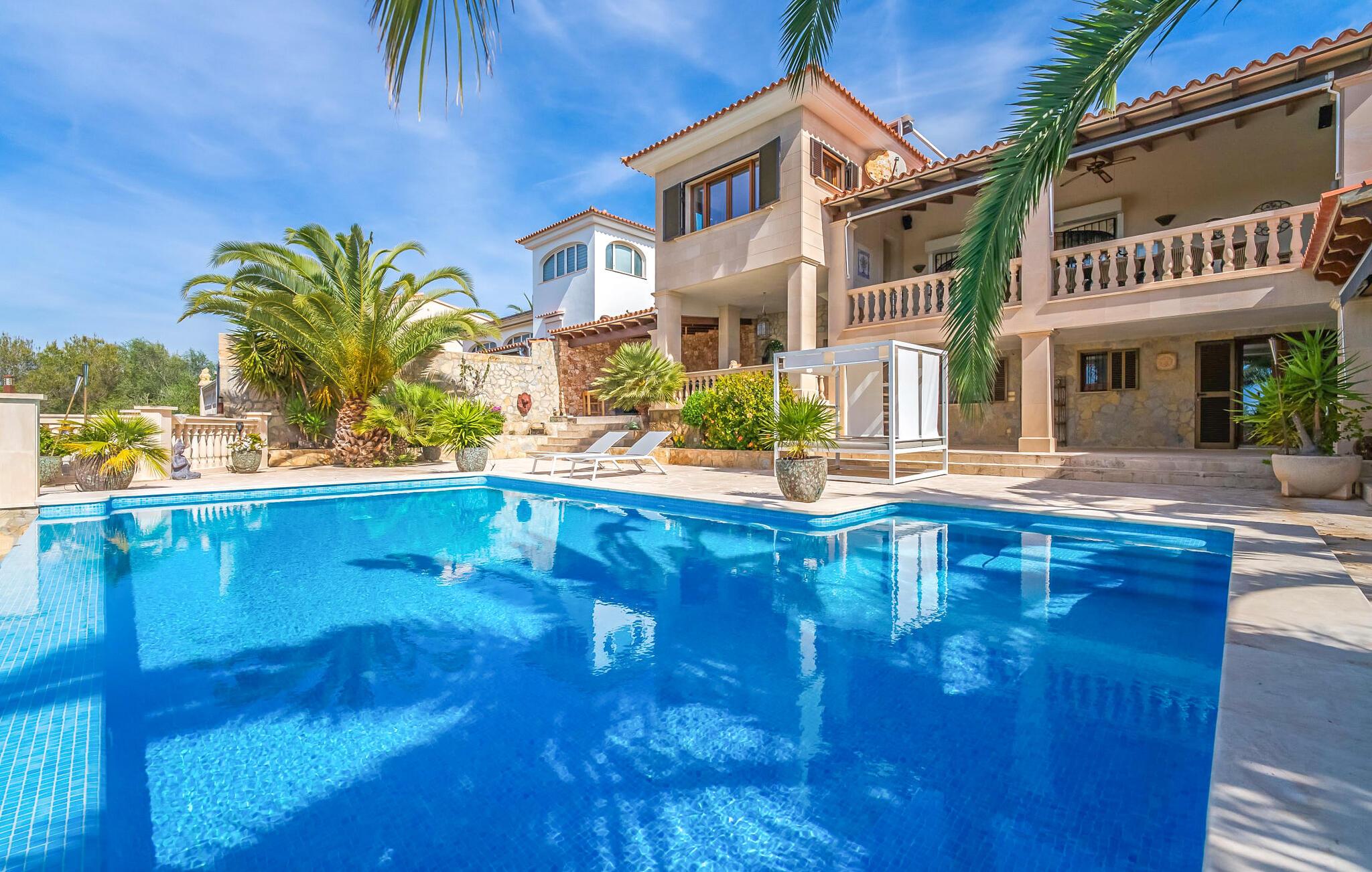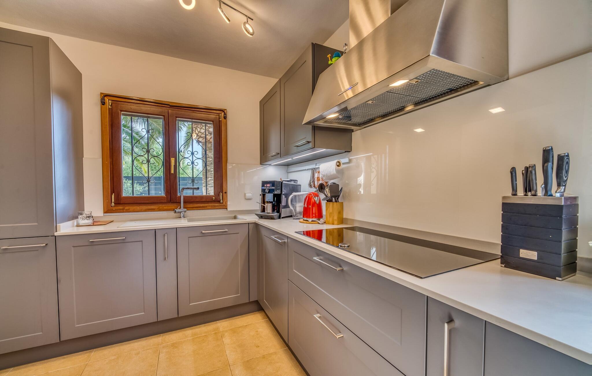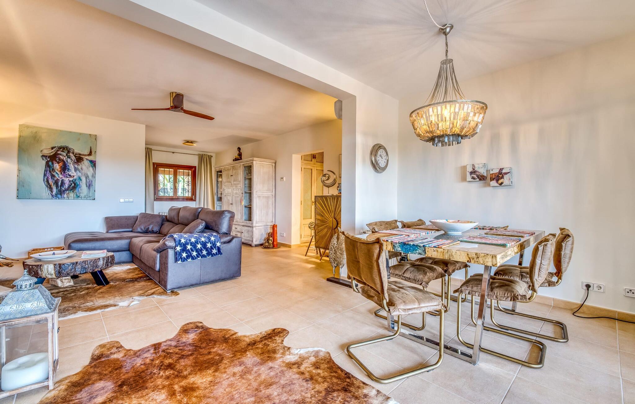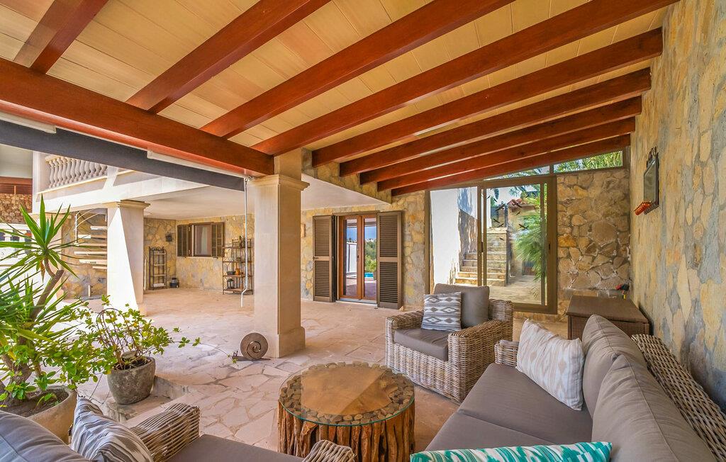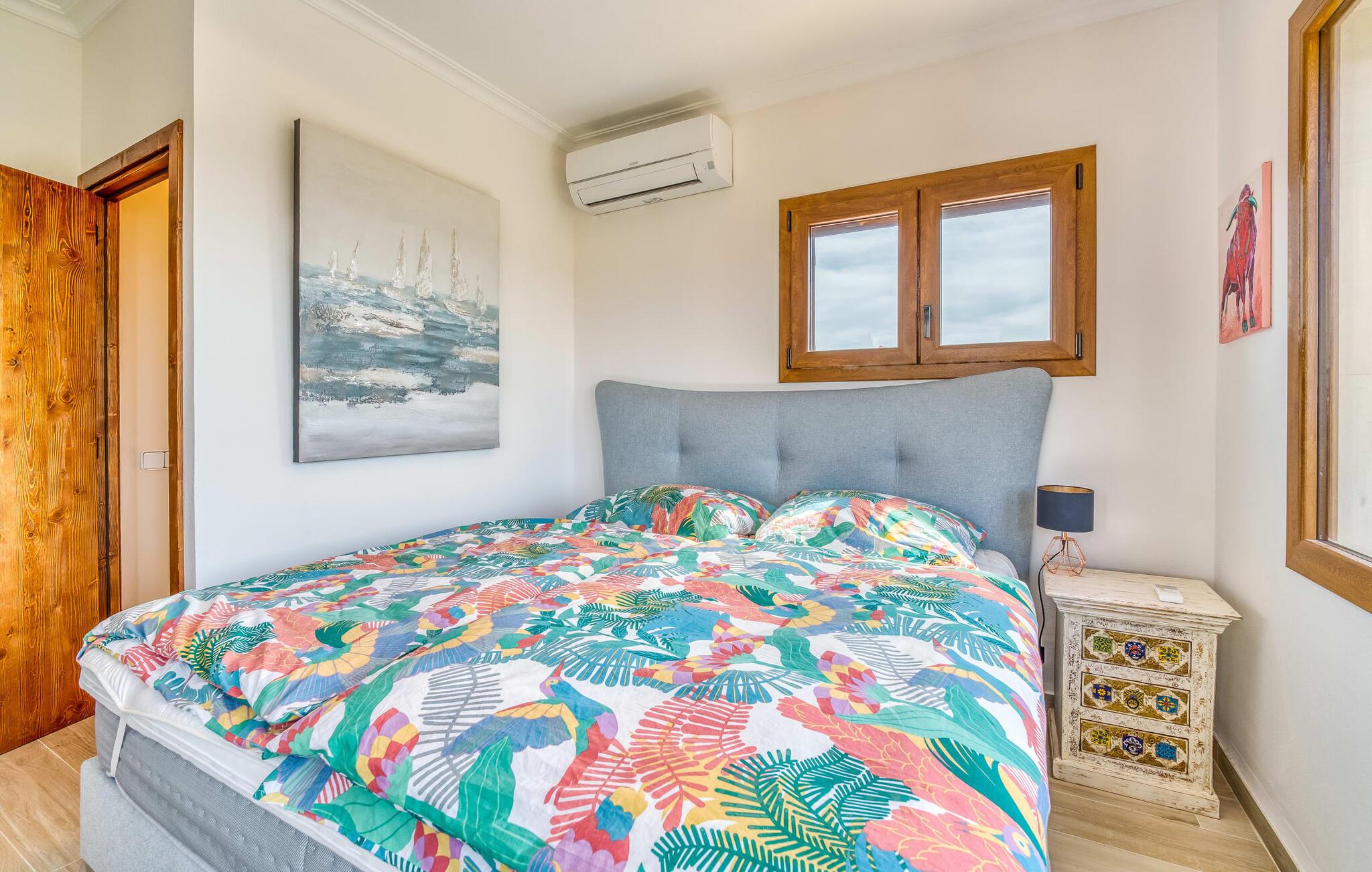 Oplev paradis i den luksuriøse villa "Casa Crefeld Vall d'Aran 21". Denne fantastiske ejendom har et smukt anlagt udendørs område, der er indbegrebet af mallorcansk luksus, komplet med palmer og en betagende udsigt. Nyd den klorfrie infinity-pool med komfortable liggestole og slap af i det udsøgt møblerede overdækkede loungeområde. Det fuldt udstyrede udekøkken med opvaskemaskine, gaskomfur og mobil gasgrill gør selvforplejning til en fornøjelse. To overdækkede terrasser med spisepladser på forskellige niveauer giver god plads til sammenkomster. Ideel til familier eller venner, denne villa ligger tæt på stranden og tilbyder en unik blanding af stil og komfort. Indenfor finder I en hyggelig stue med pejs og spiseplads, som åbner ud til en solrig altan. Det trendy udstyret køkken opfylder de høje standarder for en førsteklasses mallorcansk villa. Privatliv kommer først i denne fuldt klimatiserede bolig. De smukt designede værelser er spredt over forskellige niveauer og har hver et moderne badeværelse. Fordyb jer i en fantastisk atmosfære i "Casa Crefeld Vall d'Aran 21" og nyd en ferie fuld af afslapning og nydelse i det autentiske sydlige Mallorca. Omgivet af palmer og med udsigt over fyrreskoven troner den adelige villa "Casa Crefeld Vall d'Aran 21" over den smukke landsby Cala Murada på det sydlige Mallorca. Indkøbsmuligheder kan findes i det nærliggende landsbycenter. Stranden af samme navn ligger kun 1,7 km væk. Andre dele af det naturligt smukke Calas de Mallorca, herunder Sa Marçal, er omkring 15 minutter væk.