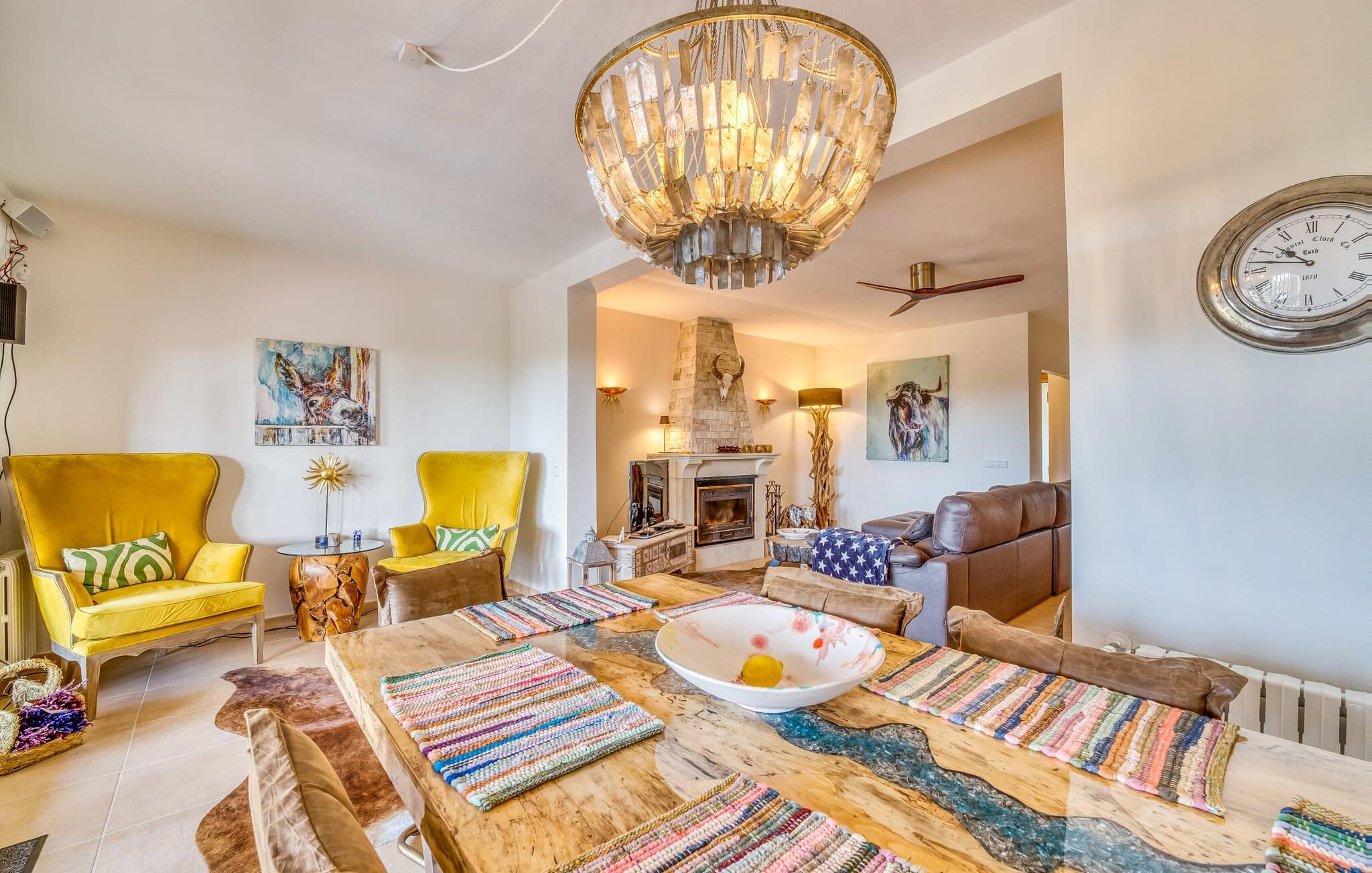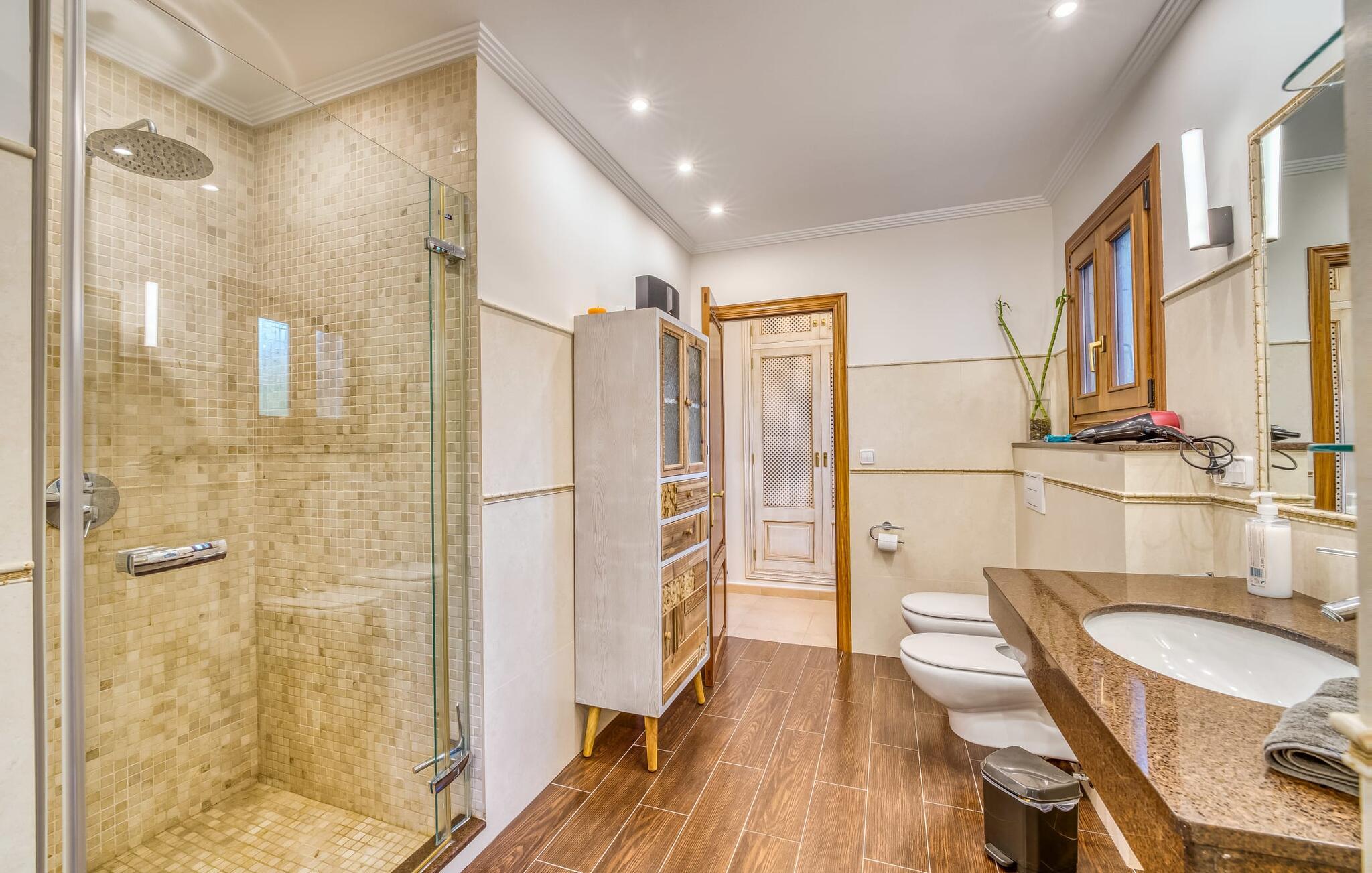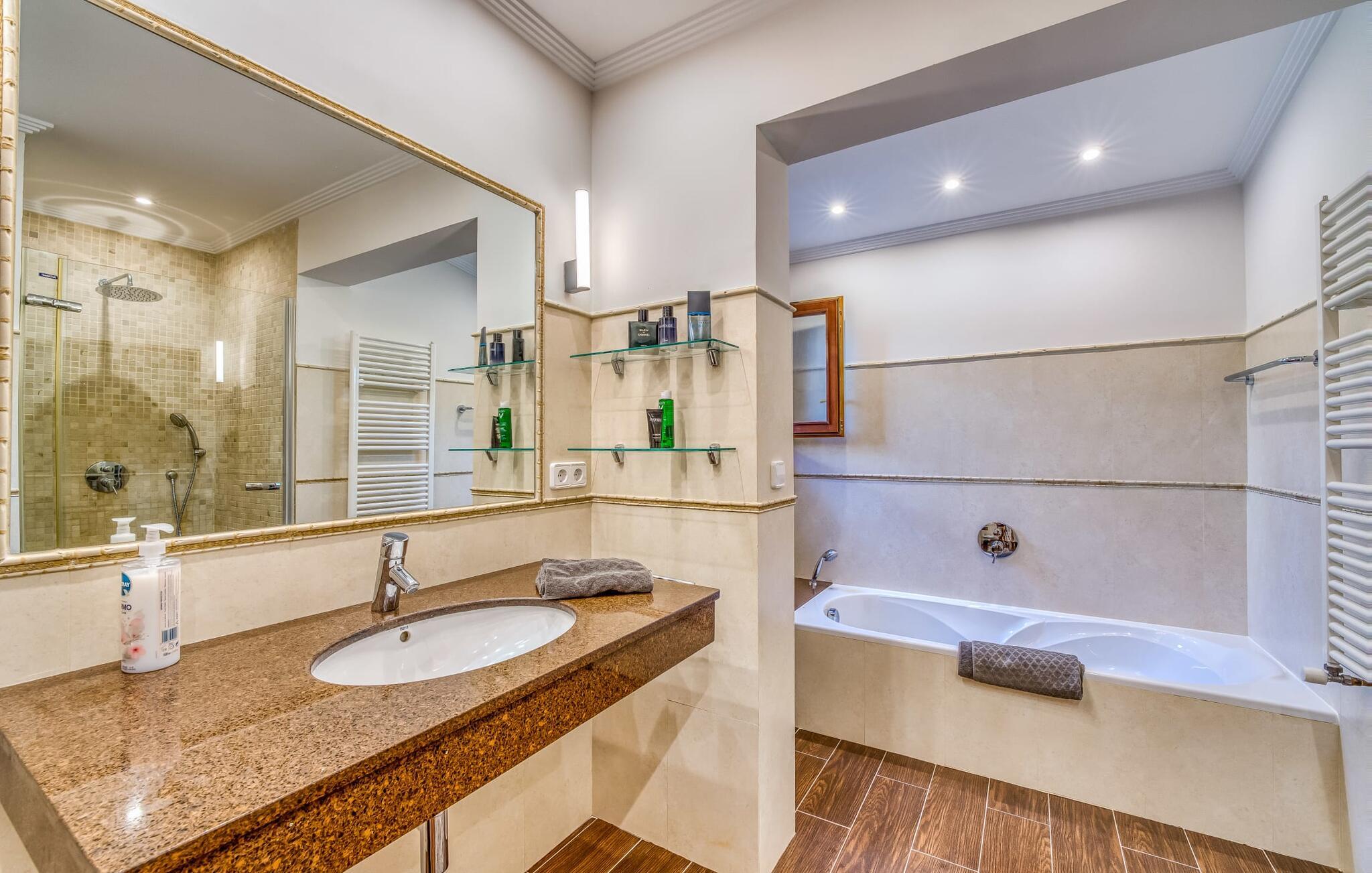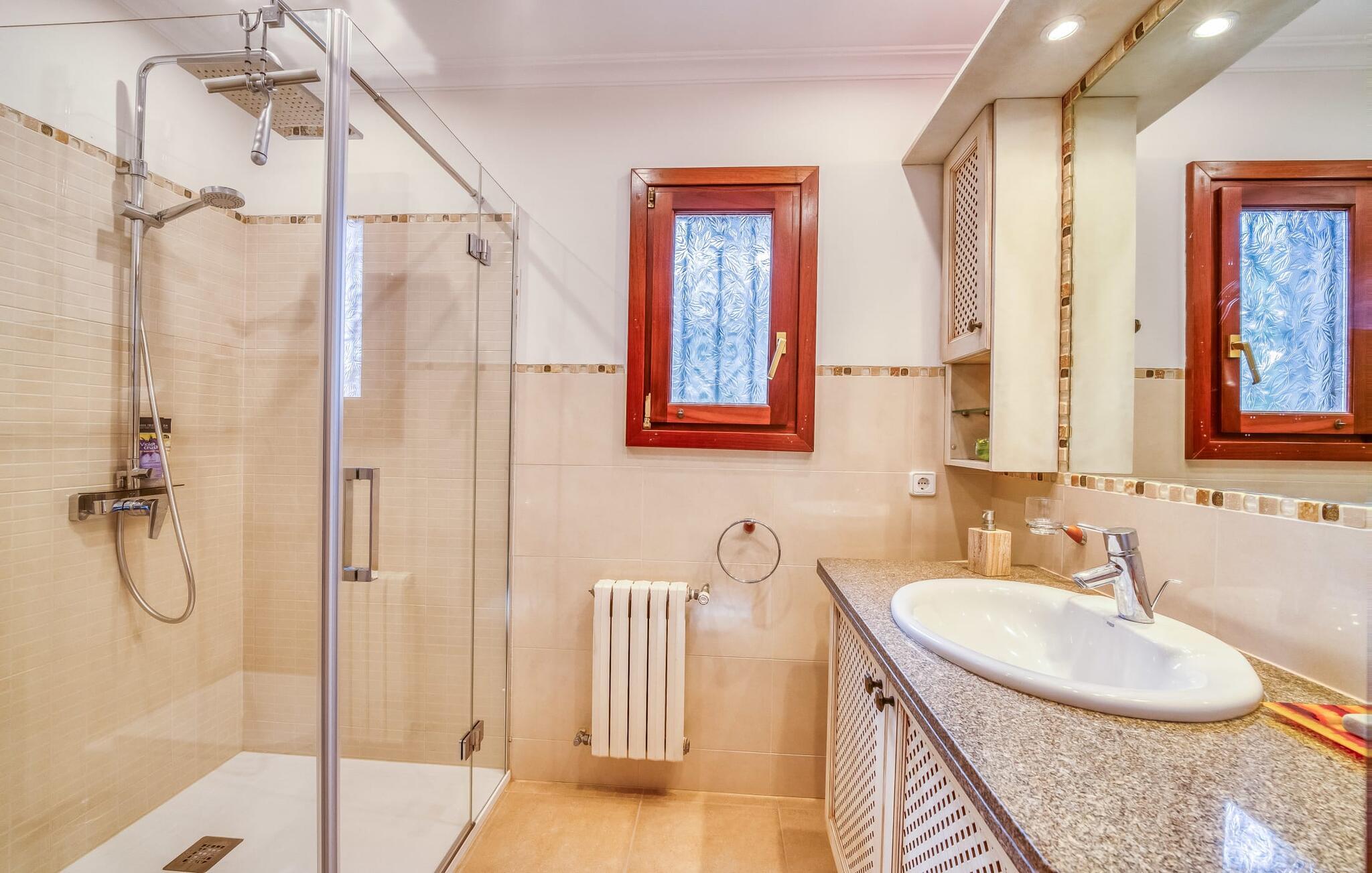 Oplev paradis i den luksuriøse villa "Casa Crefeld Vall d'Aran 21". Denne fantastiske ejendom har et smukt anlagt udendørs område, der er indbegrebet af mallorcansk luksus, komplet med palmer og en betagende udsigt. Nyd den klorfrie infinity-pool med komfortable liggestole og slap af i det udsøgt møblerede overdækkede loungeområde. Det fuldt udstyrede udekøkken med opvaskemaskine, gaskomfur og mobil gasgrill gør selvforplejning til en fornøjelse. To overdækkede terrasser med spisepladser på forskellige niveauer giver god plads til sammenkomster. Ideel til familier eller venner, denne villa ligger tæt på stranden og tilbyder en unik blanding af stil og komfort. Indenfor finder I en hyggelig stue med pejs og spiseplads, som åbner ud til en solrig altan. Det trendy udstyret køkken opfylder de høje standarder for en førsteklasses mallorcansk villa. Privatliv kommer først i denne fuldt klimatiserede bolig. De smukt designede værelser er spredt over forskellige niveauer og har hver et moderne badeværelse. Fordyb jer i en fantastisk atmosfære i "Casa Crefeld Vall d'Aran 21" og nyd en ferie fuld af afslapning og nydelse i det autentiske sydlige Mallorca. Omgivet af palmer og med udsigt over fyrreskoven troner den adelige villa "Casa Crefeld Vall d'Aran 21" over den smukke landsby Cala Murada på det sydlige Mallorca. Indkøbsmuligheder kan findes i det nærliggende landsbycenter. Stranden af samme navn ligger kun 1,7 km væk. Andre dele af det naturligt smukke Calas de Mallorca, herunder Sa Marçal, er omkring 15 minutter væk.
