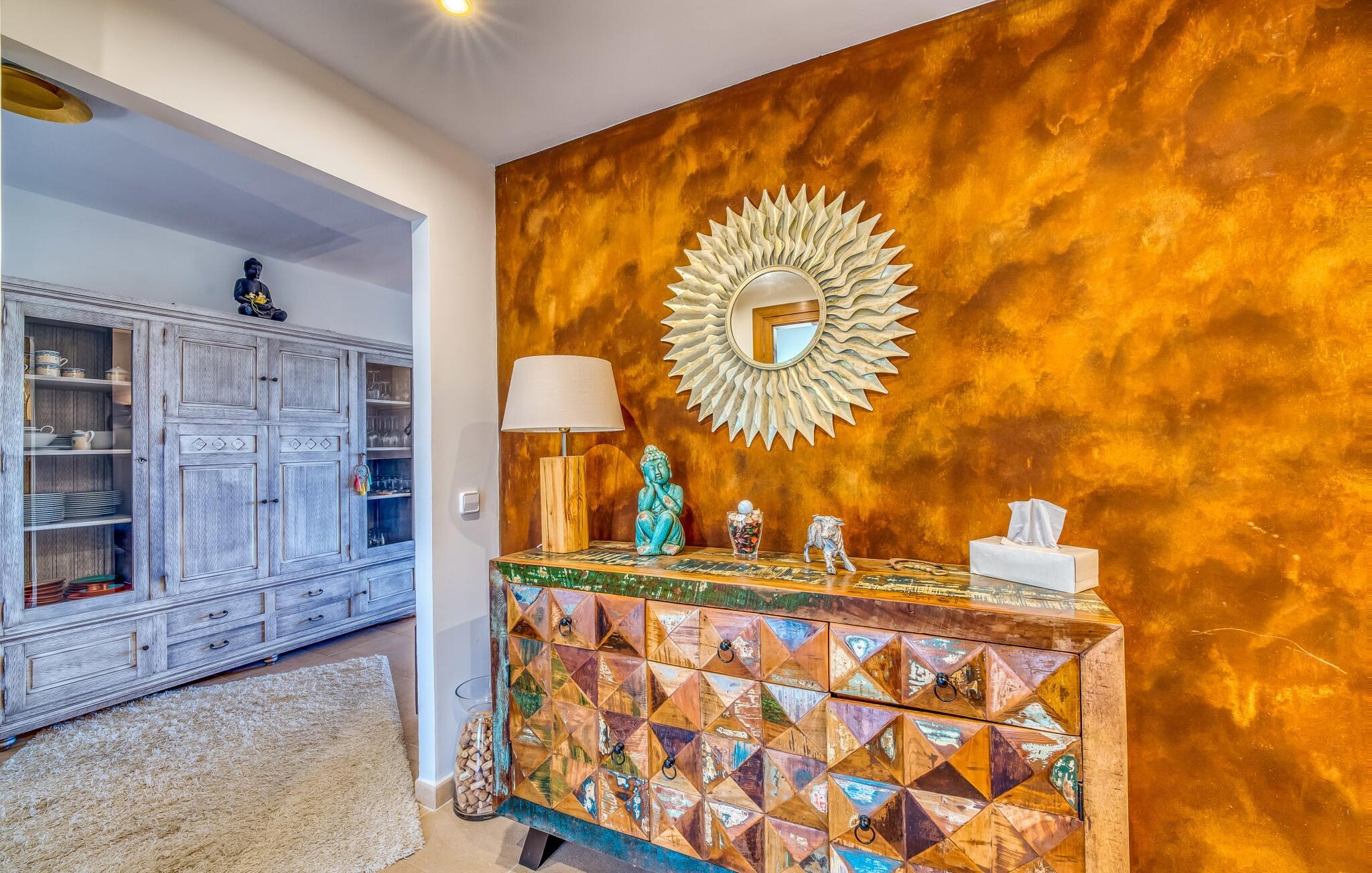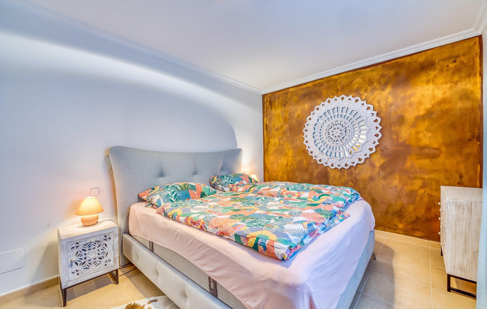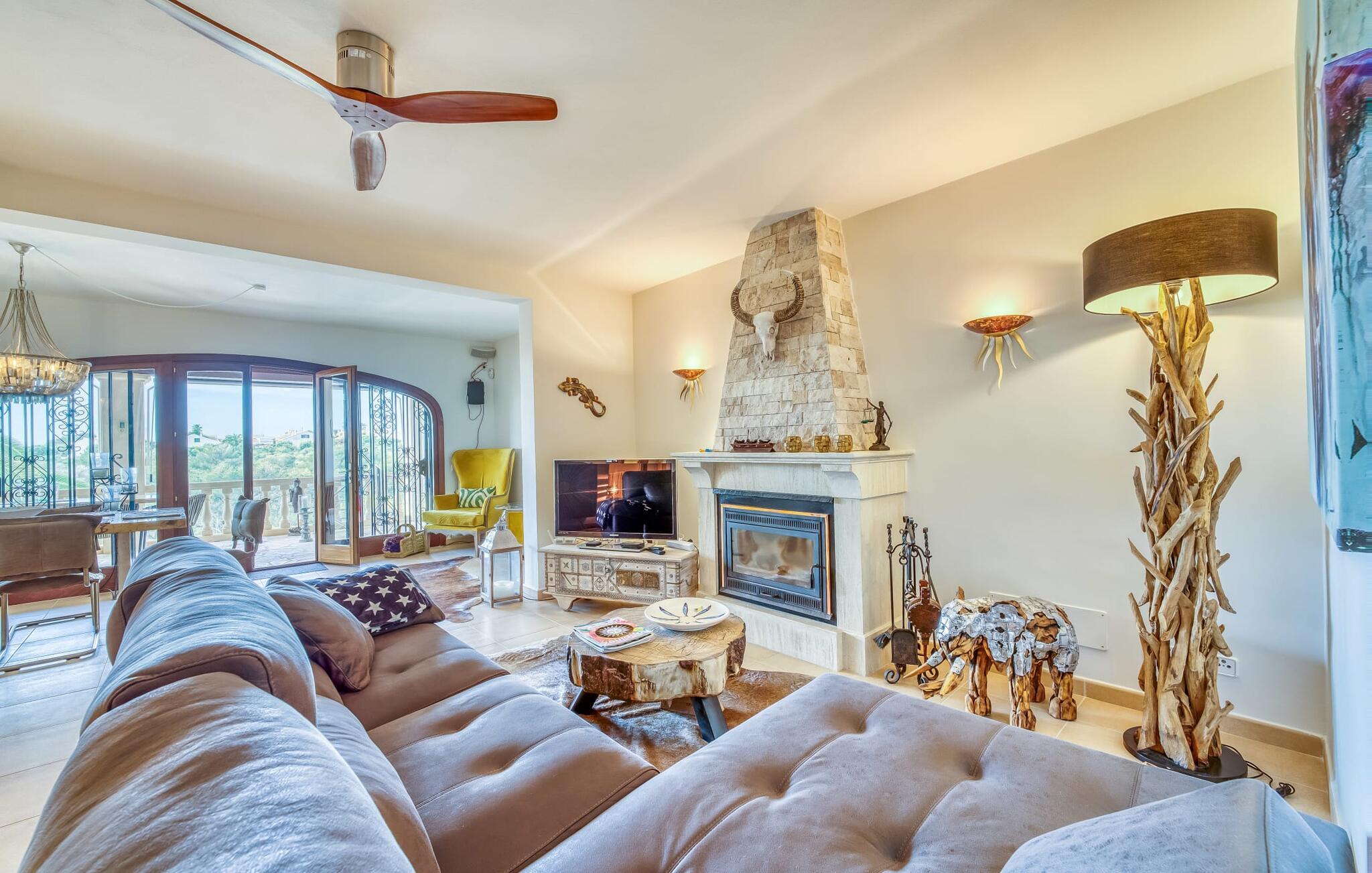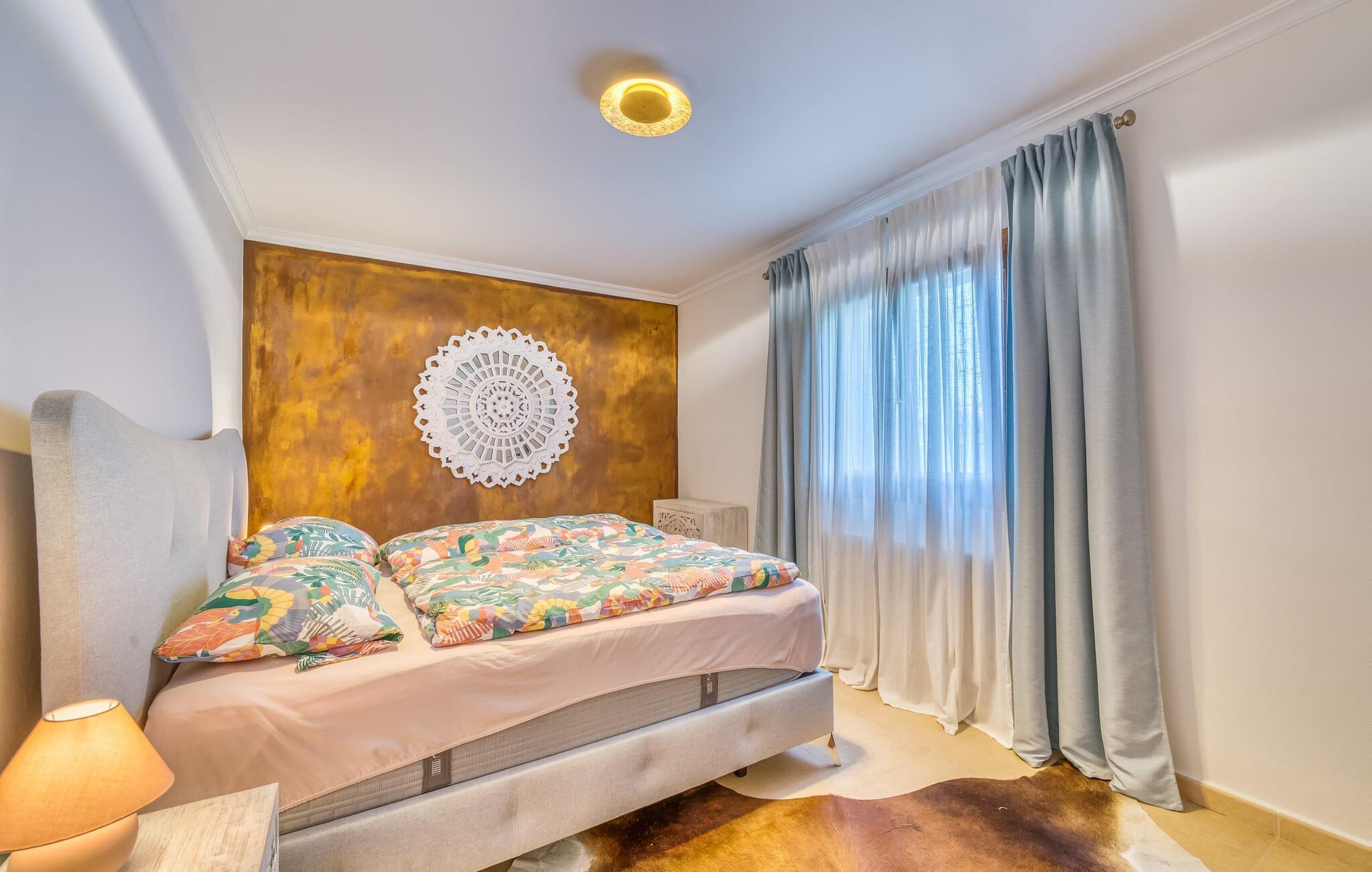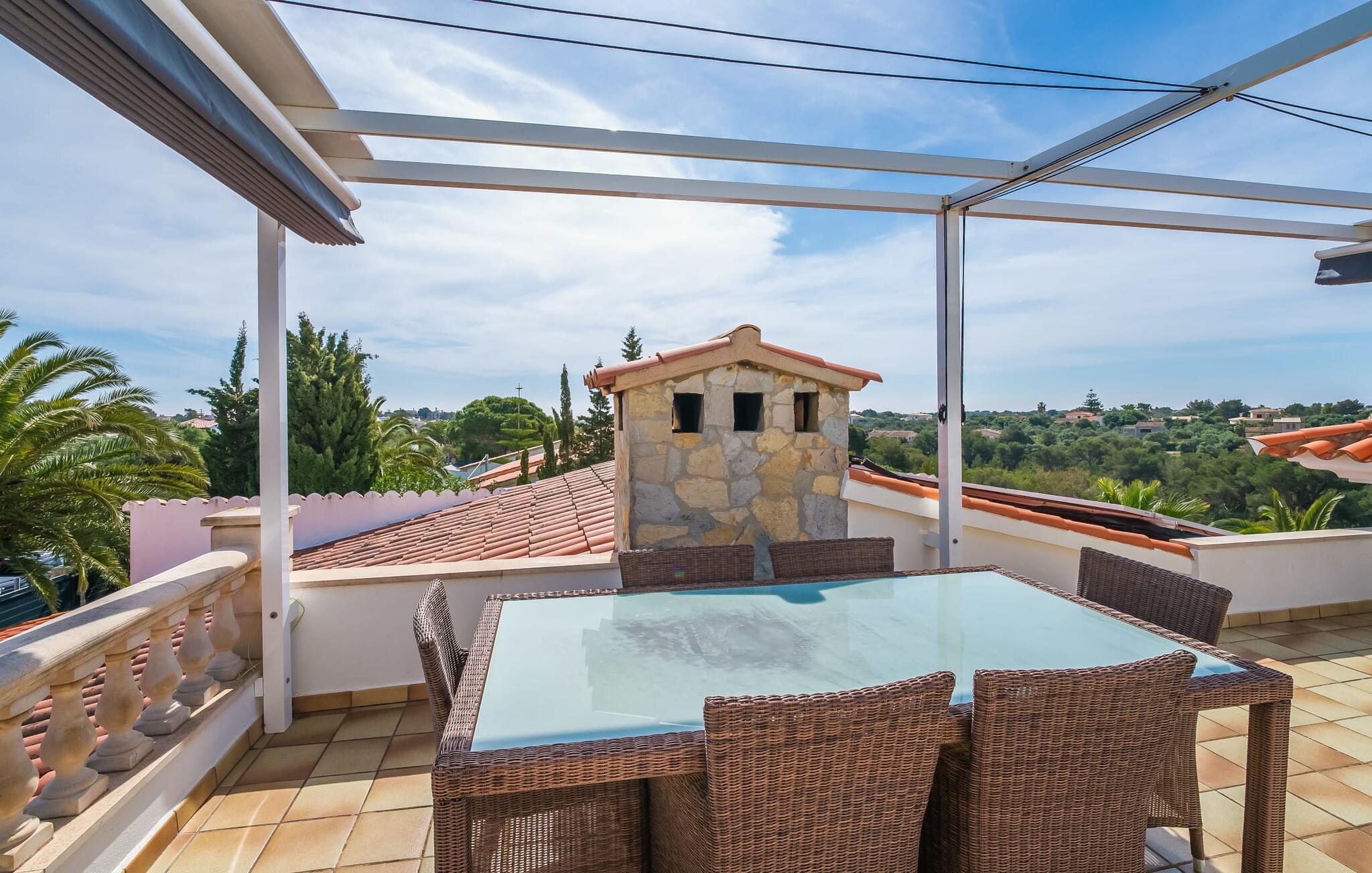 Oplev paradis i den luksuriøse villa "Casa Crefeld Vall d'Aran 21". Denne fantastiske ejendom har et smukt anlagt udendørs område, der er indbegrebet af mallorcansk luksus, komplet med palmer og en betagende udsigt. Nyd den klorfrie infinity-pool med komfortable liggestole og slap af i det udsøgt møblerede overdækkede loungeområde. Det fuldt udstyrede udekøkken med opvaskemaskine, gaskomfur og mobil gasgrill gør selvforplejning til en fornøjelse. To overdækkede terrasser med spisepladser på forskellige niveauer giver god plads til sammenkomster. Ideel til familier eller venner, denne villa ligger tæt på stranden og tilbyder en unik blanding af stil og komfort. Indenfor finder I en hyggelig stue med pejs og spiseplads, som åbner ud til en solrig altan. Det trendy udstyret køkken opfylder de høje standarder for en førsteklasses mallorcansk villa. Privatliv kommer først i denne fuldt klimatiserede bolig. De smukt designede værelser er spredt over forskellige niveauer og har hver et moderne badeværelse. Fordyb jer i en fantastisk atmosfære i "Casa Crefeld Vall d'Aran 21" og nyd en ferie fuld af afslapning og nydelse i det autentiske sydlige Mallorca. Omgivet af palmer og med udsigt over fyrreskoven troner den adelige villa "Casa Crefeld Vall d'Aran 21" over den smukke landsby Cala Murada på det sydlige Mallorca. Indkøbsmuligheder kan findes i det nærliggende landsbycenter. Stranden af samme navn ligger kun 1,7 km væk. Andre dele af det naturligt smukke Calas de Mallorca, herunder Sa Marçal, er omkring 15 minutter væk.