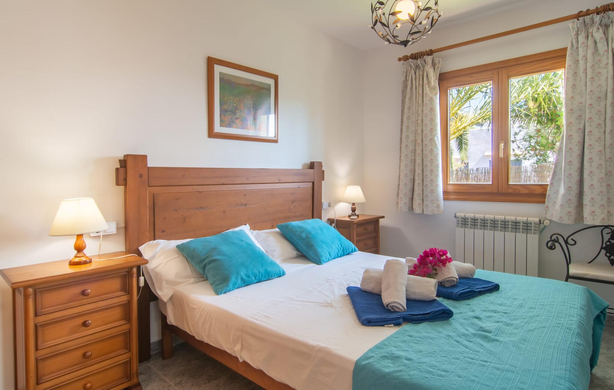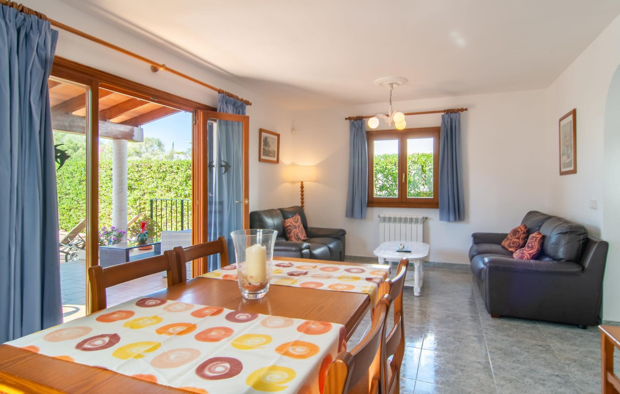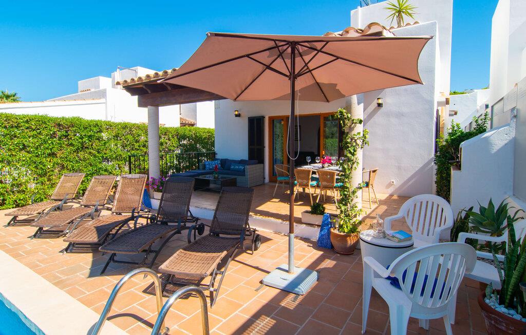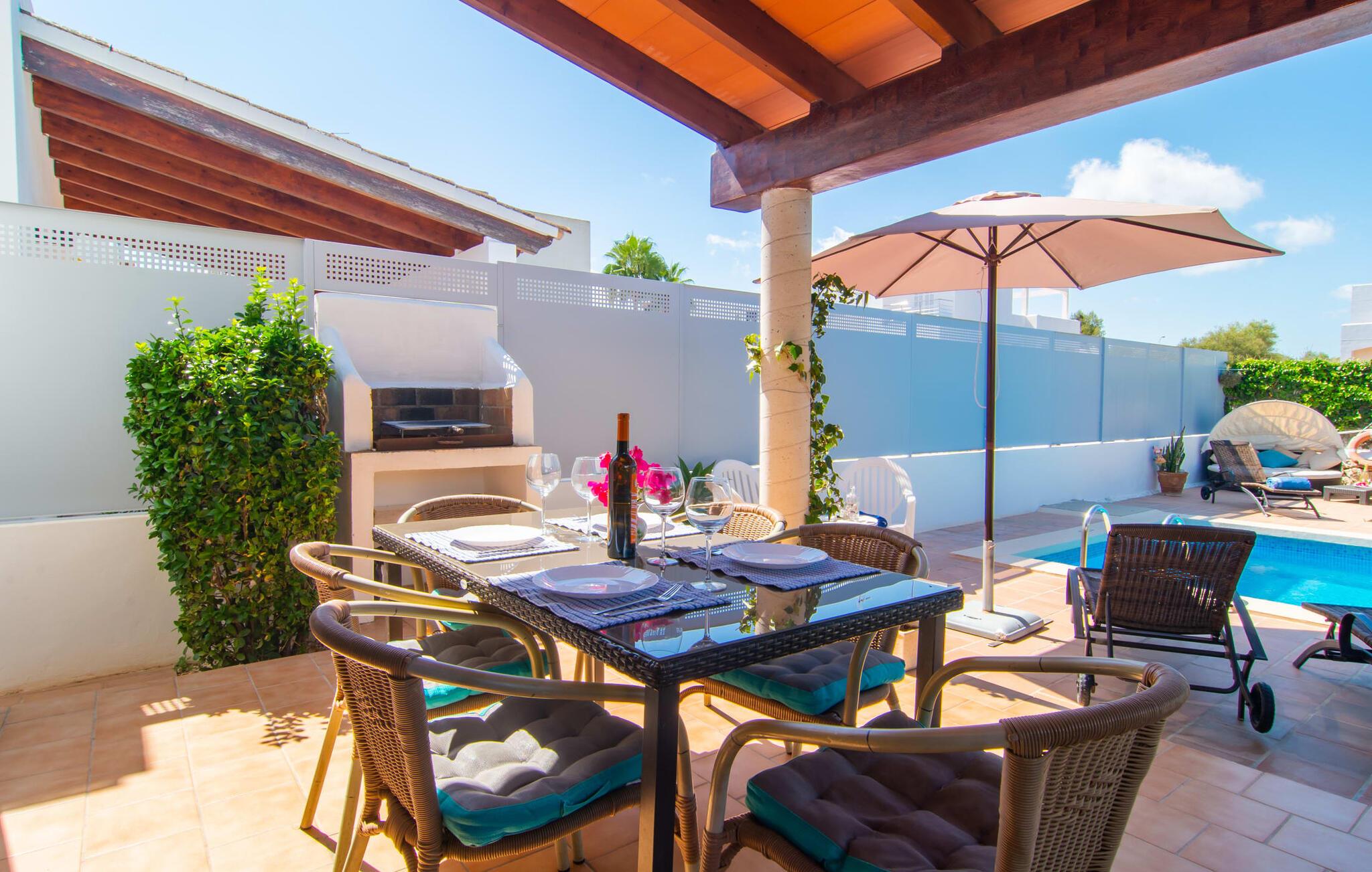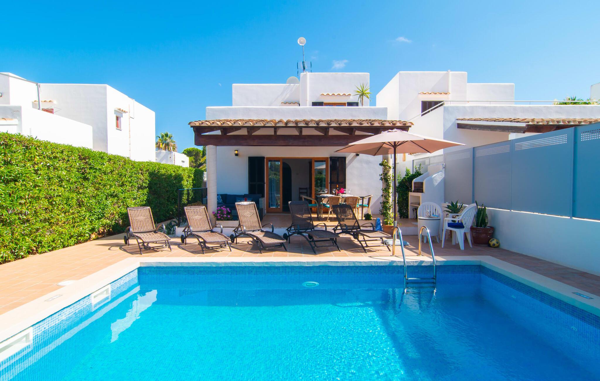 Omgivet af mange naboer, midt i livet, i gåafstand til strand, restauranter og shopping - og alligevel vidunderligt privat og udstyret med alle de bekvemmeligheder man kan ønske sig på ferien: Dette er villaen "Casa Hector" nær Cala d 'Eller. Dette smukke hvide feriehus for op til seks personer på Mallorcas sydkyst ligger på en ejendom med høje hække og vægge som privatskærm, så I kan nyde den delvist overdækkede terrasse og pool. På den meget velholdte terrasse i stueetagen er I forkælet med valg: Grill noget lækkert, nyd et glas vin sammen ved bordet eller slap af med en god bog på en af de komfortable sæder. På den anden side kan I nyde solen på tagterrassen, hvor liggestole inviterer jer til at uddybe jeres feriebrune farve. Børn, der rejser med jer, vil højst sandsynligt ikke kun nyde den store private pool til daglig forfriskning, men også basketballkurven, som giver yderligere variation. I kan nemt parkere jeres lejebil direkte ved huset. jeres sommerhus er udstyret med alt hvad I behøver for en vellykket ferie på Mallorca – og er diskret men kærligt indrettet. Værelserne er lyse takket være store vinduer, hvide vægge, masser af træ og udvalgte dekorationer bidrager til den varme, venlige atmosfære, der byder jer velkommen her. I alt tre hyggeligt hjemlige dobbeltværelser og to moderne badeværelser, hvoraf det ene har eget bad, er fordelt på husets to etager. I stueetagen finder I også det fuldt udstyrede køkken, der udover plads til madlavning også byder på et lille bord at sidde på, for eksempel til en hurtig morgenmad eller en snack ind imellem. Den rummelige, åbne stue og spisestue inviterer jer til at blive hængende og slappe af - det være sig over et måltid sammen eller en hyggelig aften med tv. Beliggende midt i en urbanisering på Mallorcas sydkyst tilbyder den smukke villa "Casa Hector" en masse privatliv på trods af at der er mange naboer rundt omkring. På en gade, der kan høres akustisk afhængig af vindretningen, ligger huset på en overskuelig grund, der udnyttes optimalt: der er overdækkede og solrige terrassearealer, en grill, en lille græsplæne og endda en privat pool inklusive indbydende liggestole og en praktisk udendørs bruser. Restauranter og indkøbsmuligheder samt flere skønne strande ligger i gåafstand. Aircondition er inkluderet i prisen i 12 timer pr. dag, hvorefter det betales kontant på stedet.