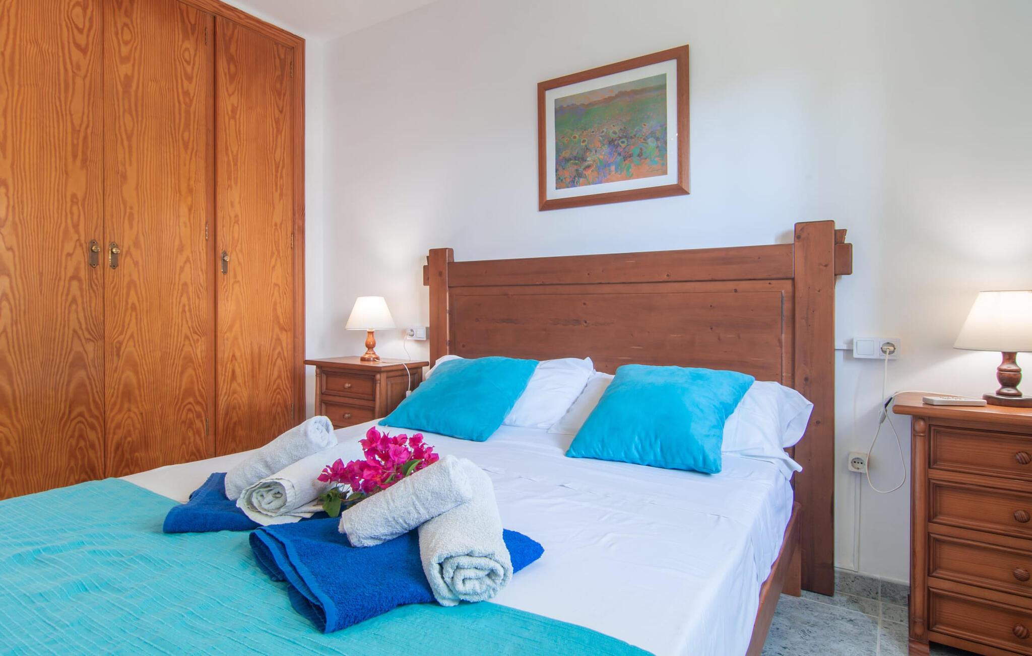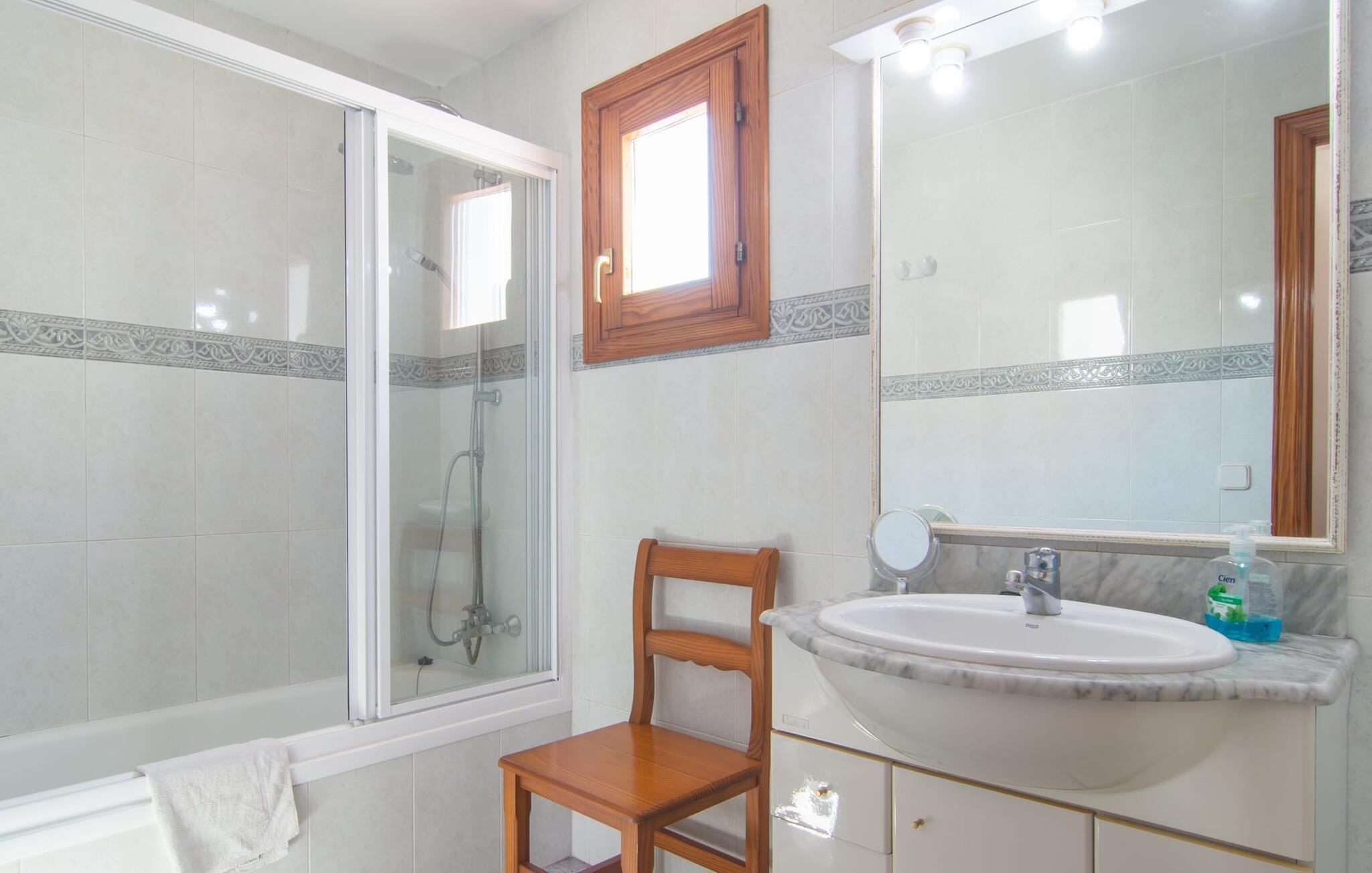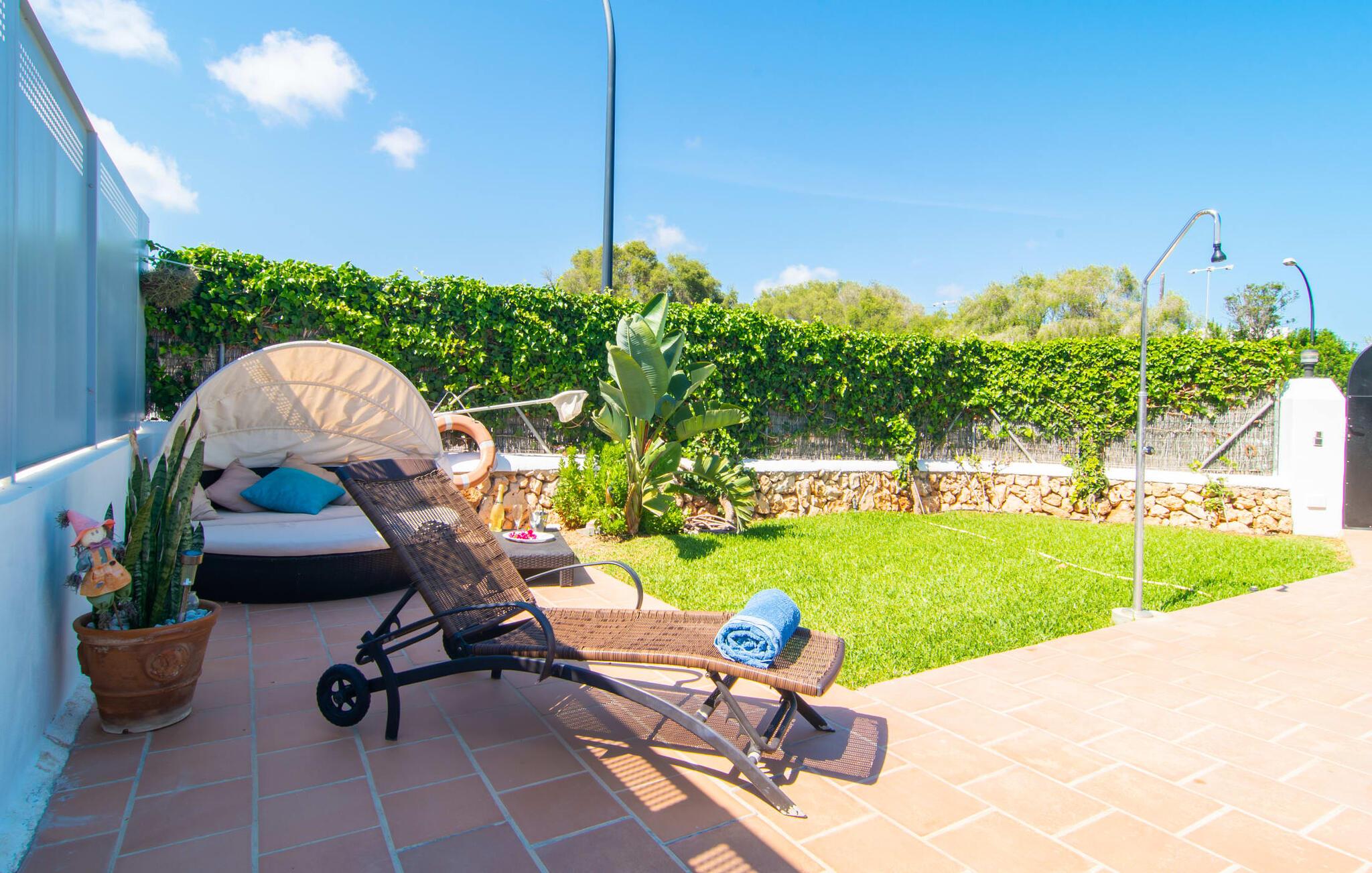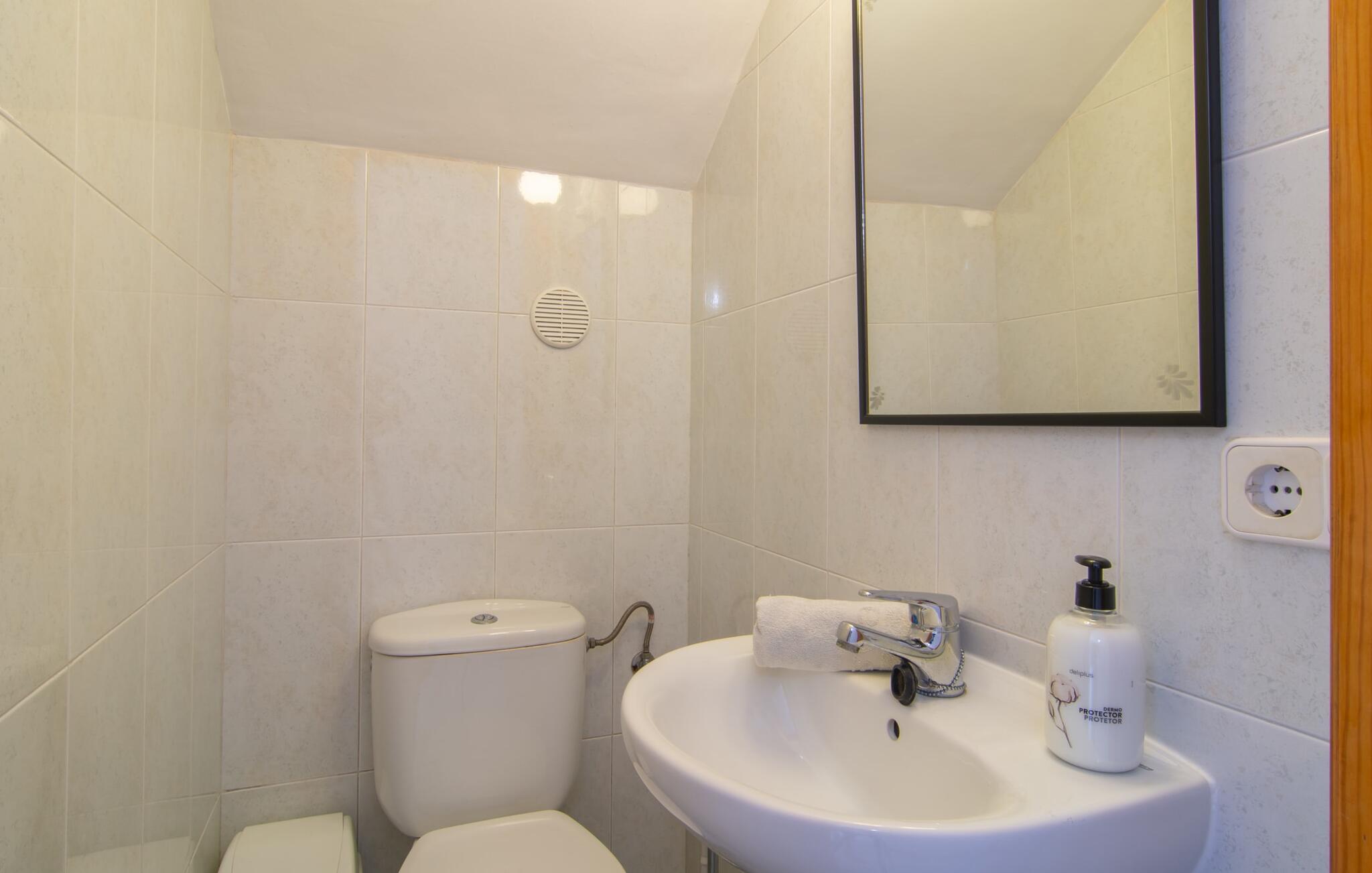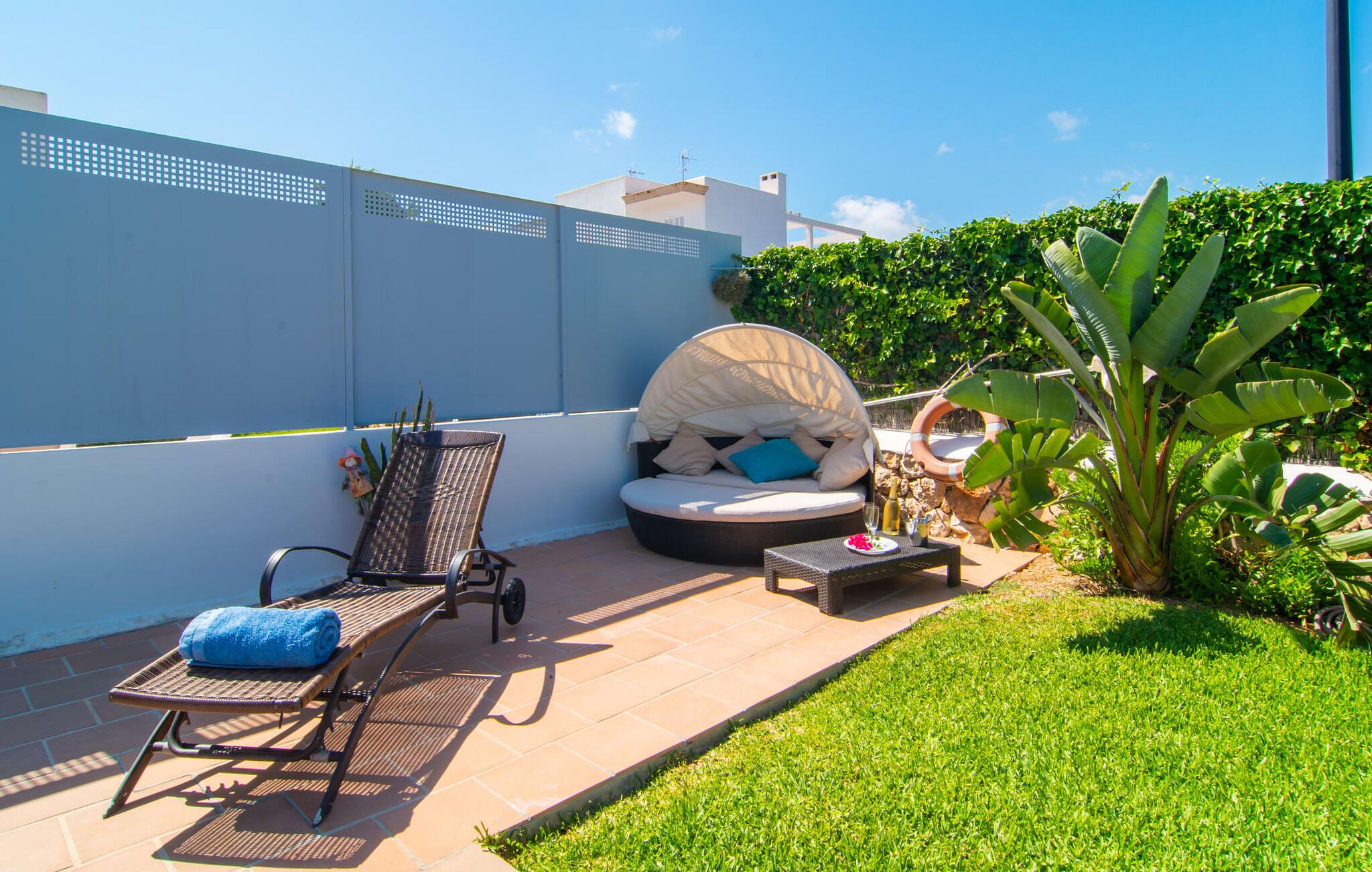 Omgivet af mange naboer, midt i livet, i gåafstand til strand, restauranter og shopping - og alligevel vidunderligt privat og udstyret med alle de bekvemmeligheder man kan ønske sig på ferien: Dette er villaen "Casa Hector" nær Cala d 'Eller. Dette smukke hvide feriehus for op til seks personer på Mallorcas sydkyst ligger på en ejendom med høje hække og vægge som privatskærm, så I kan nyde den delvist overdækkede terrasse og pool. På den meget velholdte terrasse i stueetagen er I forkælet med valg: Grill noget lækkert, nyd et glas vin sammen ved bordet eller slap af med en god bog på en af de komfortable sæder. På den anden side kan I nyde solen på tagterrassen, hvor liggestole inviterer jer til at uddybe jeres feriebrune farve. Børn, der rejser med jer, vil højst sandsynligt ikke kun nyde den store private pool til daglig forfriskning, men også basketballkurven, som giver yderligere variation. I kan nemt parkere jeres lejebil direkte ved huset. jeres sommerhus er udstyret med alt hvad I behøver for en vellykket ferie på Mallorca – og er diskret men kærligt indrettet. Værelserne er lyse takket være store vinduer, hvide vægge, masser af træ og udvalgte dekorationer bidrager til den varme, venlige atmosfære, der byder jer velkommen her. I alt tre hyggeligt hjemlige dobbeltværelser og to moderne badeværelser, hvoraf det ene har eget bad, er fordelt på husets to etager. I stueetagen finder I også det fuldt udstyrede køkken, der udover plads til madlavning også byder på et lille bord at sidde på, for eksempel til en hurtig morgenmad eller en snack ind imellem. Den rummelige, åbne stue og spisestue inviterer jer til at blive hængende og slappe af - det være sig over et måltid sammen eller en hyggelig aften med tv. Beliggende midt i en urbanisering på Mallorcas sydkyst tilbyder den smukke villa "Casa Hector" en masse privatliv på trods af at der er mange naboer rundt omkring. På en gade, der kan høres akustisk afhængig af vindretningen, ligger huset på en overskuelig grund, der udnyttes optimalt: der er overdækkede og solrige terrassearealer, en grill, en lille græsplæne og endda en privat pool inklusive indbydende liggestole og en praktisk udendørs bruser. Restauranter og indkøbsmuligheder samt flere skønne strande ligger i gåafstand. Aircondition er inkluderet i prisen i 12 timer pr. dag, hvorefter det betales kontant på stedet.