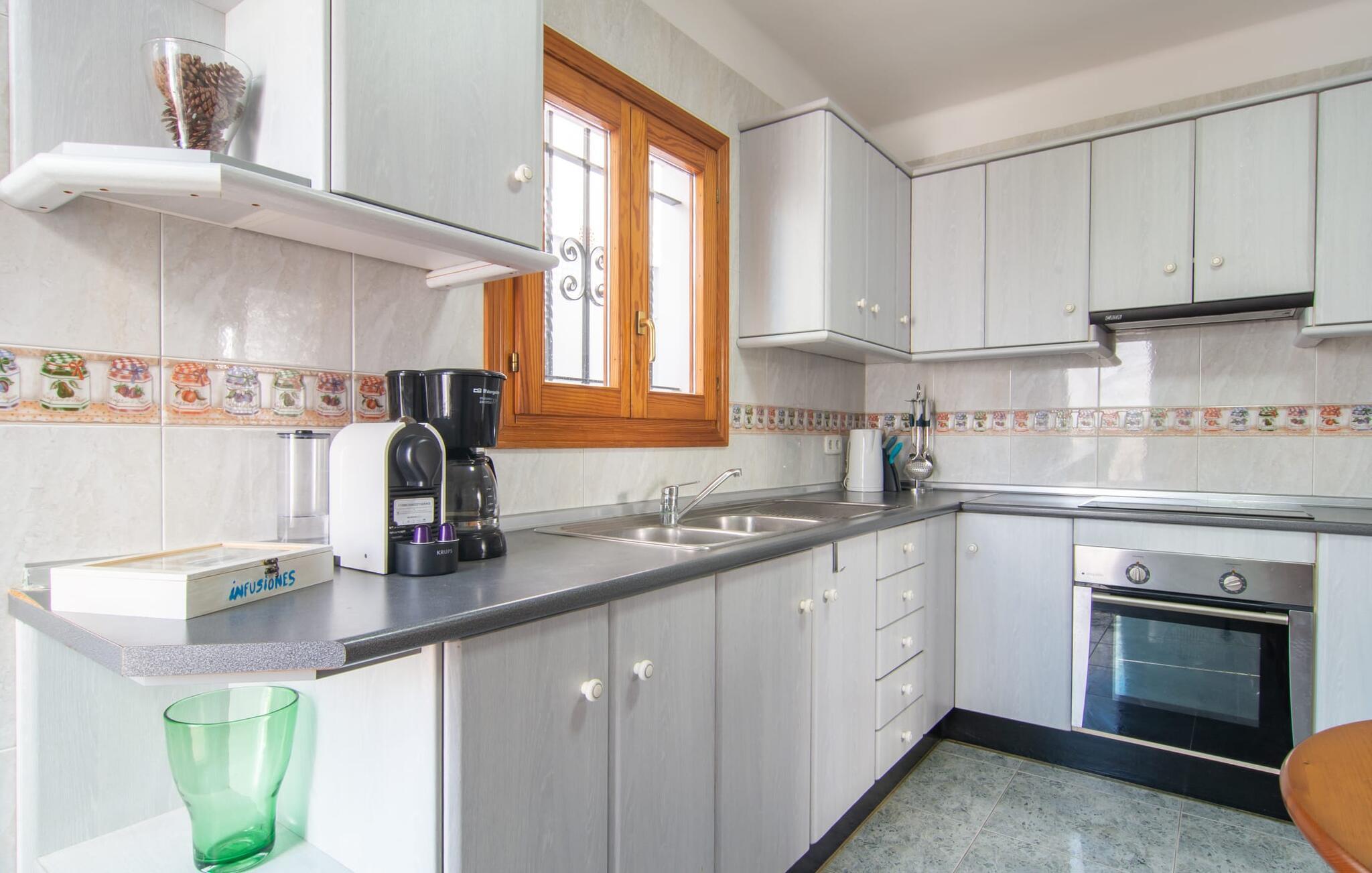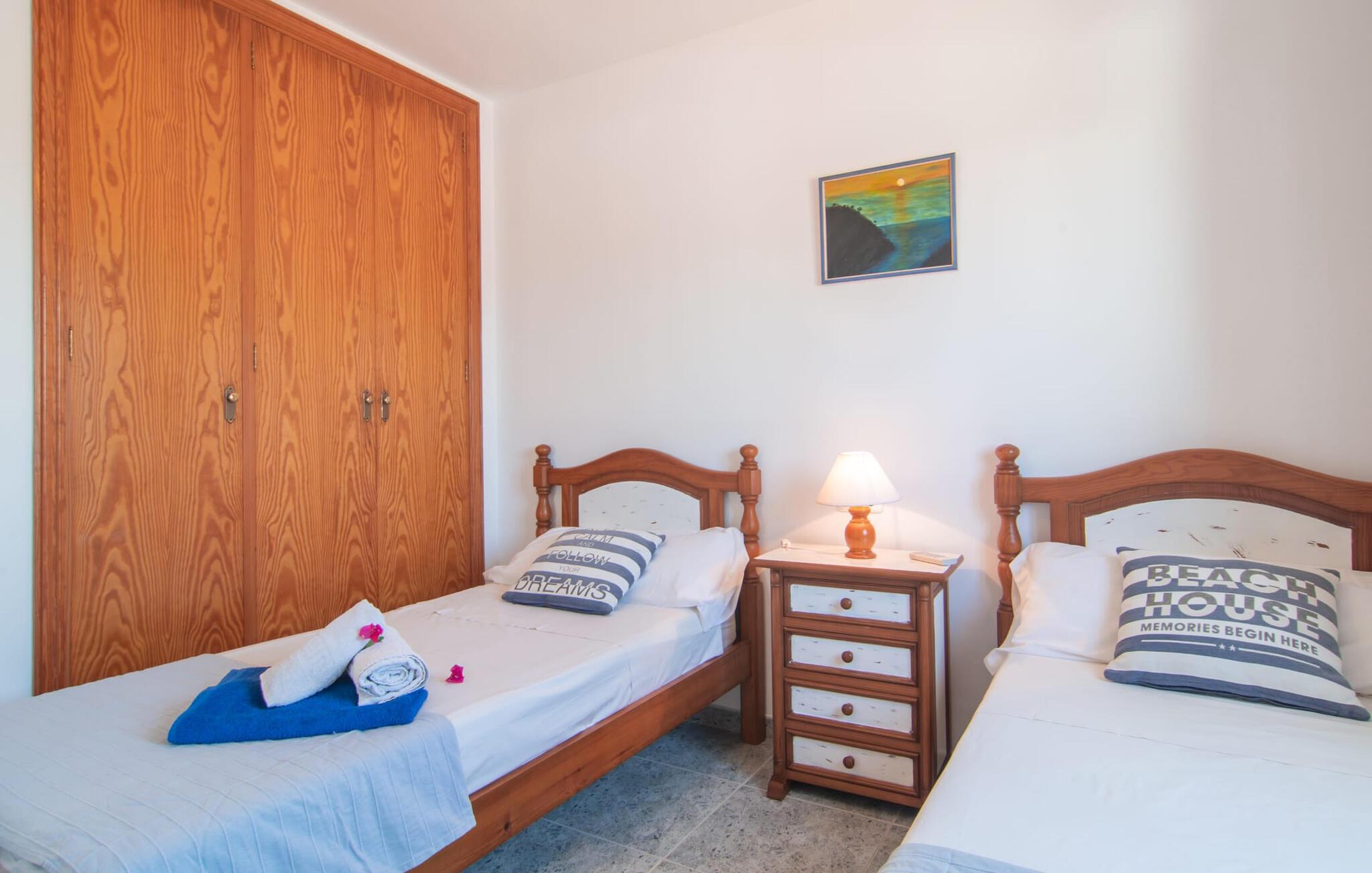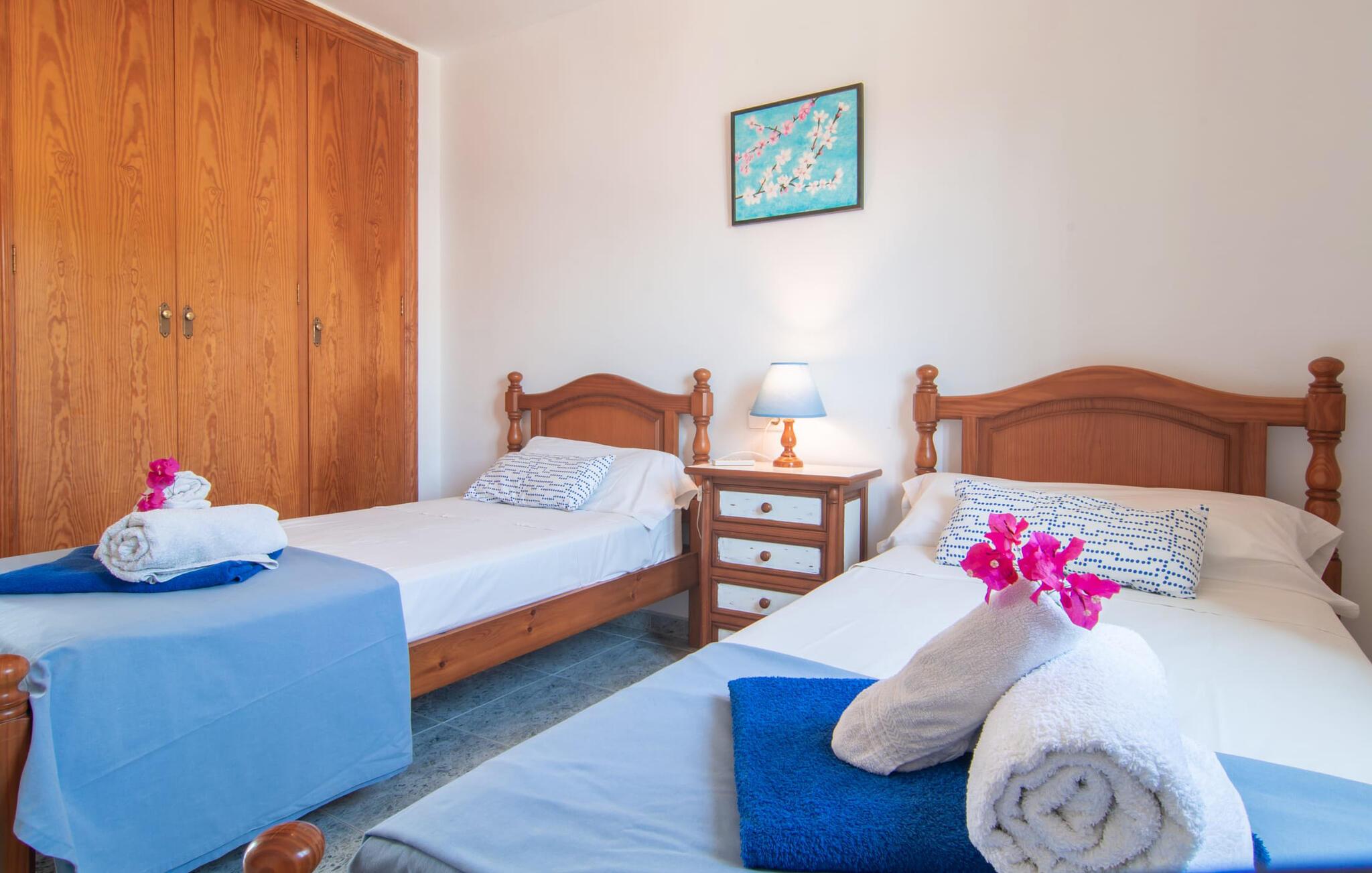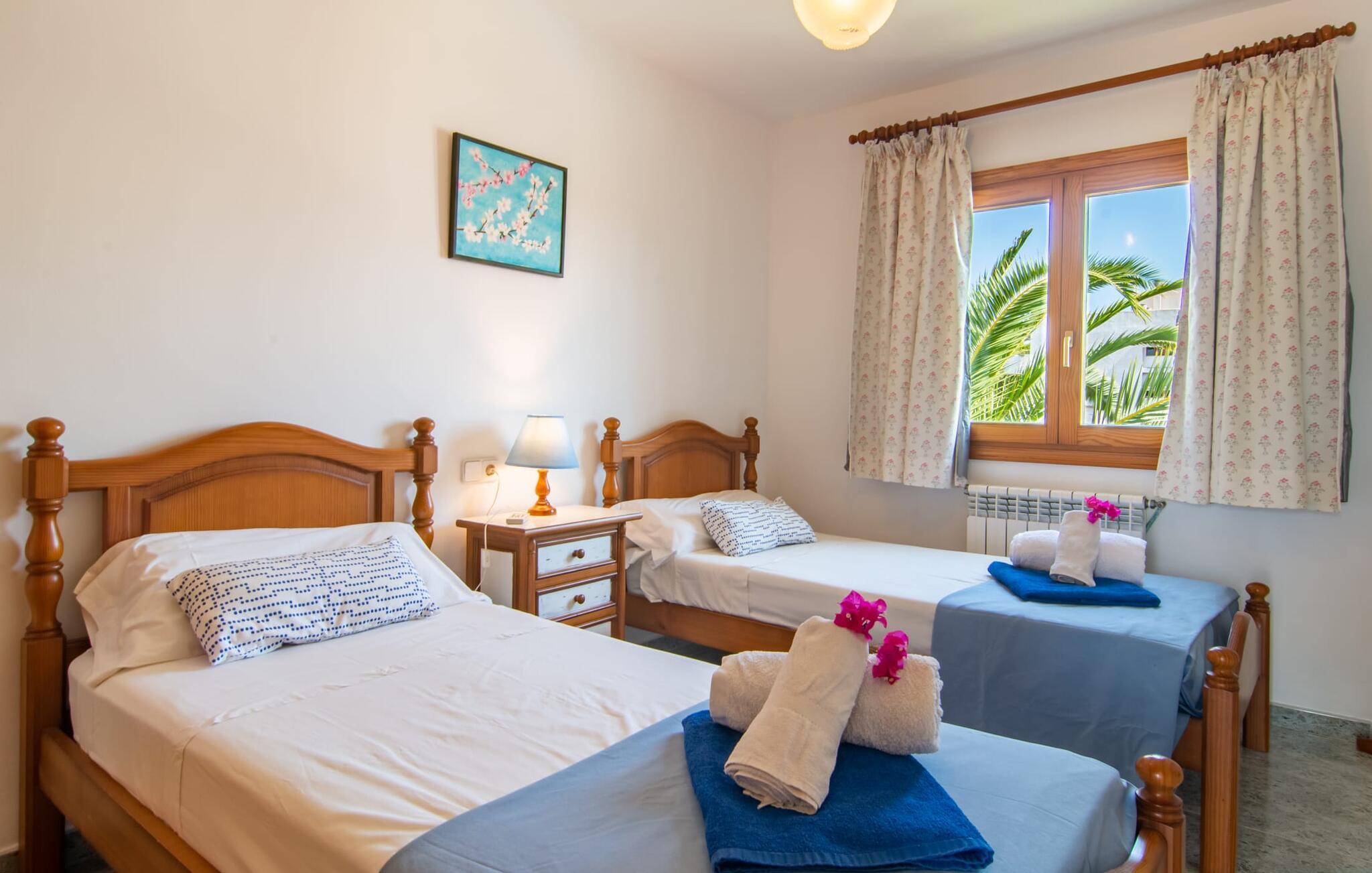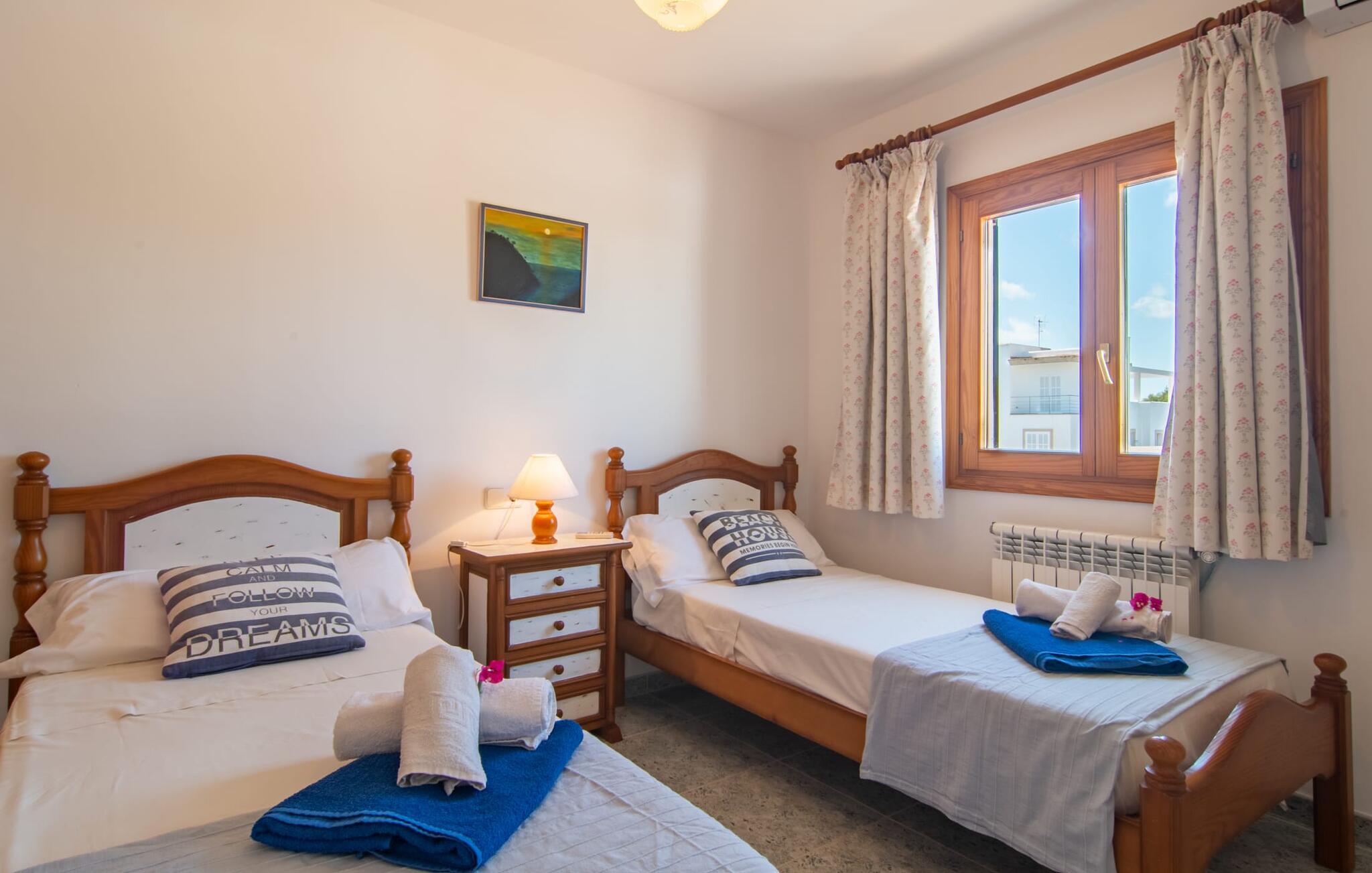 Omgivet af mange naboer, midt i livet, i gåafstand til strand, restauranter og shopping - og alligevel vidunderligt privat og udstyret med alle de bekvemmeligheder man kan ønske sig på ferien: Dette er villaen "Casa Hector" nær Cala d 'Eller. Dette smukke hvide feriehus for op til seks personer på Mallorcas sydkyst ligger på en ejendom med høje hække og vægge som privatskærm, så I kan nyde den delvist overdækkede terrasse og pool. På den meget velholdte terrasse i stueetagen er I forkælet med valg: Grill noget lækkert, nyd et glas vin sammen ved bordet eller slap af med en god bog på en af de komfortable sæder. På den anden side kan I nyde solen på tagterrassen, hvor liggestole inviterer jer til at uddybe jeres feriebrune farve. Børn, der rejser med jer, vil højst sandsynligt ikke kun nyde den store private pool til daglig forfriskning, men også basketballkurven, som giver yderligere variation. I kan nemt parkere jeres lejebil direkte ved huset. jeres sommerhus er udstyret med alt hvad I behøver for en vellykket ferie på Mallorca – og er diskret men kærligt indrettet. Værelserne er lyse takket være store vinduer, hvide vægge, masser af træ og udvalgte dekorationer bidrager til den varme, venlige atmosfære, der byder jer velkommen her. I alt tre hyggeligt hjemlige dobbeltværelser og to moderne badeværelser, hvoraf det ene har eget bad, er fordelt på husets to etager. I stueetagen finder I også det fuldt udstyrede køkken, der udover plads til madlavning også byder på et lille bord at sidde på, for eksempel til en hurtig morgenmad eller en snack ind imellem. Den rummelige, åbne stue og spisestue inviterer jer til at blive hængende og slappe af - det være sig over et måltid sammen eller en hyggelig aften med tv. Beliggende midt i en urbanisering på Mallorcas sydkyst tilbyder den smukke villa "Casa Hector" en masse privatliv på trods af at der er mange naboer rundt omkring. På en gade, der kan høres akustisk afhængig af vindretningen, ligger huset på en overskuelig grund, der udnyttes optimalt: der er overdækkede og solrige terrassearealer, en grill, en lille græsplæne og endda en privat pool inklusive indbydende liggestole og en praktisk udendørs bruser. Restauranter og indkøbsmuligheder samt flere skønne strande ligger i gåafstand. Aircondition er inkluderet i prisen i 12 timer pr. dag, hvorefter det betales kontant på stedet.