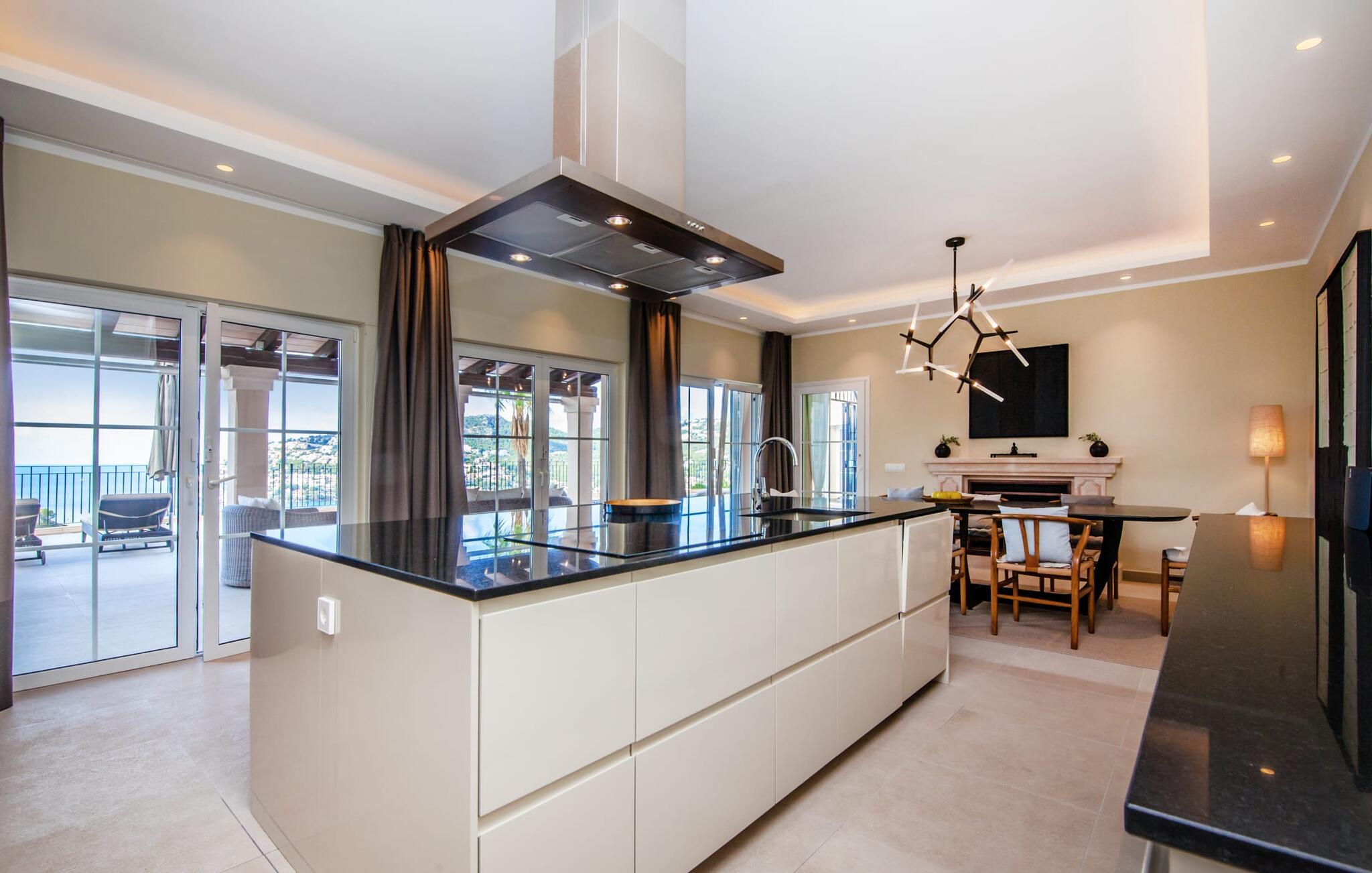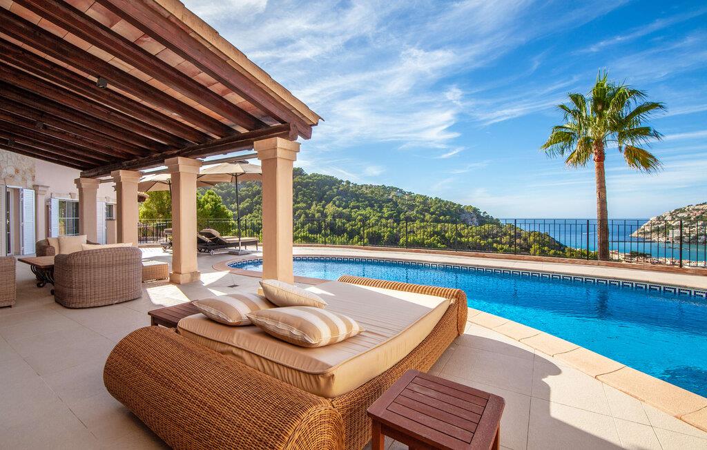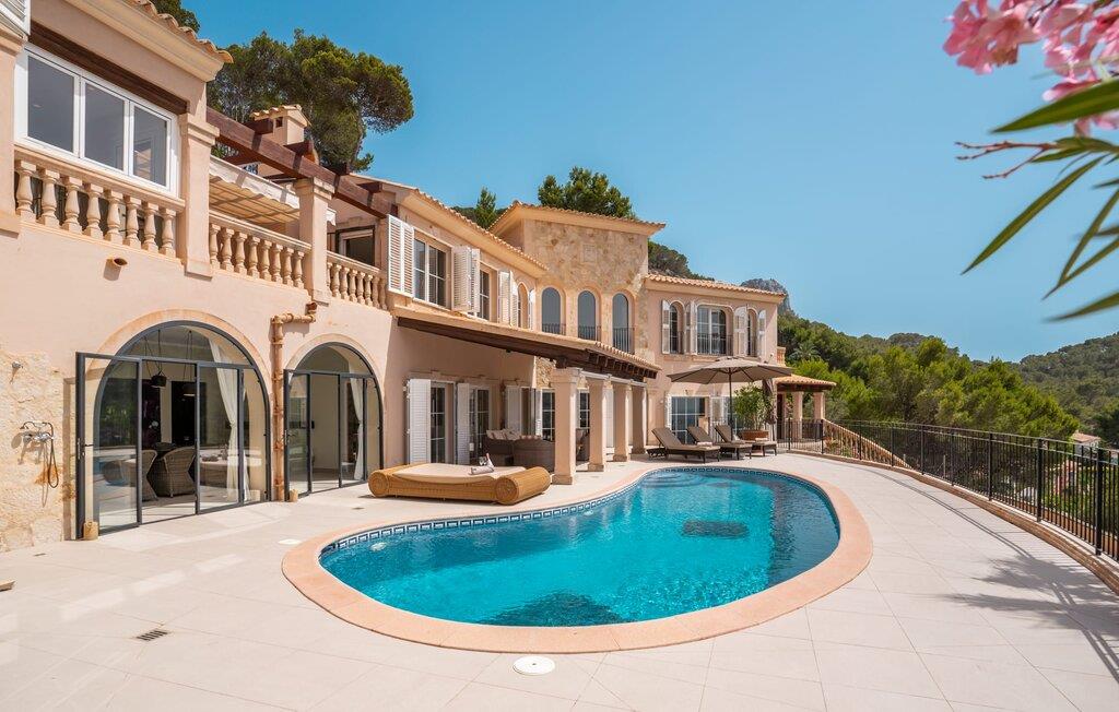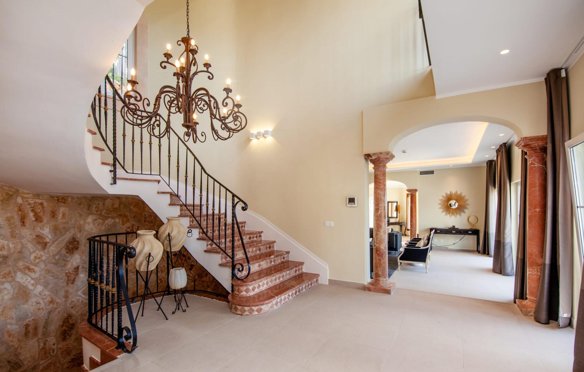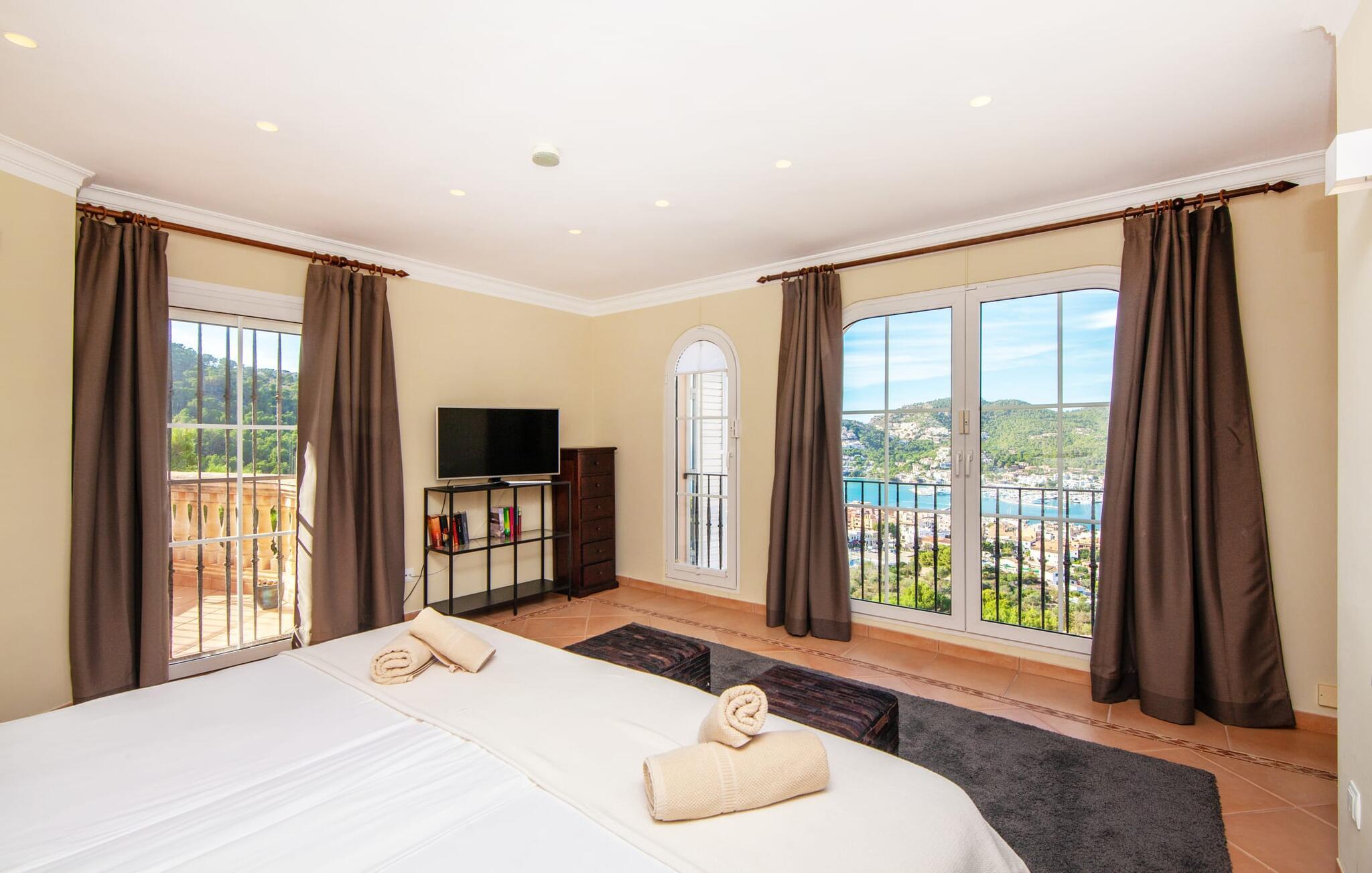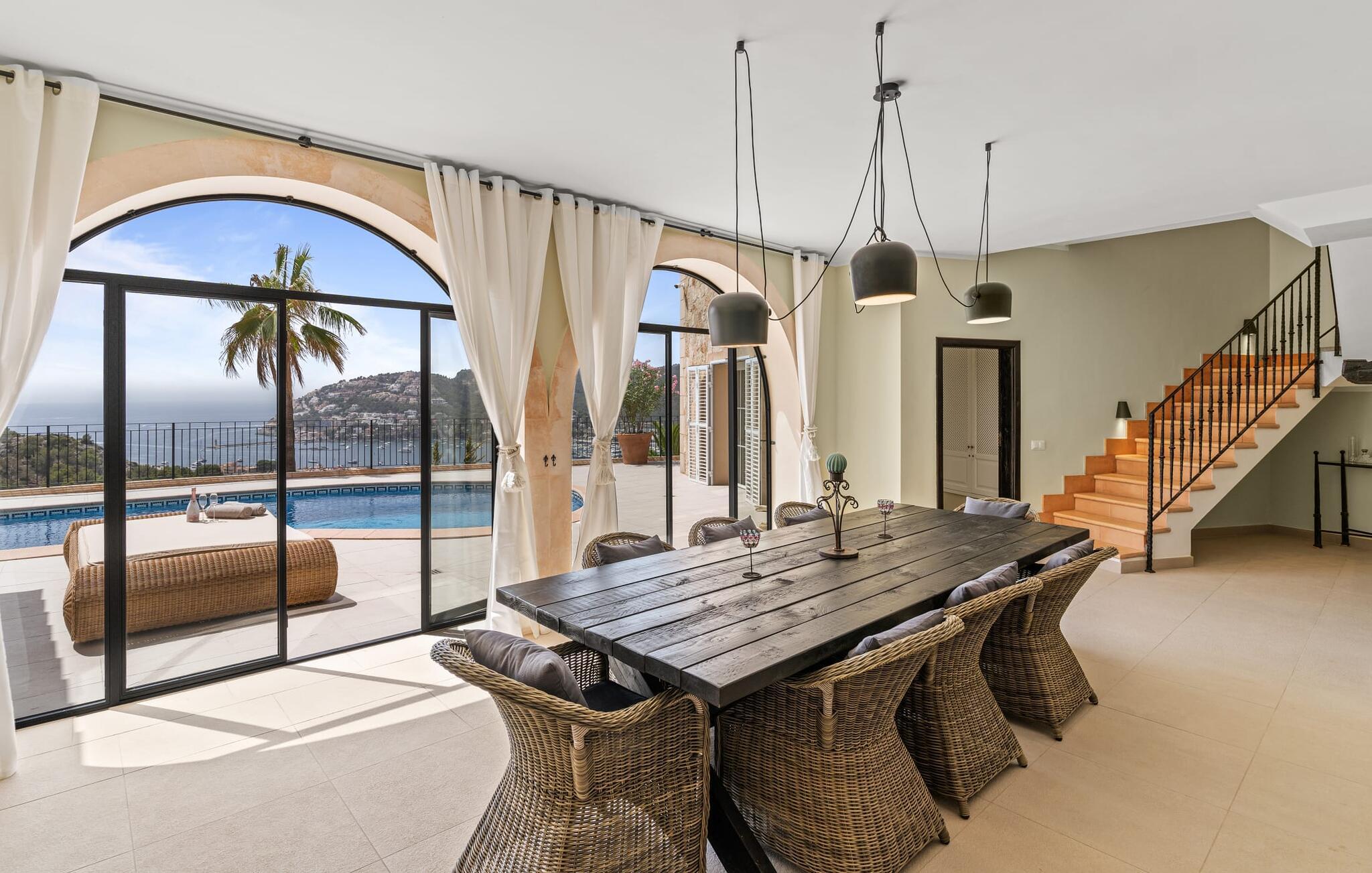 Indenfor er den usædvanligt elegante villa meget rummelig, hvilket sikrer en høj grad af privatliv, selv når den er fuldt besat. Behageligt naturligt lys strømmer ind gennem de delvist gulv-til-loft-vinduer, mens den smukke panoramaudsigt også kan nydes indefra. Elegante møbler, søjler, naturstenselementer, effektiv belysning og kunstneriske dekorationer skaber en usædvanlig stilfuld atmosfære. Huset strækker sig over to etager. Stueetagen består af et stort køkken med en tilstødende spiseplads og en stue, hvor pejsen tjener et rent dekorativt formål. Et soveværelse med dobbeltseng og eget badeværelse er også placeret på denne etage. Ovenpå er der fire rummelige soveværelser, hver med eget badeværelse. Nyd øjeblikke med ren afslapning i spabadet ved vinduet. Huset har også et fitnessrum med spinningcykel, træningsstation, frie vægte og et yogaområde. Denne luksusvilla er udstyret med aircondition og gulvvarme, hvilket sikrer en komfortabel bolig året rundt. Den luksuriøse "Casa Iris" ligger i udkanten af ??et boligområde over Port d'Andratx på Mallorca. Her finder I en fantastisk udsigt over bugtens imponerende havn samt de omkringliggende bjerge. Indkøb kan foretages direkte i landsbyen eller i Andratx, cirka 6 km væk. Smukke bugter og andre strande ligger kun en kort køretur væk.
