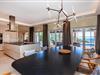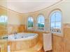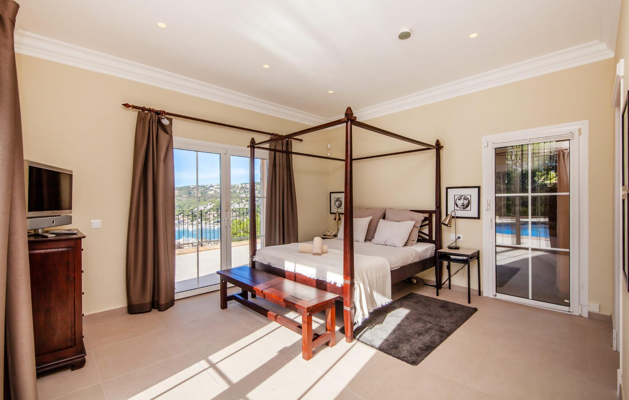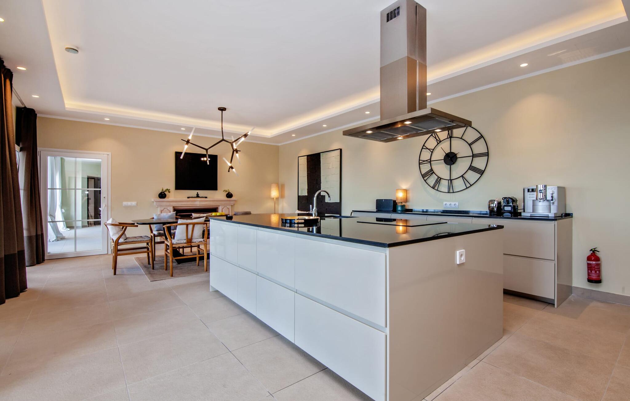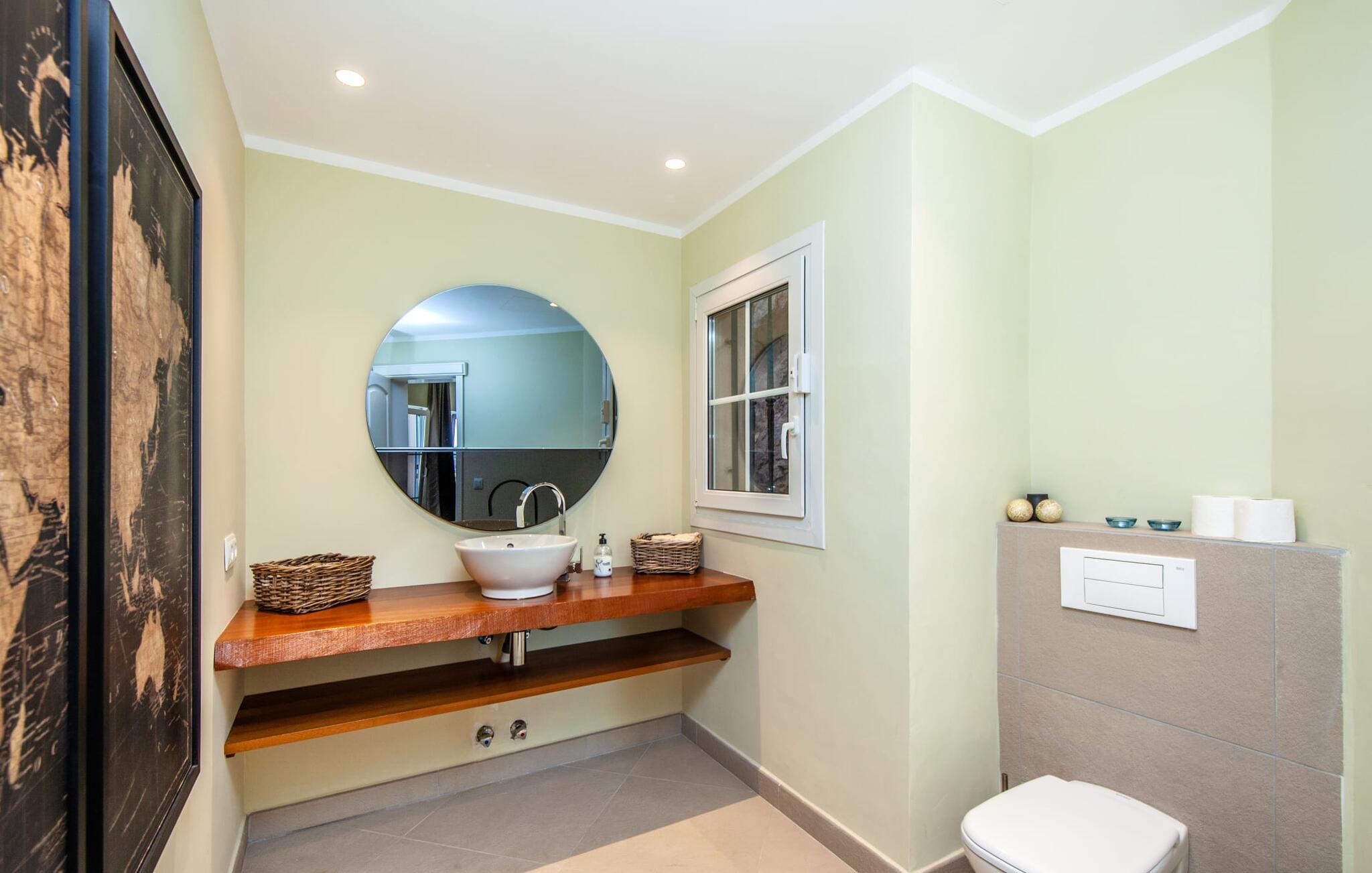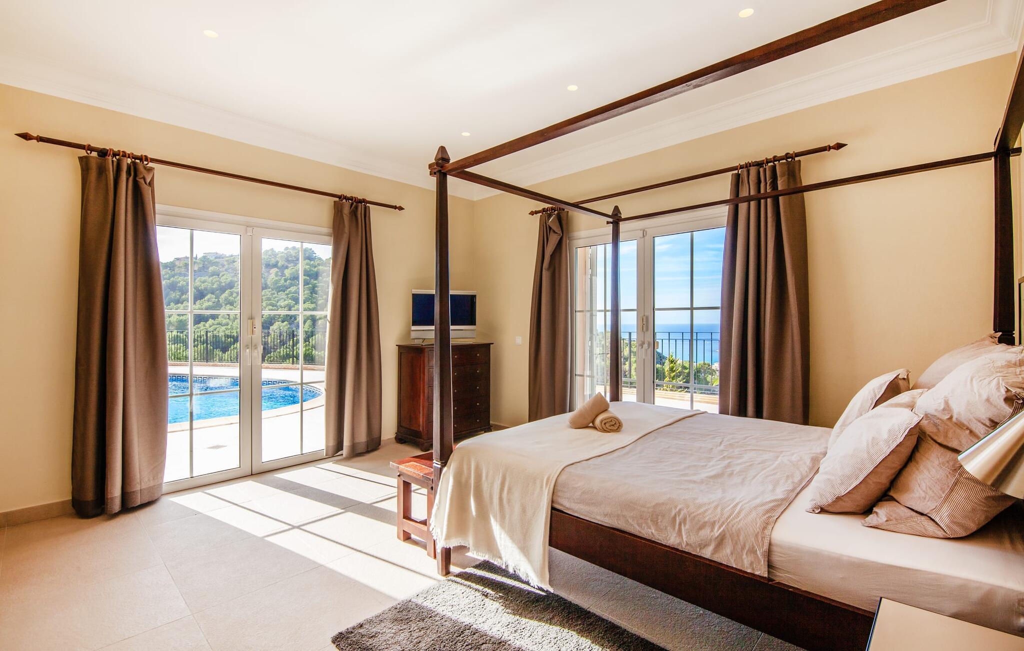 Indenfor er den usædvanligt elegante villa meget rummelig, hvilket sikrer en høj grad af privatliv, selv når den er fuldt besat. Behageligt naturligt lys strømmer ind gennem de delvist gulv-til-loft-vinduer, mens den smukke panoramaudsigt også kan nydes indefra. Elegante møbler, søjler, naturstenselementer, effektiv belysning og kunstneriske dekorationer skaber en usædvanlig stilfuld atmosfære. Huset strækker sig over to etager. Stueetagen består af et stort køkken med en tilstødende spiseplads og en stue, hvor pejsen tjener et rent dekorativt formål. Et soveværelse med dobbeltseng og eget badeværelse er også placeret på denne etage. Ovenpå er der fire rummelige soveværelser, hver med eget badeværelse. Nyd øjeblikke med ren afslapning i spabadet ved vinduet. Huset har også et fitnessrum med spinningcykel, træningsstation, frie vægte og et yogaområde. Denne luksusvilla er udstyret med aircondition og gulvvarme, hvilket sikrer en komfortabel bolig året rundt. Den luksuriøse "Casa Iris" ligger i udkanten af ??et boligområde over Port d'Andratx på Mallorca. Her finder I en fantastisk udsigt over bugtens imponerende havn samt de omkringliggende bjerge. Indkøb kan foretages direkte i landsbyen eller i Andratx, cirka 6 km væk. Smukke bugter og andre strande ligger kun en kort køretur væk.