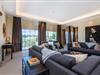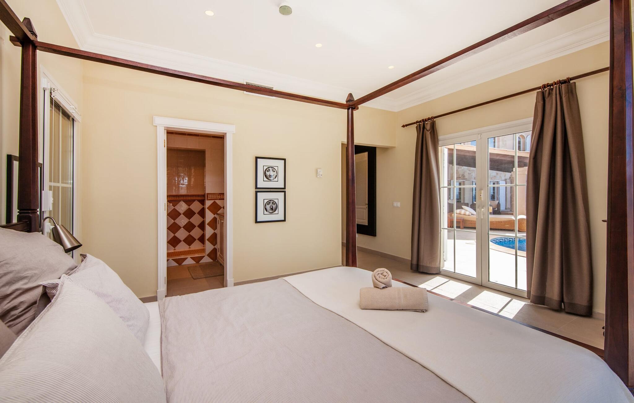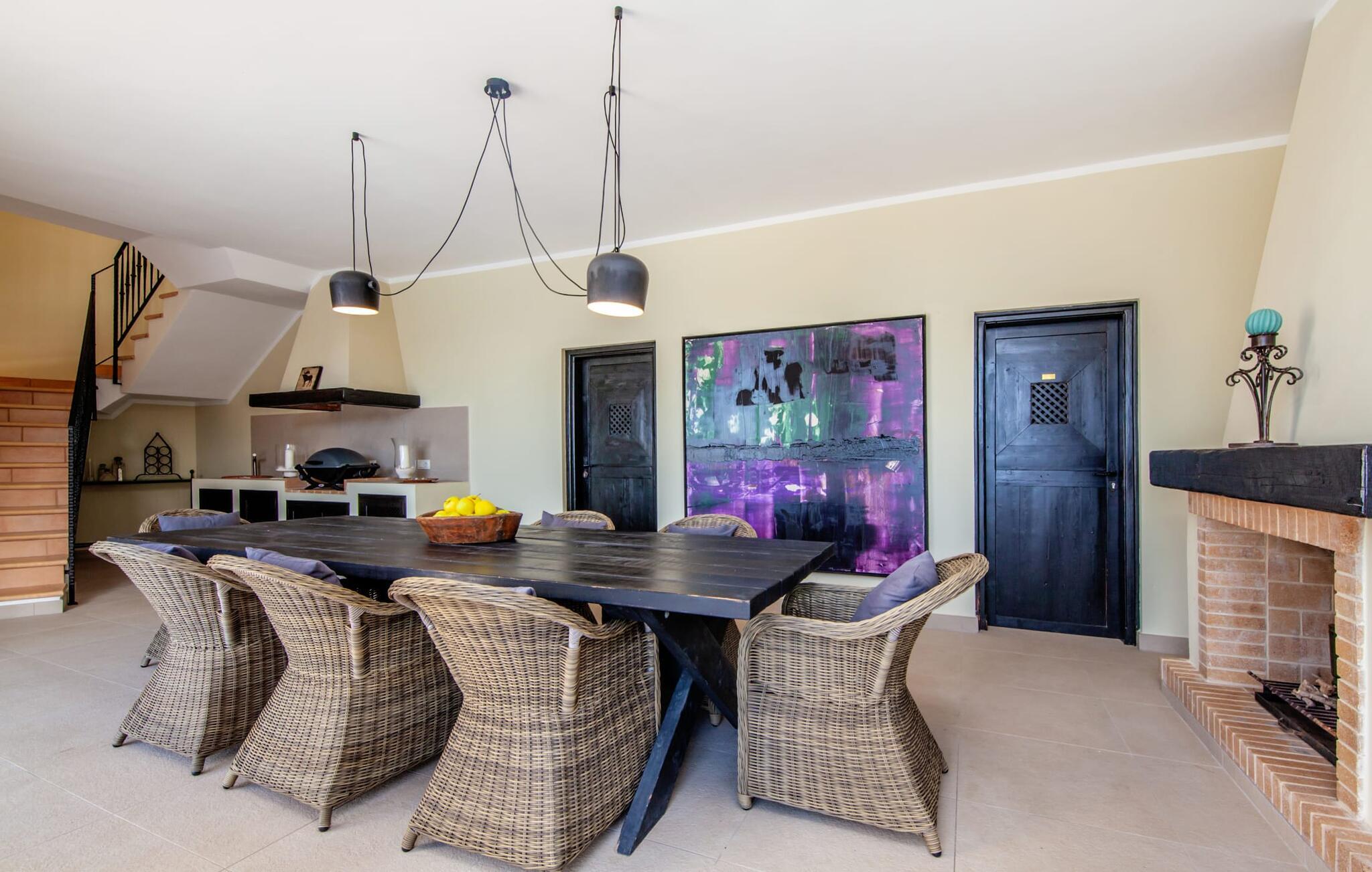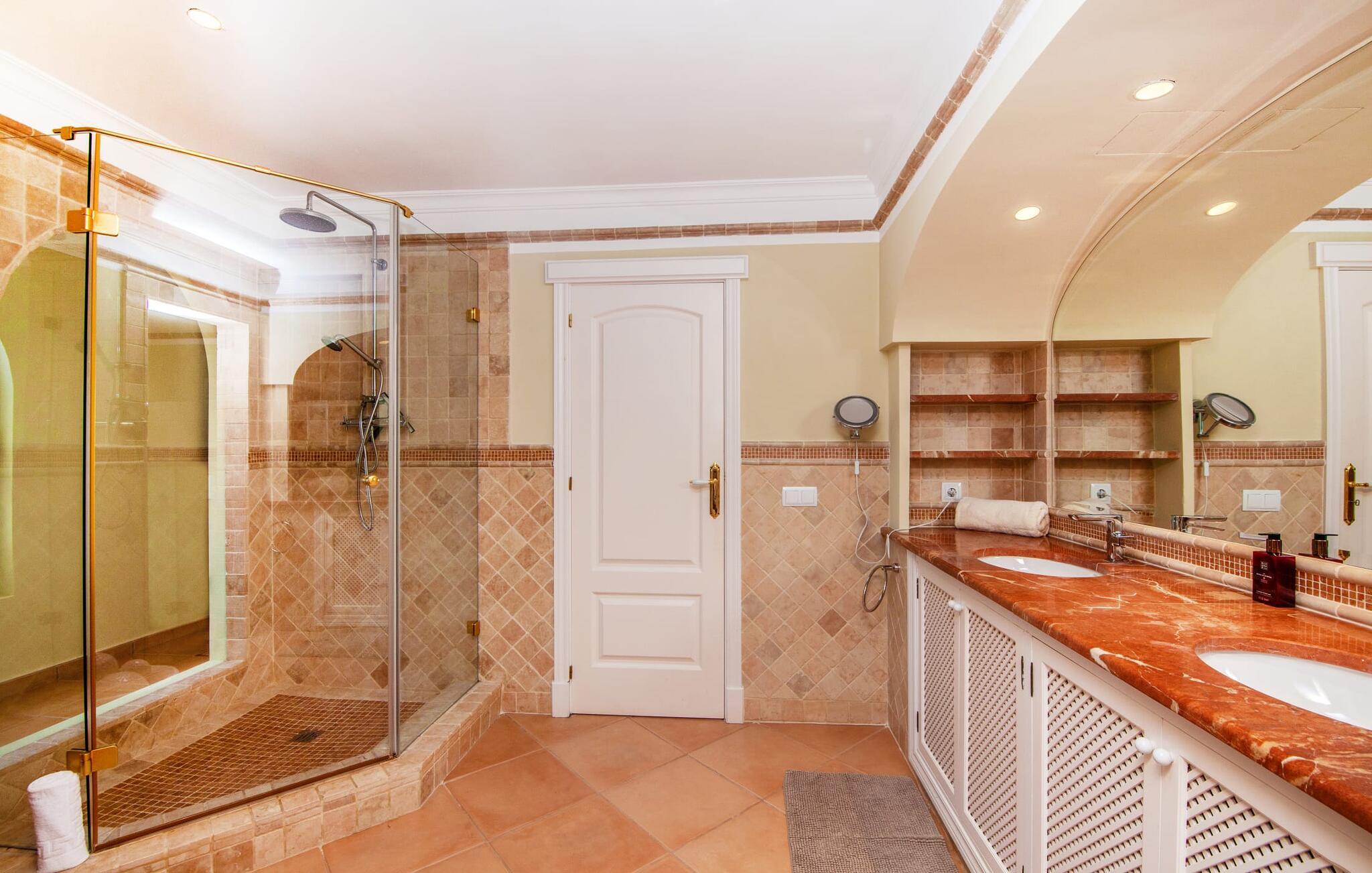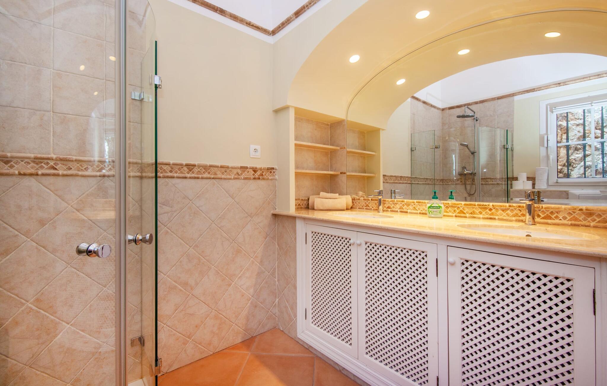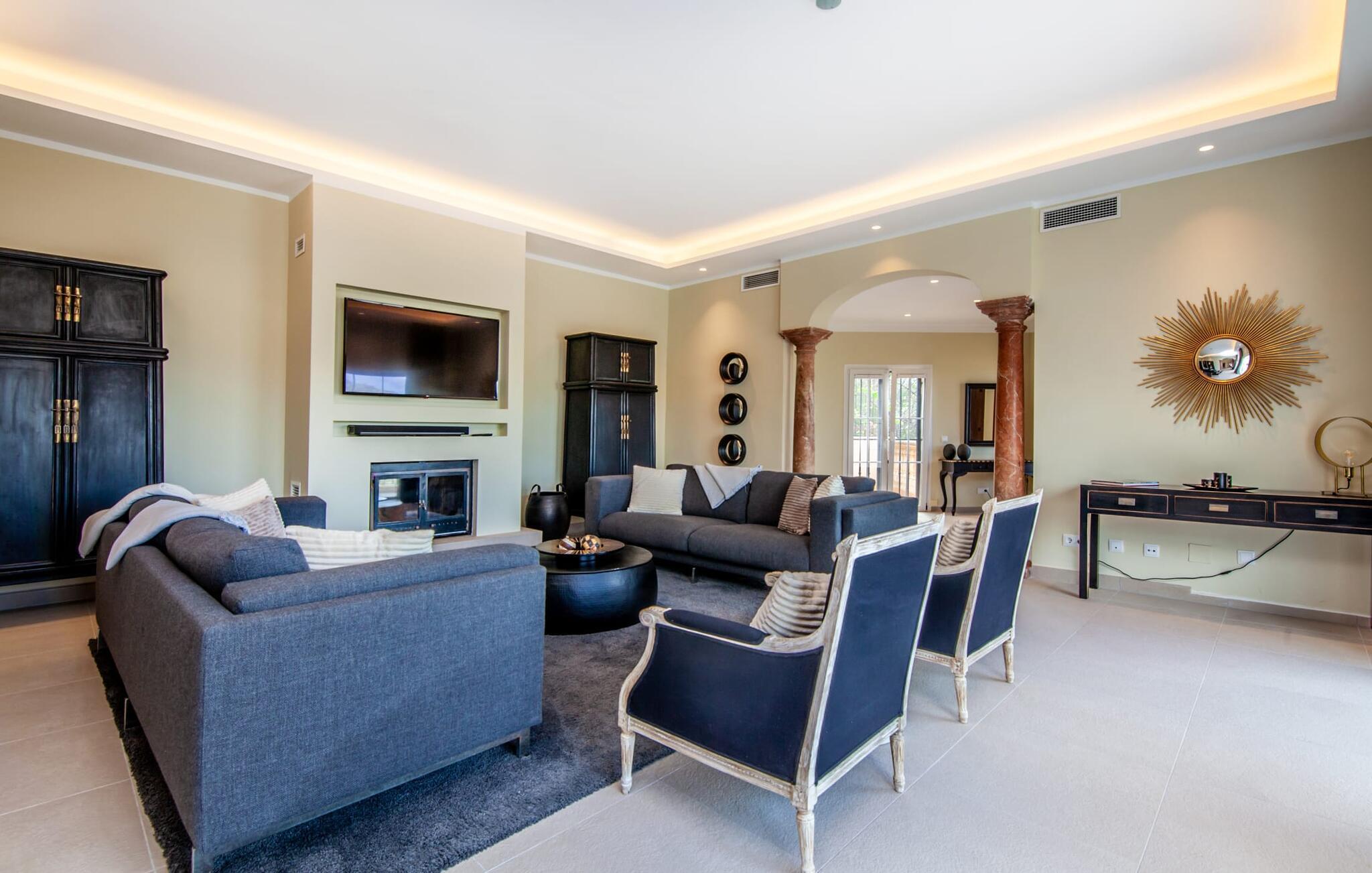 Indenfor er den usædvanligt elegante villa meget rummelig, hvilket sikrer en høj grad af privatliv, selv når den er fuldt besat. Behageligt naturligt lys strømmer ind gennem de delvist gulv-til-loft-vinduer, mens den smukke panoramaudsigt også kan nydes indefra. Elegante møbler, søjler, naturstenselementer, effektiv belysning og kunstneriske dekorationer skaber en usædvanlig stilfuld atmosfære. Huset strækker sig over to etager. Stueetagen består af et stort køkken med en tilstødende spiseplads og en stue, hvor pejsen tjener et rent dekorativt formål. Et soveværelse med dobbeltseng og eget badeværelse er også placeret på denne etage. Ovenpå er der fire rummelige soveværelser, hver med eget badeværelse. Nyd øjeblikke med ren afslapning i spabadet ved vinduet. Huset har også et fitnessrum med spinningcykel, træningsstation, frie vægte og et yogaområde. Denne luksusvilla er udstyret med aircondition og gulvvarme, hvilket sikrer en komfortabel bolig året rundt. Den luksuriøse "Casa Iris" ligger i udkanten af ??et boligområde over Port d'Andratx på Mallorca. Her finder I en fantastisk udsigt over bugtens imponerende havn samt de omkringliggende bjerge. Indkøb kan foretages direkte i landsbyen eller i Andratx, cirka 6 km væk. Smukke bugter og andre strande ligger kun en kort køretur væk.