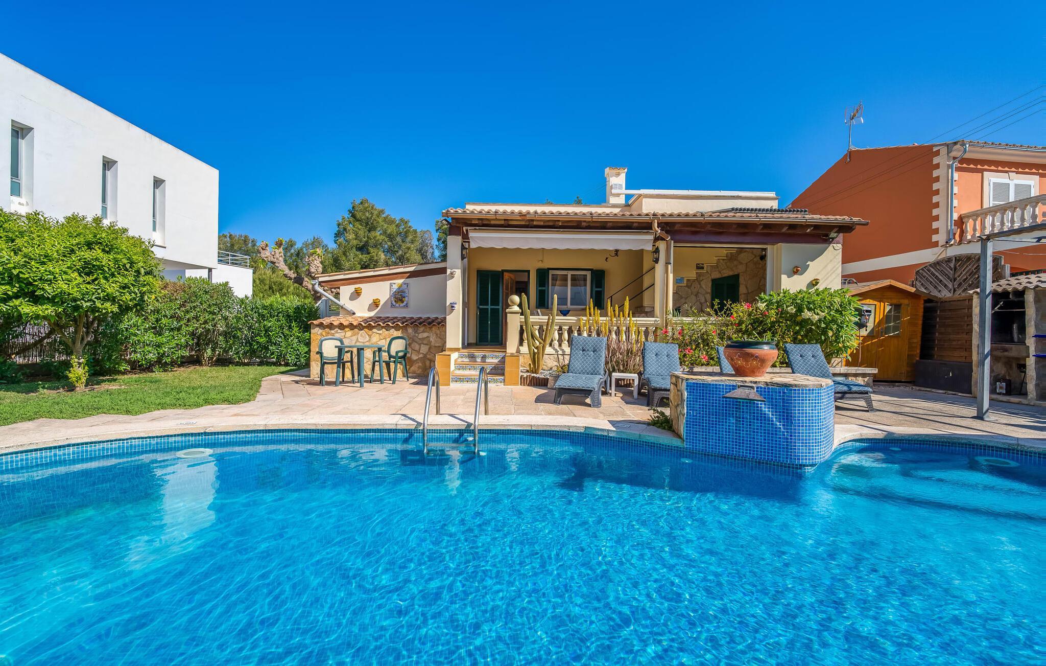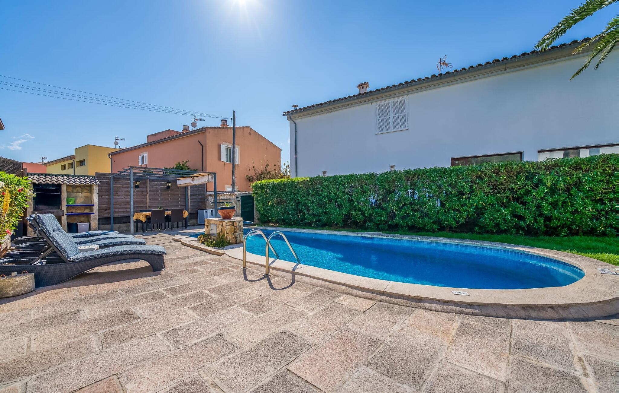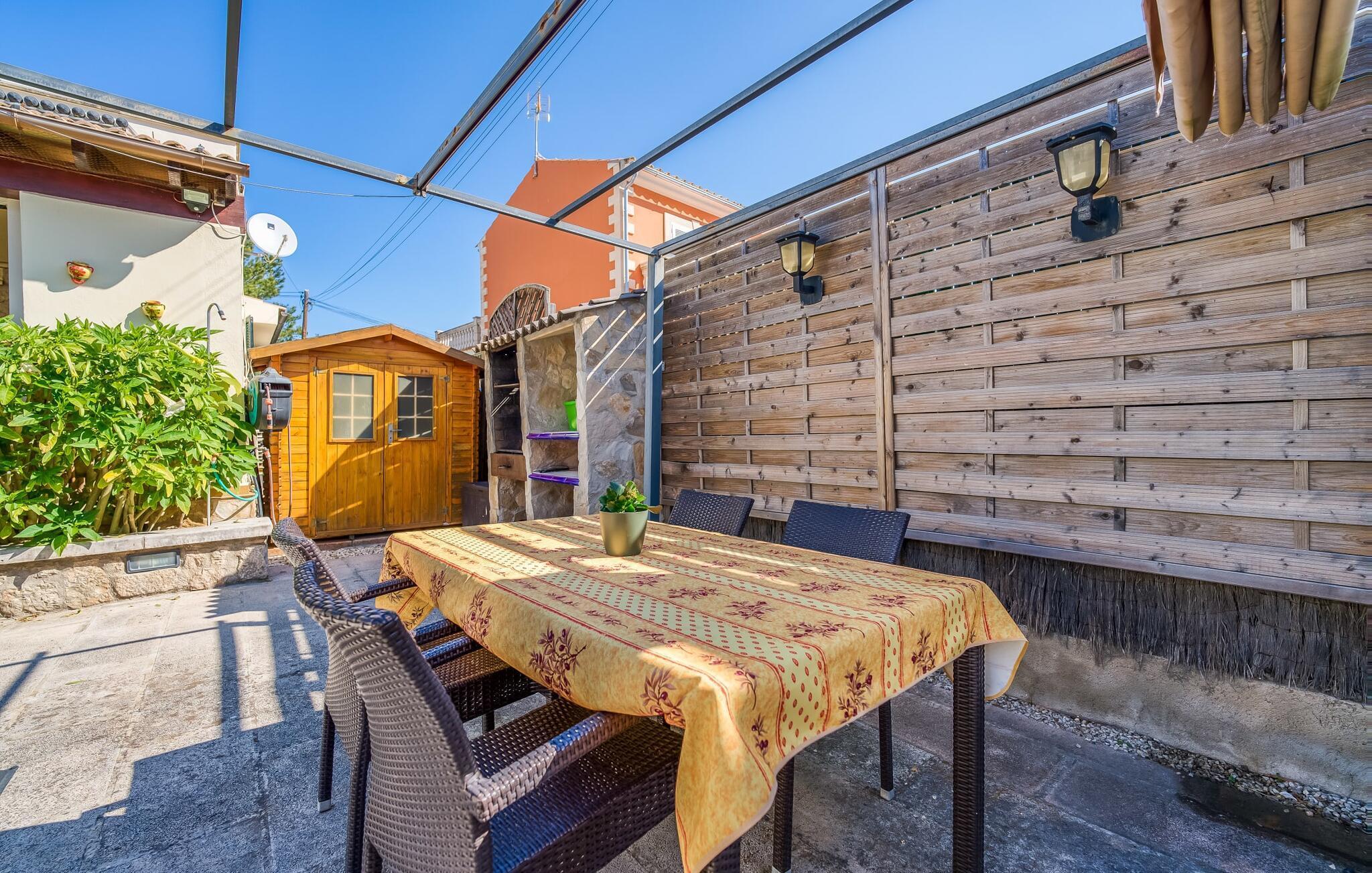 Oplev villaen "Casa Kerchner" med os, som tilbyder perfekt udstyret ferieindkvartering til en familie eller to par. I en velholdt urbanisering, mellem middelhavskrukkeplanter og en smukt anlagt forhave, kan du nyde alt, hvad du kan ønske dig på ferien på Mallorca: en pool med udendørs bruser, en overdækket og en tagterrasse samt en muret grill til en afkølet grill. Soldyrkere vil finde deres yndlingssted på de komfortable liggestole. På trods af den urbane atmosfære i udkanten af middelalderens Alcúdia, kan du nyde den typiske mallorcanske ro i dette smukke feriehus. Om aftenen kan I slappe af på tagterrassen med udsigt over kvarteret og drømme om stjernehimlen. Den hyggelige villa inviterer også til at drømme i de to dobbeltværelser med masser af opbevaringsplads. At have det godt er fuldt ud muligt i et moderne interiør, der emmer af afslappethed. Fra terrassen kommer du direkte ind i det fuldt udstyrede køkken. Du har valget mellem den udendørs spiseplads på verandaen eller den kombinerede opholds- og spiseplads. Gør dette afhængigt af dit humør og årstiden. Med varme, aircondition og godt internet er villaen "Casa Kerchner" velegnet til en helårsferie eller endda en "arbejds-ation". Mellem de to soveværelser er det smarte brusebadeværelse med bruser fra gulv til loft. Samlet set imponerer ferieboligen med lyse rum og en gennemtænkt planløsning. Velkommen til en afslappende ferie i Alcúdia og villaen "Casa Kerchner". "Casa Kerchner" med sin smukke have, pool, grill og tagterrasse tilbyder feriegæster alt, hvad de kan ønske sig på Mallorca. Feriehuset ligger i en bygd nær Alcúdia, hvorfra du kan gøre dine dagligvarer eller shoppe tøj og souvenirs. De store strande i bugten Alcúdia eller Pollença er kun fem minutters kørsel væk. Dette er et Fincallorca feriehus.