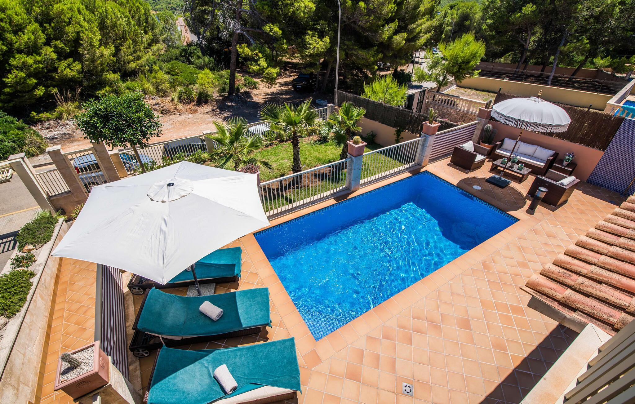 En ferie mellem hav og bjerge – hvor kan du ellers finde det end på Mallorca? Den terracottafarvede villa med den hvide Persiana udstråler den maritime charme af et helt særligt feriehus på vores yndlingsø. Den vidunderlige udsigt over Llevant-bjergene og den samtidige blide oversvømmelse af Cala Mesquida præger beliggenheden. Udendørsområdet i den to-etagers villa på den østlige del af øen nær Capdepera og Cala Ratjada imponerer også med sin grønne alsidighed. Fordi der er færre naboer, er hele ejendommen vidunderligt privat, så du kan nyde den luksuriøst anlagte grund med en flisebelagt udendørs pool, solterrasse, lounge og liggestole samt det fuldstændigt privatlivsbeskyttede spabad i fred og ro. En grill og en overdækket terrasse på verandaen til det familievenlige, moderne feriehus med maritim karakter fuldender forkælelsesprogrammet. De smukke palmer og den mallorcanske prydfontæne er blot nogle af de detaljer, der giver denne udsøgte mallorcanske villa sin ånd. Dette er et Fincallorca feriehus. Den baleariske ånd af lethed afspejles også i strandhusets lyse interiør. Terrassen med polyrattan-spisepladsen er det centrale samlingspunkt, fordi du har direkte adgang til den udendørs spiseplads fra den rummelige stue og spisestue samt det separate køkken. Høje rum, naturlige farver som terracotta og varme trætoner bestemmer feel-good-karakteren og giver samtidig en nutidig vægtløshed. Moderne teknologi bør dog ikke mangle i det fuldt udstyrede køkken eller i de smarte badeværelser (et med brusekabine en suite på øverste etage og det andet med badekar i stueetagen). De tre klimatiserede soveværelser er tilgængelige for en afslappende nattesøvn. Et af soveværelserne har en lille altan og et walk-in closet. “Casa León de Cala Mesquida” er ideel ikke kun for en eller to familier, men også for en gruppe venner, der ved, at man ikke altid skal vælge mellem hav og bjerge for at få en perfekt ferie på Mallorca. I en fantastisk beliggenhed mellem bjergene og havet, opdag den moderne havudsigt villa "Casa León de Cala Mesquida". Som navnet antyder, ligger den mallorcanske juvel i den idylliske kystby Cala Mesquida på den østlige del af øen. I gåafstand ligger den lille bymidte og sandstranden og havet.