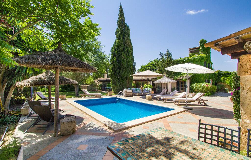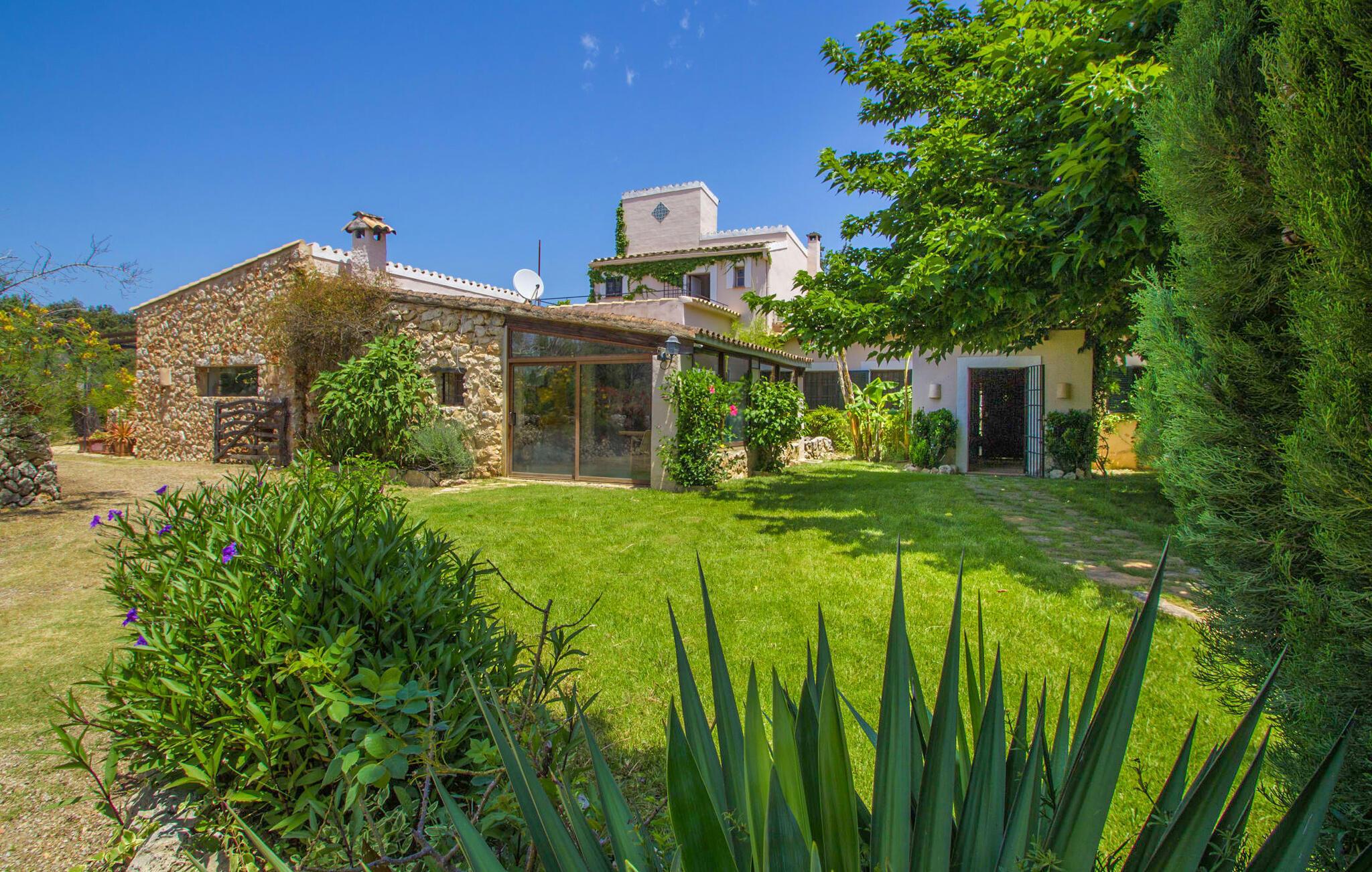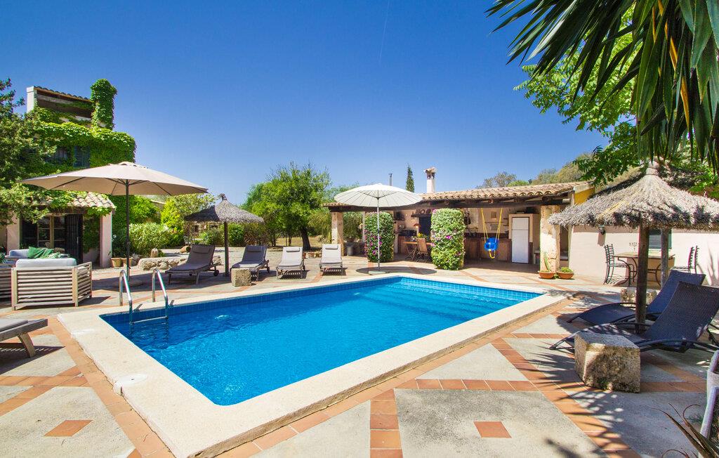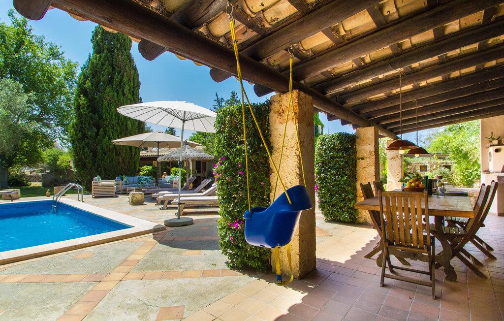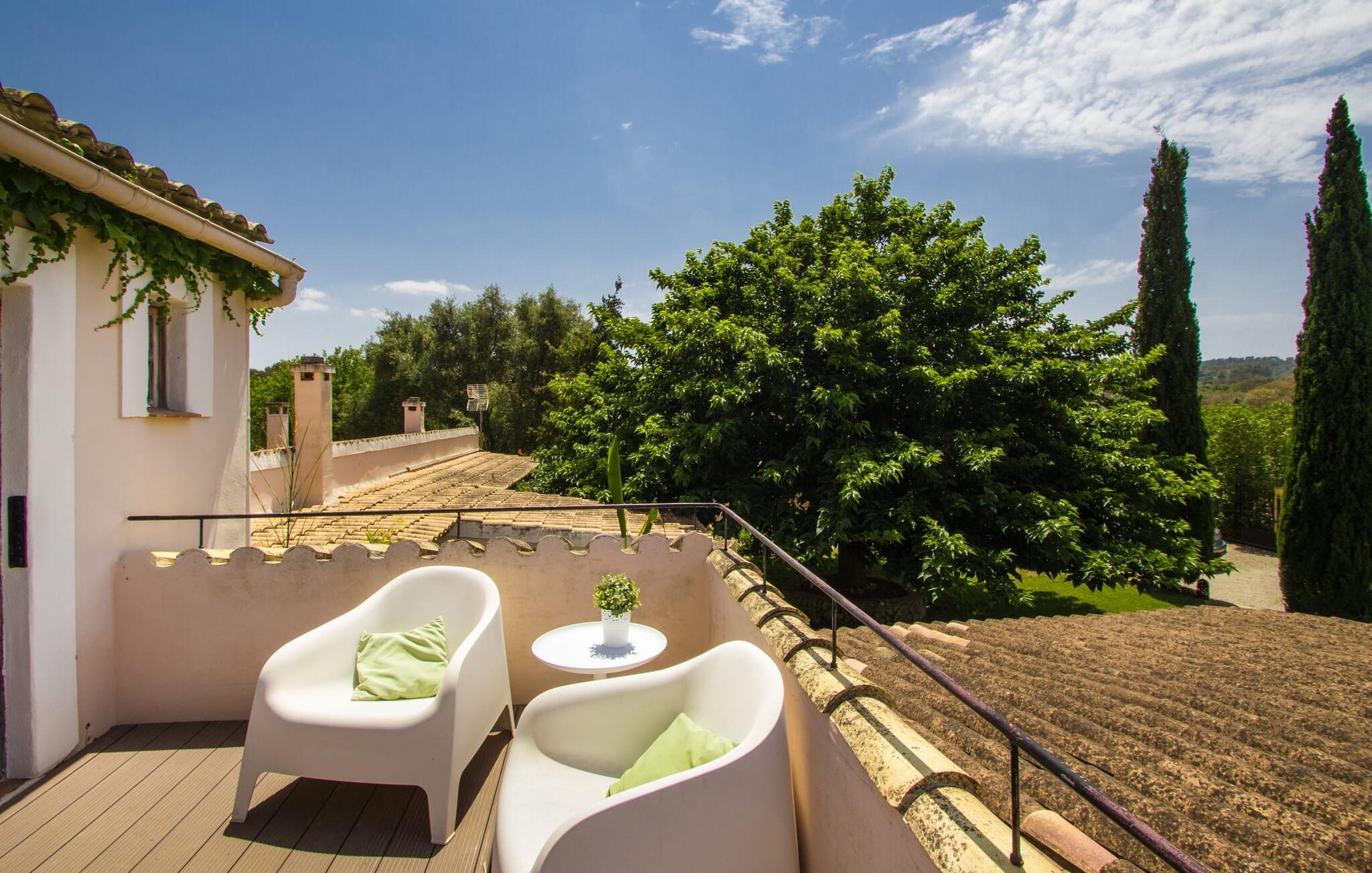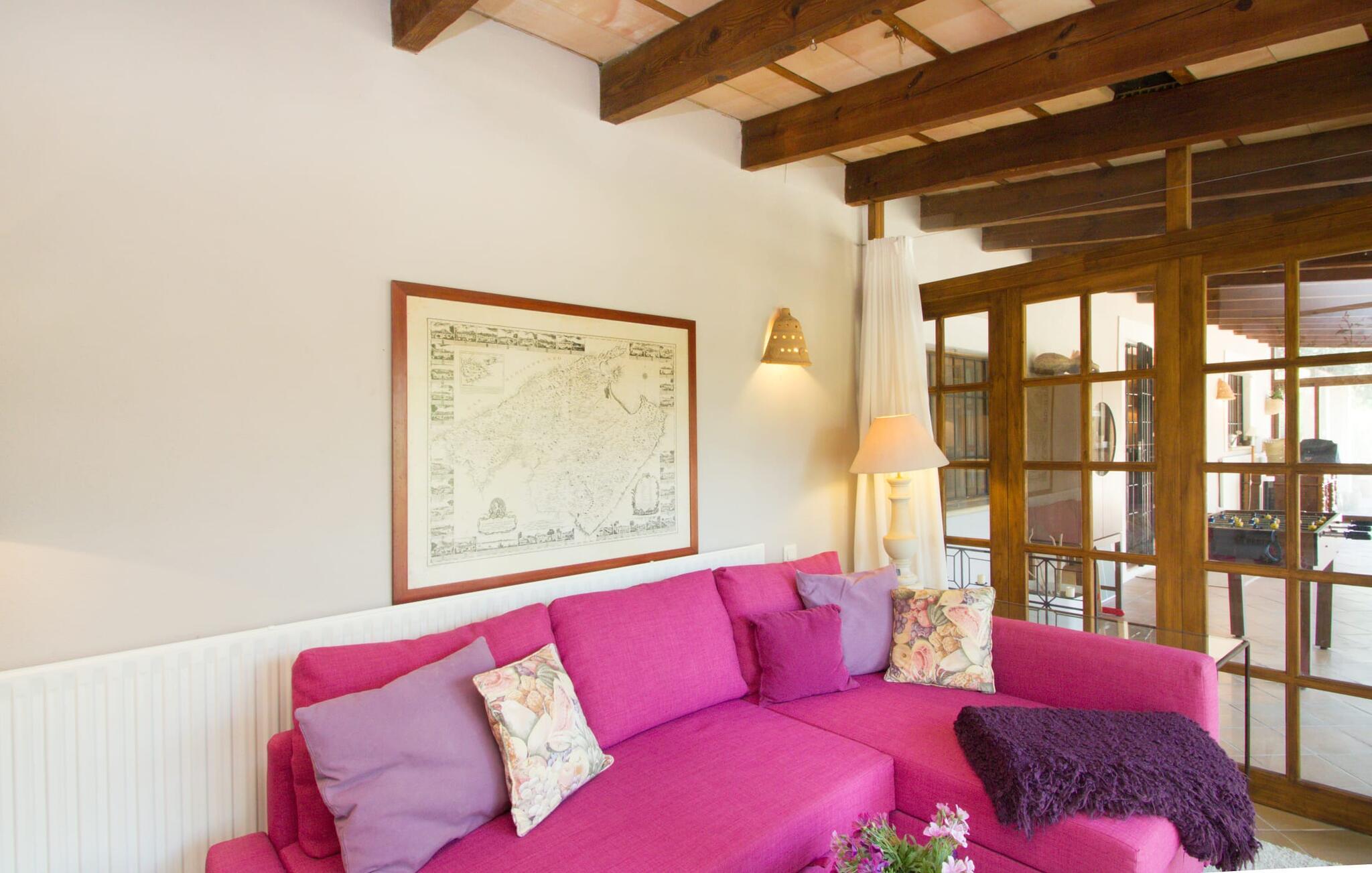 Midt på øen og midt i et typisk middelhavslandskab: dette er den idylliske beliggenhed af villaen "Casa S'Era de Costitx", som blev bygget på en grund på over 5.000 m². Det kønne hus, delvist bevokset med frodigt grønt, passer meget smagfuldt ind i omgivelserne - i ordets bedste forstand føles det, som om bygningen altid har ligget her. Udendørsområdet, designet med stor sans for detaljer, er et rigtigt højdepunkt. Med så mange muligheder vil I have svært ved at beslutte, hvor I skal hen først. I kan vælge liggestolene under parasoller eller de polstrede udendørs siddepladser. Udekøkkenet med spisebord og stole har også et flot, rustikt udtryk - og en gynge til børn med udsigt til poolen. I kan spise på den overdækkede terrasse direkte ved huset, eller få en kop kaffe i det elegante opholdsområde på siden af huset eller på den solrige tagterrasse. Eller I kan spille et spil bordtennis med jeres medrejsende ved hotellets eget bord i den behagelige skygge. En fantastisk blanding af traditionel og moderne stil venter jer i jeres sommerhus. Hvide vægge, loftsbjælker, vindues- og dørkarme i træ og naturfarvede fliser skaber en vidunderlig autentisk landstedsstemning, som får et nutidigt præg af smart boligtilbehør. I stueplan finder I indgangspartiet og et gæstetoilet samt det rummelige køkken med spisekammer, som er åbent og løber direkte ud i spisepladsen. Det runde spisebord er oplyst af en lysekrone - her kan I nyde en fest sammen i fred og ro. Køkkenet og spisepladsen er også halvåbne til stuen - så I kaster måske allerede et længselsfuldt blik på de to komfortable sofaer, der gerne vil lokke jer over fra naboen. Når I er træt, kan I trække jer tilbage til et af de to romantisk indrettede soveværelser, nogle med naturstensvægge og charmerende skodder. Et moderne badeværelse fuldender boligkomforten i stueetagen. På øverste etage er der endnu et soveværelse med et elegant en-suite badeværelse. Pak en flaske vand og et par snacks og tag afsted: I vil se, at det er det værd - det imponerende landskab i centrum af øen har sin helt særlige charme! Omgivelserne omkring jeres hus er herligt landlige, der er næsten ikke direkte naboer - kun villaejerne, som I kun deler indkørslen med. For at gøre jeres indkøb skal I køre de 6,8 km til Costitx, langs vejen, som kan være hørbar afhængigt af vindretningen. Landsbyen er ikke en af Mallorcas kendte turistmål, men netop derfor er den et besøg værd. Byens centrum er rådhuset, en kirke fra 1600-tallet og en markedsplads indrammet af mange attraktive palæer. Hvis I kommer på en lørdag, kan I slentre gennem det ugentlige marked ved Mare de Déu og Plaça del Jardí. Derudover driver Costitx øens eneste planetarium og observatorium, som også tilbyder guidede ture. Hvis I foretrækker at besøge havet, kan I køre cirka 33 km til den rolige, for det meste uberørte strand Es Penyo. Placeringen af villaen "Casa S'Era de Costitx", delvist romantisk indrettet med frodige grønne områder, er ideel for naturelskere, der kan lide at gå, vandre eller cykle gennem landskabet. Men den store ejendom byder også på et godt sted at slappe af: lige ved siden af huset med dets forskellige terrasseområder finder I ikke kun poolen, men også en gynge, et bordtennisbord, et bordfodboldbord og et fantastisk udekøkken. Den nærmeste strand ligger cirka 33,8 km væk, mens landsbyen Costitx kun ligger 6,8 km væk.