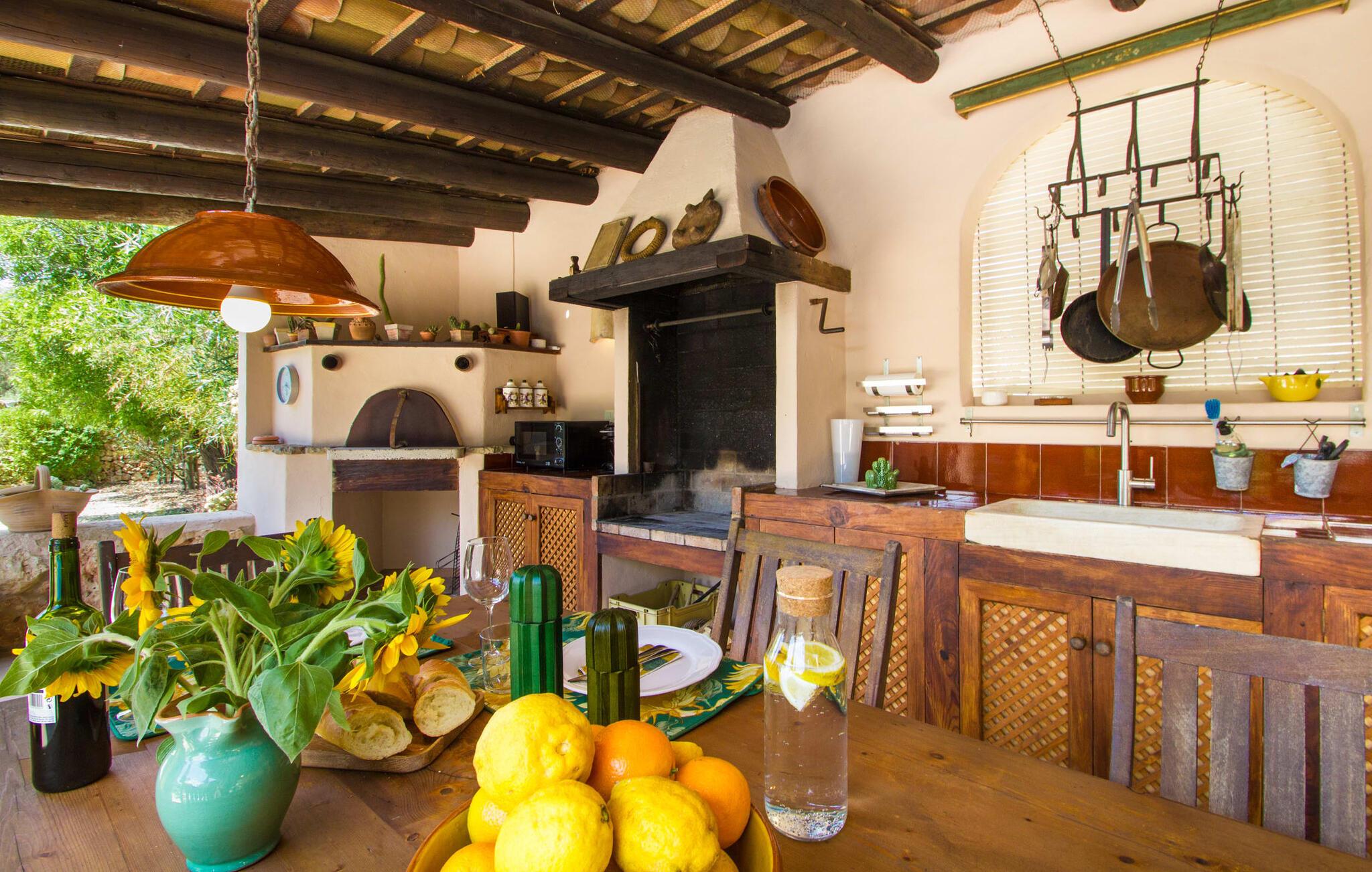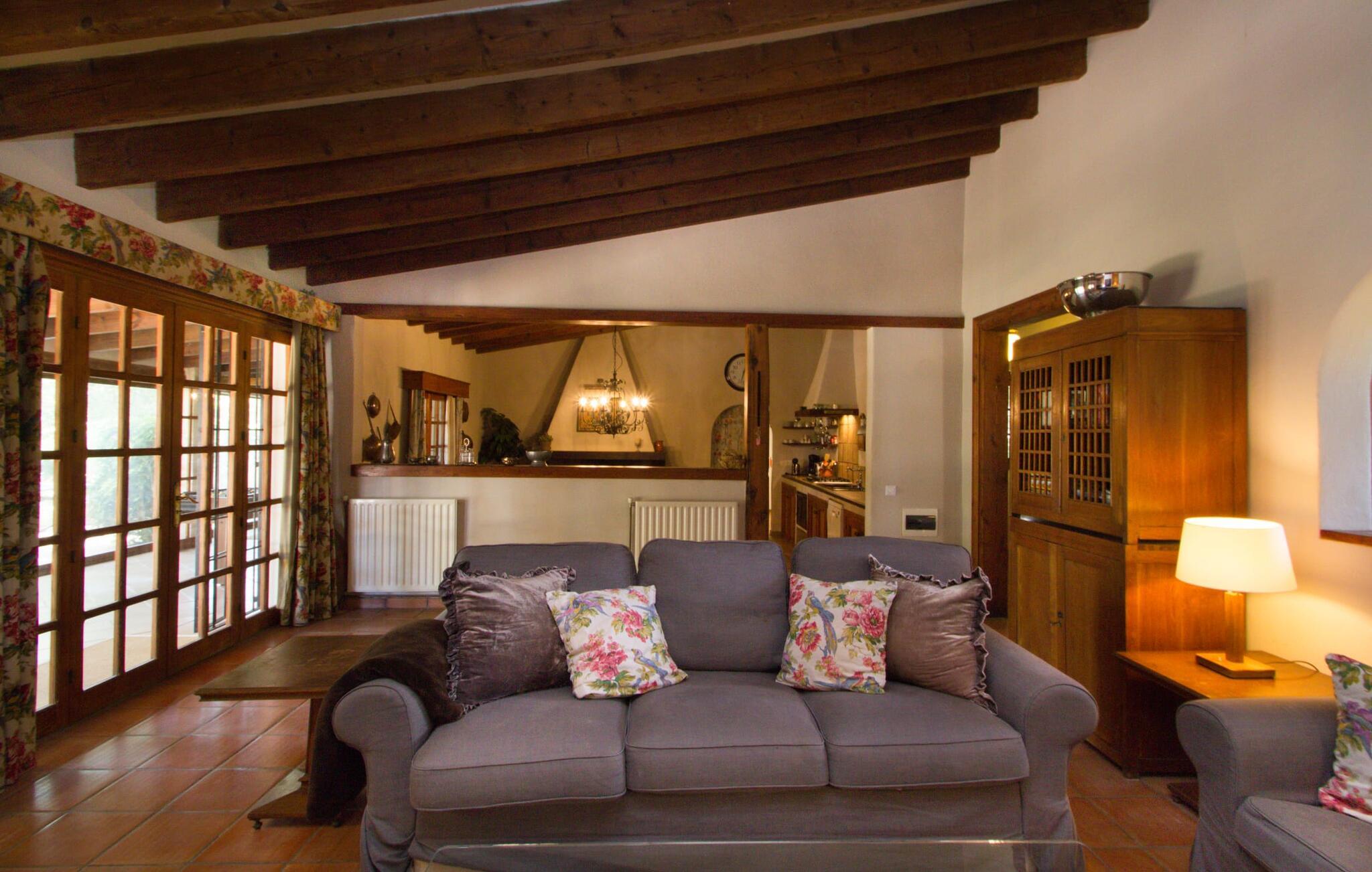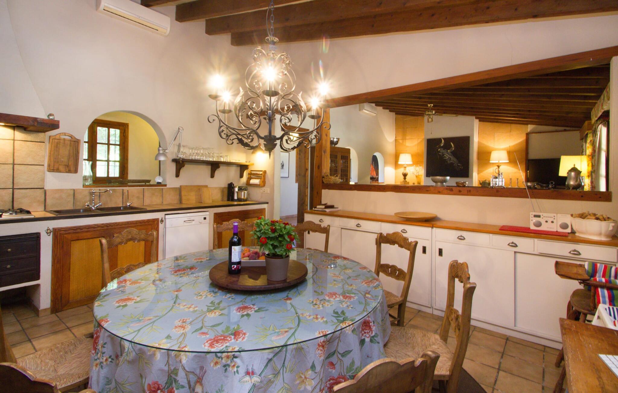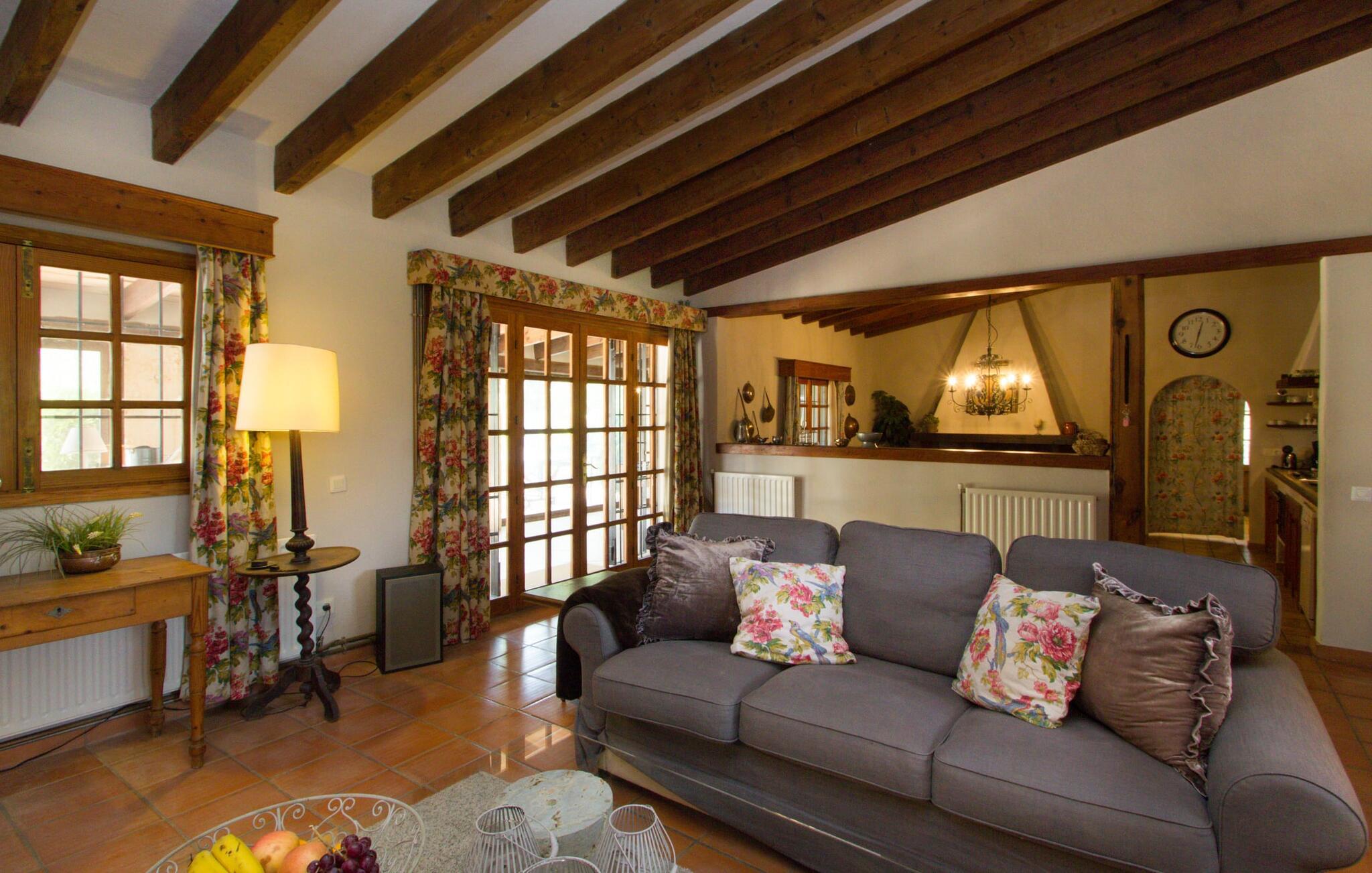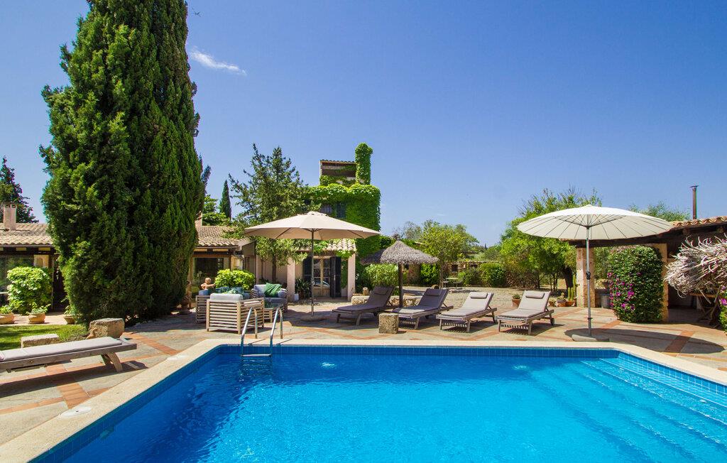 Midt på øen og midt i et typisk middelhavslandskab: dette er den idylliske beliggenhed af villaen "Casa S'Era de Costitx", som blev bygget på en grund på over 5.000 m². Det kønne hus, delvist bevokset med frodigt grønt, passer meget smagfuldt ind i omgivelserne - i ordets bedste forstand føles det, som om bygningen altid har ligget her. Udendørsområdet, designet med stor sans for detaljer, er et rigtigt højdepunkt. Med så mange muligheder vil I have svært ved at beslutte, hvor I skal hen først. I kan vælge liggestolene under parasoller eller de polstrede udendørs siddepladser. Udekøkkenet med spisebord og stole har også et flot, rustikt udtryk - og en gynge til børn med udsigt til poolen. I kan spise på den overdækkede terrasse direkte ved huset, eller få en kop kaffe i det elegante opholdsområde på siden af huset eller på den solrige tagterrasse. Eller I kan spille et spil bordtennis med jeres medrejsende ved hotellets eget bord i den behagelige skygge. En fantastisk blanding af traditionel og moderne stil venter jer i jeres sommerhus. Hvide vægge, loftsbjælker, vindues- og dørkarme i træ og naturfarvede fliser skaber en vidunderlig autentisk landstedsstemning, som får et nutidigt præg af smart boligtilbehør. I stueplan finder I indgangspartiet og et gæstetoilet samt det rummelige køkken med spisekammer, som er åbent og løber direkte ud i spisepladsen. Det runde spisebord er oplyst af en lysekrone - her kan I nyde en fest sammen i fred og ro. Køkkenet og spisepladsen er også halvåbne til stuen - så I kaster måske allerede et længselsfuldt blik på de to komfortable sofaer, der gerne vil lokke jer over fra naboen. Når I er træt, kan I trække jer tilbage til et af de to romantisk indrettede soveværelser, nogle med naturstensvægge og charmerende skodder. Et moderne badeværelse fuldender boligkomforten i stueetagen. På øverste etage er der endnu et soveværelse med et elegant en-suite badeværelse. Pak en flaske vand og et par snacks og tag afsted: I vil se, at det er det værd - det imponerende landskab i centrum af øen har sin helt særlige charme! Omgivelserne omkring jeres hus er herligt landlige, der er næsten ikke direkte naboer - kun villaejerne, som I kun deler indkørslen med. For at gøre jeres indkøb skal I køre de 6,8 km til Costitx, langs vejen, som kan være hørbar afhængigt af vindretningen. Landsbyen er ikke en af Mallorcas kendte turistmål, men netop derfor er den et besøg værd. Byens centrum er rådhuset, en kirke fra 1600-tallet og en markedsplads indrammet af mange attraktive palæer. Hvis I kommer på en lørdag, kan I slentre gennem det ugentlige marked ved Mare de Déu og Plaça del Jardí. Derudover driver Costitx øens eneste planetarium og observatorium, som også tilbyder guidede ture. Hvis I foretrækker at besøge havet, kan I køre cirka 33 km til den rolige, for det meste uberørte strand Es Penyo. Placeringen af villaen "Casa S'Era de Costitx", delvist romantisk indrettet med frodige grønne områder, er ideel for naturelskere, der kan lide at gå, vandre eller cykle gennem landskabet. Men den store ejendom byder også på et godt sted at slappe af: lige ved siden af huset med dets forskellige terrasseområder finder I ikke kun poolen, men også en gynge, et bordtennisbord, et bordfodboldbord og et fantastisk udekøkken. Den nærmeste strand ligger cirka 33,8 km væk, mens landsbyen Costitx kun ligger 6,8 km væk.