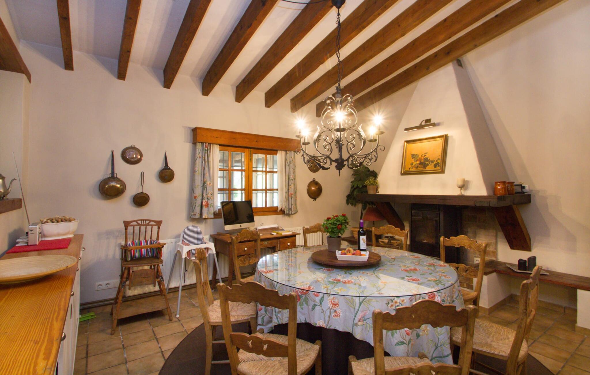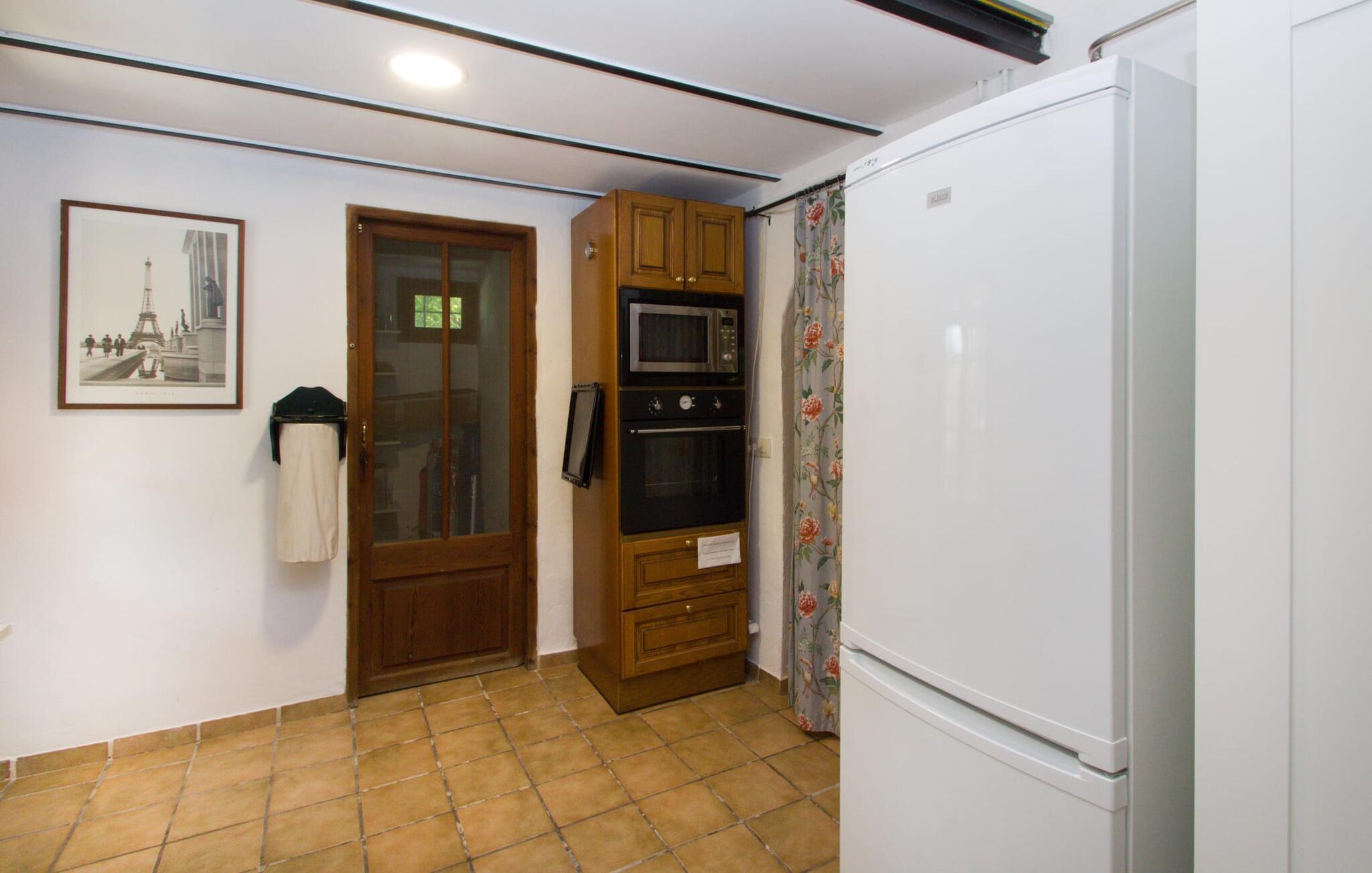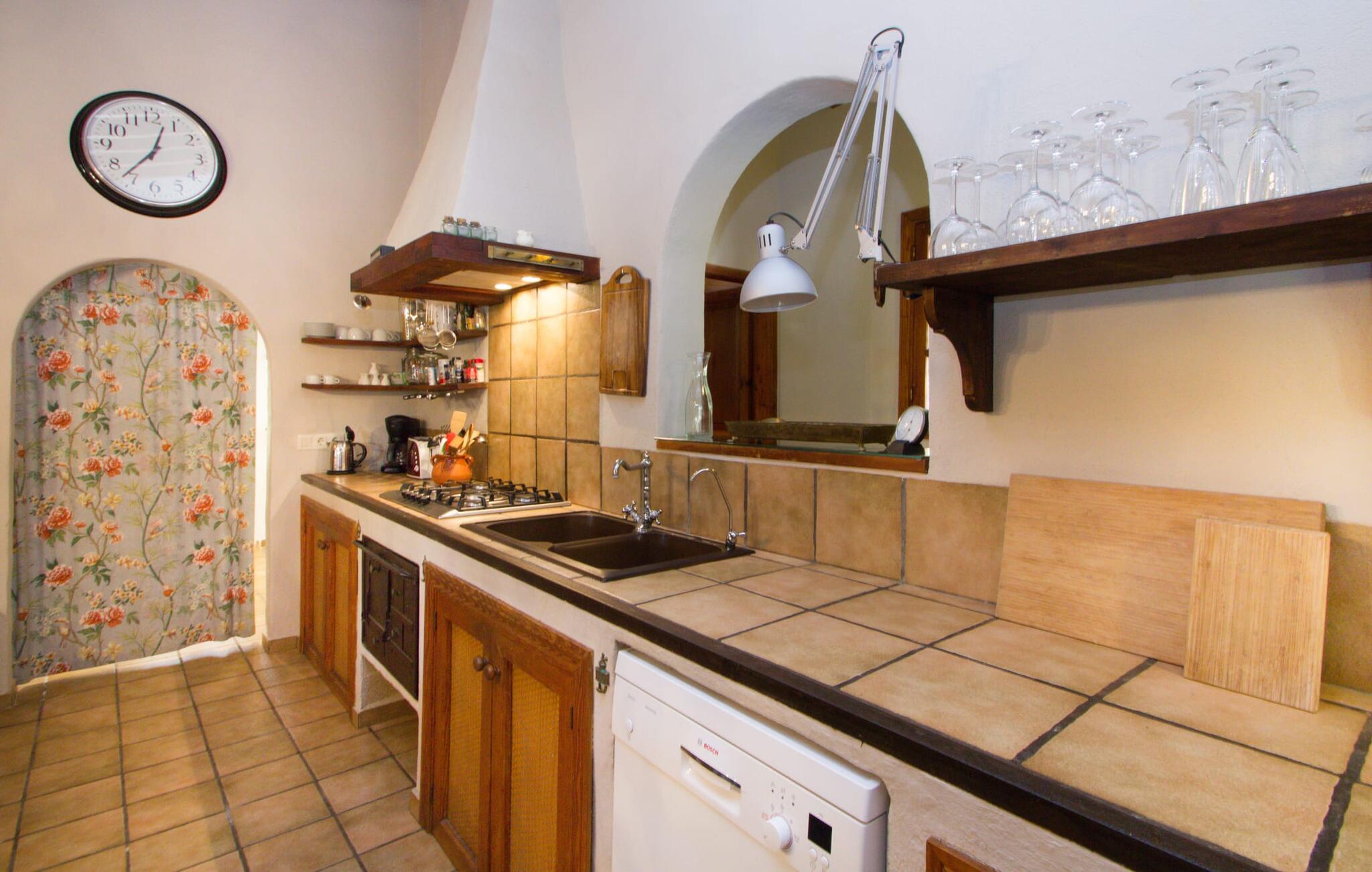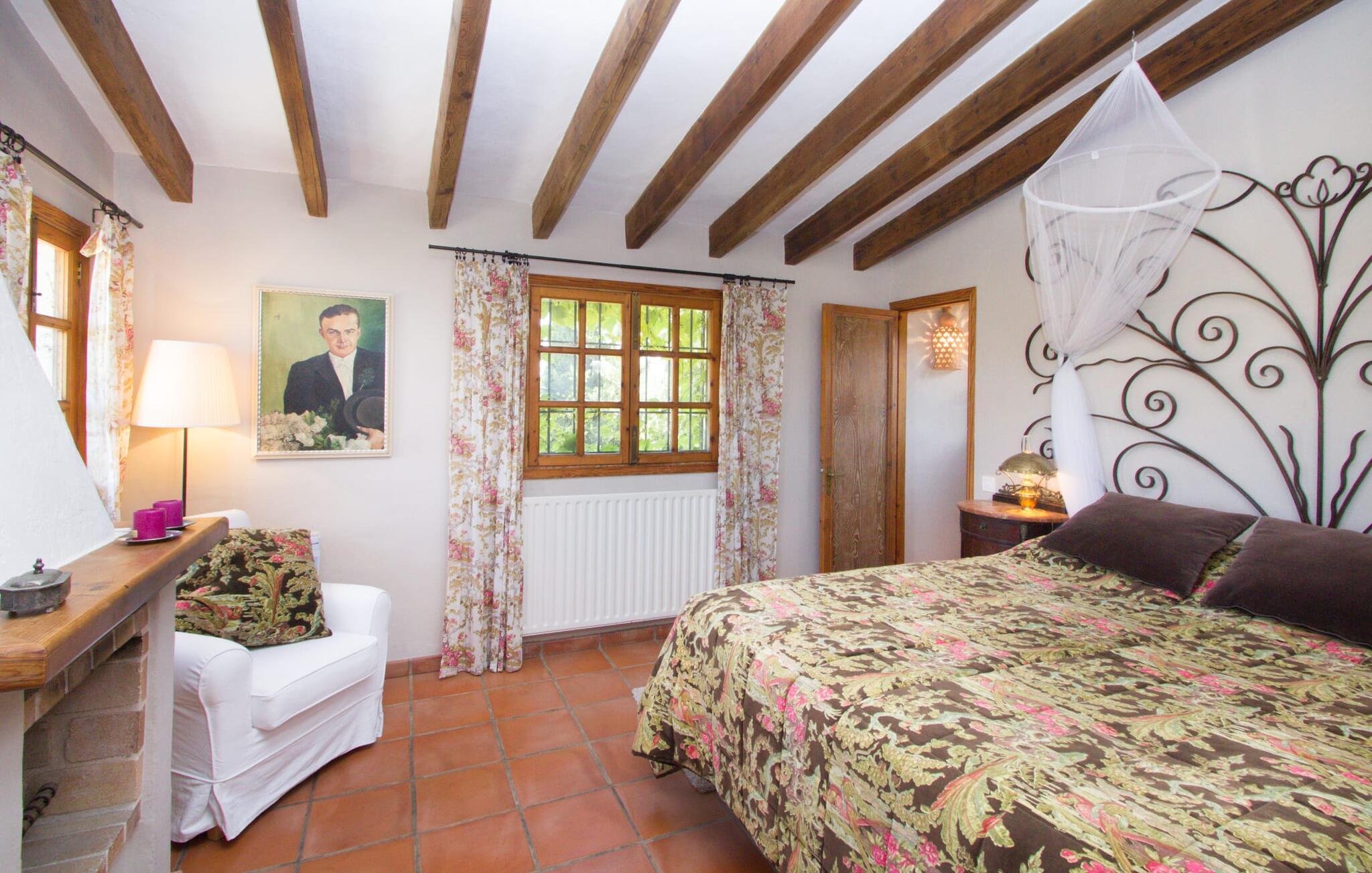 Midt på øen og midt i et typisk middelhavslandskab: dette er den idylliske beliggenhed af villaen "Casa S'Era de Costitx", som blev bygget på en grund på over 5.000 m². Det kønne hus, delvist bevokset med frodigt grønt, passer meget smagfuldt ind i omgivelserne - i ordets bedste forstand føles det, som om bygningen altid har ligget her. Udendørsområdet, designet med stor sans for detaljer, er et rigtigt højdepunkt. Med så mange muligheder vil I have svært ved at beslutte, hvor I skal hen først. I kan vælge liggestolene under parasoller eller de polstrede udendørs siddepladser. Udekøkkenet med spisebord og stole har også et flot, rustikt udtryk - og en gynge til børn med udsigt til poolen. I kan spise på den overdækkede terrasse direkte ved huset, eller få en kop kaffe i det elegante opholdsområde på siden af huset eller på den solrige tagterrasse. Eller I kan spille et spil bordtennis med jeres medrejsende ved hotellets eget bord i den behagelige skygge. En fantastisk blanding af traditionel og moderne stil venter jer i jeres sommerhus. Hvide vægge, loftsbjælker, vindues- og dørkarme i træ og naturfarvede fliser skaber en vidunderlig autentisk landstedsstemning, som får et nutidigt præg af smart boligtilbehør. I stueplan finder I indgangspartiet og et gæstetoilet samt det rummelige køkken med spisekammer, som er åbent og løber direkte ud i spisepladsen. Det runde spisebord er oplyst af en lysekrone - her kan I nyde en fest sammen i fred og ro. Køkkenet og spisepladsen er også halvåbne til stuen - så I kaster måske allerede et længselsfuldt blik på de to komfortable sofaer, der gerne vil lokke jer over fra naboen. Når I er træt, kan I trække jer tilbage til et af de to romantisk indrettede soveværelser, nogle med naturstensvægge og charmerende skodder. Et moderne badeværelse fuldender boligkomforten i stueetagen. På øverste etage er der endnu et soveværelse med et elegant en-suite badeværelse. Pak en flaske vand og et par snacks og tag afsted: I vil se, at det er det værd - det imponerende landskab i centrum af øen har sin helt særlige charme! Omgivelserne omkring jeres hus er herligt landlige, der er næsten ikke direkte naboer - kun villaejerne, som I kun deler indkørslen med. For at gøre jeres indkøb skal I køre de 6,8 km til Costitx, langs vejen, som kan være hørbar afhængigt af vindretningen. Landsbyen er ikke en af Mallorcas kendte turistmål, men netop derfor er den et besøg værd. Byens centrum er rådhuset, en kirke fra 1600-tallet og en markedsplads indrammet af mange attraktive palæer. Hvis I kommer på en lørdag, kan I slentre gennem det ugentlige marked ved Mare de Déu og Plaça del Jardí. Derudover driver Costitx øens eneste planetarium og observatorium, som også tilbyder guidede ture. Hvis I foretrækker at besøge havet, kan I køre cirka 33 km til den rolige, for det meste uberørte strand Es Penyo. Placeringen af villaen "Casa S'Era de Costitx", delvist romantisk indrettet med frodige grønne områder, er ideel for naturelskere, der kan lide at gå, vandre eller cykle gennem landskabet. Men den store ejendom byder også på et godt sted at slappe af: lige ved siden af huset med dets forskellige terrasseområder finder I ikke kun poolen, men også en gynge, et bordtennisbord, et bordfodboldbord og et fantastisk udekøkken. Den nærmeste strand ligger cirka 33,8 km væk, mens landsbyen Costitx kun ligger 6,8 km væk.