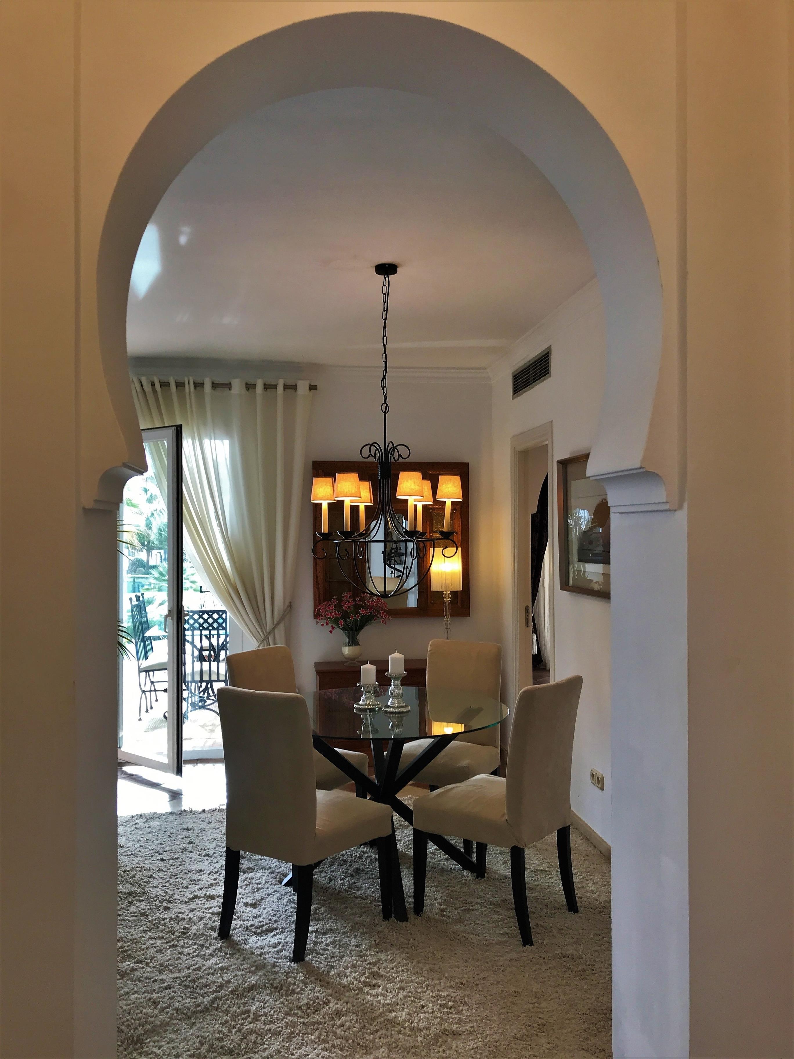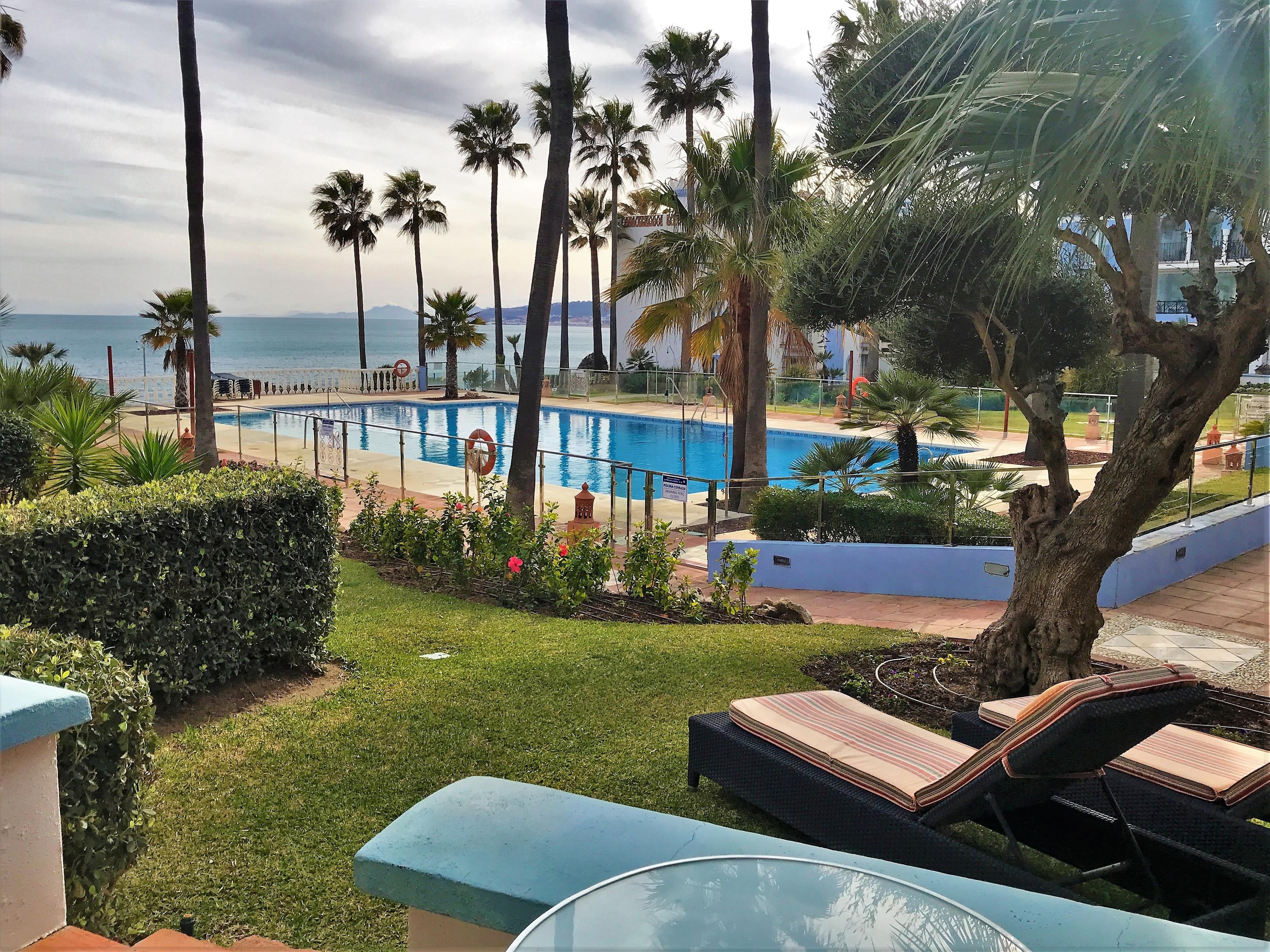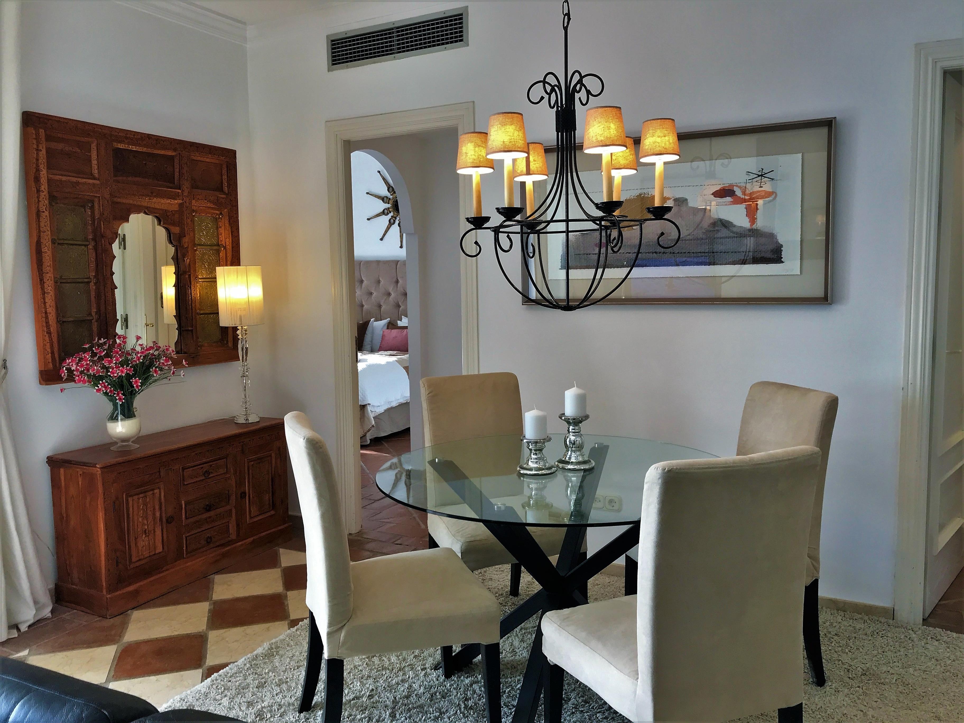 Auf der grossen & überdachten Terrasse erwartet Sie ein vierter Esstisch für 6 Personen & bequeme Lounge-Möbel. Die Terrasse überblickt den privaten kleinen Garten vor der Terrasse, den Hauptpool der Anlage & dahinter das Mittelmeer mit Afrika & GIbraltar.