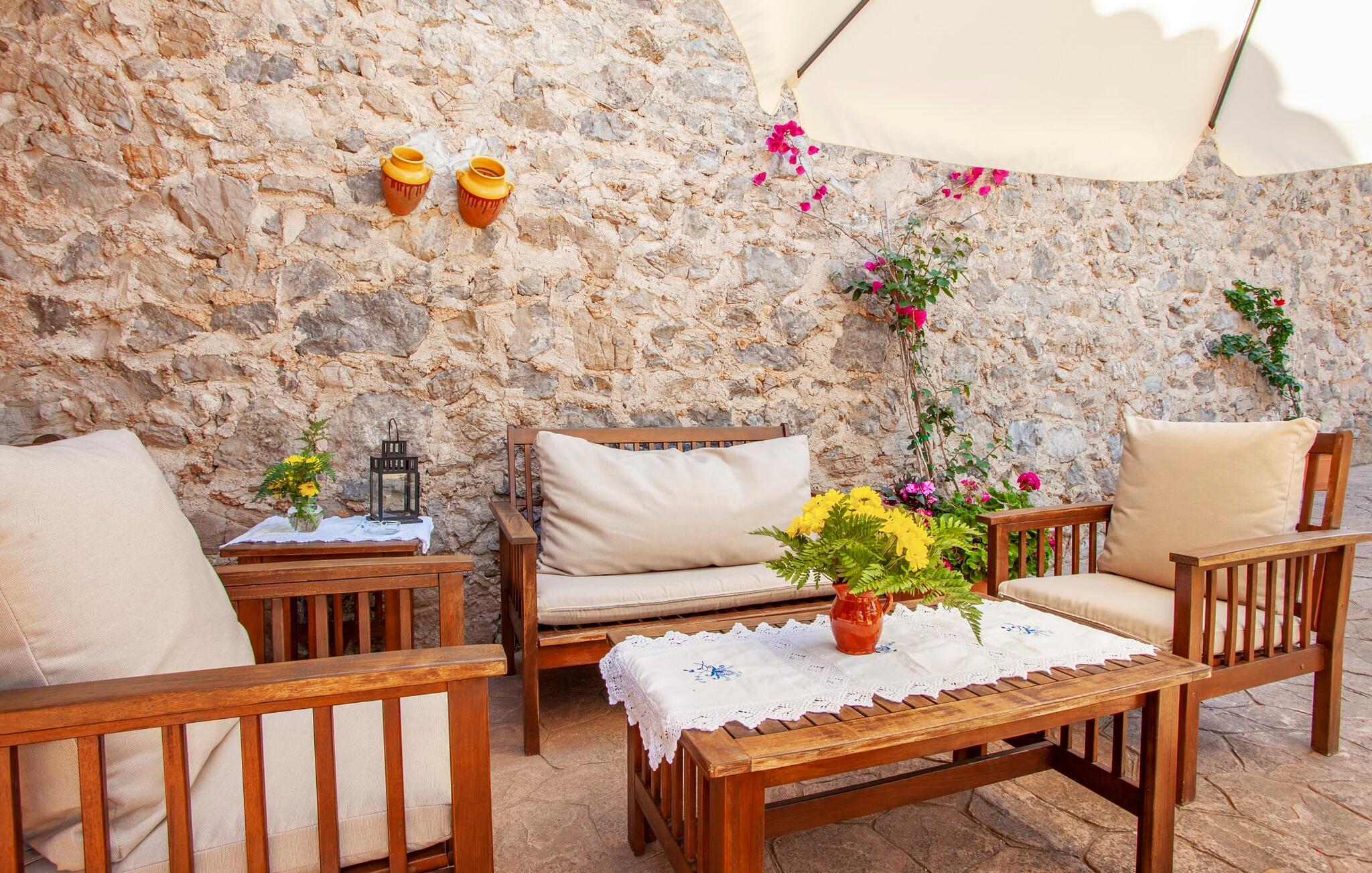 Velkommen til Mallorca og "Cases de Son Duc" - disse to klausuler ser ud til at være uløseligt forbundet. Det traditionelle stenbrudshus fra 1901 fortæller historien om Mallorca. Den rustikke facade med brune persianer er blevet nænsomt renoveret med omhyggelig opmærksomhed på bevarelsen af stuehuset; Dyr og traktorer skaber en landlig atmosfære. Huset er præget af en nærmest eventyrlig pragt, omgivet af lilla bougainvilleaer, vinstokke, oliven- og citrustræer og kaktusser. Den smukke have er overalt. I og jeres familie eller venner kan føle jer rigtig godt tilpas på dette vidunderlige, afsondrede sted. En organisk formet pool, som er omkranset af en omgivende terrasse, bidrager også til dette. Her kan I indstille jeres liggestole til at slappe af og nyde et langt solbad. Bagefter kan I tilberede en lækker BBQ i det lille, men fine udekøkken med indbygget grill. Der er talrige udendørs siddepladser - fra den overdækkede spiseplads til den skyggefulde lounge og de andre spredte hjørner, hvor I kan nyde jeres morgenkaffe eller et aromatisk glas rødvin og afslutte dagen i fred med at sige godnat og stille med lyden af natur. Interiøret i "Cases de Son Duc" er også et sted at blive hængende, fordi interiøret afspejler bondehyttens naturlighed, som blev bæredygtigt restaureret i 2000. Tilbage er blotlagte stenbrudsmure og massive træbjælker. De typiske terracotta- og keramiske fliser med kunstfærdige mønstre i køkken og badeværelse fortsætter den antikke charme. Samtidig blev der ved valg af udstyr lagt særlig vægt på den mest moderne komfort. Det betyder, at jeres bevidst valgte ferie med selvforplejning i det fuldt udstyrede køkken bliver en sand fornøjelse. Møblerne minder om et mallorcansk landsted - praktisk, med et strejf af antik og masser af flair. Takket være denne atmosfære kan I nyde jeres tid i de generelle opholdsrum. Soveværelserne sikrer også en afslappende søvn. Med tre badeværelser (et en-suite til master bedroom ovenpå), forbliver komforten. Fra soveværelset kan I endda få adgang til gårdhaven via en ekstern stentrappe. Værelset er ideelt til to familier - selv med fire par kan I tilbringe en harmonisk tid i sådanne omgivelser. Men sørg for at udforske omgivelserne i denne vidunderligt afsidesliggende villa. Den behagelig atmosfære i dette charmerende landsted afspejler også karakteren af dette område på den østlige del af øen. Den middelalderlige Artà er meget rolig med en gågade, smukke butikker, små caféer med lokale farver og gode restauranter. Fra villaen kan I nå stedet til fods på cirka 40 minutter. Trods den absolutte fred, er I optimalt forbundet og kan udforske det omkringliggende område, som er præget af små kystbyer som Canyamel og Cala Millor. Der er også den livlige Cala Ratjada med sit aktive natteliv - et besøg værd, især i lavsæsonen, med sin havnepromenade spækket med restauranter. Denne region er et paradis for golfspillere - "Cases de Son Duc" ligger trods alt lige mellem Capdepera og Canyamel Golf. Den nænsomt renoverede villa "Cases de Son Duc" ligger i en vidunderlig, afsondret beliggenhed mellem Capdepera, Canyamel og Artà. Dette blide bakkeland er enestående smukt og byder på en masse variation. Byerne, hvor I kan gøre jeres daglige indkøb, ligger godt 10 minutter væk i bil. Eller I kan shoppe på de ugentlige markeder og lære de rolige byer at kende. Kysten med nogle ubebyggede strande er 15 minutter væk. Bemærk venligst, at denne ejendom ikke accepterer ungdomsgrupper eller polterabender. En ungdomsgruppe på denne ejendom består af personer på 25 år eller derunder. Book ikke denne ejendom, hvis I er en ungdomsgruppe eller en polterabendgruppe, da jeres reservation vil blive afvist, når den er booket, hvilket også kan være tilfældet ved ankomst til ejendommen eller under jeres ophold, og I vil ikke modtage en refusion.