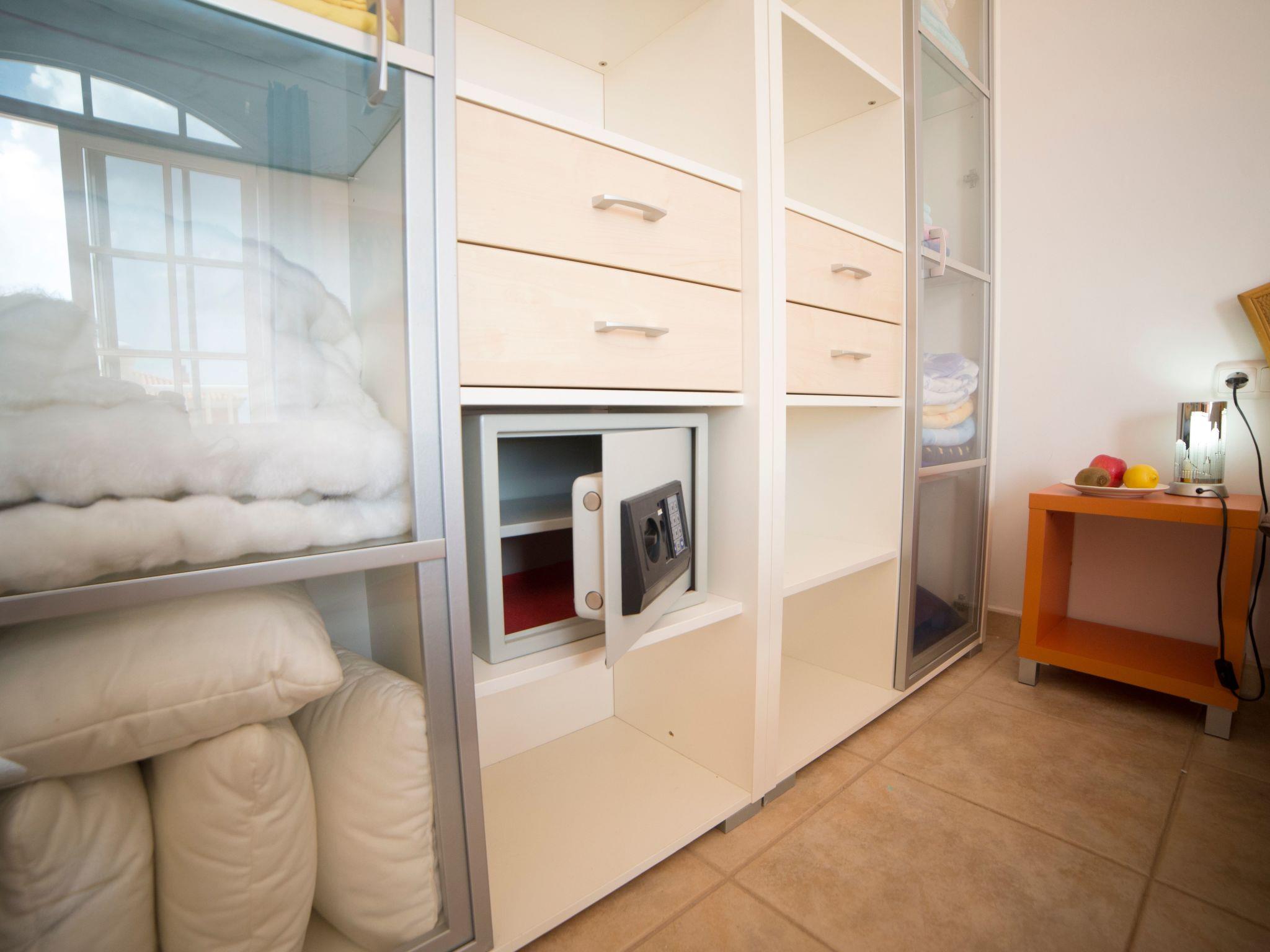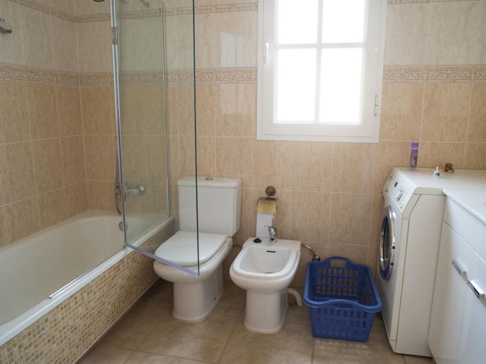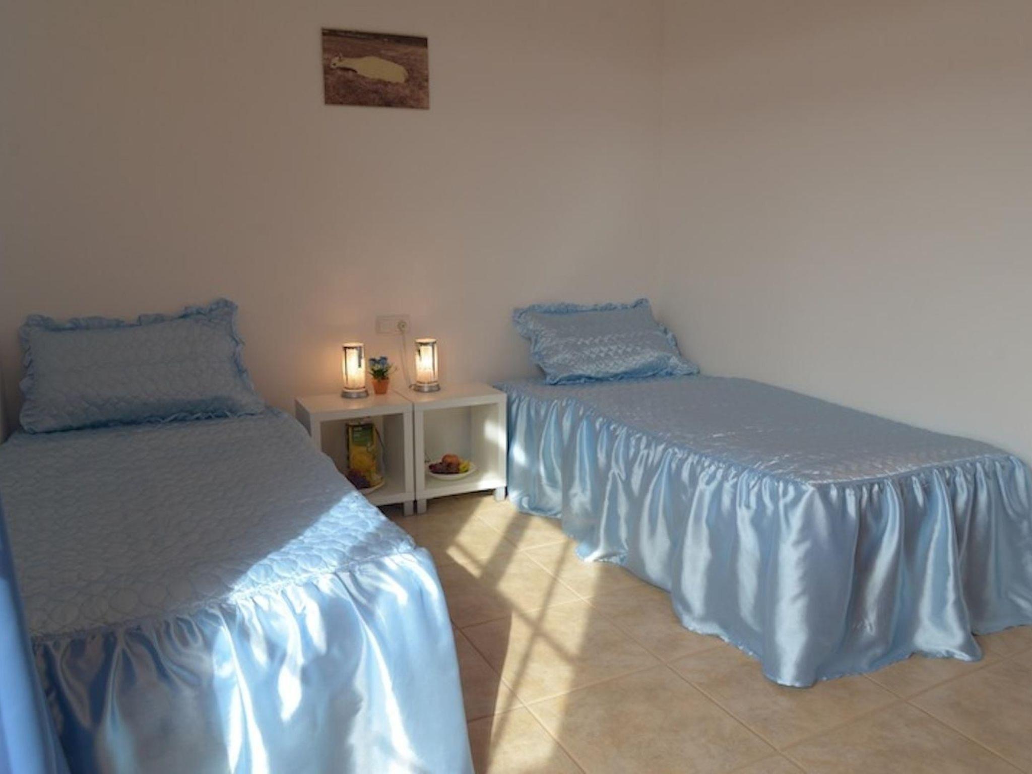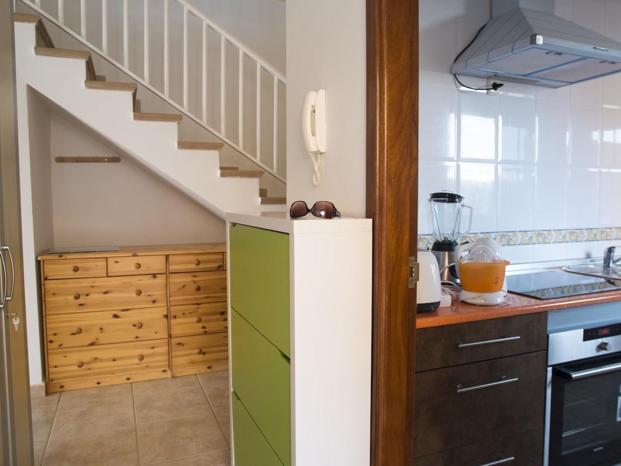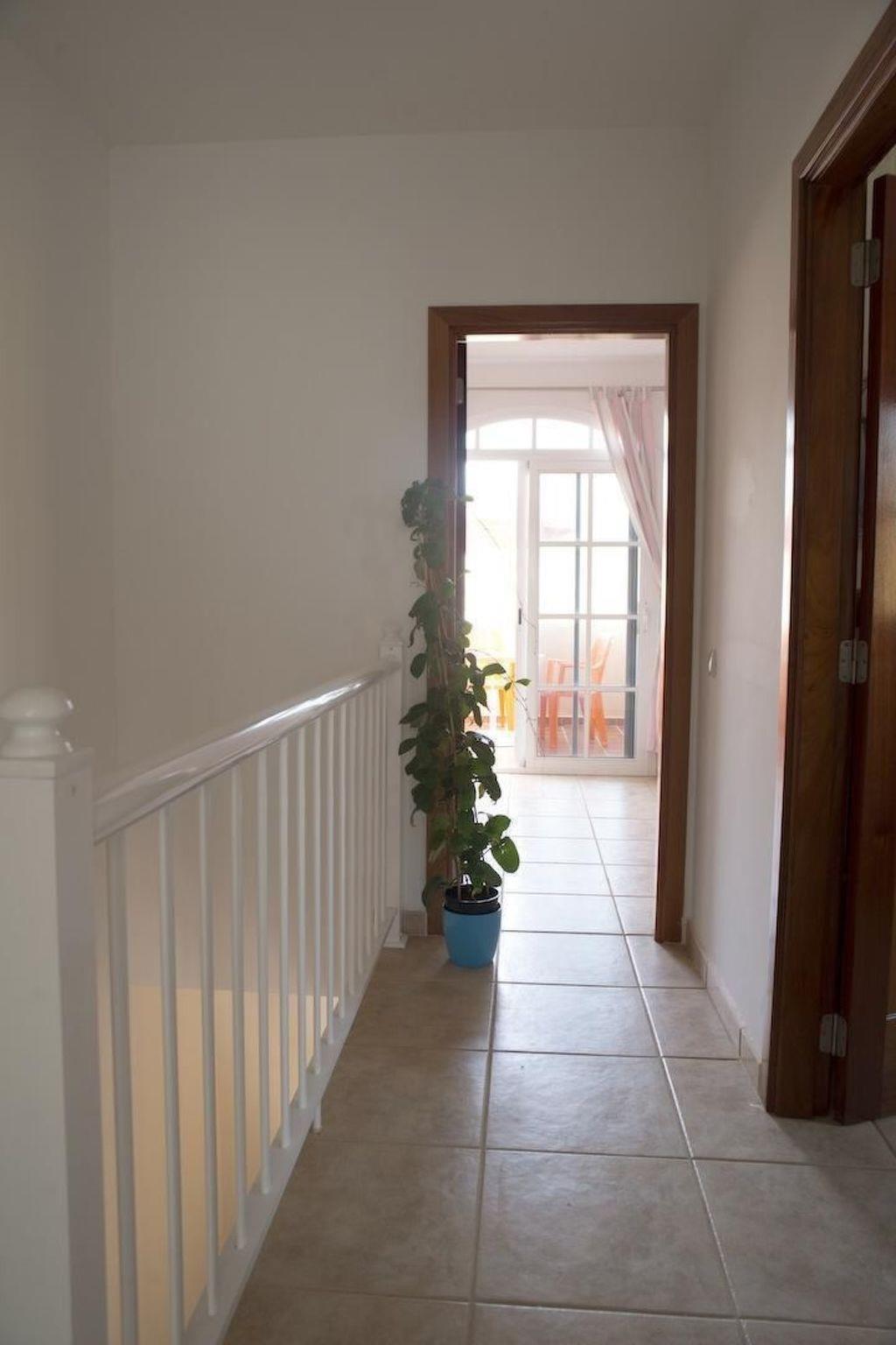 The holiday home has two large bedrooms on the first floor, each with fitted wardrobes. There is a double bed in one room and two single beds in the other. The double bedroom is equipped with an additional satellite TV and has two sliding glass doors to the balcony, which offers a view of the sea across several houses in the holiday complex. The balcony of the single room invites you to linger with a view of the volcanic landscape. The large bathroom is also located on the first floor, between the two bedrooms. It is equipped with a bathtub/shower, bidet, WC, washing machine and hairdryer. There is another room on the ground floor with two single beds and a desk. There is also a spacious wardrobe. The modern kitchen with fridge/freezer, cooker with ceramic hobs, microwave, toaster etc. is also on the ground floor. Next to this is the cosy living room, which has access to the terrace. Here, guests can watch a range of German, English, Spanish, French and Italian TV programmes on Smart TV. They also have the option of using the Wi-Fi internet connection. There is also a small bathroom on the ground floor with a floor-level mosaic-tiled shower, washbasin and WC.