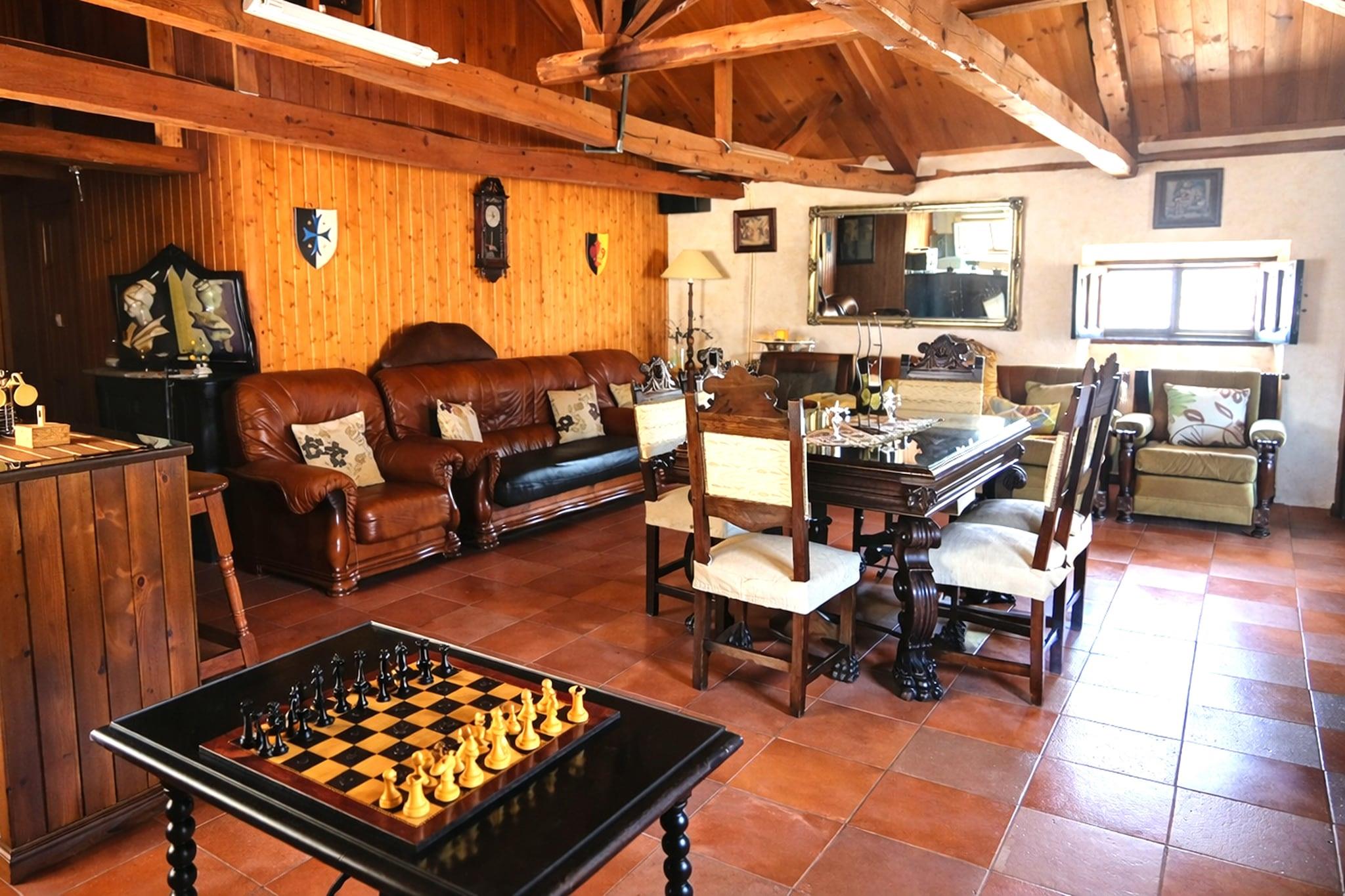 Stueetage: (Indgang (adgang udefra), køkken-alrum(spisebord, pejs, kogeplade, emhætte, kaffemaskine, ovn, mikrobølgeovn, opvaskemaskine , køle-fryseskab), stue / spisestue(25 m2)(Fjernsyn, sofahjørne), soveværelse(dobbeltseng(135 x 190 cm)), soveværelse(dobbeltseng(135 x 190 cm)), soveværelse(dobbeltseng(135 x 190 cm)), badeværelse(bruser, håndvask, toilet, bidet, føntørrer), opholdsrum(bordtennisbord, bordfodbold, dart), spisebord, patio, klimaanlæg, grill(trækul), ) På 1. etage: (Stue(35 m2)(Fjernsyn, spisebord, sofahjørne, bar, opvaskemaskine , klimaanlæg), soveværelse(enkeltseng(105 x 190 cm), enkeltseng(105 x 190 cm), enkeltskabsseng), Soveværelse med badeværelse(enkeltseng(105 x 190 cm), enkeltseng(105 x 190 cm), enkeltskabsseng, badekar eller bruser, håndvask, toilet, føntørrer), badeværelse(massagebruser, håndvask, toilet, føntørrer), klimaanlæg, ) Kælderetage: (opholdsrum(spisebord, Wine glasses))