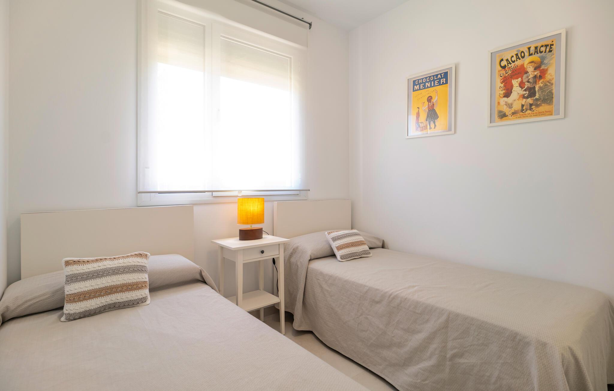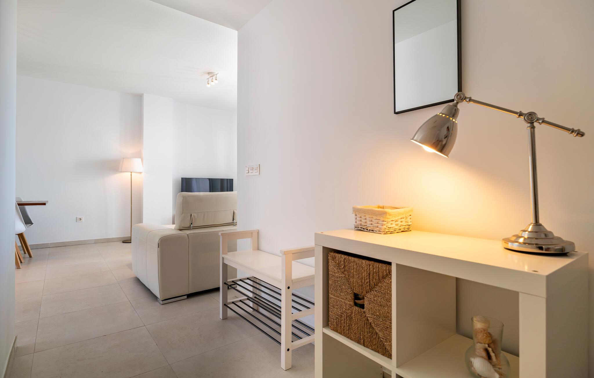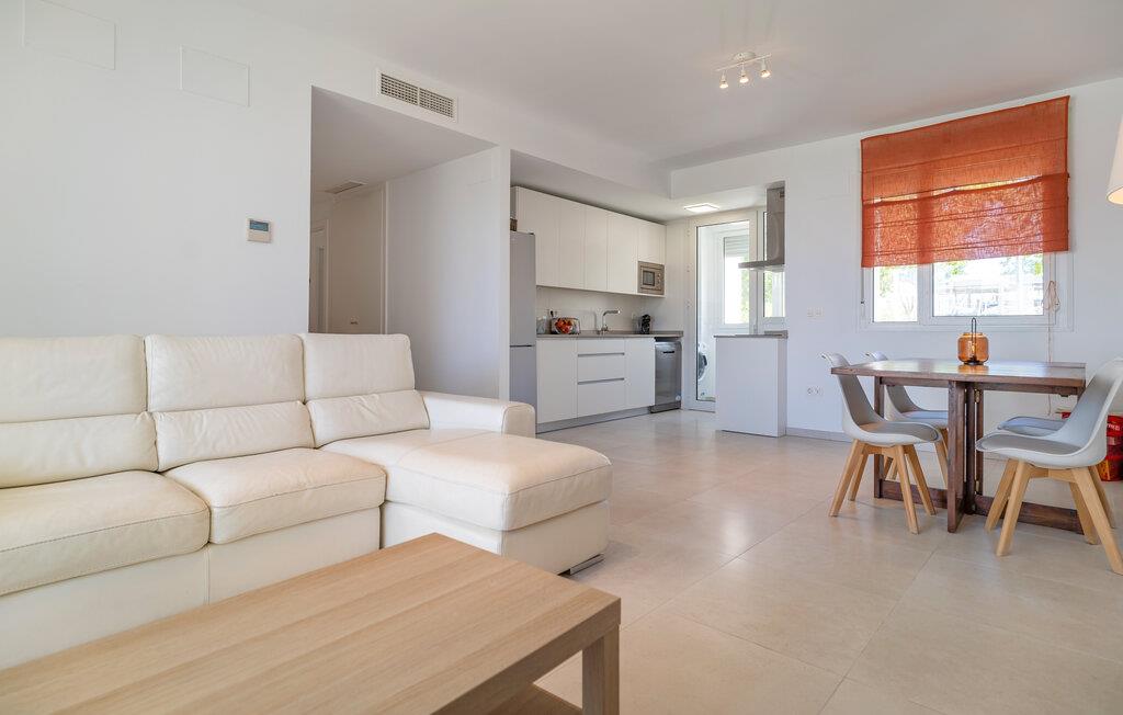 Velkommen til denne lyse og moderne ferielejlighed, som byder på talrige ekstraudstyr midt i et velholdt boligområde. Fremtryll lækre tapas, server måltiderne ved det stilfulde spisebord, Find jer godt til rette i sofaen efter en begivenhedsrig dag, stream en film eller hel jer familien med en spilleaften.