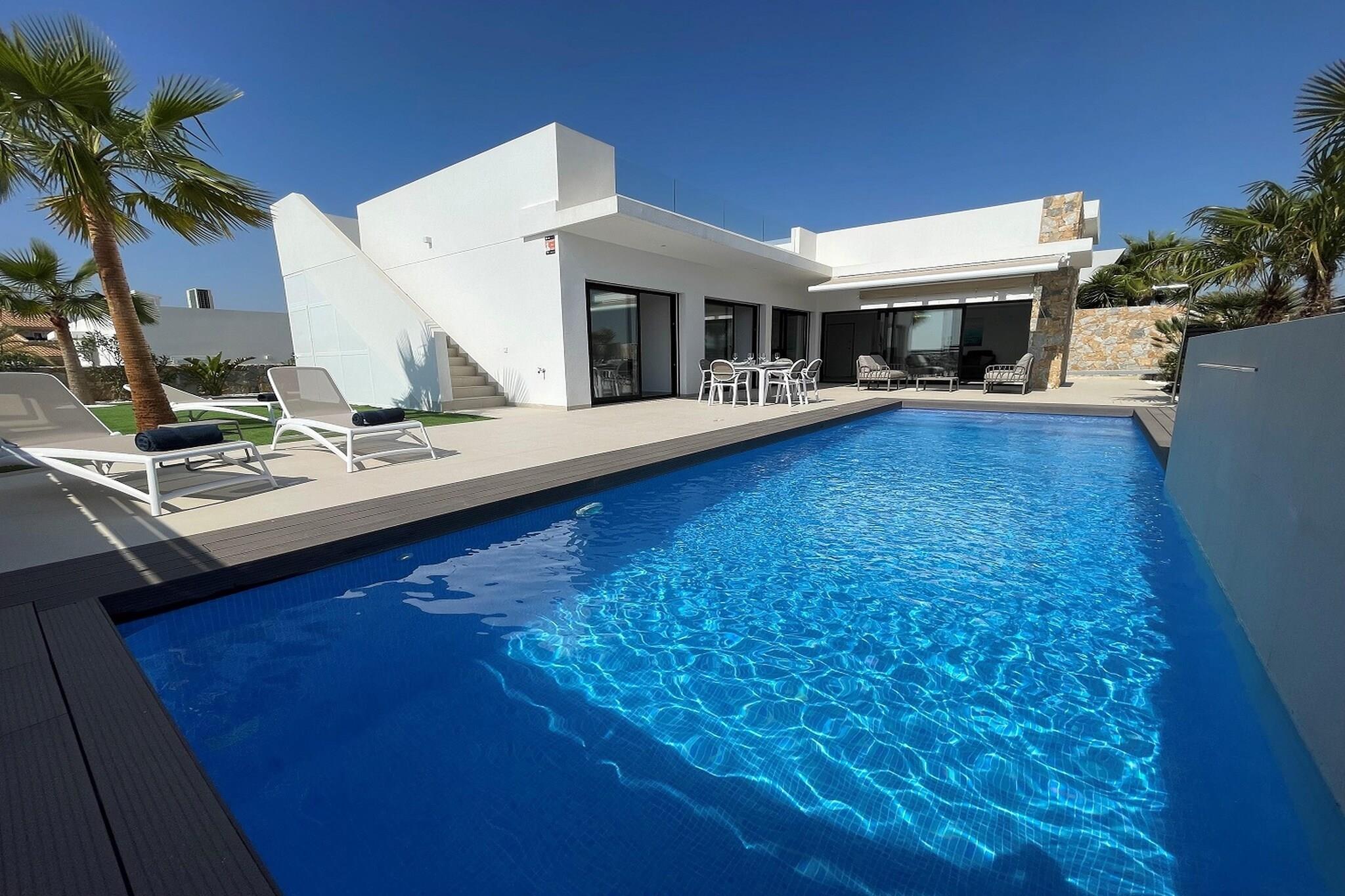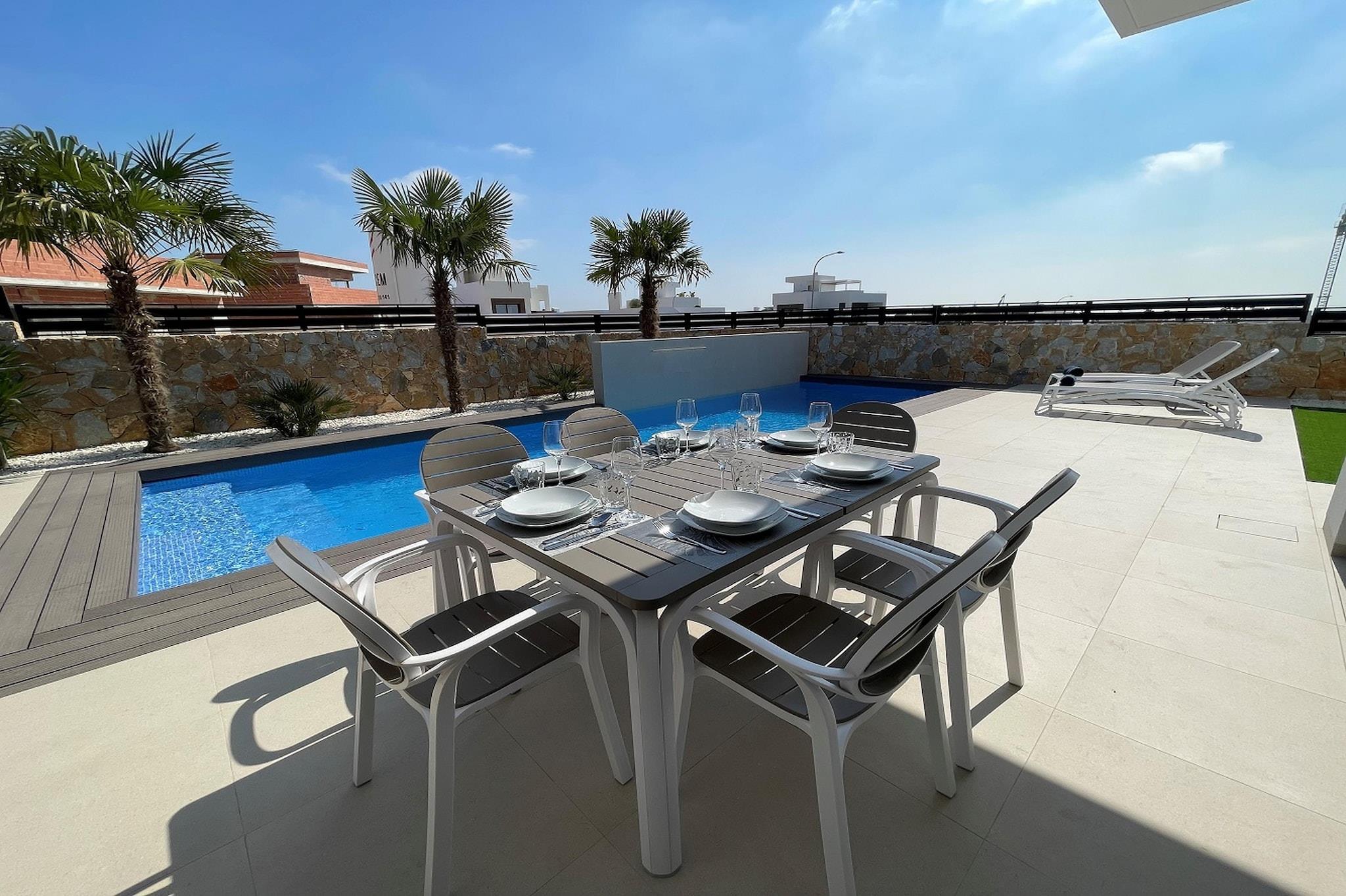 Kun 5 minutter fra Guardamars gyldne sand, tilbyder denne stilfulde villa på Costa Blanca den perfekte blanding af lyksalighed ved stranden og golfparadis. Ideel til familier eller grupper af venner, hjemmet har en privat pool, solarium med bruser og en solbeskinnet terrasse, perfekt til at slappe af efter en dag med eventyr. Indvendigt er villaen omhyggeligt indrettet med komfort for øje. Stueetagen indeholder hyggelige soveværelser, moderne badeværelser og en lys stue/spisestue med åbent køkken og opbevaringsplads. Store vinduer tilbyder pooludsigt, hvilket skaber en problemfri indendørs-udendørs stemning. Aircondition og privat parkering bidrager til bekvemmeligheden. Golfelskere vil blive forkælet med valgmuligheder med La Marquesa Golfbane kun 2 km væk, og andre topbaner som La Finca, Vistabella, Villamartin og Las Colinas alle inden for 30 minutters kørsel. Den pulserende by Ciudad Quesada ligger i nærheden og byder på caféer, butikker og en livlig middelhavsatmosfære.