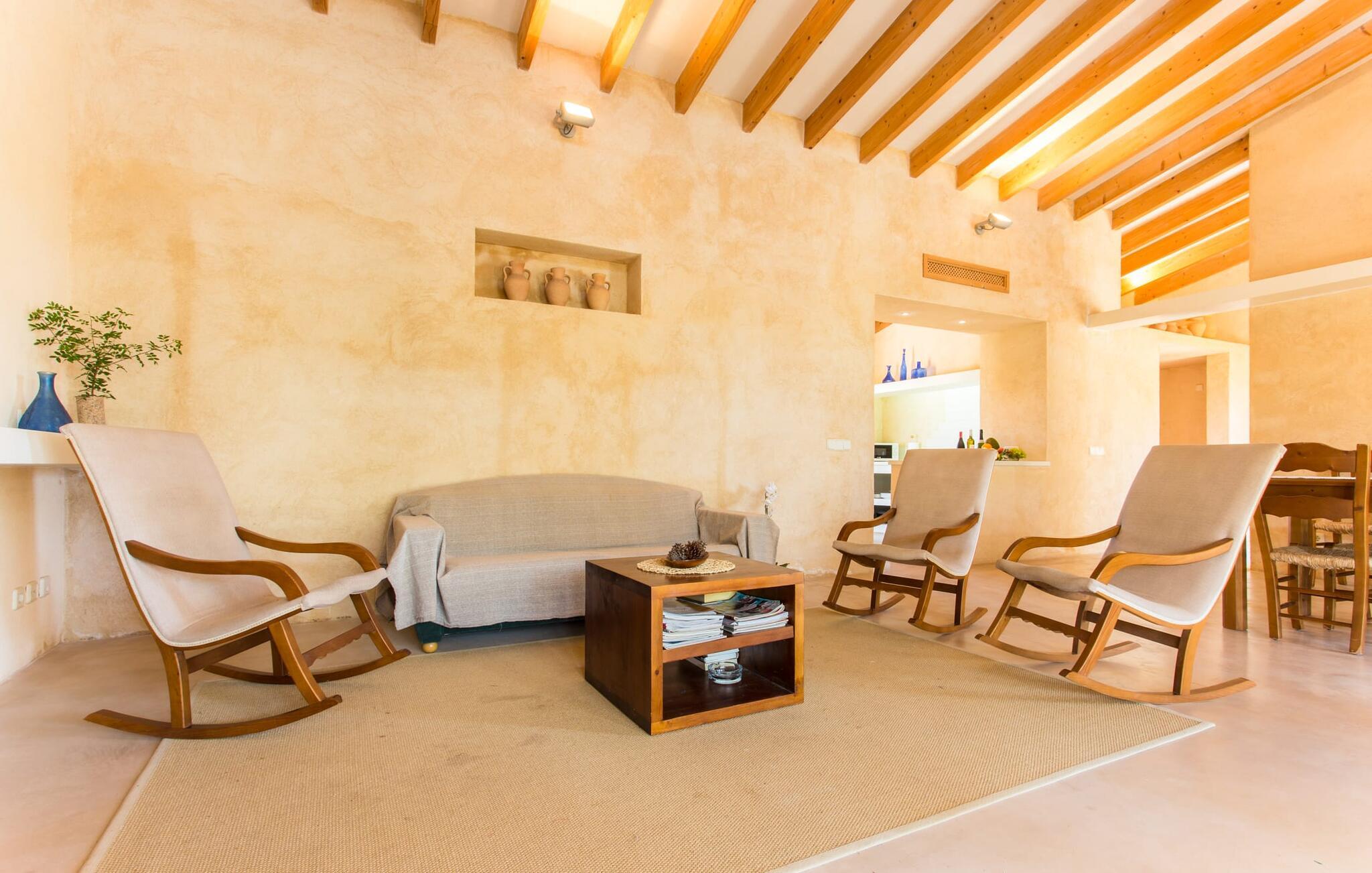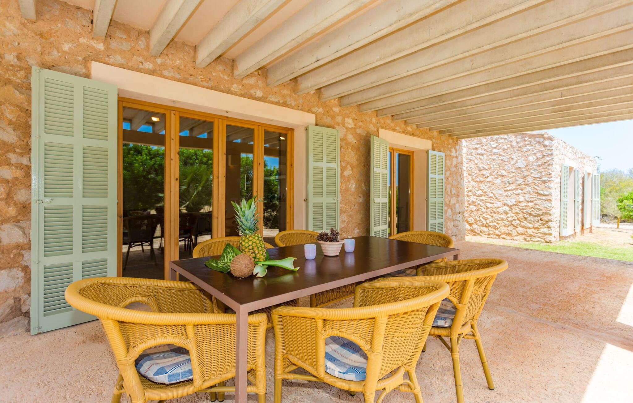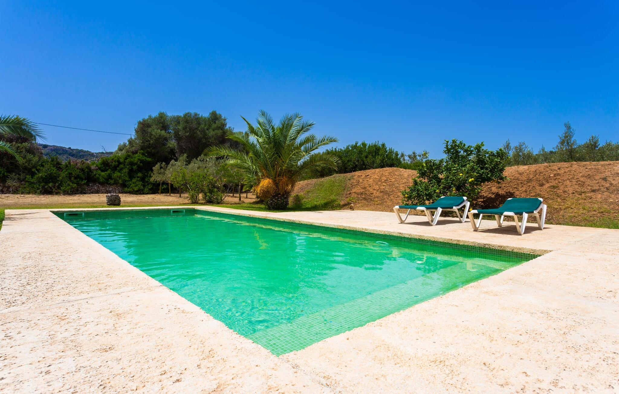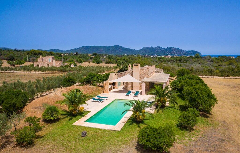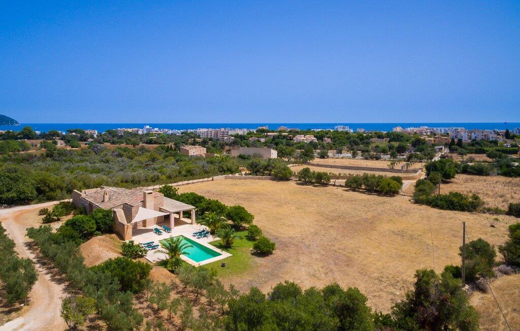 Den moderne villa "Clovetes" er et lille ferieparadis, som vi især anbefaler til alle strandglade feriegæster. Vores luftfotos viser naturhavens oaseagtige karakter med græsplæner omkring terrassearealerne. Talrige palmer, citrustræer og andre middelhavstræer ligger langs poolen og det smukke hus med fortryllende mallorcanske natursten. I kan næsten lugte havet, men I kan helt sikkert mærke den behagelige brise, der gør en privat pool endnu smukkere. Den behageligt proportionerede og malakitfarvede mosaikpool tilbyder en bred trappeindgang og en behagelig dybde for børn. Efter en forfriskende svømmetur kan I slappe af på en af liggestolene på den omkringliggende solterrasse. Der er integreret grillplads på siden med ekstra opbevaringsplads og praktisk vask. Et fortelt strækker sig fra det lille udekøkken til den overdækkede terrasse, hvilket understreger ejendommens maritime karakter. På verandaen, der støder helt op til opholds- og spiseafdelingen, er der altid behagelig skygge med bord og kurvestole, hvor man kan fejre sine grillritualer sammen med venner og familie. Selvom det ydre er i tråd med den klassiske mallorcanske tradition, er husets indre mere gennemsyret af en oplysende følelse af "less is more". Gennem de talrige panoramavinduer vil I opleve et dejligt lyst hus, der er absolut puristisk og moderne. Den varme terracotta-tone på de gipsteksturerede vægge understreger de enkle og klare former. Rummets moderne design harmonerer også med funktionelle områder til ophold, spisning og madlavning. Stuemøblerne er desuden indrettet i bløde jordfarver og giver mulighed for at slappe af foran pejsen, hvilket også sørger for hygge i spisepladsen. Træbordet og -stolene i et landhusdesign står foran køkkenområdet, adskilt af en disk. Den har ikke en designer indbygningsovn, men I finder køkkenskabe i sten med trælåger. Det indeholder dog de teknologiske faciliteter, I vil have, hvis I vælger en ferie med selvforplejning. De hyggelige soveværelser, hvor en god nats søvn ikke bare er et ønske, er indrettet i samme stil og er trods deres lidt industrielle charme stadig behageligt hyggelige takket være brugen af naturligt træ til døre og vinduer. Det store soveværelse har en dobbeltseng og de to andre soveværelser har hver to separate sovepladser. To trendy badeværelser - et med bruser og et med badekar - sikrer en behagelig "ferie", uanset hvilken konfiguration I vælger at tilbringe jeres ferie på Mallorca i. Den indbydende "Clovetes" kombinerer helt klart charmen ved en landlig villa med den attraktive kystlinje, da stranden i Cala Bona kun ligger 1500 m væk og kan nås til fods. Stranden er særlig familievenlig, da den tilbyder en lavvandet indgang til havet. Byen har en lille sportshavn, en promenade med talrige butikker og attraktive spisemuligheder. Det er derfor, folk kan lide at tage dertil om aftenen for at få en drink og nyde udsigten over havet. Generelt er dette område godt til vandreture, men vandsport som dykning og fiskeri er også populært her. Andre kystbyer som Cala Millor, Cala Ratjada eller Portocristo mod syd kan også nås hurtigt. Det gælder også de andre små byer på øen, Son Servera eller middelalderkunsten Artà, for blot at nævne nogle få. Der er mere end nok til variation og afslapning i jeres private perle "Clovetes". Villaen "Clovetes" i minimalistisk, puristisk design ligger i landlige omgivelser på en ejendom med talrige palmer og andre middelhavstræer. På trods af den rolige beliggenhed er det kun 5 minutter væk fra Cala Bona og Cala Millor. Der er en boulevard under palmer med et par restauranter, cocktailbarer og butikker, der inviterer jer til at slentre uden stress. Cala Bona-stranden blev endda tildelt det blå flag for sin fremragende vandkvalitet.