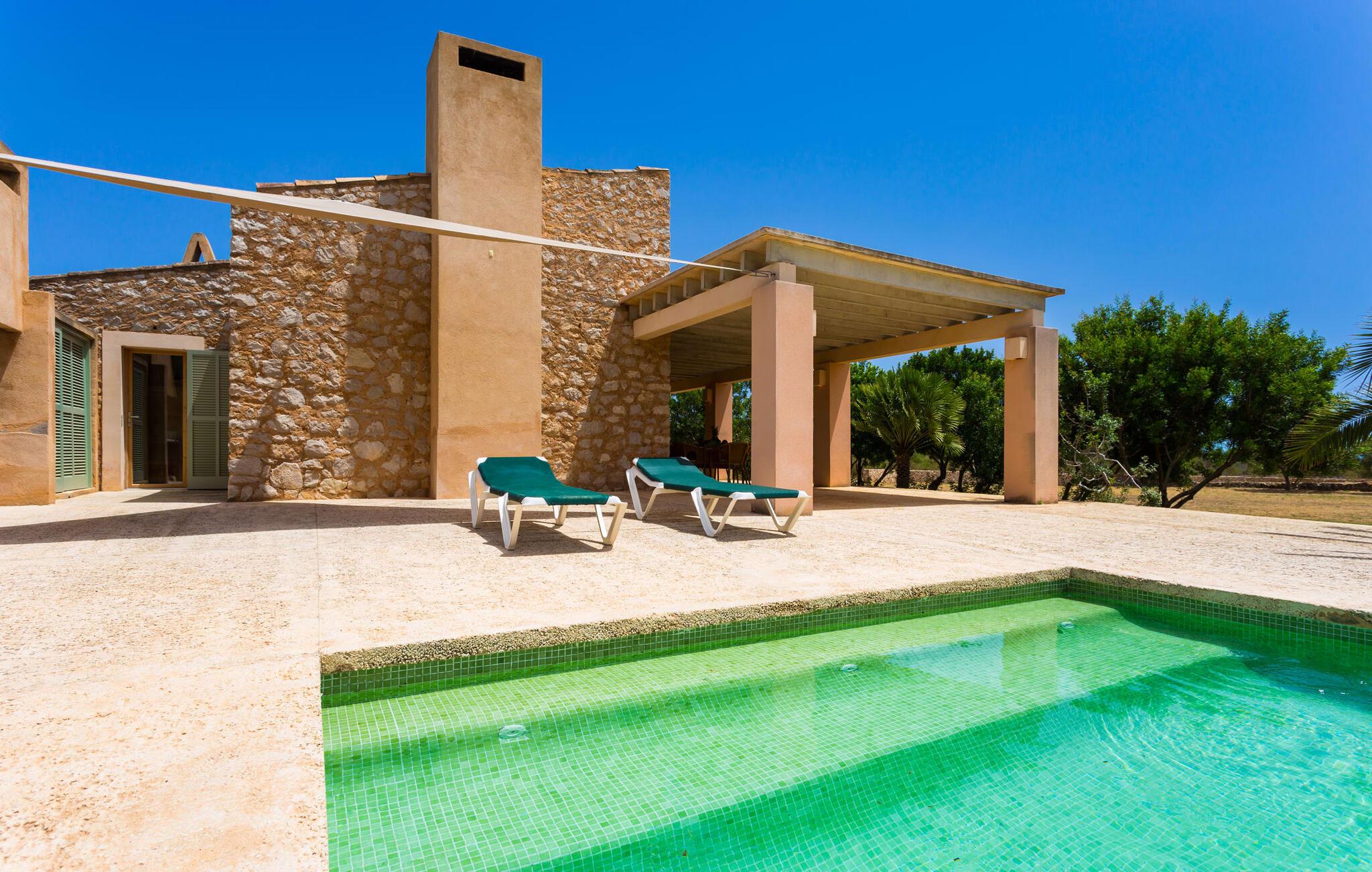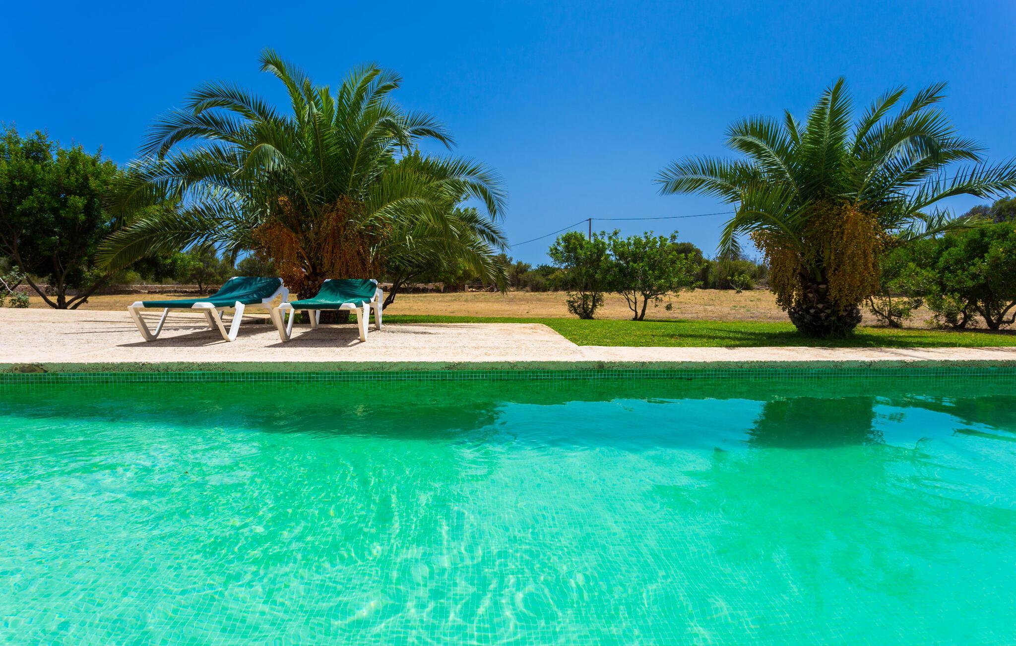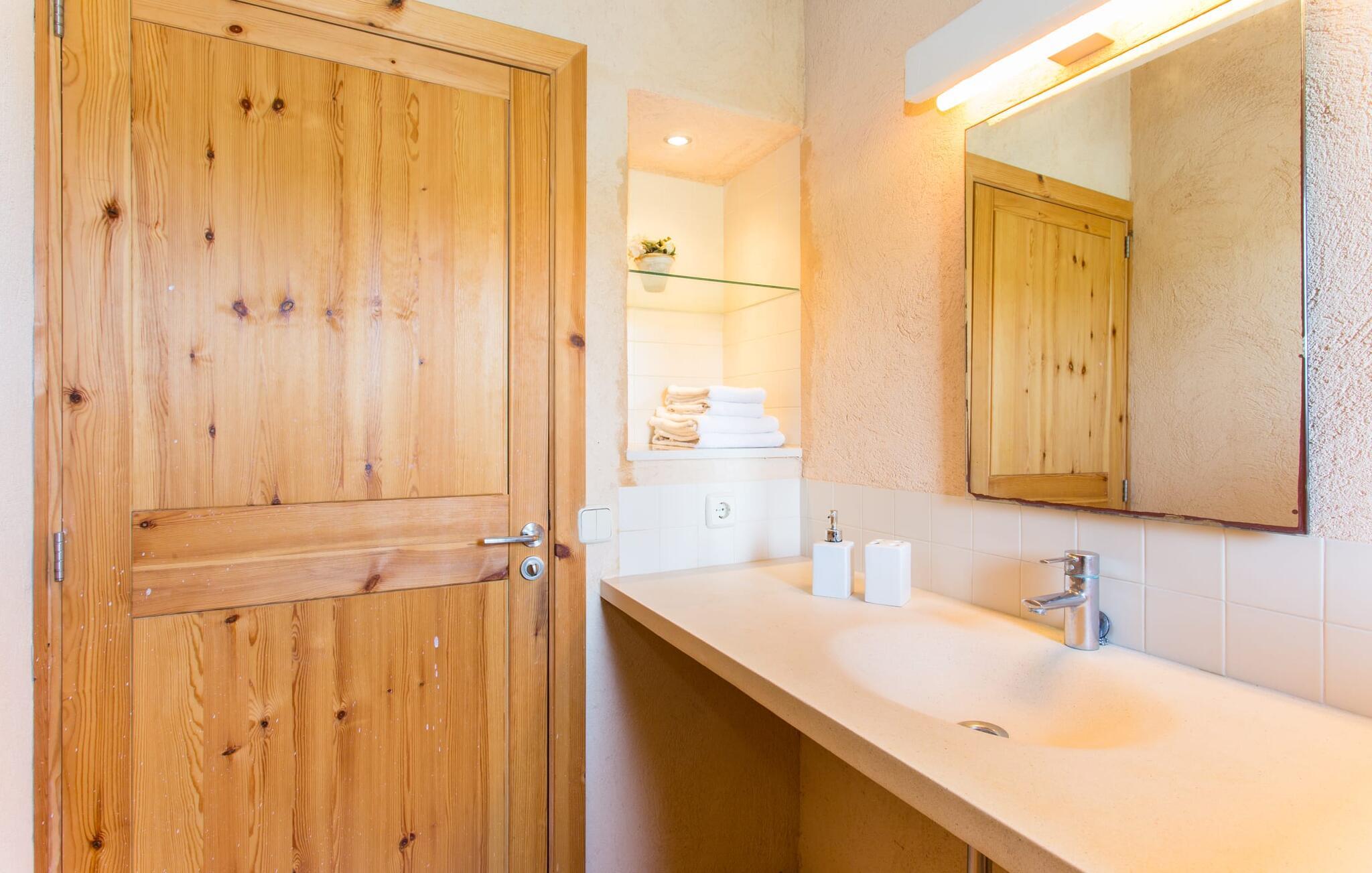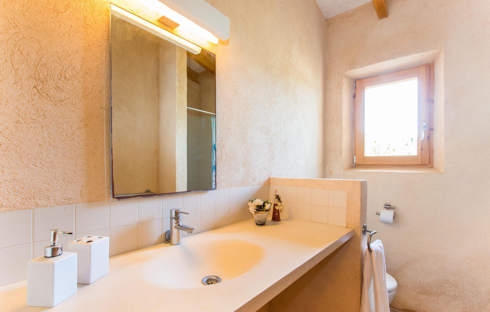 Den moderne villa "Clovetes" er et lille ferieparadis, som vi især anbefaler til alle strandglade feriegæster. Vores luftfotos viser naturhavens oaseagtige karakter med græsplæner omkring terrassearealerne. Talrige palmer, citrustræer og andre middelhavstræer ligger langs poolen og det smukke hus med fortryllende mallorcanske natursten. I kan næsten lugte havet, men I kan helt sikkert mærke den behagelige brise, der gør en privat pool endnu smukkere. Den behageligt proportionerede og malakitfarvede mosaikpool tilbyder en bred trappeindgang og en behagelig dybde for børn. Efter en forfriskende svømmetur kan I slappe af på en af liggestolene på den omkringliggende solterrasse. Der er integreret grillplads på siden med ekstra opbevaringsplads og praktisk vask. Et fortelt strækker sig fra det lille udekøkken til den overdækkede terrasse, hvilket understreger ejendommens maritime karakter. På verandaen, der støder helt op til opholds- og spiseafdelingen, er der altid behagelig skygge med bord og kurvestole, hvor man kan fejre sine grillritualer sammen med venner og familie. Selvom det ydre er i tråd med den klassiske mallorcanske tradition, er husets indre mere gennemsyret af en oplysende følelse af "less is more". Gennem de talrige panoramavinduer vil I opleve et dejligt lyst hus, der er absolut puristisk og moderne. Den varme terracotta-tone på de gipsteksturerede vægge understreger de enkle og klare former. Rummets moderne design harmonerer også med funktionelle områder til ophold, spisning og madlavning. Stuemøblerne er desuden indrettet i bløde jordfarver og giver mulighed for at slappe af foran pejsen, hvilket også sørger for hygge i spisepladsen. Træbordet og -stolene i et landhusdesign står foran køkkenområdet, adskilt af en disk. Den har ikke en designer indbygningsovn, men I finder køkkenskabe i sten med trælåger. Det indeholder dog de teknologiske faciliteter, I vil have, hvis I vælger en ferie med selvforplejning. De hyggelige soveværelser, hvor en god nats søvn ikke bare er et ønske, er indrettet i samme stil og er trods deres lidt industrielle charme stadig behageligt hyggelige takket være brugen af naturligt træ til døre og vinduer. Det store soveværelse har en dobbeltseng og de to andre soveværelser har hver to separate sovepladser. To trendy badeværelser - et med bruser og et med badekar - sikrer en behagelig "ferie", uanset hvilken konfiguration I vælger at tilbringe jeres ferie på Mallorca i. Den indbydende "Clovetes" kombinerer helt klart charmen ved en landlig villa med den attraktive kystlinje, da stranden i Cala Bona kun ligger 1500 m væk og kan nås til fods. Stranden er særlig familievenlig, da den tilbyder en lavvandet indgang til havet. Byen har en lille sportshavn, en promenade med talrige butikker og attraktive spisemuligheder. Det er derfor, folk kan lide at tage dertil om aftenen for at få en drink og nyde udsigten over havet. Generelt er dette område godt til vandreture, men vandsport som dykning og fiskeri er også populært her. Andre kystbyer som Cala Millor, Cala Ratjada eller Portocristo mod syd kan også nås hurtigt. Det gælder også de andre små byer på øen, Son Servera eller middelalderkunsten Artà, for blot at nævne nogle få. Der er mere end nok til variation og afslapning i jeres private perle "Clovetes". Villaen "Clovetes" i minimalistisk, puristisk design ligger i landlige omgivelser på en ejendom med talrige palmer og andre middelhavstræer. På trods af den rolige beliggenhed er det kun 5 minutter væk fra Cala Bona og Cala Millor. Der er en boulevard under palmer med et par restauranter, cocktailbarer og butikker, der inviterer jer til at slentre uden stress. Cala Bona-stranden blev endda tildelt det blå flag for sin fremragende vandkvalitet.