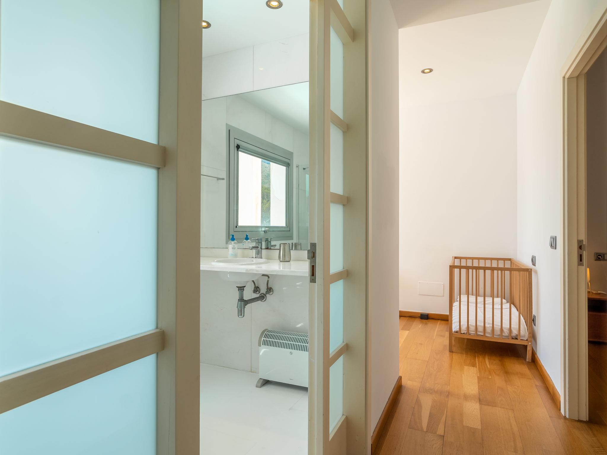 "Villa Mut", 5-room villa 200 m2. Object suitable for 6 adults. Practical and comfortable furnishings: living/dining room with panoramic window with satellite TV, digital TV, flat screen, air conditioning and forced-air heating. Exit to the patio, to the swimming pool. Open kitchen (oven, dishwasher, 4 ceramic glass hob hotplates, microwave, freezer, electric coffee machine). Exit to the patio, to the swimming pool. Upper floor: 1 large double bedroom with panoramic window with 2 beds (90 cm, length 190 cm), air conditioning and forced-air heating. 1 large double bedroom with panoramic window with 1 bed (150 cm, length 190 cm), air conditioning and forced-air heating. Exit to the terrace. 1 large double bedroom with panoramic window with 1 bed (150 cm, length 190 cm), air conditioning and forced-air heating. 2 Baths/showers/WC. Large patio, lawn. Terrace furniture, deck chairs (4), covered balcony, box-room. Panoramic view of the mountains, the countryside and the ocean. Facilities: washing machine, iron, children's high chair, baby cot for up to 2 year olds, hair dryer. Internet (WiFi, free). Suitable for families. ETV13858