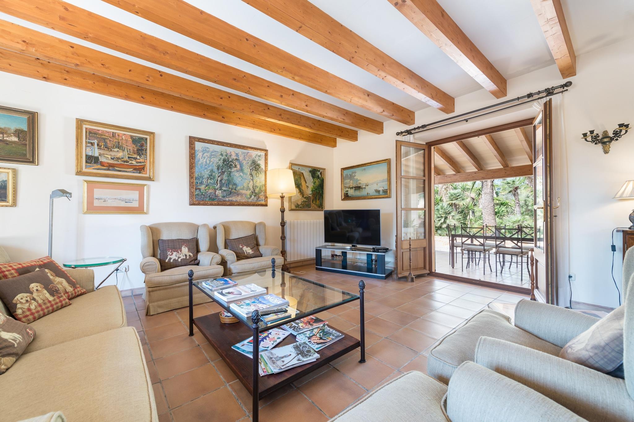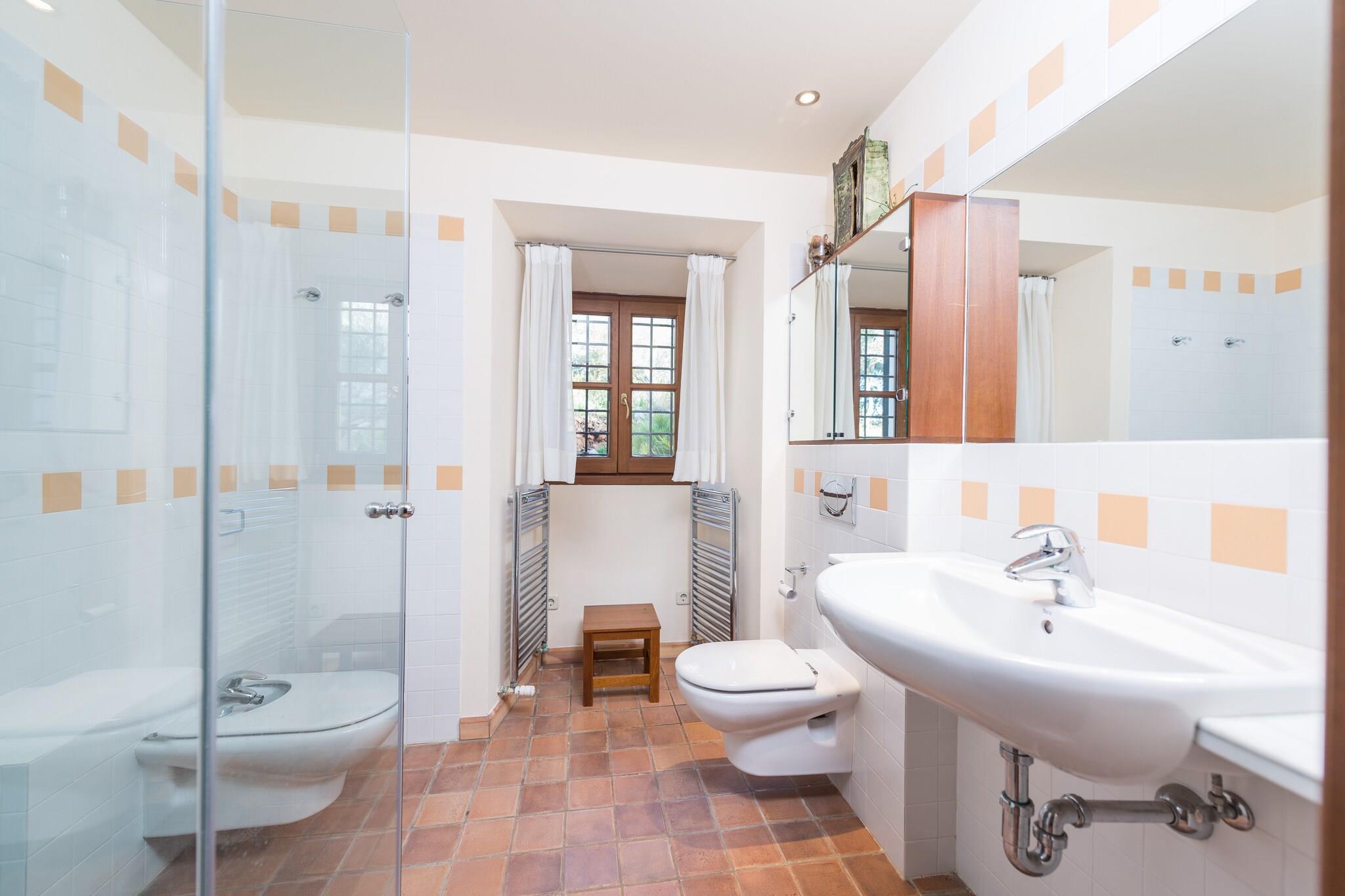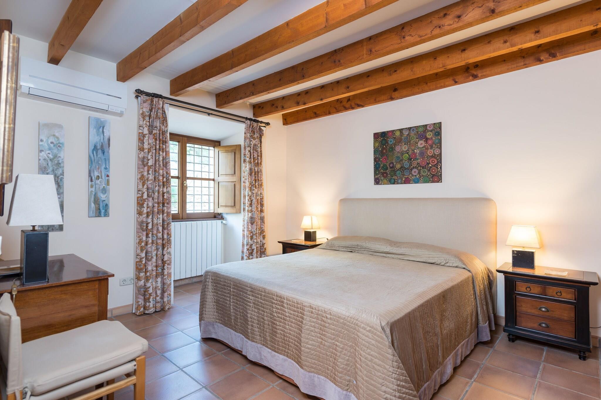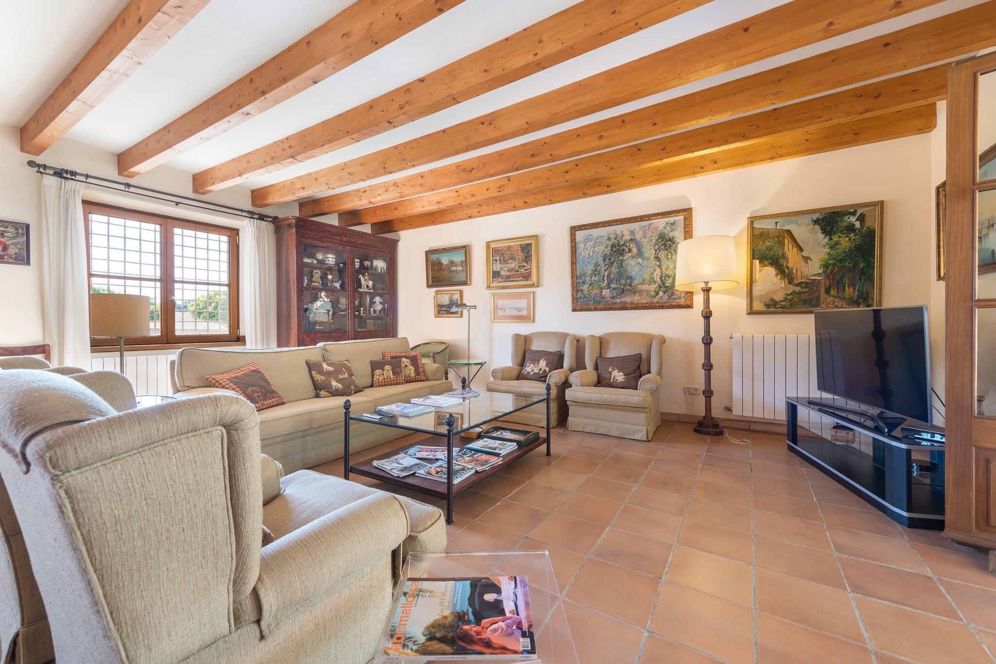 Nyd en uovertruffen udendørsliv med panoramaudsigt over bjergene fra saltvandspoolen (11 x 5 m, dybde 1,10–1,80 m). Slap af på 12 liggestole eller nyd middelhavsmorgenmad og grillmad ved det store træbord. Aftendrinks kan nydes på flere verandaer og terrasser. Denne enestående finca har to luksuriøse bygninger. Hovedhuset i to etager kan prale af rummelige værelser: et stort køkken med hvidevarer i rustfrit stål og gaskomfur, stue/spisestue med satellit-tv, en anden stue, fire soveværelser (en dobbeltseng, andre med enkeltsenge), hver med en-suite badeværelser og garderobeskabe, plus et gæstetoilet og vaskerum med vaskemaskine og tørretumbler. Ovenpå indeholder en hyggelig tv-stue og yderligere soveværelser. Det tilstødende anneks har en komfortabel stue og to soveværelser med en-suite badeværelser. Begge bygninger er udstyret med oliecentralvarme for vinterkomfort. Beliggende i det beskyttede område Colonia de Sant Pere, omgivet af natur og alligevel tæt på butikker, barer og restauranter. Udvendig parkering til 8 biler. Kæledyr og arrangementer er ikke tilladt. Depositum kræves ved ankomst.