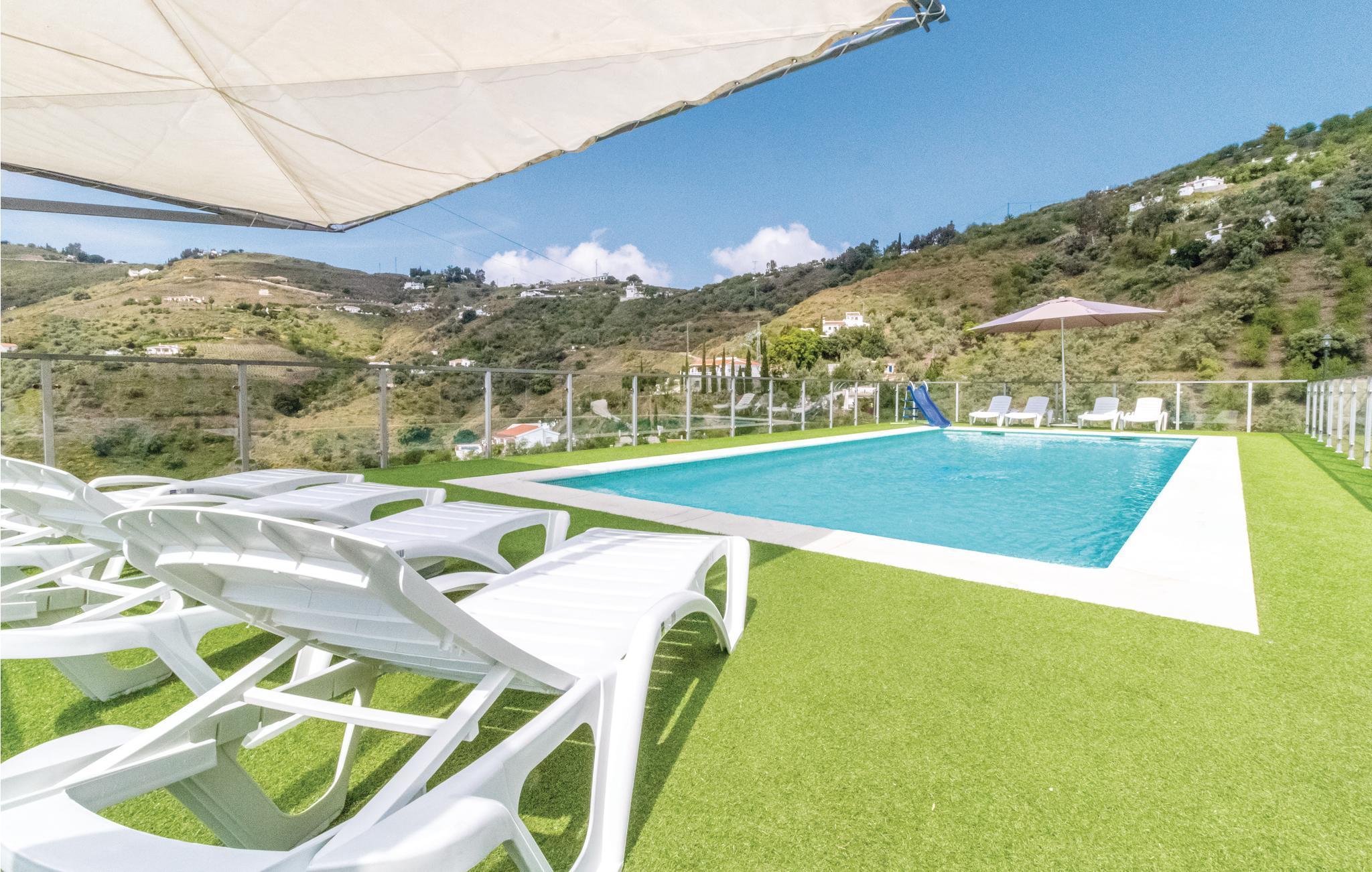 Smukt sommerhus på landet nær Cómpeta, en af de hvide landsbyer i Axarquía. Huset ligger i Sierras de Tejeda naturpark og tilbyder i kraft af sin enestående beliggenhed en spektakulær udsigt over landskabet. Dette storslåede hus ligger 5 minutters kørsel fra byen, og det tilbyder 5 store soveværelser, en stue og et køkken forbundet med en bar, så du kan nyde din families selskab, mens du laver mad. Der er også en smuk terrasse stor spiseplads ved siden af grillen og en blændende 11 meters pool med liggestole, ideel til at slappe af og nyde den lune sol på det østlige Costa del Sol. Nyd den storslåede udsigt over tropiske frugtplantager og vinmarker. De sidste 200 meter op til huset er stejl.