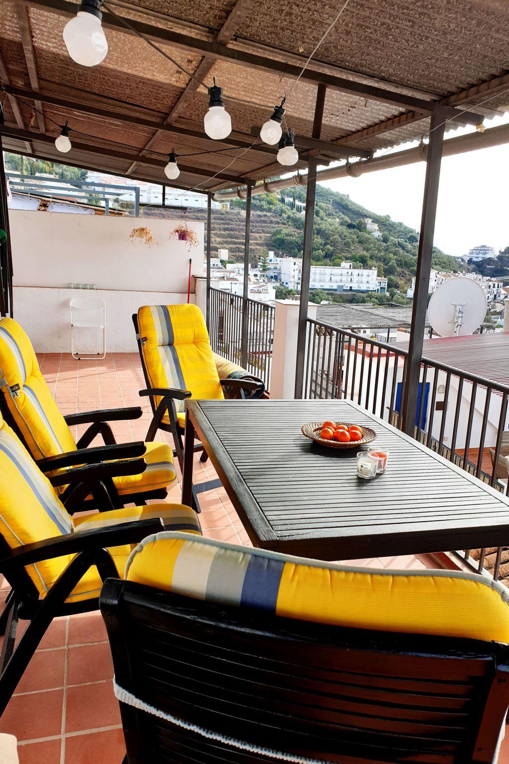 This holiday home features 4 bedrooms, 3 bathrooms, bed linen, towels, a satellite TV, a dining room, a fully equipped kitchen and two large terraces, one covered and one sun terrace. Both offer views of the sea, the mountains and the town of Cómpeta. The holiday home has a simple outdoor kitchen, a barbecue, a hammock and a hanging chair for small children. There are lovely garden chairs and cheerful parasols.