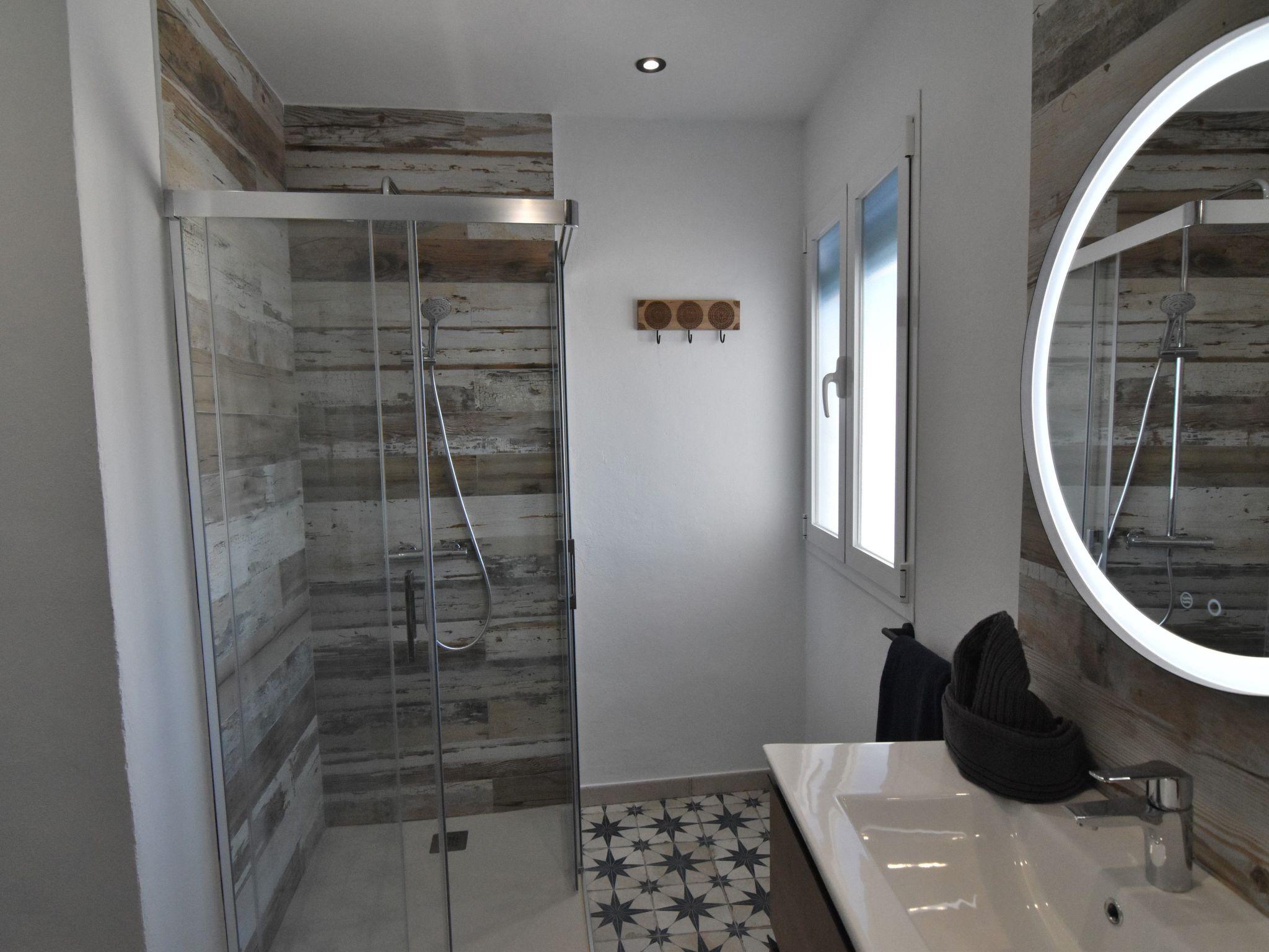 Steps continue to the 2nd floor, to a medium size bedroom with a large double bed (150cm) and en-suite bathroom also with rain effect shower and smart mirror. This floor is complemented with a terrace with colorful awning, seating for 4 people and two sun loungers to unwind and chill after a day of exploring the area.