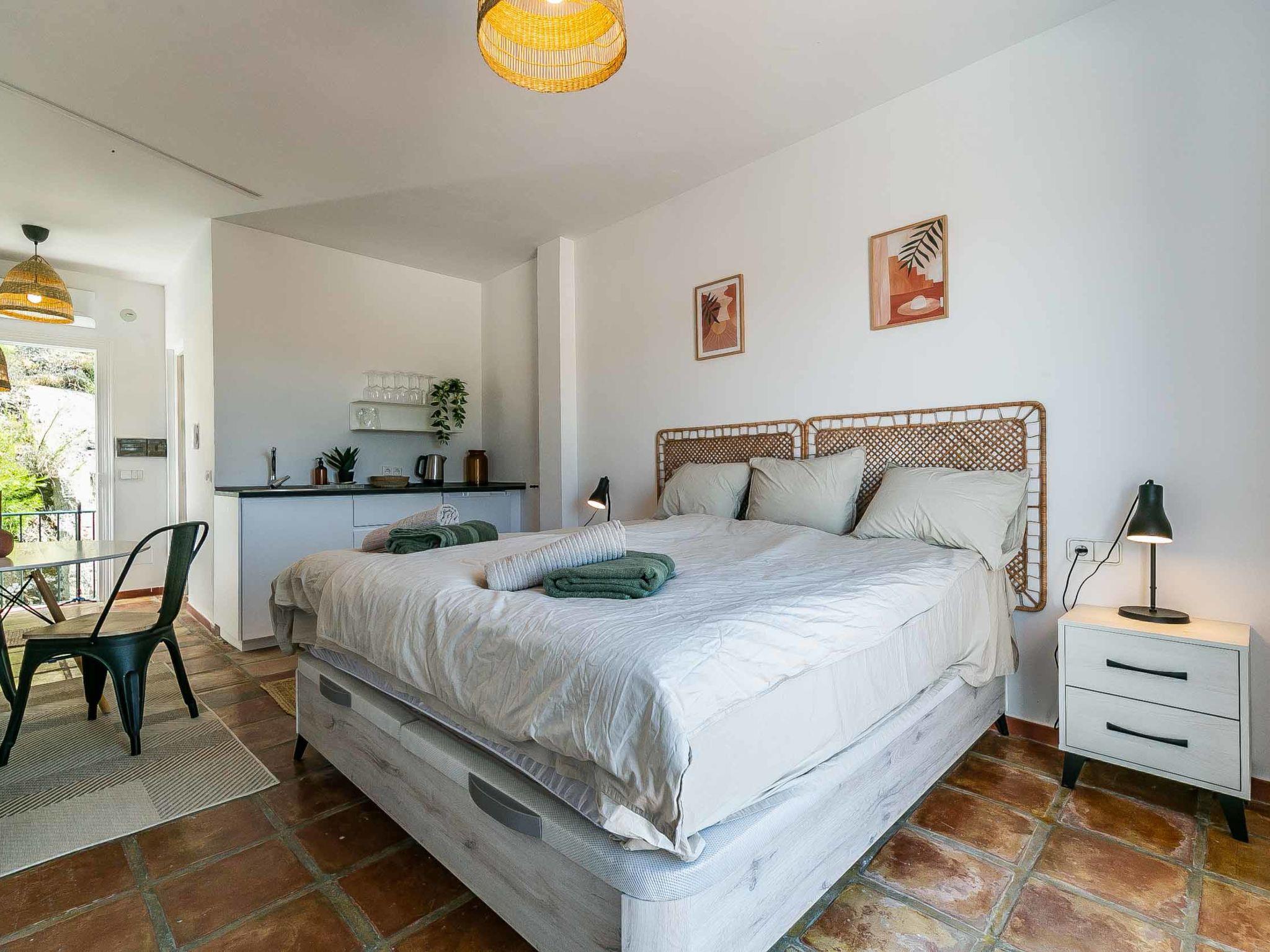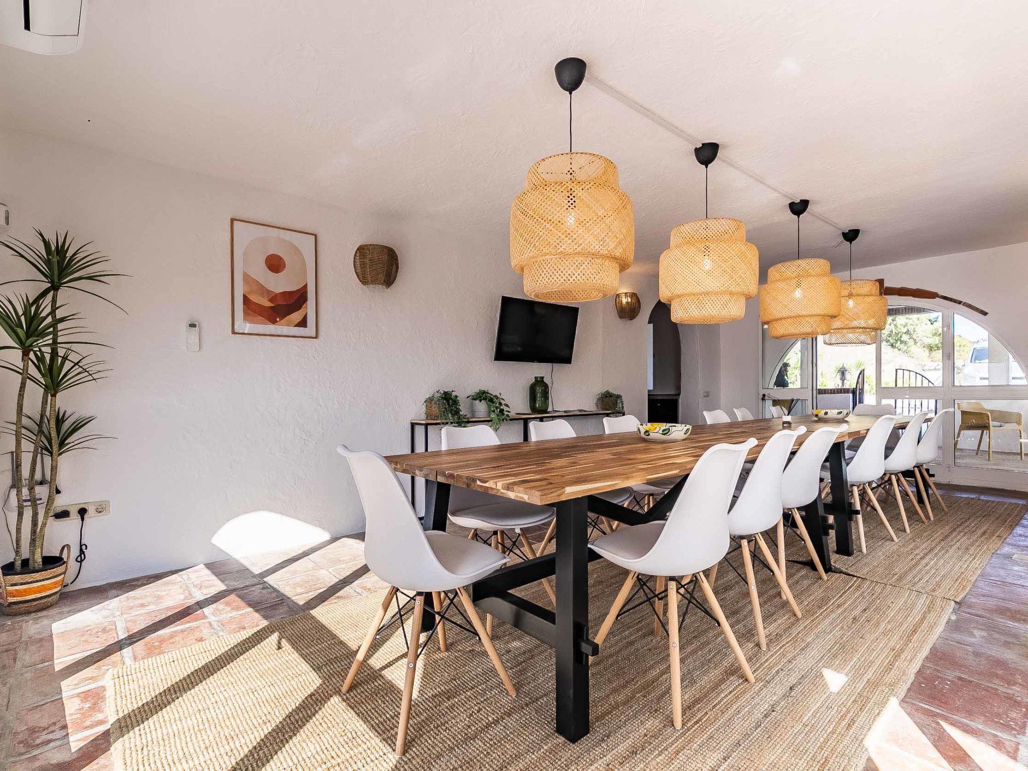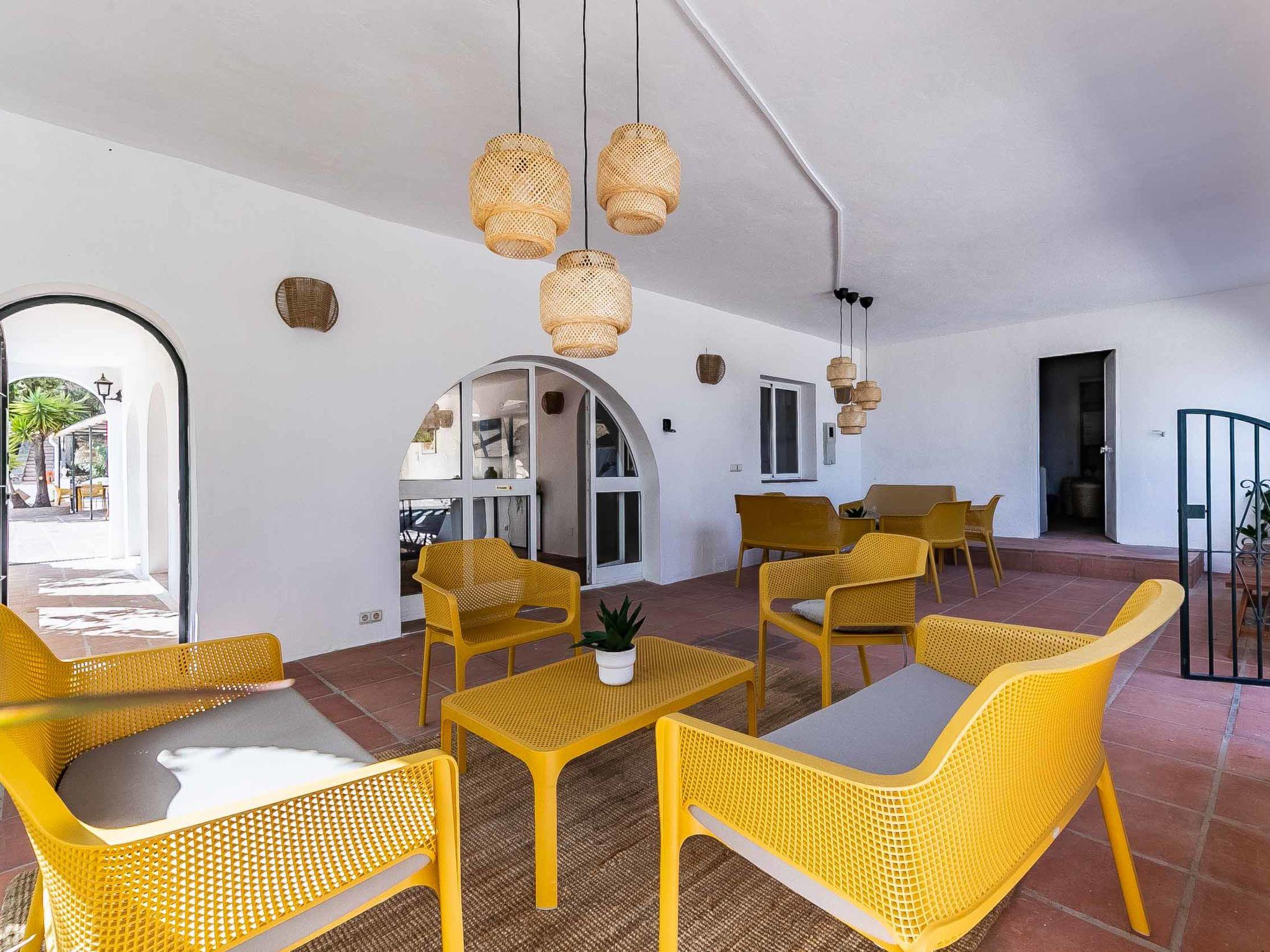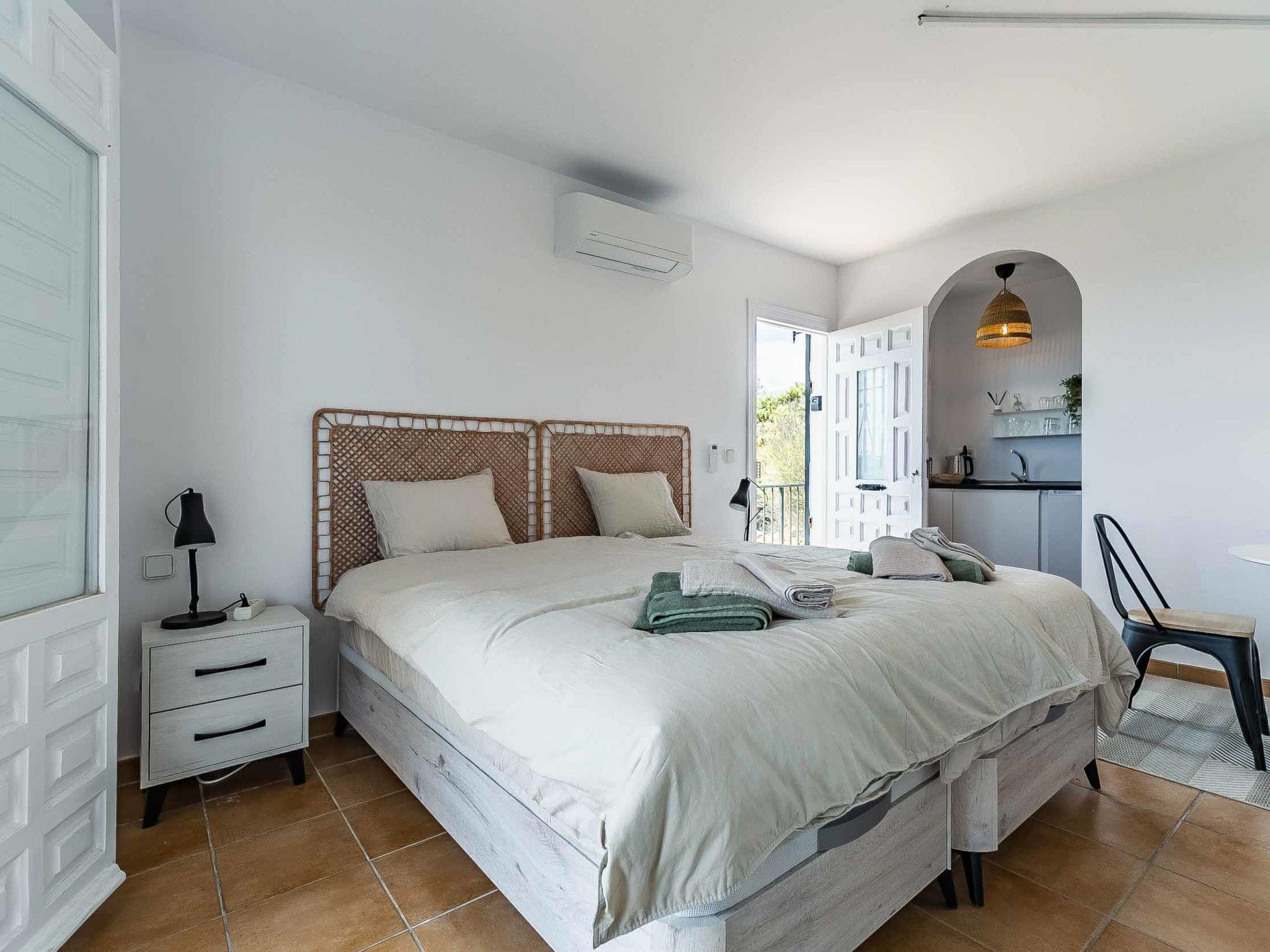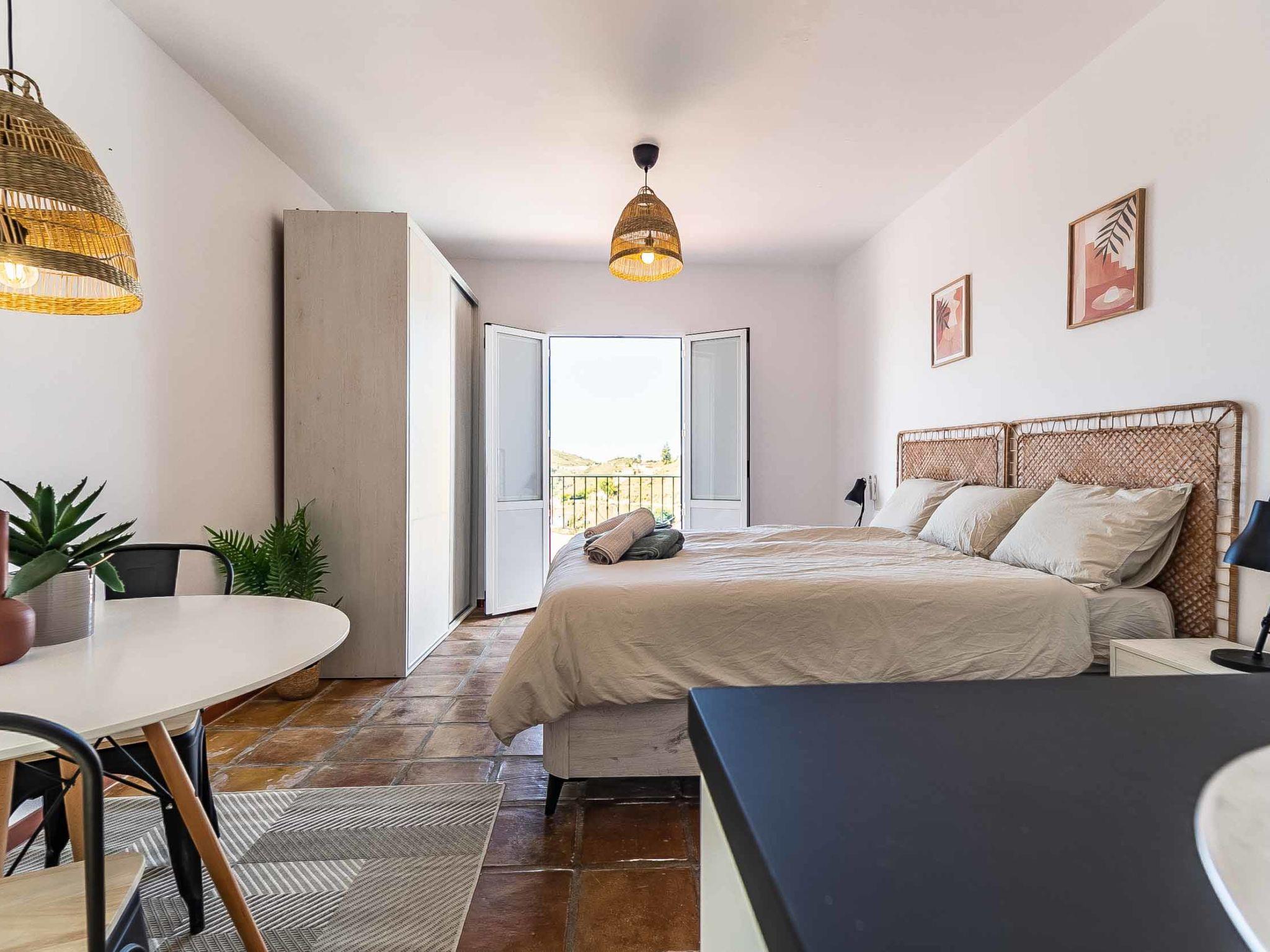"Hacienda Competa", 13-room farmhouse 350 m2 on 3 levels. Spacious, practical and comfortable furnishings: living/dining room with kitchen corner, shower/WC, air conditioning and forced-air heating. Exit to the garden. 1 room with 1 french bed (160 cm, length 200 cm), air conditioning and forced-air heating. Studio with 1 french bed (160 cm, length 200 cm), dining table, kitchen corner, shower/WC, air conditioning and forced-air heating. Exit to the garden. 1 small room with 2 beds (80 cm, length 200 cm), fan. 3 rooms, each room with 2 beds (80 cm, length 200 cm), dining table, kitchen corner, shower/WC, air conditioning and forced-air heating. Exit to the swimming pool. Large dining room with shower/bidet/WC. Large kitchen (oven, dishwasher, 4 ceramic glass hob hotplates, toaster, kettle, microwave, freezer, electric coffee machine). Upper floor: (exterior staircase) small, Studio with 1 french bed (160 cm, length 200 cm), dining table, kitchen corner, shower/WC, air conditioning and forced-air heating. Exit to the balcony. Small, Studio with 2 beds (80 cm, length 200 cm), dining table, kitchen corner, air conditioning and forced-air heating. Exit to the balcony. Small, Studio with 1 french bed (160 cm, length 200 cm), dining table, kitchen corner, shower/WC, air conditioning and forced-air heating. Exit to the balcony. Studio with 1 french bed (160 cm, length 200 cm), dining table, kitchen corner, shower/WC, air conditioning and forced-air heating. Exit to the balcony. Studio with 1 french bed (160 cm, length 200 cm), dining table, kitchen corner, shower/WC, air conditioning and forced-air heating. Exit to the balcony. 2nd upper floor: (exterior staircase), Studio with 2 beds (80 cm, length 200 cm), dining table, kitchen corner and shower/WC. Exit to the terrace. Terrace furniture, balcony furniture. View of the countryside. Facilities: washing machine, iron, children's high chair, baby cot for up to 2 year olds, hair dryer. Internet (WiFi, free). Please note: suitable for families one double bedroom is outside the apartment. Non-smoking house. The estate is divided into three independent areas, not connected to one another: a main house, a pool house and a secondary house, each with its own private entrance.
