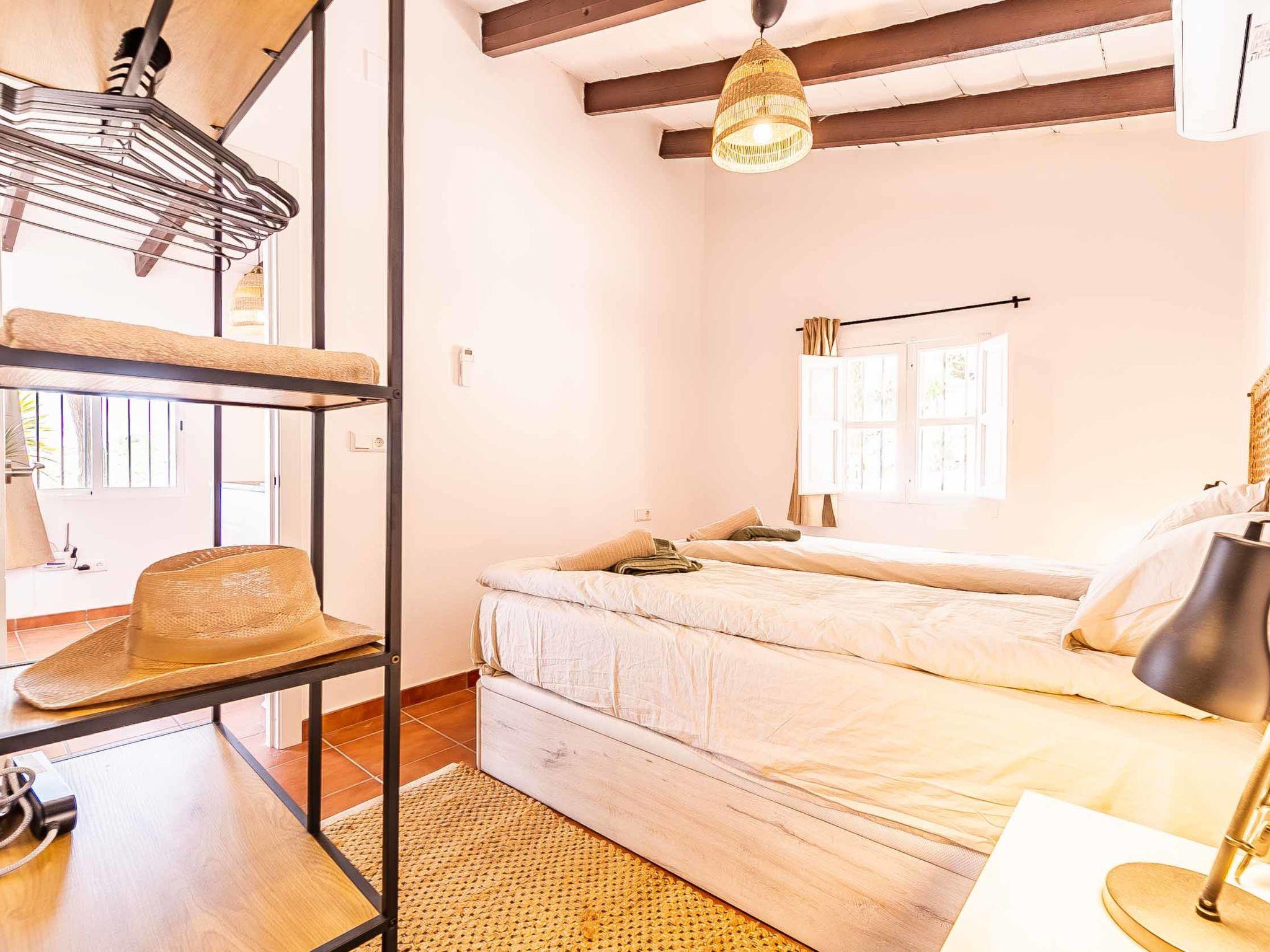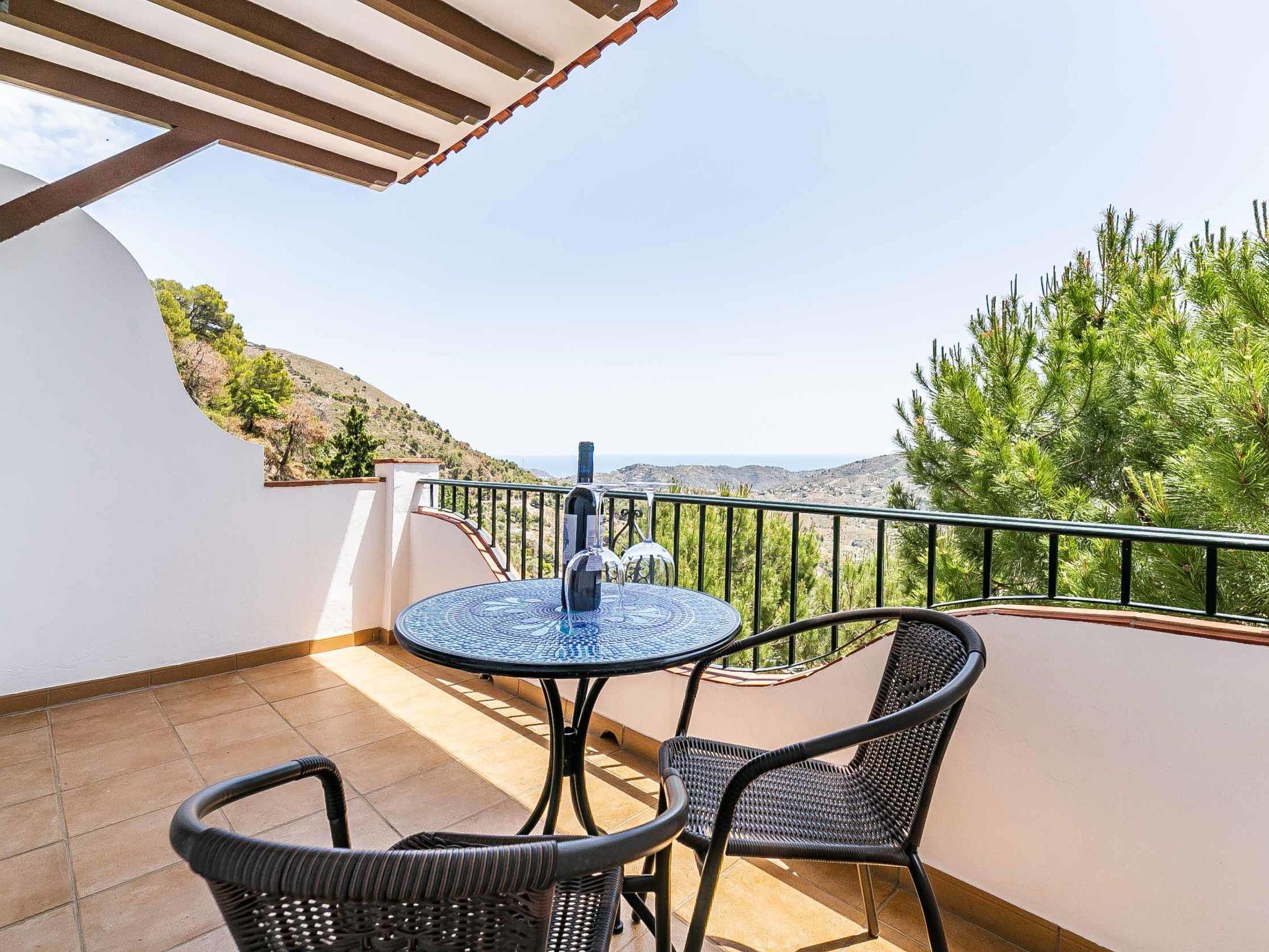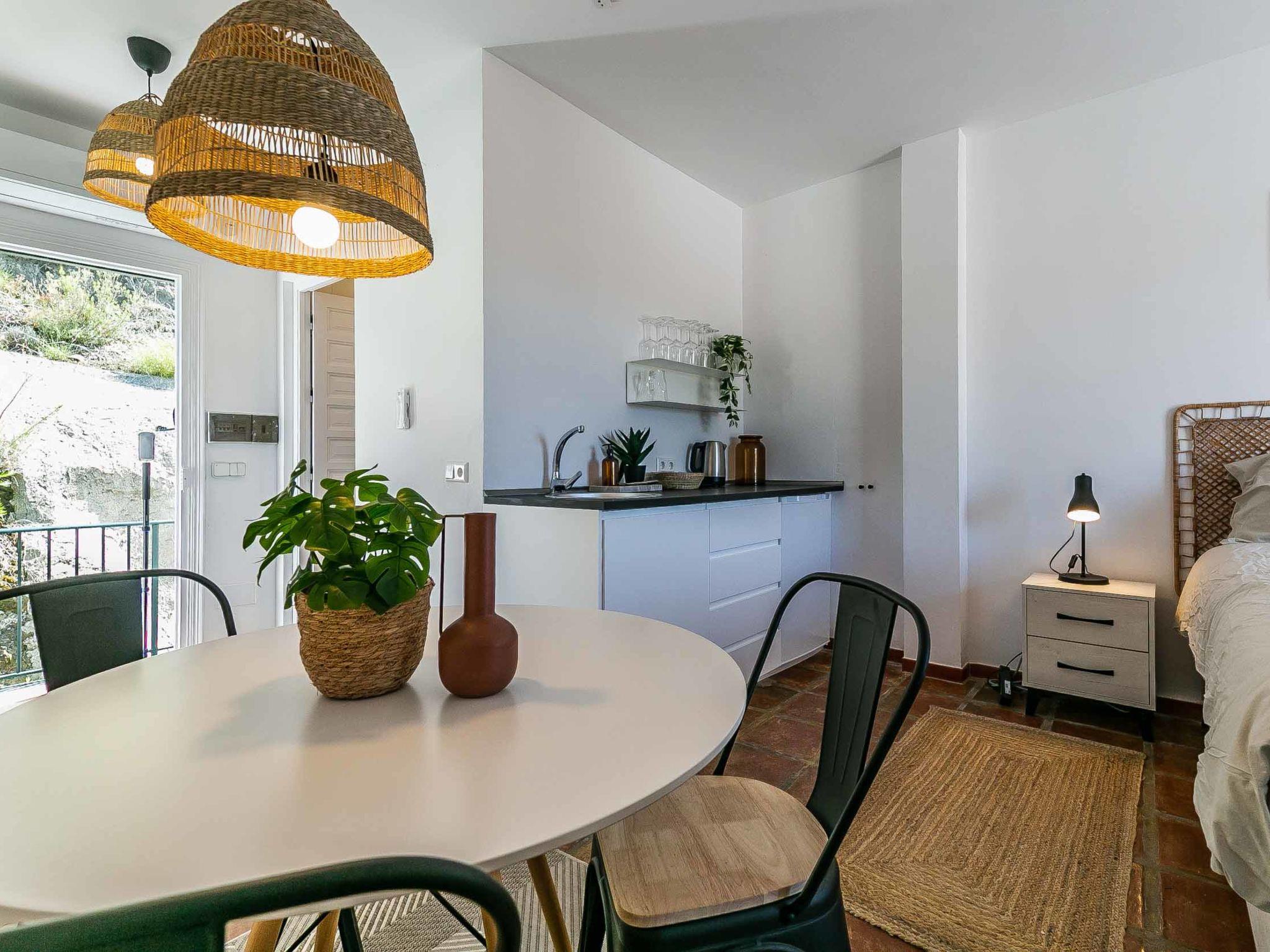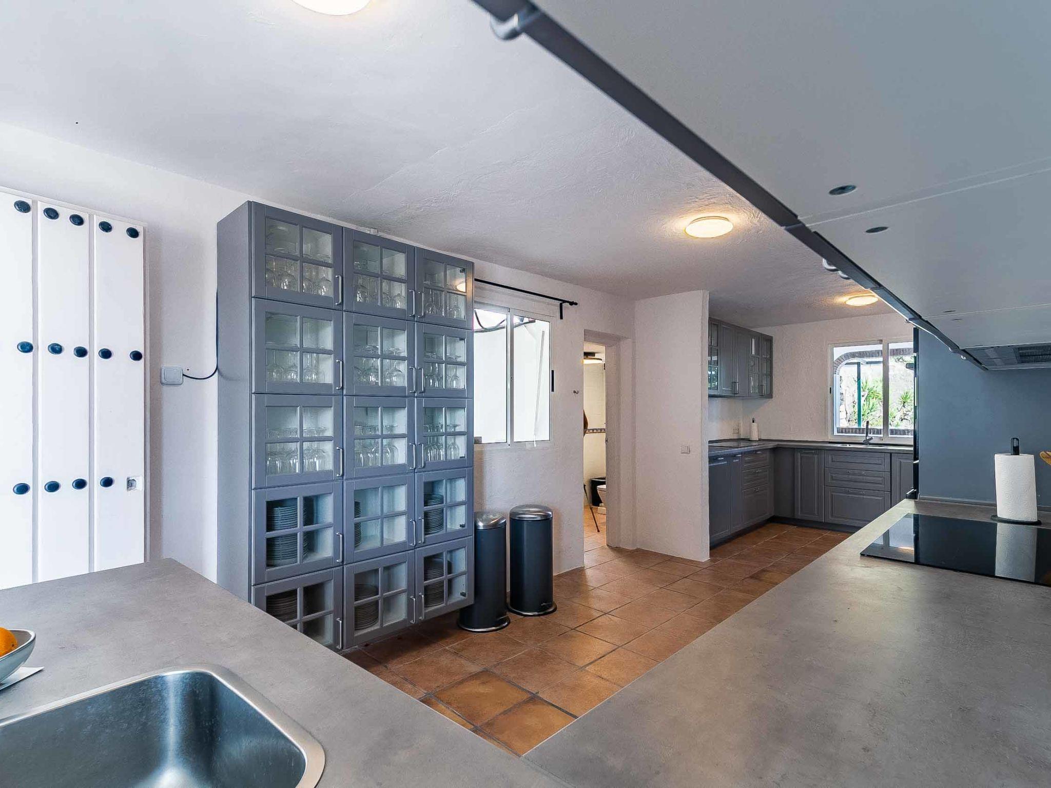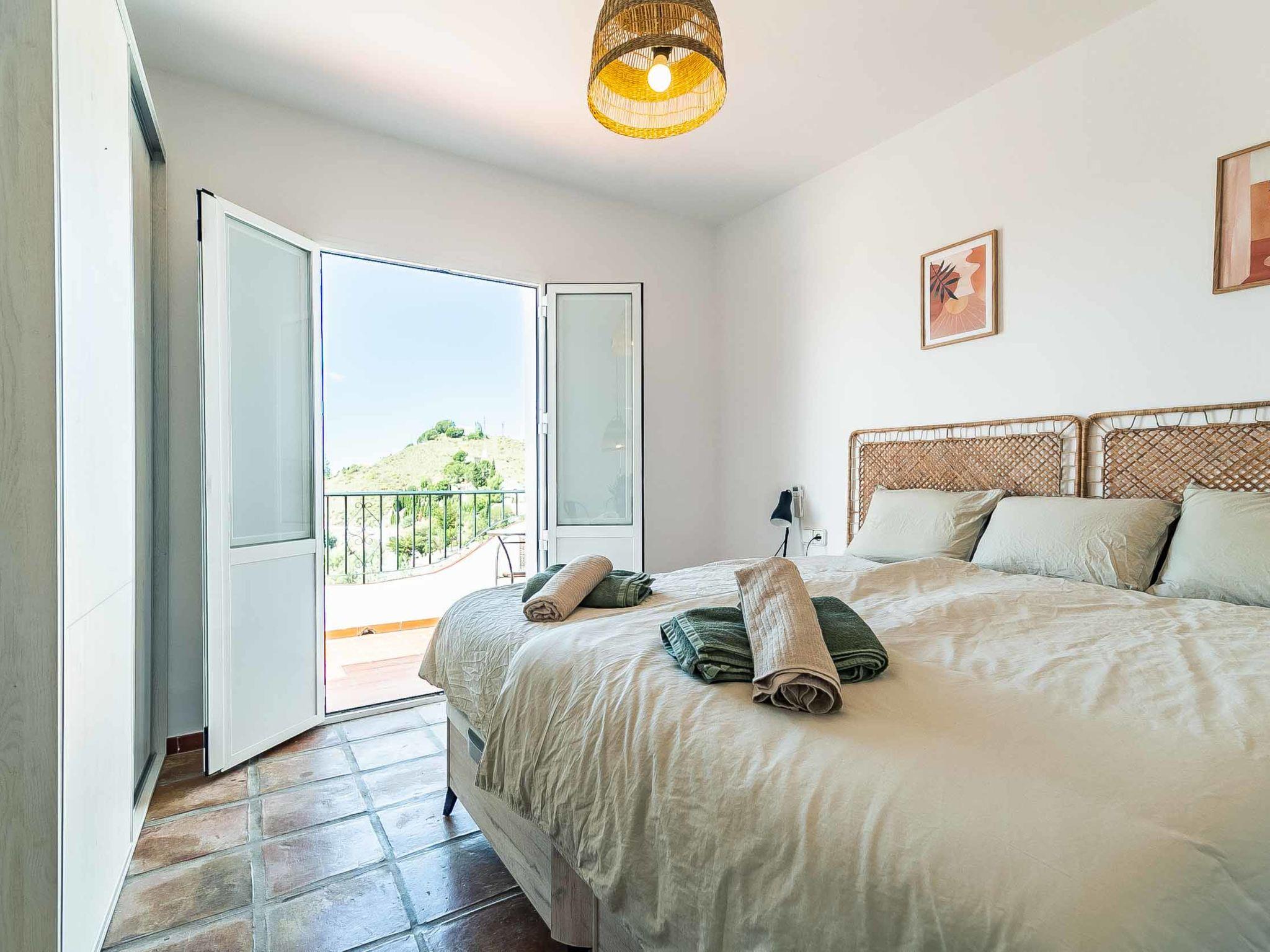 "Hacienda Competa", 13-room farmhouse 350 m2 on 3 levels. Spacious, practical and comfortable furnishings: living/dining room with kitchen corner, shower/WC, air conditioning and forced-air heating. Exit to the garden. 1 room with 1 french bed (160 cm, length 200 cm), air conditioning and forced-air heating. Studio with 1 french bed (160 cm, length 200 cm), dining table, kitchen corner, shower/WC, air conditioning and forced-air heating. Exit to the garden. 1 small room with 2 beds (80 cm, length 200 cm), fan. 3 rooms, each room with 2 beds (80 cm, length 200 cm), dining table, kitchen corner, shower/WC, air conditioning and forced-air heating. Exit to the swimming pool. Large dining room with shower/bidet/WC. Large kitchen (oven, dishwasher, 4 ceramic glass hob hotplates, toaster, kettle, microwave, freezer, electric coffee machine). Upper floor: (exterior staircase) small, Studio with 1 french bed (160 cm, length 200 cm), dining table, kitchen corner, shower/WC, air conditioning and forced-air heating. Exit to the balcony. Small, Studio with 2 beds (80 cm, length 200 cm), dining table, kitchen corner, air conditioning and forced-air heating. Exit to the balcony. Small, Studio with 1 french bed (160 cm, length 200 cm), dining table, kitchen corner, shower/WC, air conditioning and forced-air heating. Exit to the balcony. Studio with 1 french bed (160 cm, length 200 cm), dining table, kitchen corner, shower/WC, air conditioning and forced-air heating. Exit to the balcony. Studio with 1 french bed (160 cm, length 200 cm), dining table, kitchen corner, shower/WC, air conditioning and forced-air heating. Exit to the balcony. 2nd upper floor: (exterior staircase), Studio with 2 beds (80 cm, length 200 cm), dining table, kitchen corner and shower/WC. Exit to the terrace. Terrace furniture, balcony furniture. View of the countryside. Facilities: washing machine, iron, children's high chair, baby cot for up to 2 year olds, hair dryer. Internet (WiFi, free). Please note: suitable for families one double bedroom is outside the apartment. Non-smoking house. The estate is divided into three independent areas, not connected to one another: a main house, a pool house and a secondary house, each with its own private entrance.