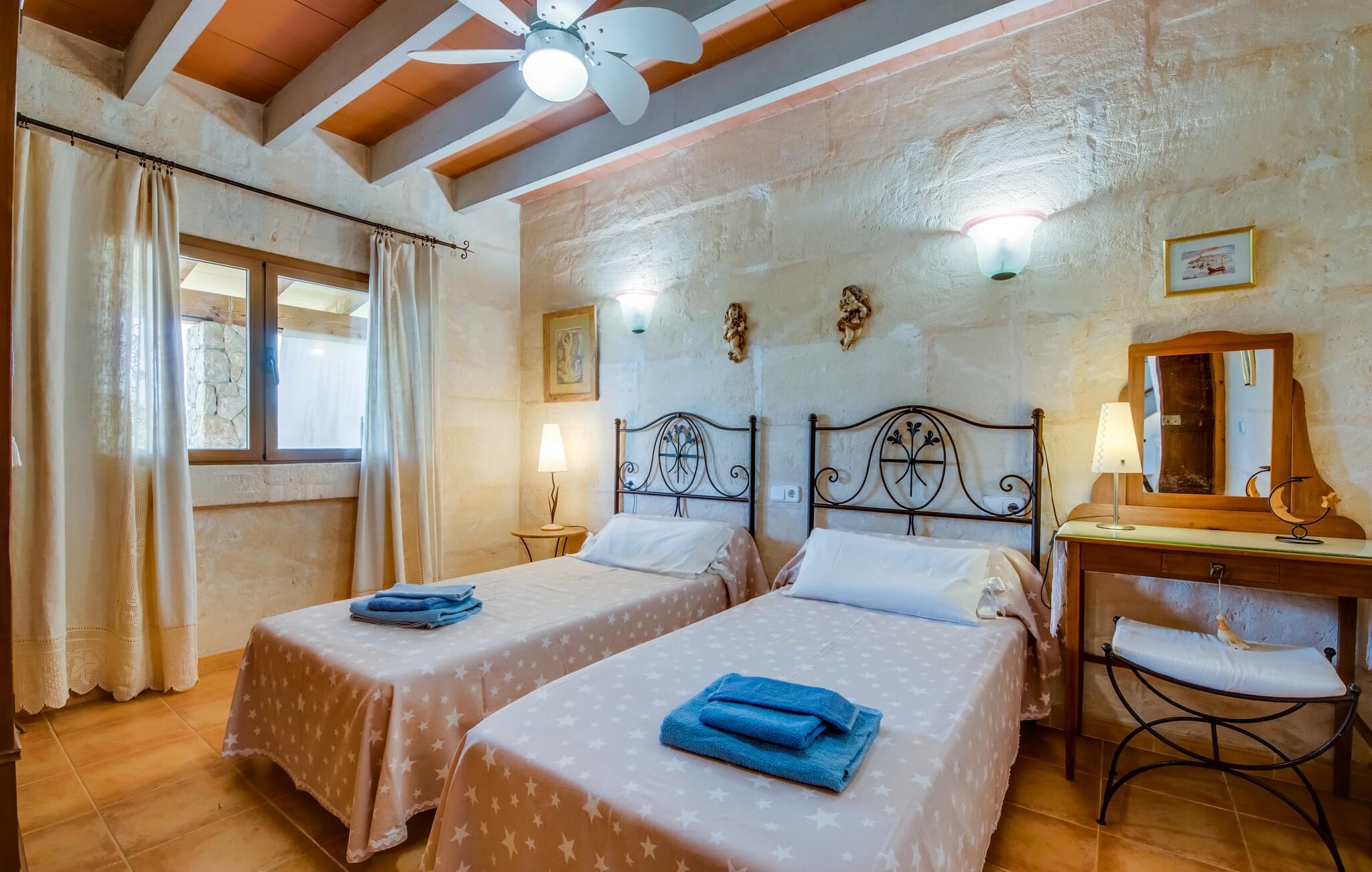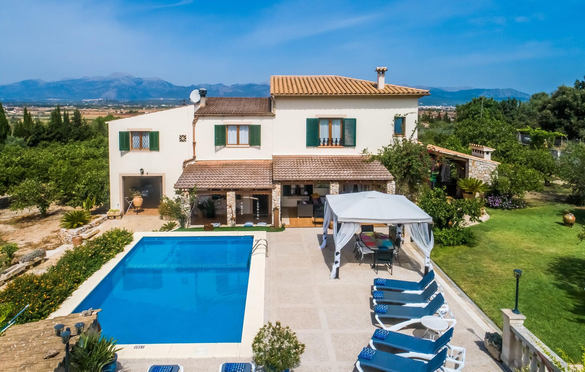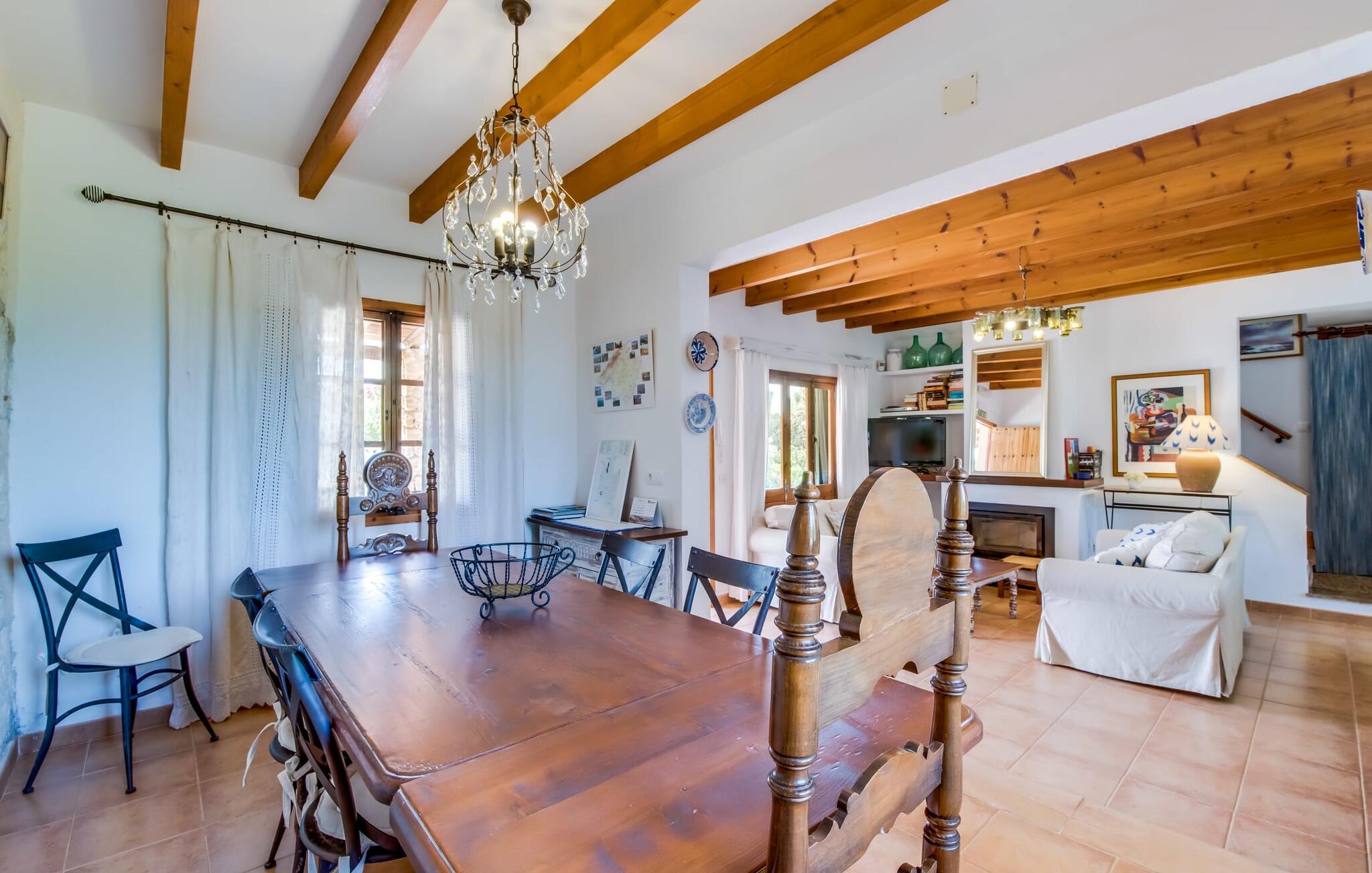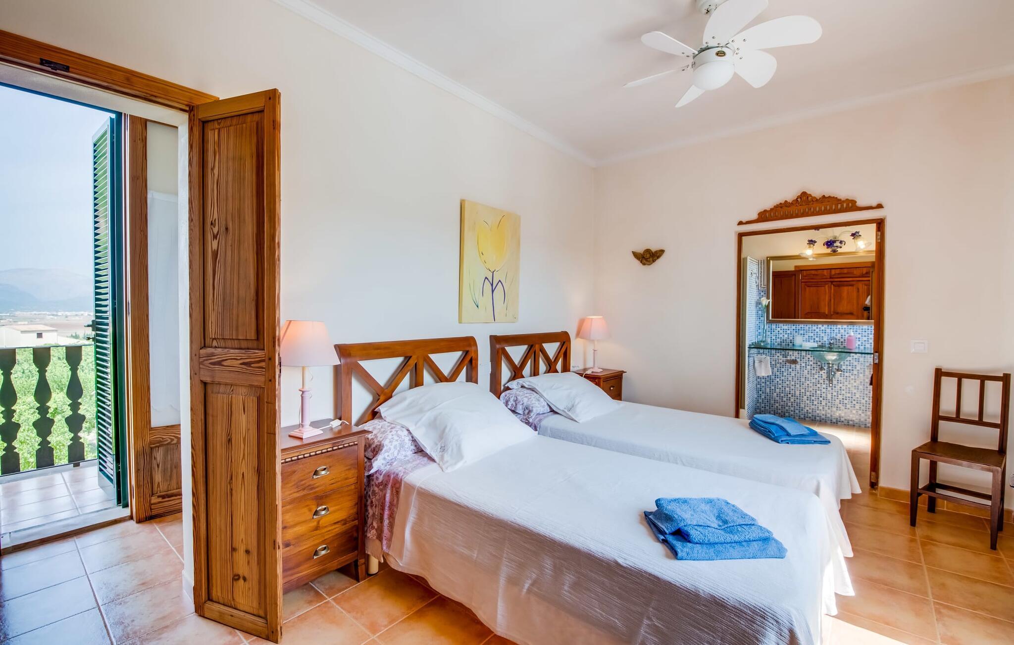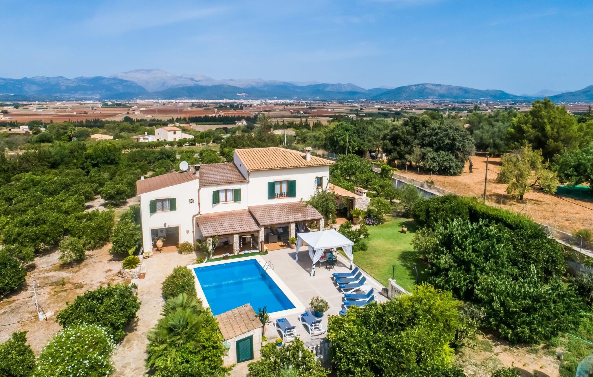 Fincaen "Comuna de Can Rius" er et charmerende feriehus i udkanten af landsbyen Muro på den nordlige del af Mallorca. Det fungerer som en fremragende base for at udforske øen, samtidig med at det giver et afslappende miljø. Ejendommen har forskellige terrasseområder og en balkon udstyret med et stort spisebord og komfortable liggestole, så gæsterne kan nyde både solrige og skyggefulde områder. Fincaen har en pool, der nyder godt af sydorientering og er derfor ideel til solbadning. Et udendørs køkken er tilgængeligt for dem, der ønsker at tilberede måltider, der kan nydes sammen under stjernerne. Den store grund er dekoreret med talrige træer, perfekt til afslappede gåture. Gæsterne kan bekvemt parkere deres lejebiler på gaden foran huset. Det indre af huset har et klassisk layout, forstærket af traditionelle mallorcanske møbler og moderne bekvemmeligheder, hvilket skaber en indbydende atmosfære. I stueetagen er der åbent indgangsparti, opholds- og spisestue samt soveværelse med badeværelse. Der er yderligere soveværelser ovenpå, hver med sit eget badeværelse, hvilket sikrer privatlivets fred for alle gæster. Samlet set tilbyder fincaen en blanding af komfort, stil og autenticitet, hvilket gør den til det ideelle valg til en ferie på Mallorca. Fincaen "Comuna de Can Rius" ligger i udkanten af Muro i en sydlig beliggenhed. Vejen, der blandt andet fører til den 11,4 km lange Alcúdia-bugt, kan høres akustisk afhængig af vindretningen. Butikker og restauranter ligger inden for gåafstand. El til opvarmning opkræves på stedet, kontant i vintermånederne.
