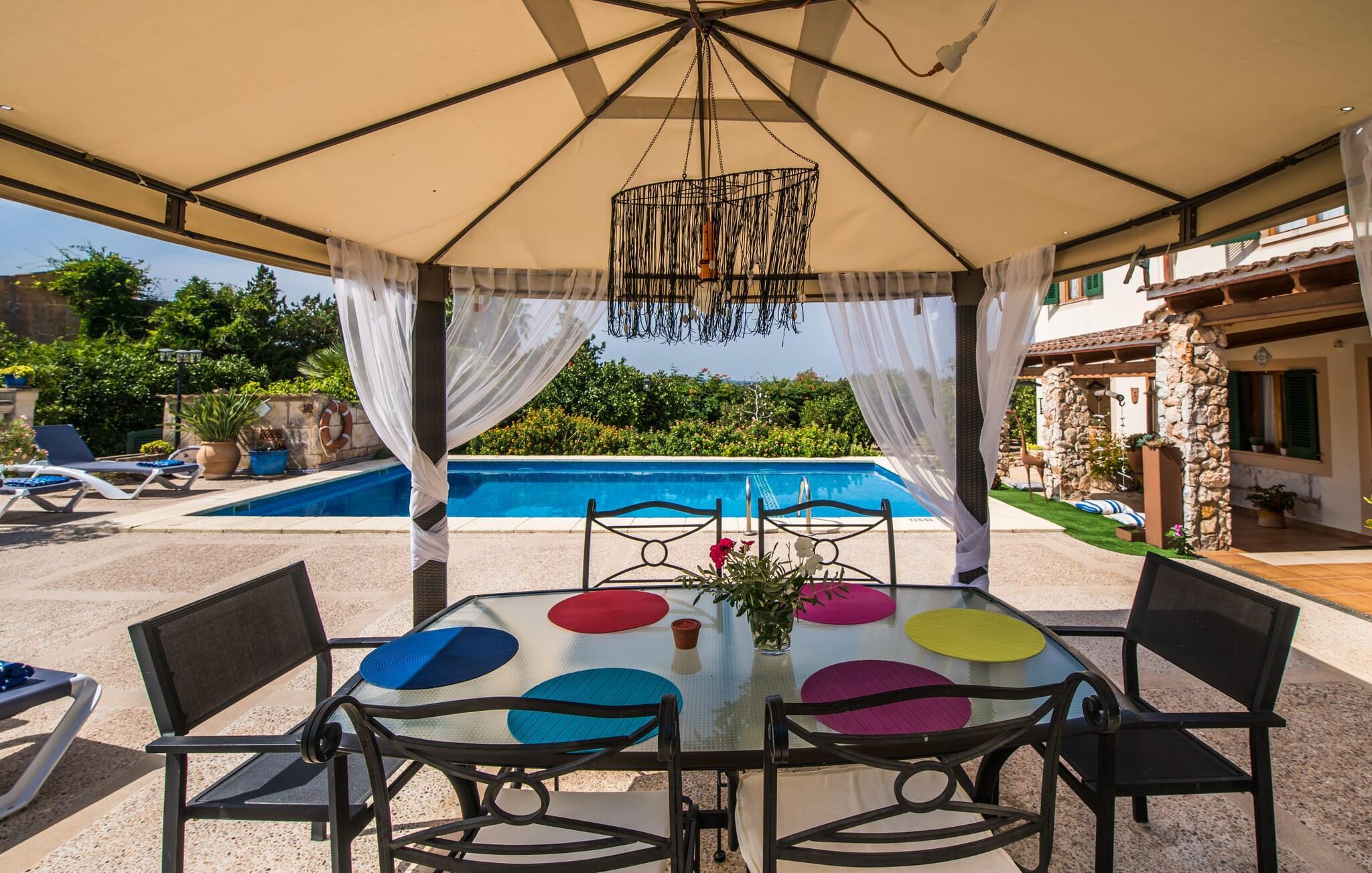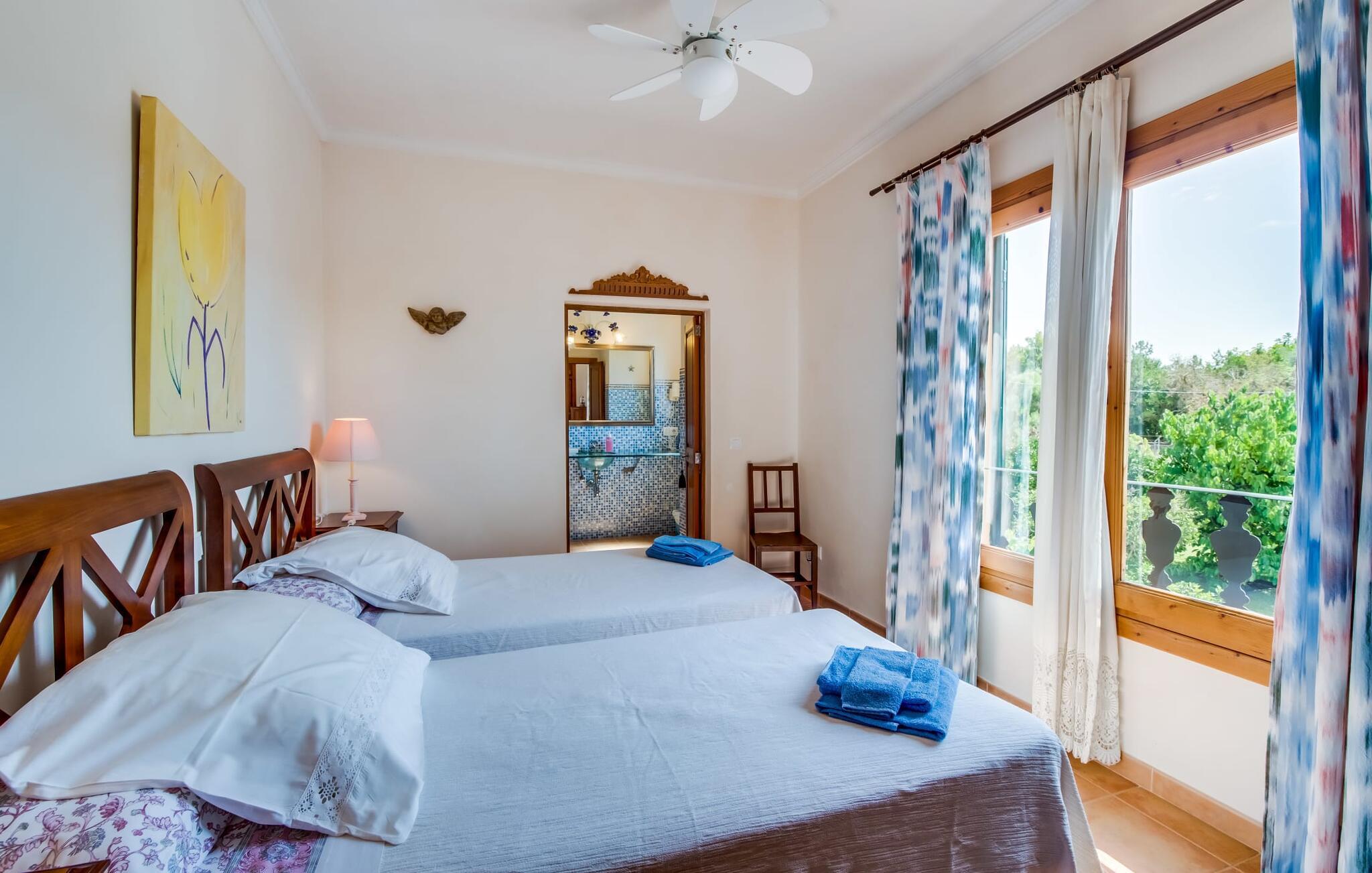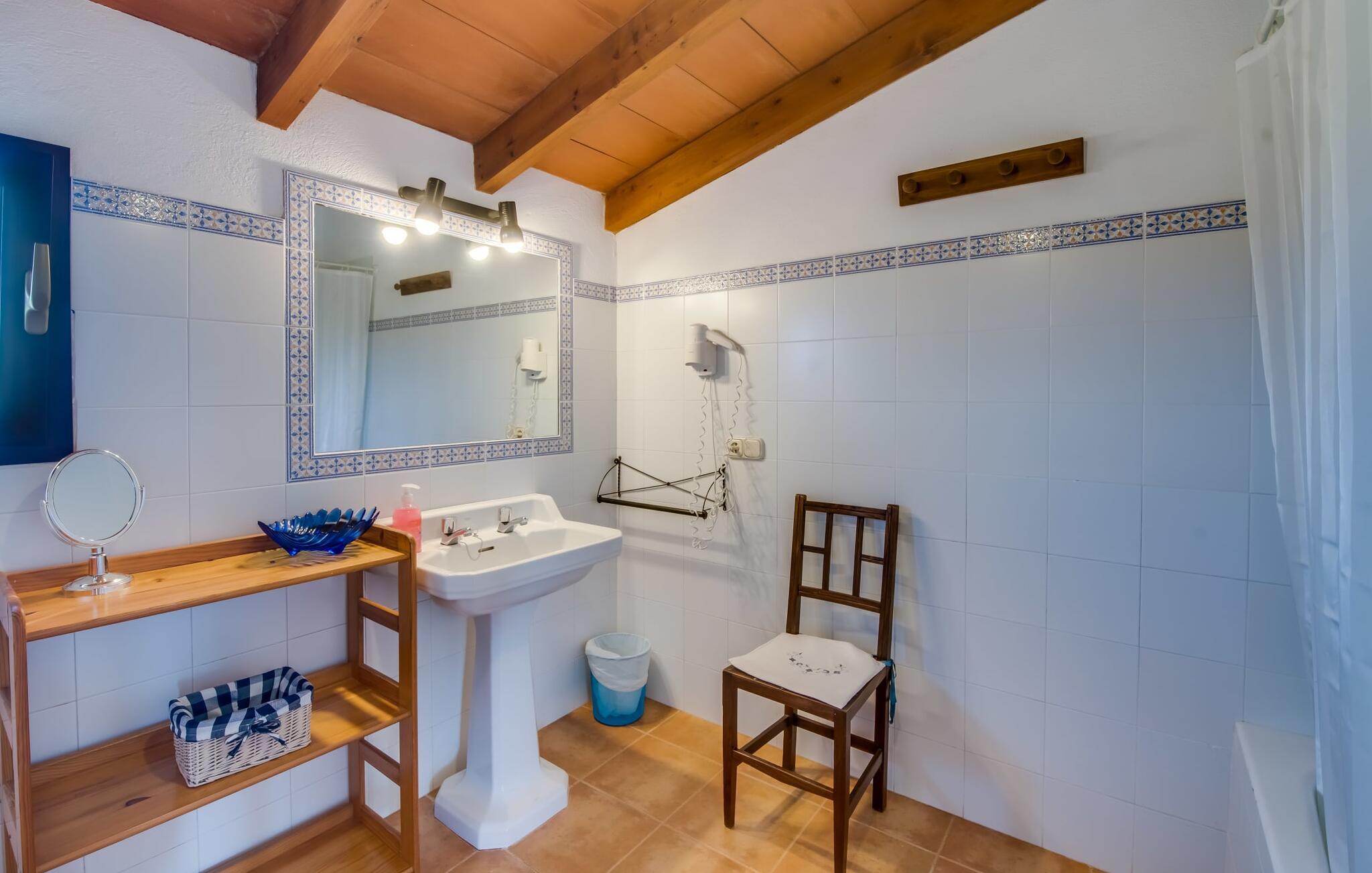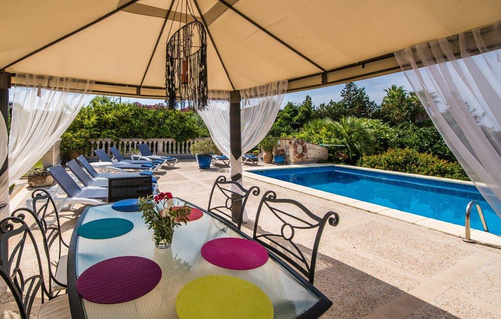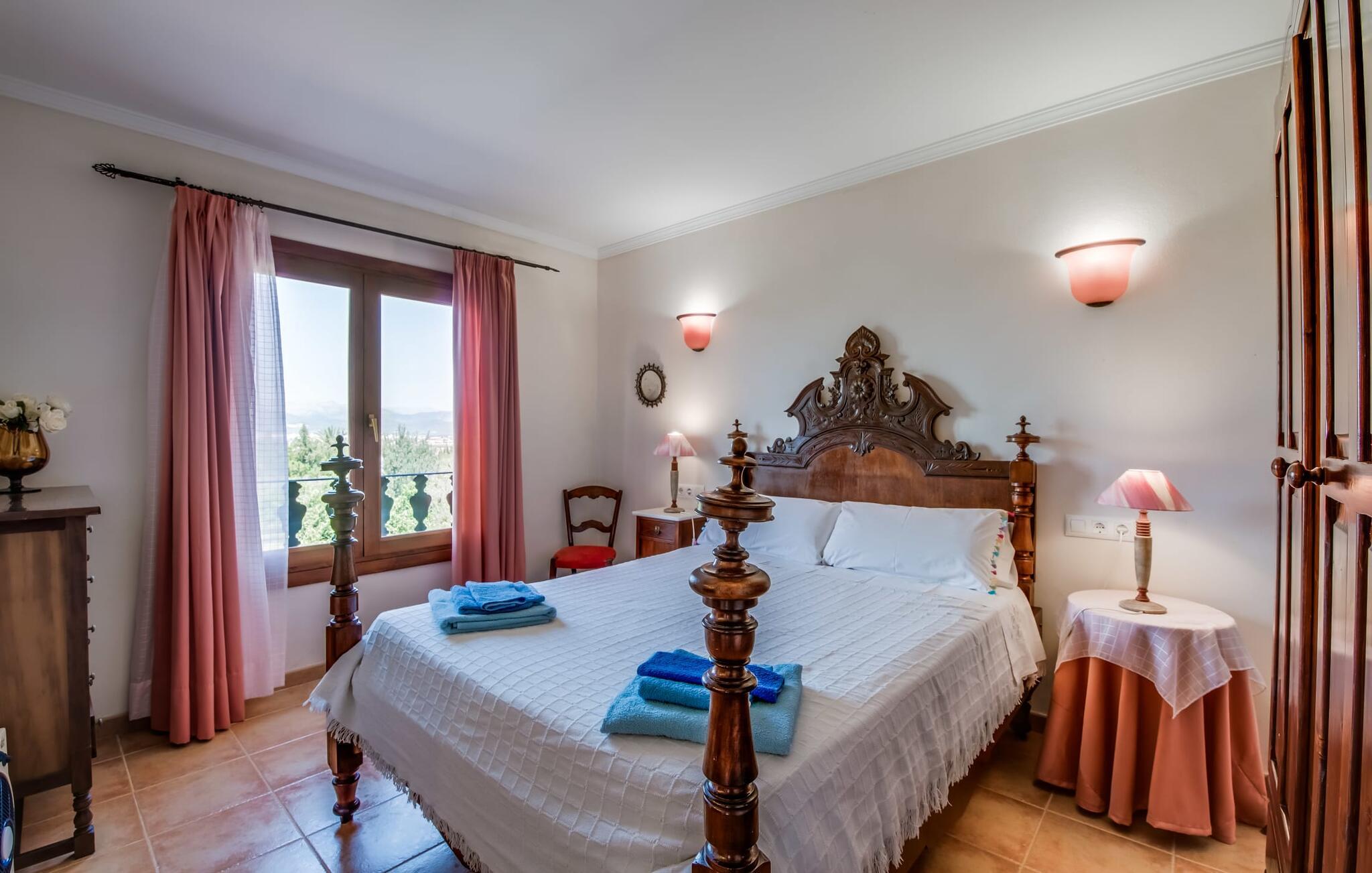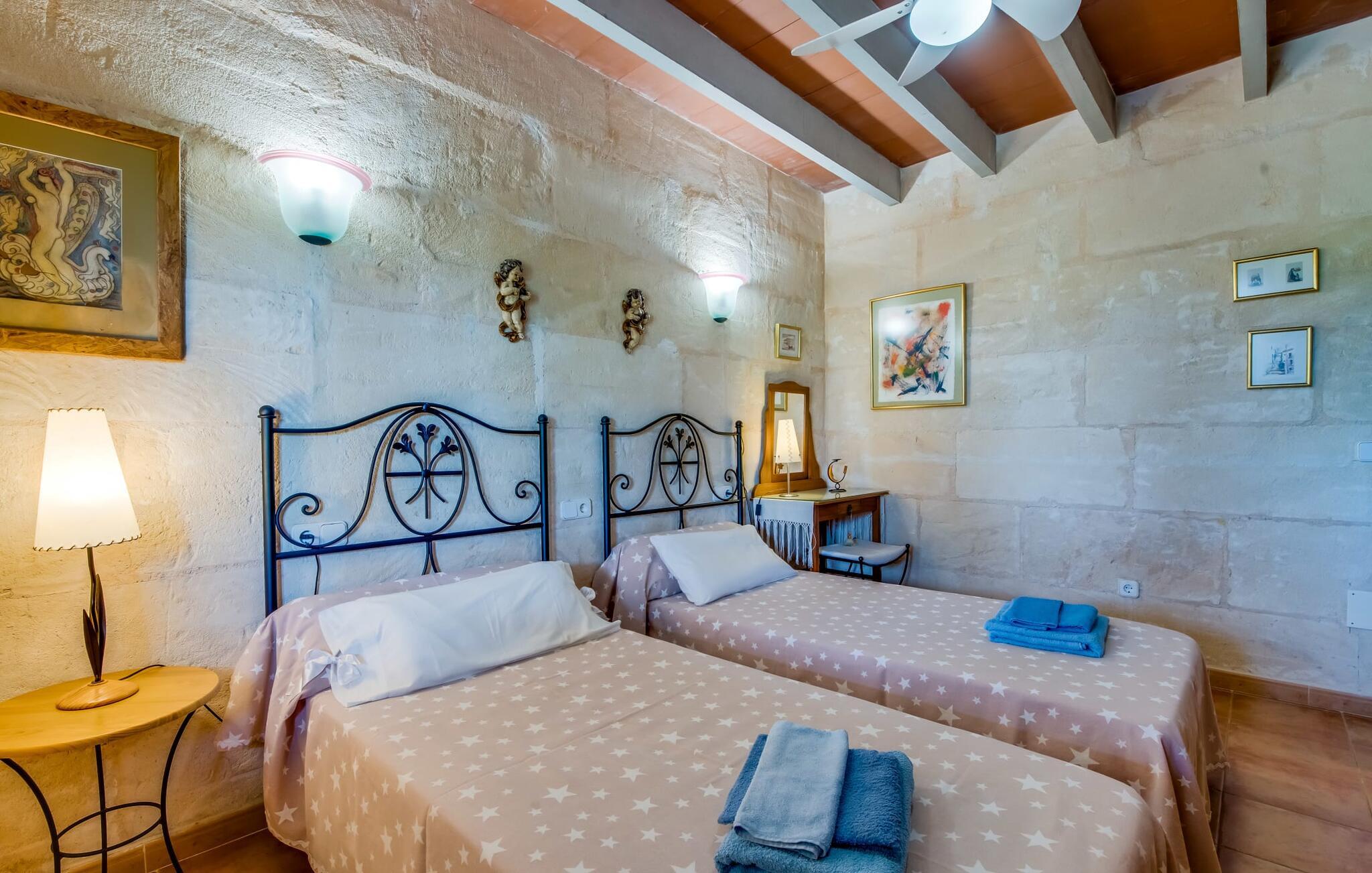 Fincaen "Comuna de Can Rius" er et charmerende feriehus i udkanten af landsbyen Muro på den nordlige del af Mallorca. Det fungerer som en fremragende base for at udforske øen, samtidig med at det giver et afslappende miljø. Ejendommen har forskellige terrasseområder og en balkon udstyret med et stort spisebord og komfortable liggestole, så gæsterne kan nyde både solrige og skyggefulde områder. Fincaen har en pool, der nyder godt af sydorientering og er derfor ideel til solbadning. Et udendørs køkken er tilgængeligt for dem, der ønsker at tilberede måltider, der kan nydes sammen under stjernerne. Den store grund er dekoreret med talrige træer, perfekt til afslappede gåture. Gæsterne kan bekvemt parkere deres lejebiler på gaden foran huset. Det indre af huset har et klassisk layout, forstærket af traditionelle mallorcanske møbler og moderne bekvemmeligheder, hvilket skaber en indbydende atmosfære. I stueetagen er der åbent indgangsparti, opholds- og spisestue samt soveværelse med badeværelse. Der er yderligere soveværelser ovenpå, hver med sit eget badeværelse, hvilket sikrer privatlivets fred for alle gæster. Samlet set tilbyder fincaen en blanding af komfort, stil og autenticitet, hvilket gør den til det ideelle valg til en ferie på Mallorca. Fincaen "Comuna de Can Rius" ligger i udkanten af Muro i en sydlig beliggenhed. Vejen, der blandt andet fører til den 11,4 km lange Alcúdia-bugt, kan høres akustisk afhængig af vindretningen. Butikker og restauranter ligger inden for gåafstand. El til opvarmning opkræves på stedet, kontant i vintermånederne.