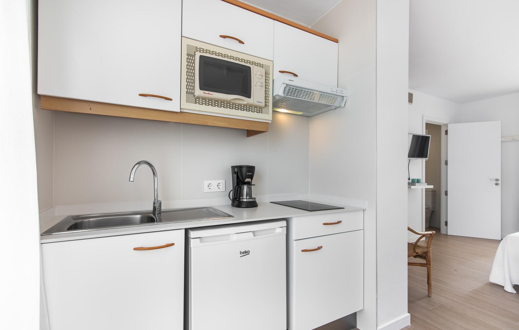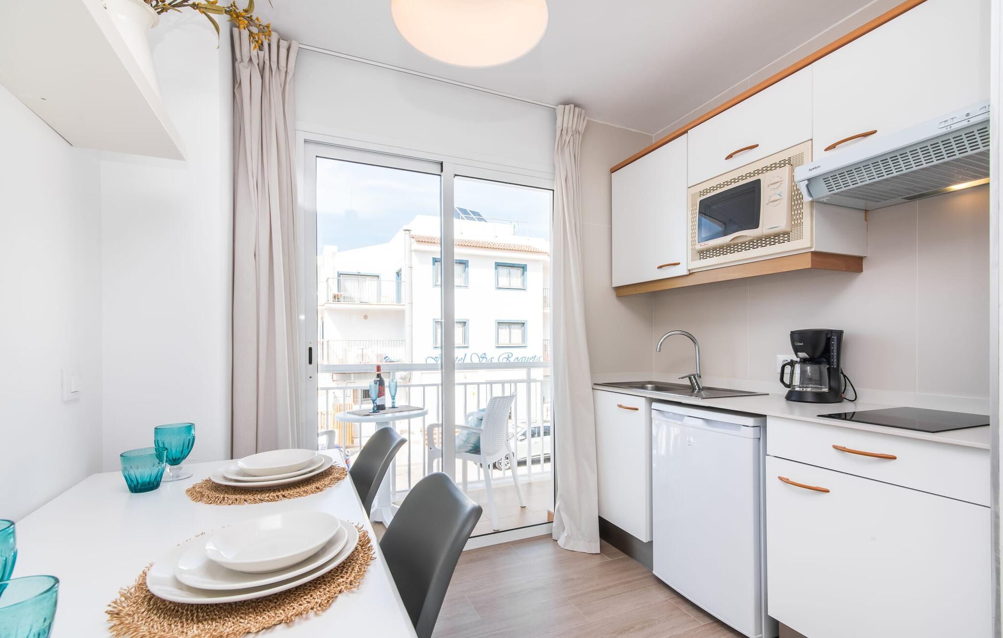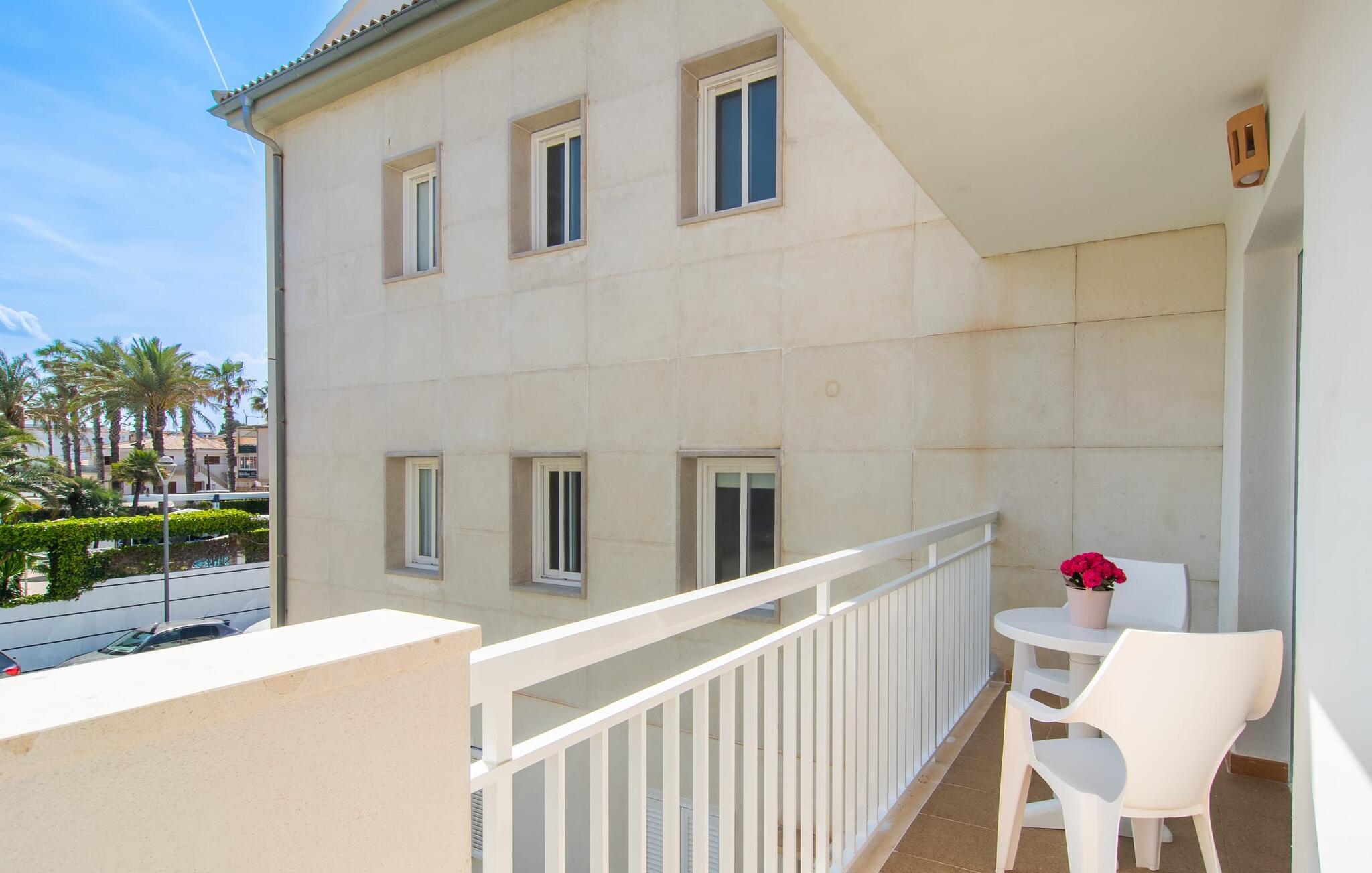 To venner eller et par, der ønsker at være tæt på stranden og have alle bekvemmeligheder inden for gåafstand, vil finde en behagelig flugt i denne smukke ferielejlighed på Mallorca. Fra den lille østvendte altan, hvor I kan få en skøn morgenmad for to ved solopgang, har I udsigt til stranden kun få skridt væk, det turkise hav og Victoria-halvøen i baggrunden. Havsiden er næsten lige ved jeres fødder. Takket være et sofistikeret rumkoncept byder ferielejligheden "Confluentia Playa 10" på en hyggelig opholdsstue med masser af naturligt lys. Det er i åbent plan og består af et velholdt sove- og spiseområde udstyret med tysk og engelsk satellit-tv og integreret køkken med direkte udgang til altan. Dette er et fantastisk sted at tilbringe tid sammen indendørs og ideelt til selvforplejning. Masser af hvidt og nogle farverige accenter skaber en frisk, sommerlig flair. Tilstedeværelsen af varme og aircondition sikrer perfekte indendørstemperaturer til enhver tid. Et smart, moderne badeværelse med brusekabine fuldender den indbydende boligkomfort i denne ferielejlighed for to på Mallorca. Den moderne ferielejlighed "Confluentia Playa 10" er beliggende nær centrum af Can Picafort i det nordlige Mallorca. I den mangfoldige landsby finder I restauranter, barer, diskoteker og adskillige indkøbsmuligheder. Sandstranden ligger inden for gåafstand, og Alcúdia-bugten ligger kun få meter væk. Området omkring Can Picafort er også ideelt til cykling.