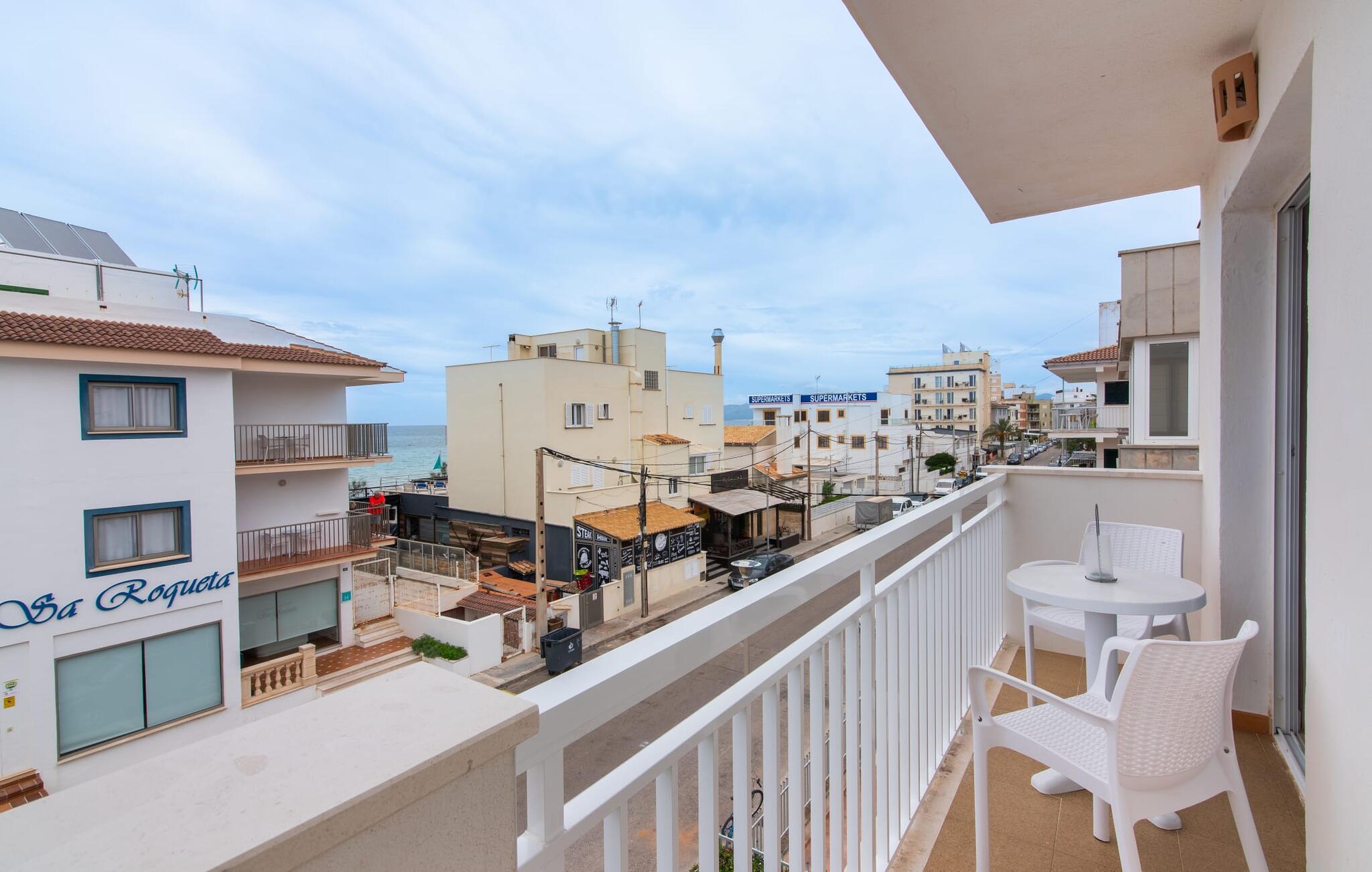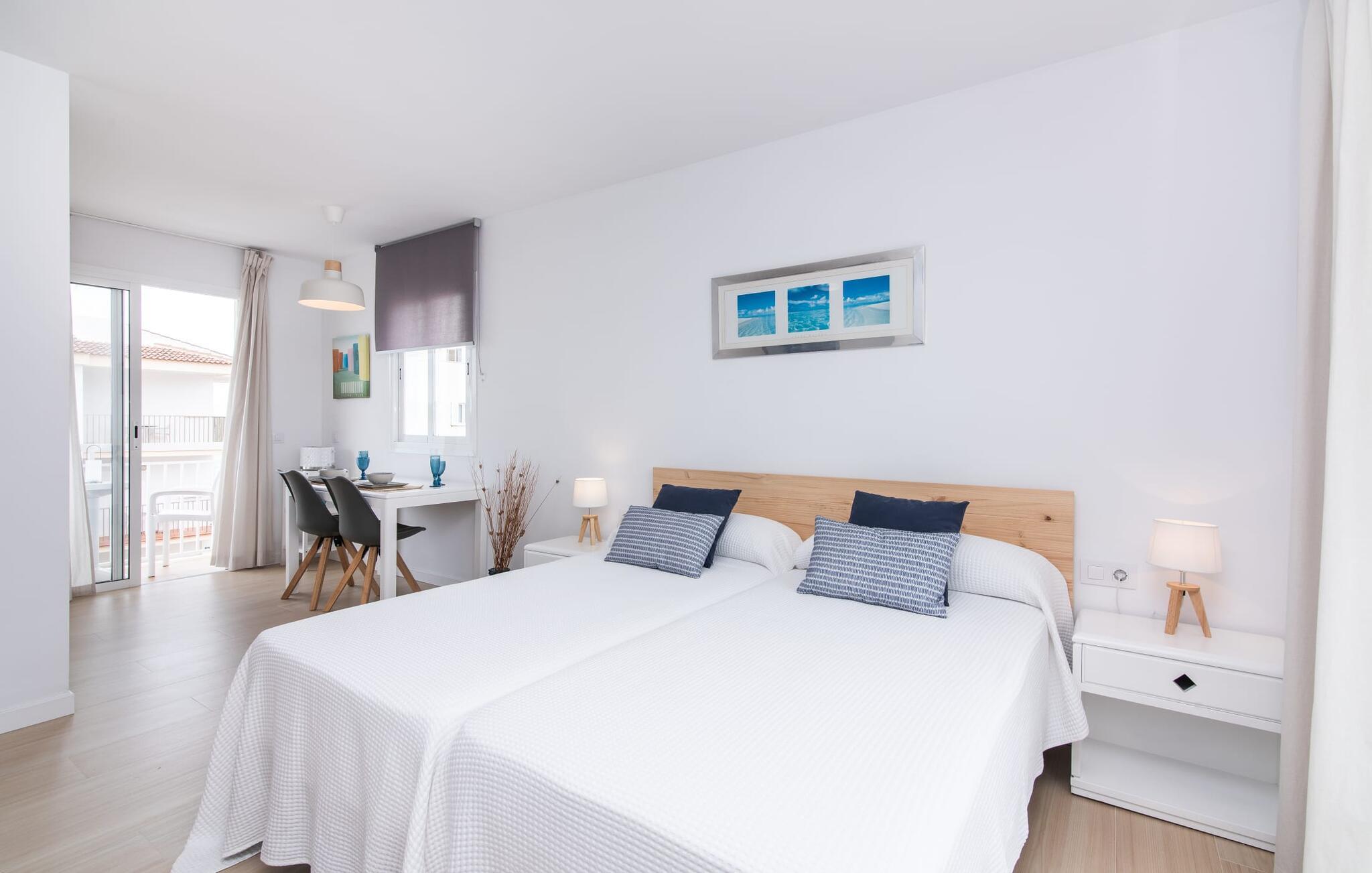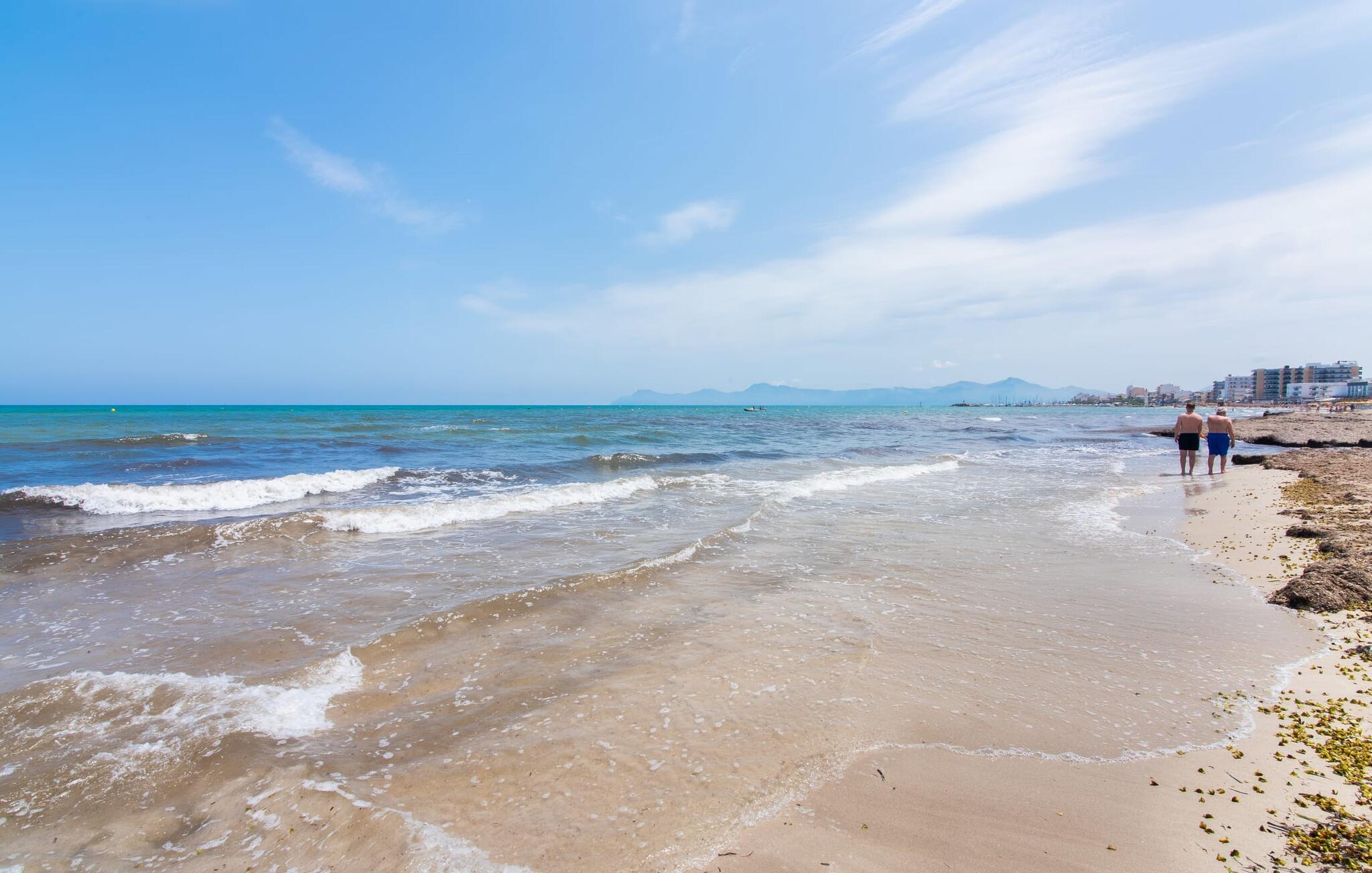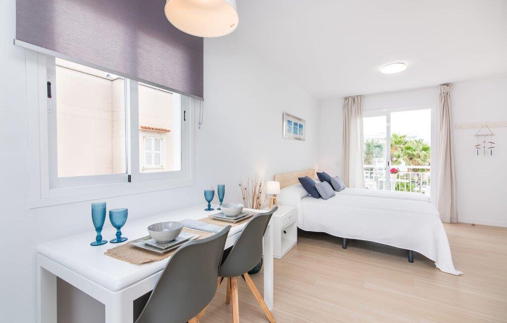 To venner eller et par, der ønsker at være tæt på stranden og have alle bekvemmeligheder inden for gåafstand, vil finde en behagelig flugt i denne smukke ferielejlighed på Mallorca. Fra den lille østvendte altan, hvor I kan få en skøn morgenmad for to ved solopgang, har I udsigt til stranden kun få skridt væk, det turkise hav og Victoria-halvøen i baggrunden. Havsiden er næsten lige ved jeres fødder. Takket være et sofistikeret rumkoncept byder ferielejligheden "Confluentia Playa 11" på en hyggelig opholdsstue med masser af naturligt lys. Det er i åbent plan og består af et velholdt sove- og spiseområde udstyret med tysk og engelsk satellit-tv og integreret køkken med direkte udgang til altan. Dette er et fantastisk sted at tilbringe tid sammen indendørs og ideelt til selvforplejning. Masser af hvidt og nogle farverige accenter skaber en frisk, sommerlig flair. Tilstedeværelsen af varme og aircondition sikrer perfekte indendørstemperaturer til enhver tid. Et smart, moderne badeværelse med brusekabine fuldender den indbydende boligkomfort i denne ferielejlighed for to på Mallorca. Den moderne ferielejlighed "Confluentia Playa 11" er beliggende nær centrum af Can Picafort på den nordlige del af Mallorca. I den mangfoldige by finder I restauranter, barer, diskoteker og talrige indkøbsmuligheder. Sandstranden ligger inden for gåafstand, og Alcúdia-bugten ligger kun få meter væk. Området omkring Can Picafort er også ideelt til cykling.