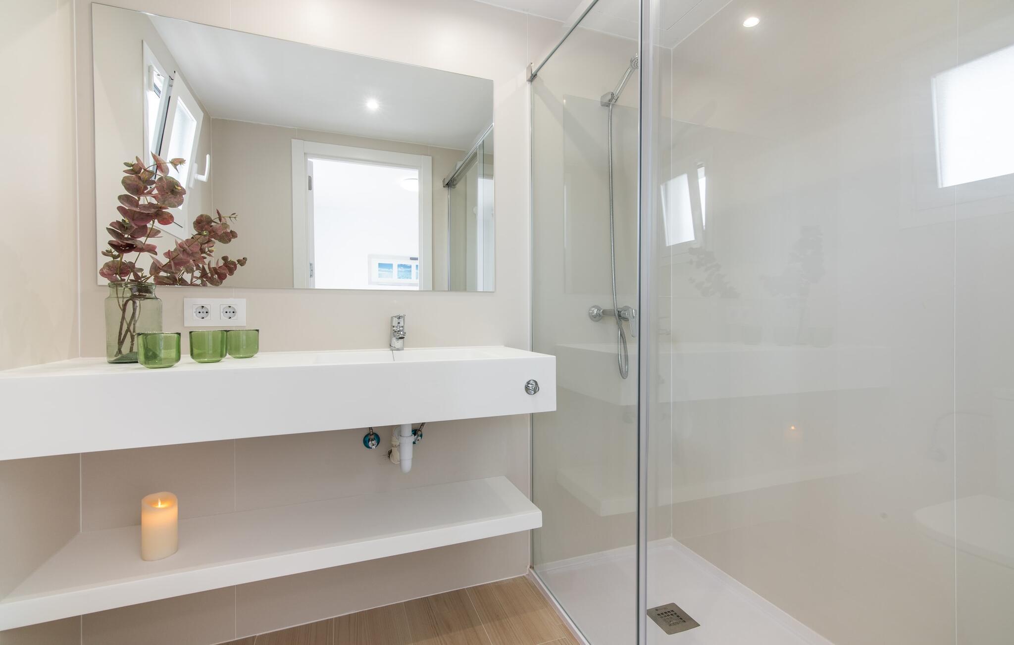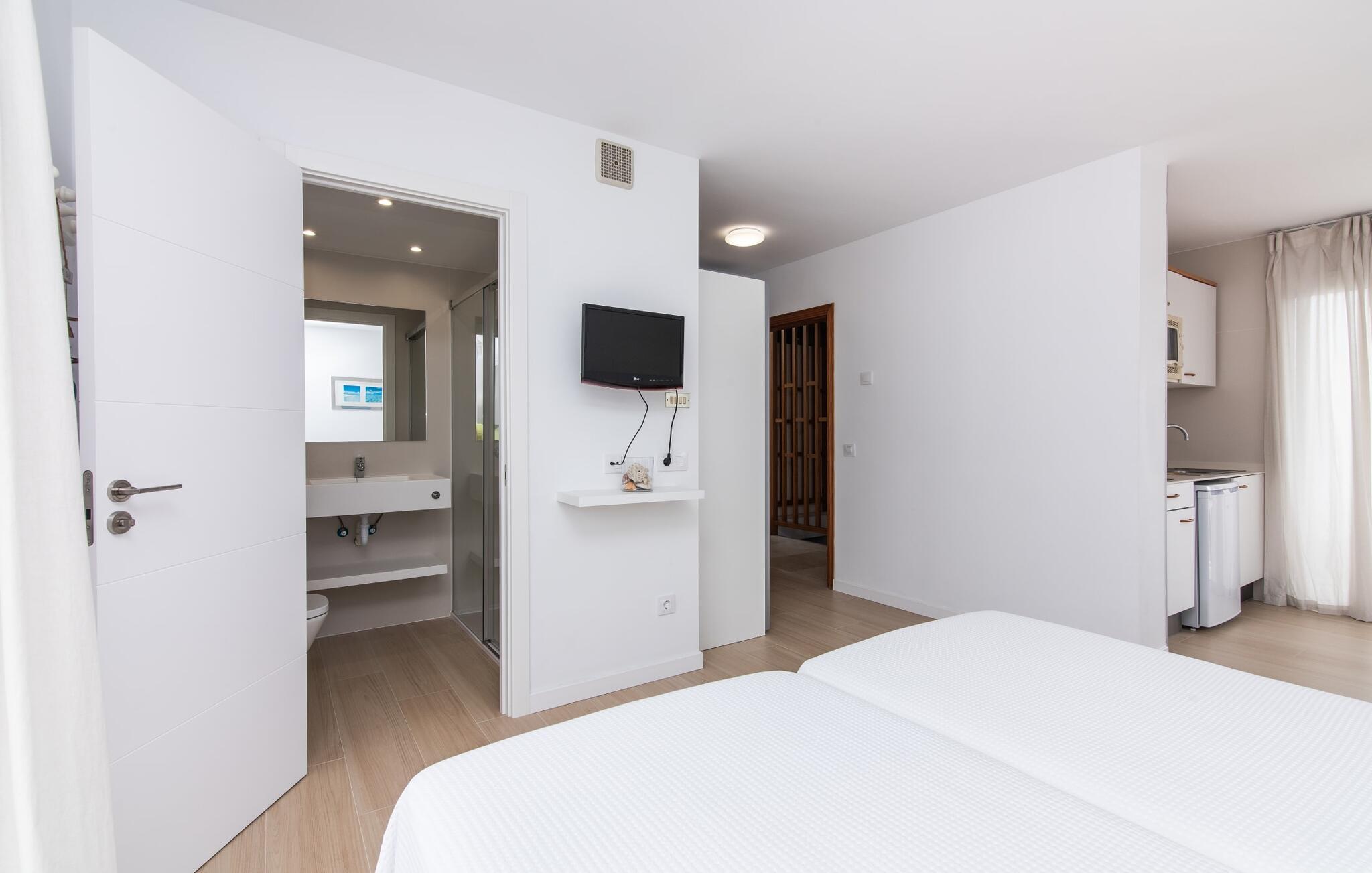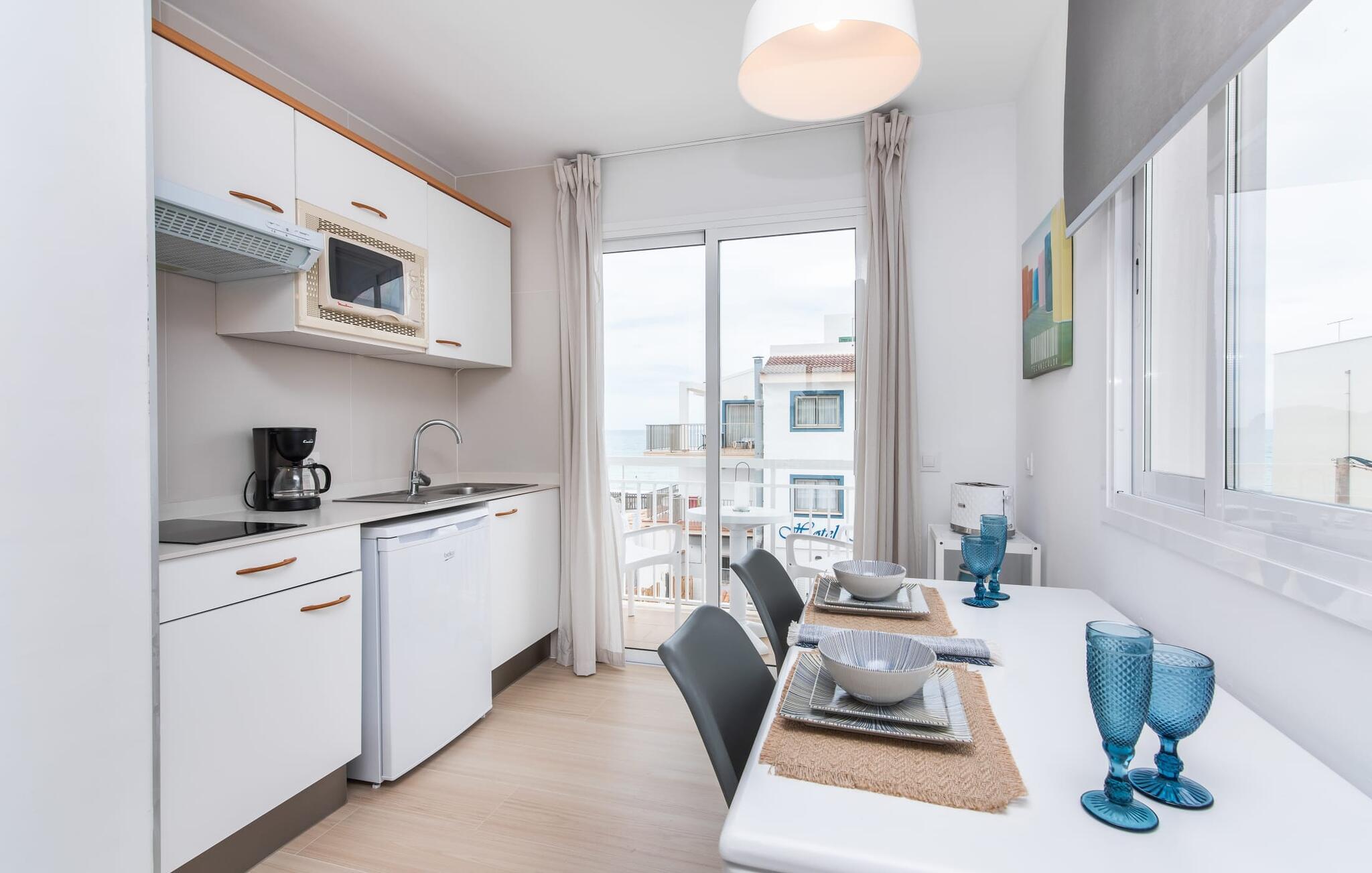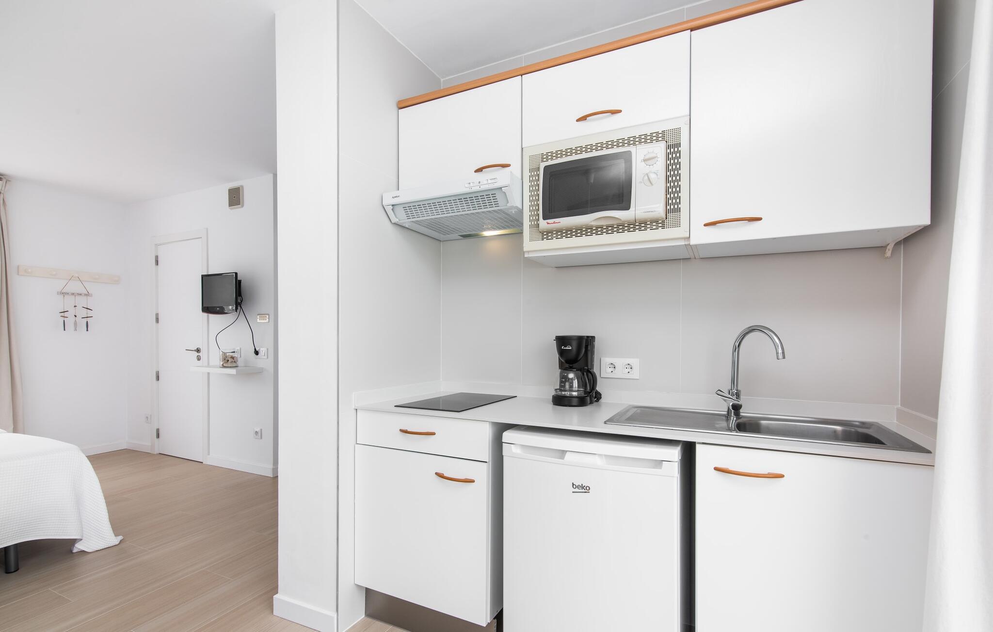 To venner eller et par, der ønsker at være tæt på stranden og have alle bekvemmeligheder inden for gåafstand, vil finde en behagelig flugt i denne smukke ferielejlighed på Mallorca. Fra den lille østvendte altan, hvor I kan få en skøn morgenmad for to ved solopgang, har I udsigt til stranden kun få skridt væk, det turkise hav og Victoria-halvøen i baggrunden. Havsiden er næsten lige ved jeres fødder. Takket være et sofistikeret rumkoncept byder ferielejligheden "Confluentia Playa 11" på en hyggelig opholdsstue med masser af naturligt lys. Det er i åbent plan og består af et velholdt sove- og spiseområde udstyret med tysk og engelsk satellit-tv og integreret køkken med direkte udgang til altan. Dette er et fantastisk sted at tilbringe tid sammen indendørs og ideelt til selvforplejning. Masser af hvidt og nogle farverige accenter skaber en frisk, sommerlig flair. Tilstedeværelsen af varme og aircondition sikrer perfekte indendørstemperaturer til enhver tid. Et smart, moderne badeværelse med brusekabine fuldender den indbydende boligkomfort i denne ferielejlighed for to på Mallorca. Den moderne ferielejlighed "Confluentia Playa 11" er beliggende nær centrum af Can Picafort på den nordlige del af Mallorca. I den mangfoldige by finder I restauranter, barer, diskoteker og talrige indkøbsmuligheder. Sandstranden ligger inden for gåafstand, og Alcúdia-bugten ligger kun få meter væk. Området omkring Can Picafort er også ideelt til cykling.