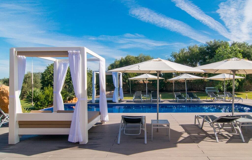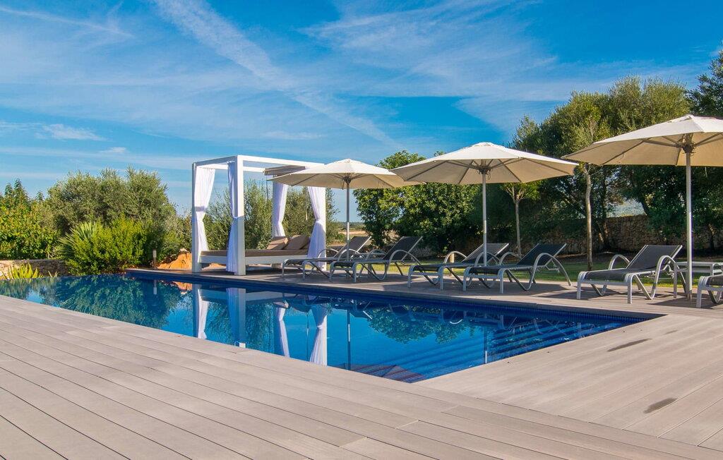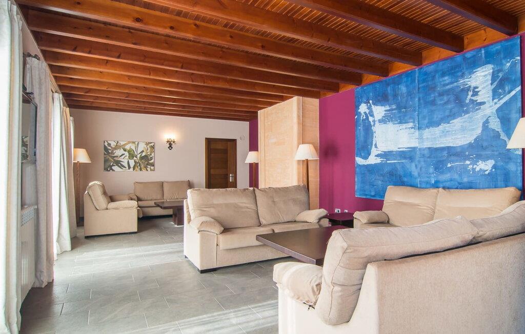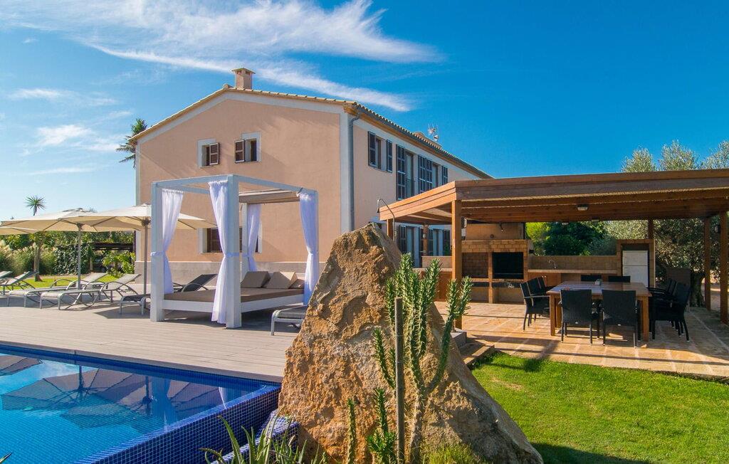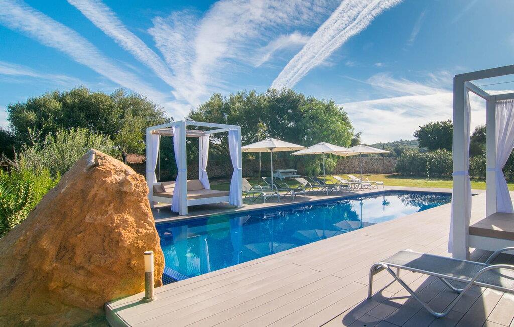 Denne luksuriøse villa "Conies Romani" er beliggende på en 20.000 m² stor grund mellem Manacor og Colonia Sant Pere og tilbyder ultimativ komfort i en fantastisk beliggenhed i udkanten af Son Cifre naturreservat. Villaen blev færdiggjort i 2010 og kombinerer moderne design med fuldstændig privatliv, omgivet af store terrasser, der fører til et afsondret poolområde. Poolen med komfortable indgangstrin er omgivet af en frodig græsplæne og modne træer og tilbyder et perfekt afslapningsrum. Slap af på den balinesiske seng eller liggestole, mens en parasol giver skygge, hvis det er nødvendigt. Et højdepunkt ved villaen er det overdækkede udekøkken med grill, køleskab og opvaskemaskine, som er perfekt til fællesspisning på lune aftener. Indenfor er den rummelige, airconditionerede opholdsstue med komfortable siddepladser, en pejs og moderne bekvemmeligheder. Det fuldt udstyrede køkken og den store spiseplads er velegnet til en ferie med egen forplejning. Villaen har seks stilfulde, airconditionerede, stilfuldt designede en-suite soveværelser, to i stueetagen. og fire luksuriøse suiter med dobbeltseng (1,80 x 2,00 m) og boblebad på øverste etage. Med centralvarme overalt sikrer villaen komfort hele året rundt. Villaen er beliggende i den naturligt smukke Son Cifre-region i den østlige del af Mallorca. Dette naturreservat strækker sig fra Artà til Manacor. Manacor ligger kun 4 km væk og byder på flere store supermarkeder samt nogle meget gode restauranter. Med en lejebil kan I hurtigt nå strandene i sydøst, herunder Cala Varquez, eller i nordøst, herunder Son Serra de Marina. Bugten Colonia de St. Pere, en lille søvnig fiskerlandsby, ligger kun 15 minutter væk i bil.