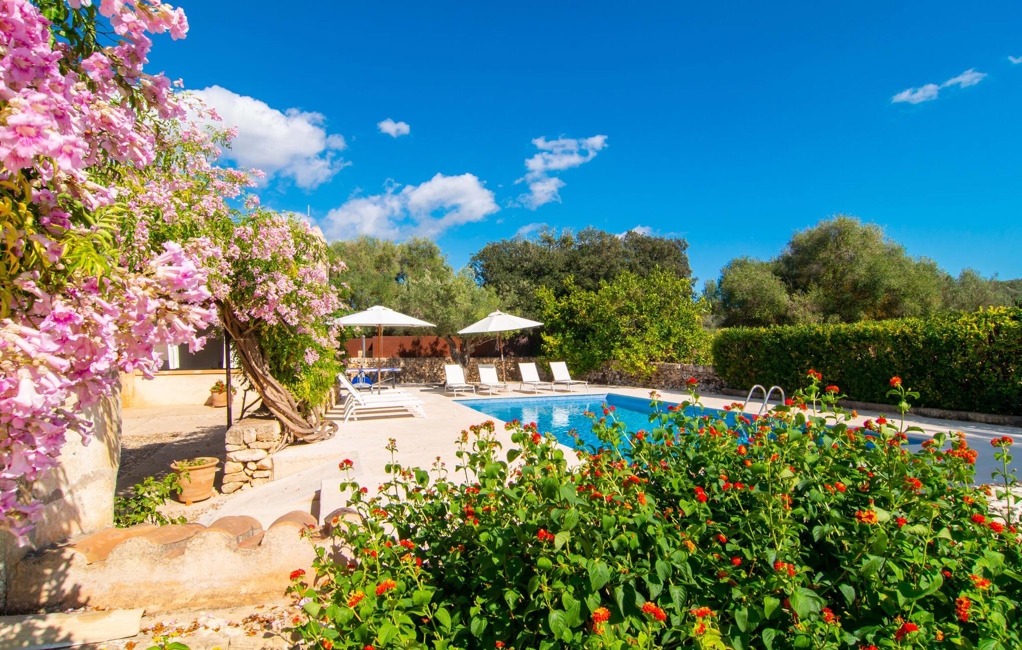 Langs den rustikke snoede sti mod Villa "Conies Vell" står det hurtigt klart, at der er tale om et virkelig elegant feriehus. Den rummelige, velholdte ejendom vil straks imponere dig, ligesom selve den herskabelige ejendom, der på mange sider er omgivet af brugbare terrasser og en idyllisk have. De høje palmer i den rummelige gårdhave samt de forskellige udendørs elementer, der er samlet omkring dette sted, er en sand fryd for øjet. Her venter en grøn græsplæne, som er et godt sted for små feriegæster at løbe rundt og lege. På den rummelige terrasse, der strækker sig over flere sider af huset, kan I nyde, hvad I vil, enten i det fri eller alternativt under det smukke, naturlige tag. Under de tætte vinstokke sidder du direkte ved huset og samtidig i umiddelbar nærhed af poolen, som du kan se evt. Et rundt spisebord med stole inviterer dig til at spise i en hyggelig atmosfære. Den åbne stue og spisestue i den lille tilstødende bygning er mindst lige så attraktiv. Her kan du slappe helt af i det helt afkølede sofahjørne eller sidde ved spisebordet. Det direkte tilstødende udendørs køkken og grill giver dig mulighed for at tilberede mad al fresco og tilbringe hele dagen udendørs i varmt vejr. Om aftenen er dette simpelthen et vidunderligt sted at afslutte en tilfredsstillende dag. Der er endda lys her! De sportsentusiaster blandt jer vil nyde at spille en eller to kampe på det mobile bordtennisbord, samt spille basketballkurven i gården. Et ord om poolen: Den 10 m lange pool er flisebelagt i en lys nuance af blå og varierer i dybden mellem 0,6 og 1,8 m. Den omkringliggende terrasse er udstyret med i alt otte komfortable liggestole, som du kan nyde solen på stråler af hjertens lyst nyde og samtidig komme dig fra en hektisk hverdag. To parasoller er tilgængelige, hvis det er nødvendigt for at beskytte dig mod stærke UV-stråler. Der er en parkeringsplads til din lejebil lige ved siden af bygningen. Og bag huset bor der et yndigt æsel i hans fold. Den større vej ligger 500 m fra villaen, men der er næsten ingen trafik. En spisestue indrettet i landlig stil, som er tilgængelig direkte fra husets terrasse, byder sine besøgende velkommen med et lyst og meget hjemligt præg. Dette værelse er indrettet både økonomisk og smagfuldt, så det behagelige indtryk af rummelighed og overskuelighed ikke er gået på kompromis på nogen måde. Hvide vægge og lofter, naturfarvede synlige bjælker og terracottafarvede gulvfliser skaber et meget harmonisk samspil, som suppleres af originale vintage-stykker og skaber en unik stemning. Gennem en bred bue kommer du ind i den hyggelige stue, hvor en munter, farverig sofa inviterer til afslapning. Det store fladskærms-tv med satellitforbindelse er tilgængeligt samt det lille musikanlæg og er til rådighed for gode underholdningsmuligheder. Du vil måske også fordybe dig i en god bog eller en god samtale. Køkkenet, som også er tilgængeligt fra spisestuen, er udstyret med alt hvad du behøver til daglige behov, herunder en kedel og en Nespresso/espressomaskine. Meget individuelt og drømmende designede soveværelser tilbyder ikke kun plads nok til alle, der rejser med dig, men tilbyder også noget for enhver smag og sikrer en afslappende søvn. Der er et separat soveværelse med badeværelse, som kun er tilgængeligt udefra og derfor giver en helt unik mulighed for at trække sig tilbage og finde ro. Generelt er badeværelserne rummelige og ikke kun praktiske, men også æstetisk designet. Hårtørrere og strygejern er til rådighed i huset, så du ikke behøver at bekymre dig om at tage din egen med hjemmefra. Myggenet er også tilgængelige for din komfort. Fra villaen kan du nå centrum af Manacor på få minutter i bil. Her kan du opleve det ugentlige marked hver mandag. Porto Cristo er omkring 16 kilometer væk. Der finder du flere store supermarkeder, hvoraf nogle endda har åbent på søndage og helligdage. Den maleriske promenade inviterer dig til at tage en afslappet spadseretur. Nogle nærliggende strande betragtes stadig som rigtige insidertips og er kendetegnet ved, at de er ubebyggede. Den rummelige villa "Conies Vell" har en charmerende landlig beliggenhed og er omgivet af en kæmpe grund. Et supermarked og et bageri ligger kun 5 minutter væk i bil. Den smukke bugt Cala Varques ligger omkring 17 kilometer væk. Andre strande såsom Cala Mandia ligger i samme afstand. Dette er et Fincallorca feriehus.