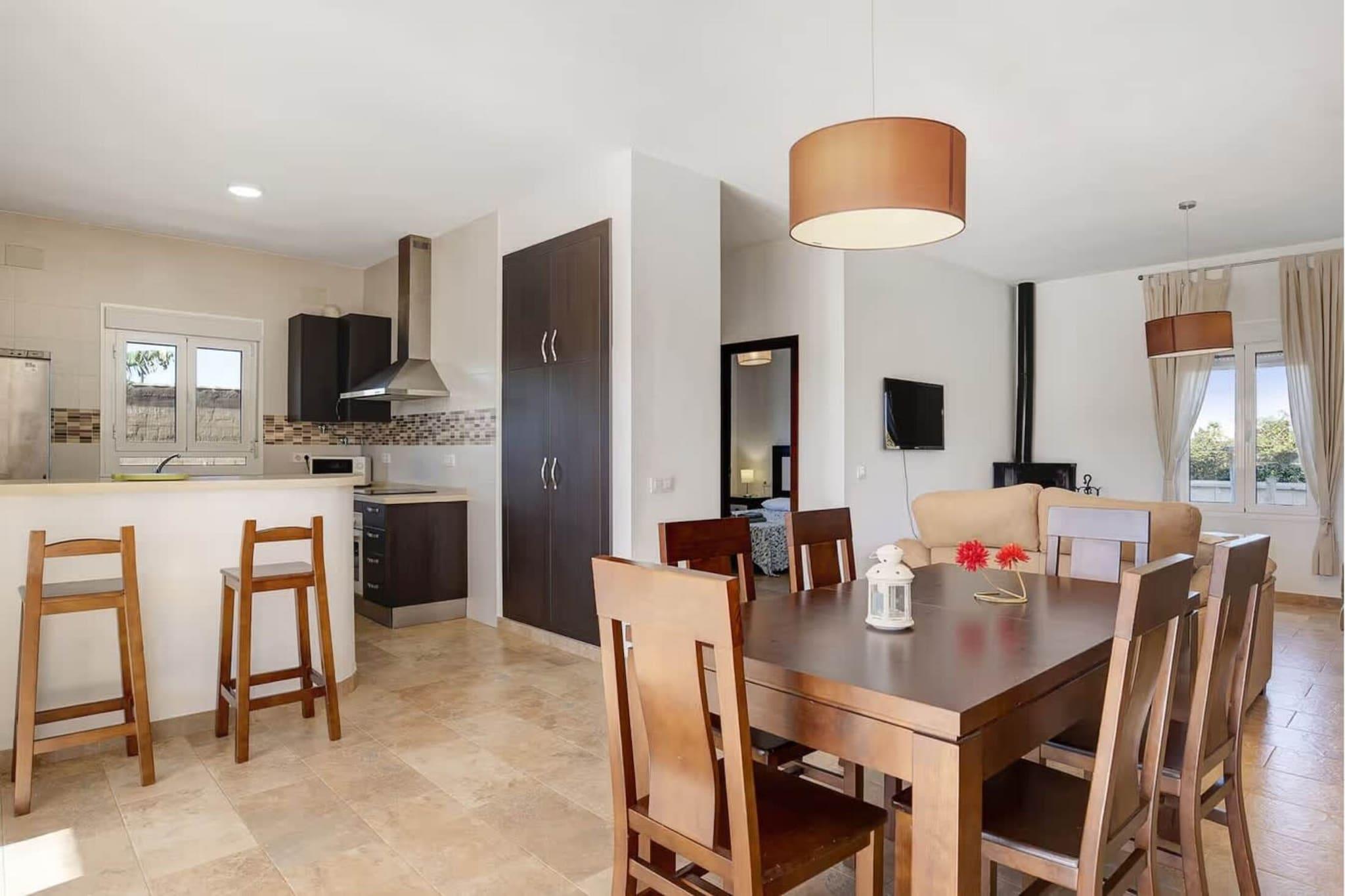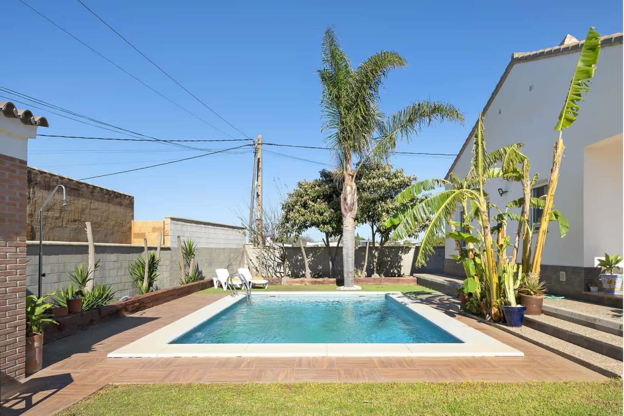 Denne moderne hytte ligger i et roligt område kun 8 minutter i bil fra Conil de la Frontera og tilbyder den perfekte blanding af privatliv og komfort. Med Puntalejo-stranden kun 10 minutter væk kan gæsterne nyde både fredelige omgivelser og hurtig adgang til kysten. Ejendommen er bygget i 2014 og er fuldt indhegnet, hvilket giver fremragende privatliv og sikkerhed under hele dit ophold. Udendørs har hytten en privat pool, en rummelig veranda med havemøbler, liggestole, en græsplæne og et grillområde – perfekt til afslappende dage under den andalusiske sol. Der er også privat parkering inden for den indhegnede ejendom for ekstra bekvemmelighed. Indendørs finder du en stilfuld åben stue, spiseplads og fuldt udstyret køkken med moderne apparater, herunder keramisk kogeplade, ovn, mikroovn, opvaskemaskine og vaskemaskine. Huset har tre komfortable soveværelser med indbyggede skabe og to badeværelser, alle indrettet til en høj standard. Kæledyr er velkomne, hvilket gør det til et godt valg for familier og grupper, der søger et rummeligt, veludstyret feriehus nær Conil og dens strande.