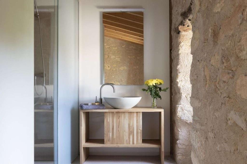 Ligefrem, moderne og alligevel så hyggeligt – det er fordelene ved denne finca i udkanten af Consell. Traditionelle mure af stenbrud kombineres med stilfulde, moderne møbler på to etager. I den nylige restaurering af dette gamle familiehjem er det lykkedes arkitekten at blande kvaliteterne fra gammelt og nyt til en atmosfærisk enhed. Den slående belysning, der skaber en virkelig hyggelig atmosfære, er særligt slående. De cirka 430 kvadratmeter har komfortabel plads til 10 gæster. De fem dobbeltværelser, hver med aircondition og eget badeværelse, sikrer behagelige og afslappende nætter. Fire af disse er placeret på øverste etage, mens to gæster kan gøre det behageligt i det femte soveværelse i stueetagen. Stueetagen byder også på en rummelig stue med et åbent, sammenhængende køkken og et kontorområde til dem, der søger afslapning. Her kan I lave mad sammen, spille spil, snakke i fred eller se film.