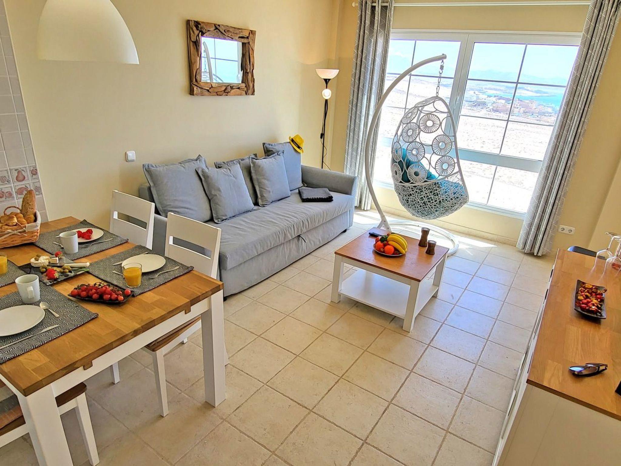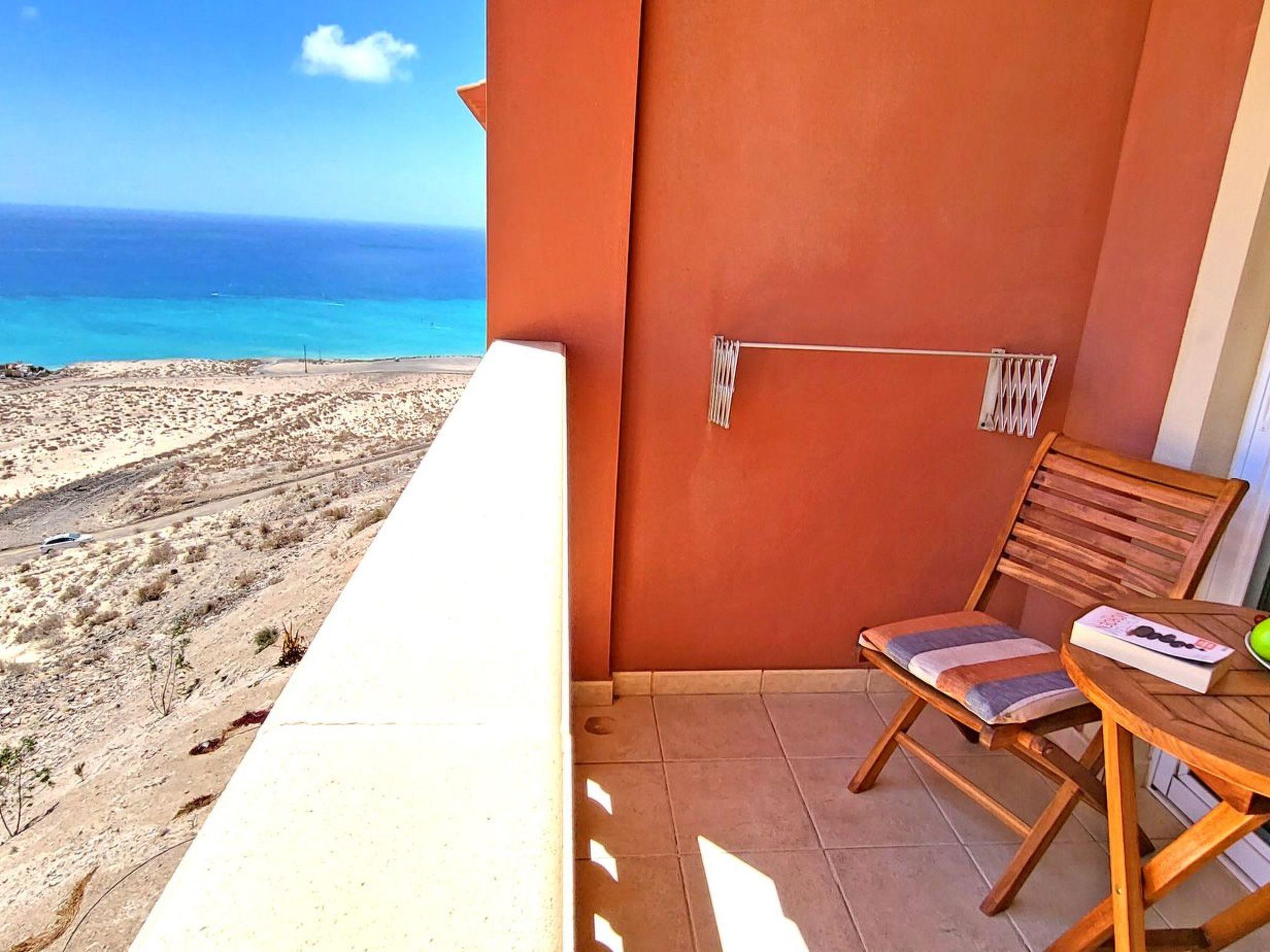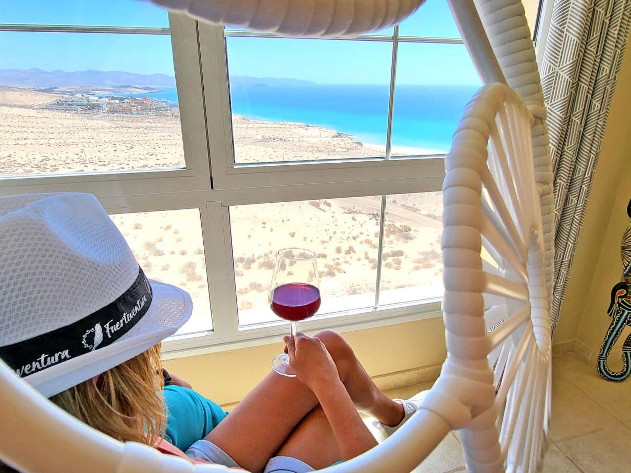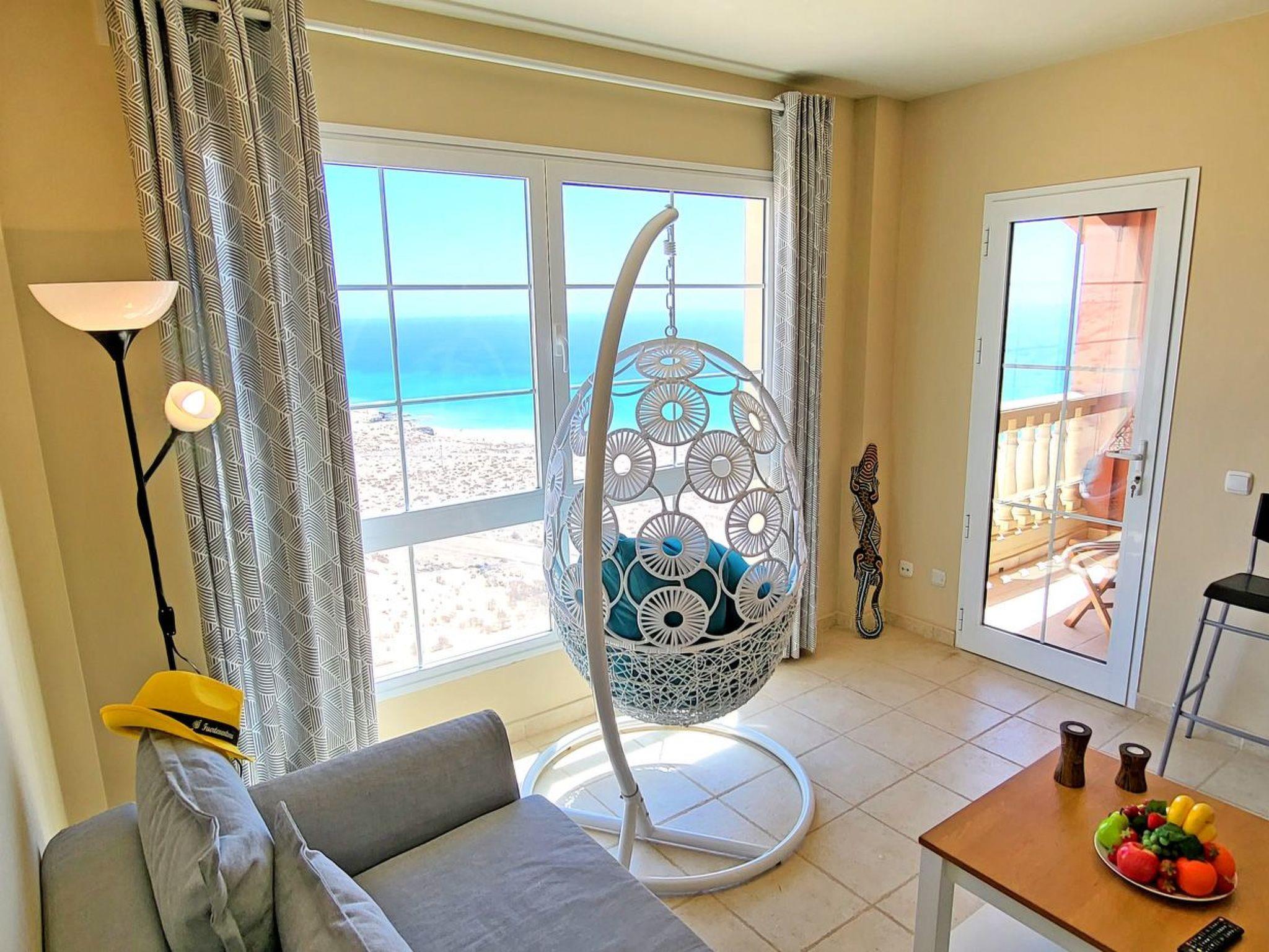 The highlight of the flat is the balcony with breathtaking panoramic views of the turquoise ocean, the sandy beach SOTAVENTO, the magnificent view of the mountains and the town of Costa Calma, which you can enjoy not only from the balcony, but thanks to the large windows in the living room, even during a cosy breakfast at the table, while relaxing on the couch or on the beautiful hanging chair right in front of the window.