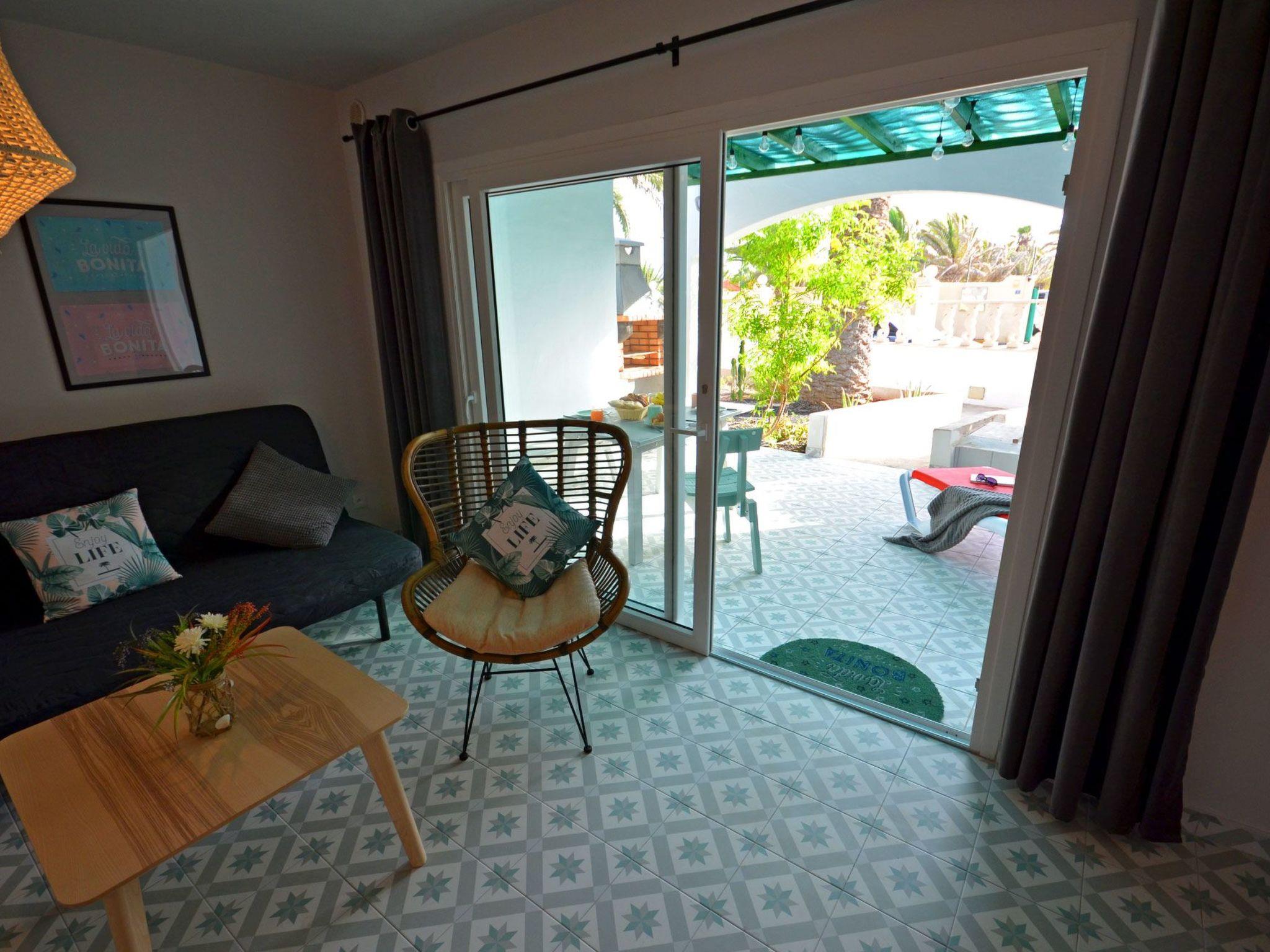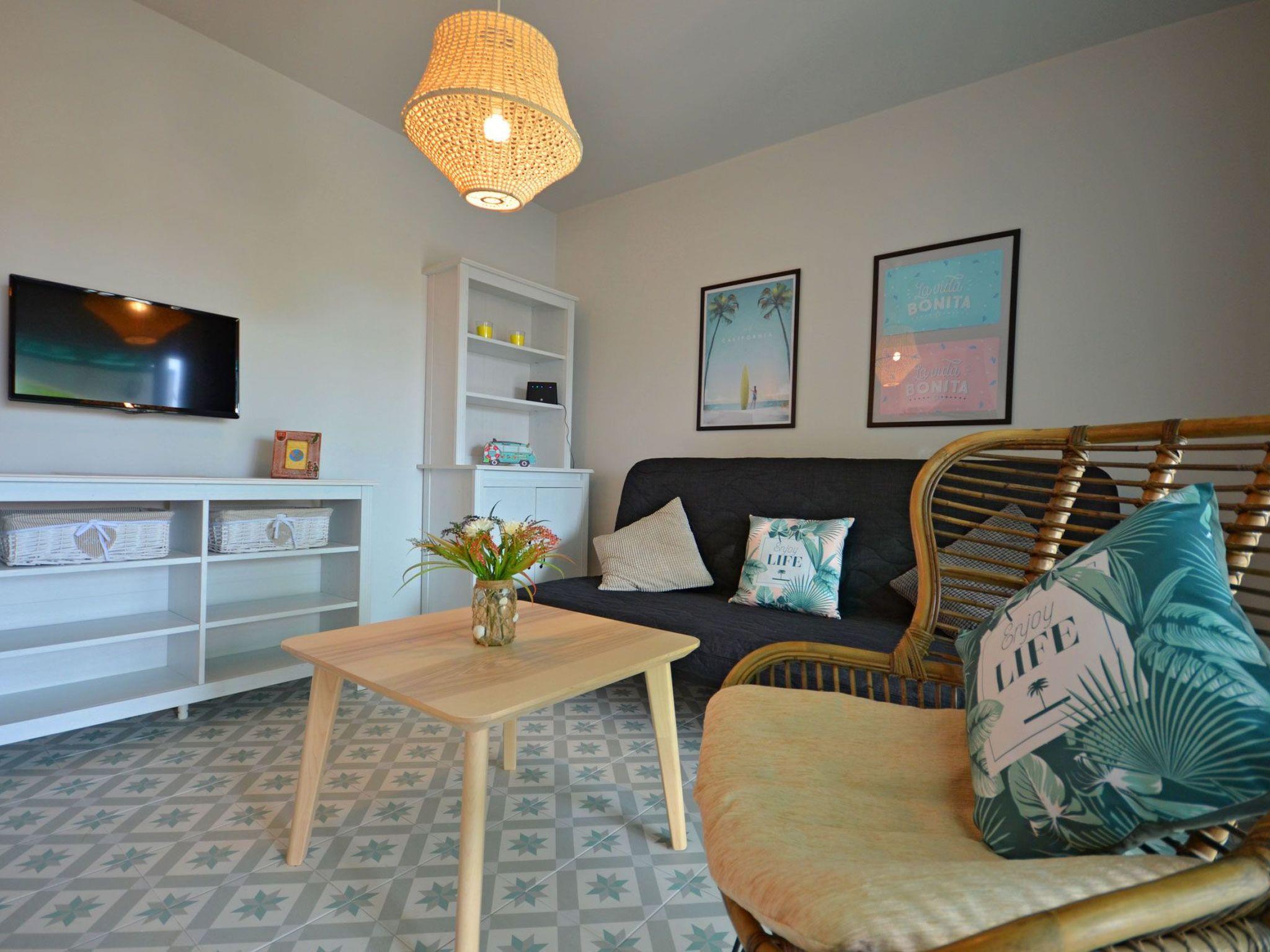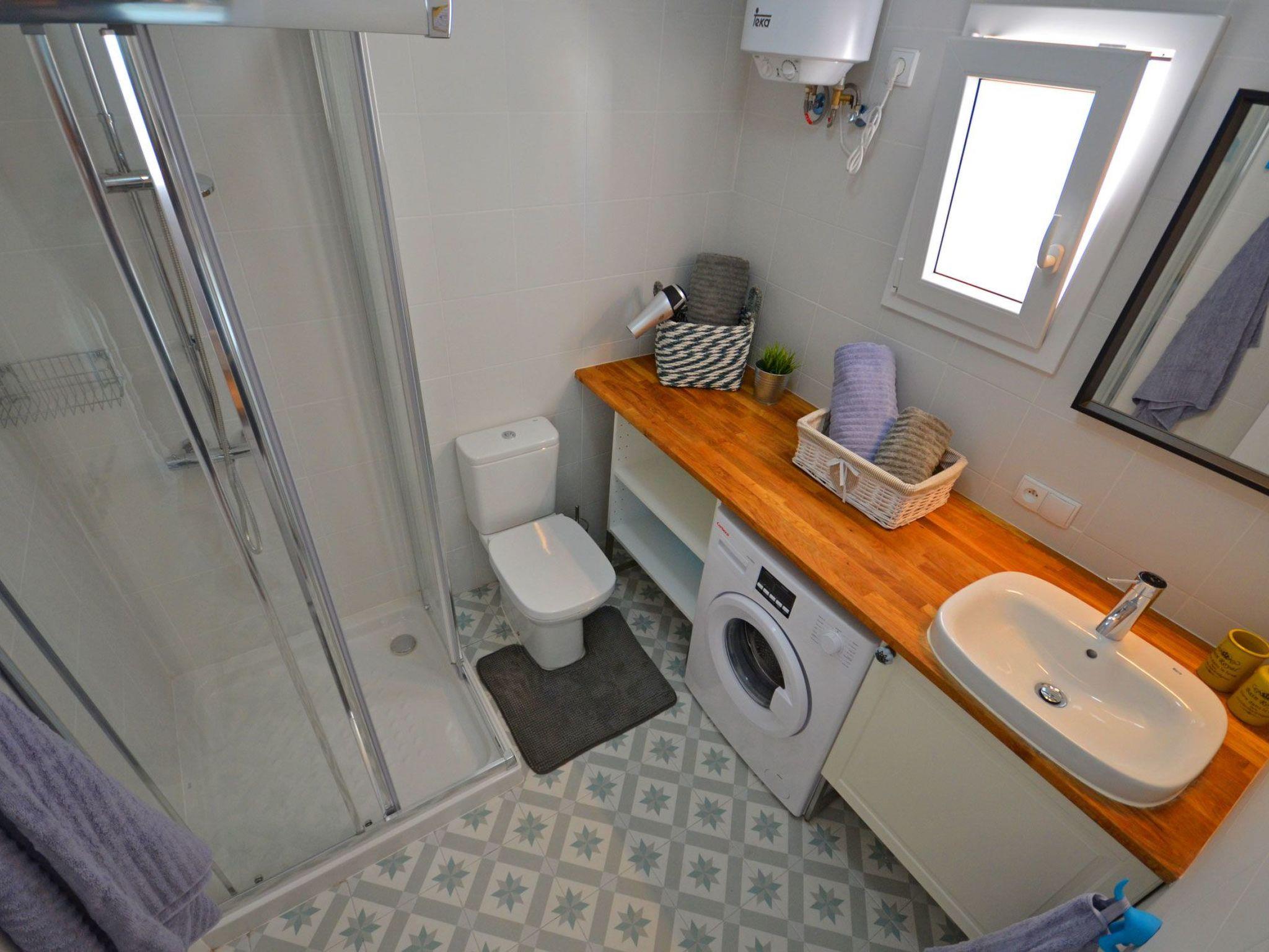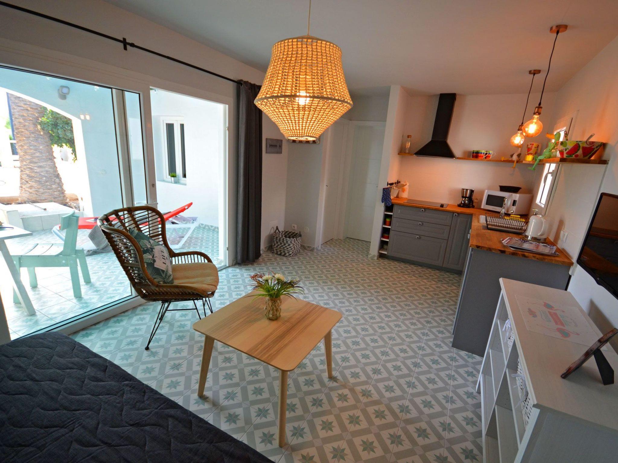 Modern and at the same time cozy apartment for a maximum of 4 people in a quiet location, with terrace, community pool, lots of green and very close to the center.The apartment has an open living room with an open kitchen, a large bathroom with shower, a bedroom and a terrace.Just a few meters further is the communal pool with sun loungers, which invites you to sunbathe together as well as to play and swim.The apartment itself is modern and at the same time comfortably furnished, bright and pleasant.The living room contains a fold-out sofa bed for 2 people. The kitchen has everything you need for everyday use, be it cutlery, pots, cups or other cooking utensils. The kitchen is also equipped with a stove, oven, refrigerator, coffee maker and toaster. The bathroom, which offers a lot of space, has a sink, toilet, shower and is also equipped with a washing machine. The bedroom with window has a double bed 1.60 m, a wardrobe with plenty of storage space and two bedside cabinets.Thanks to the large window / patio door in the living room, it is bright and pleasant, so you can look through it onto the terrace and go out, where you can comfortably enjoy the day.DISTANCES: