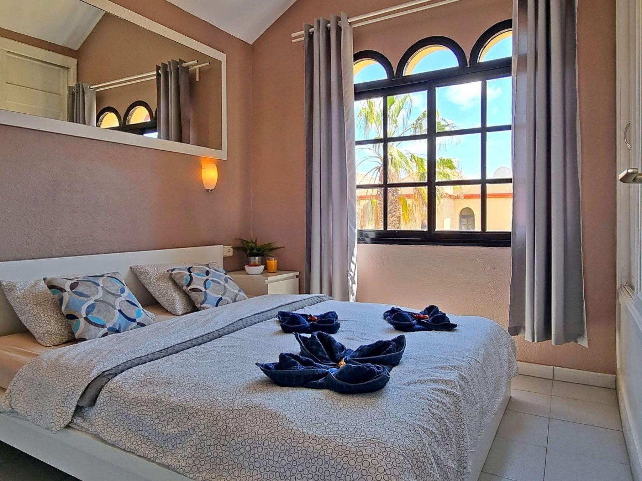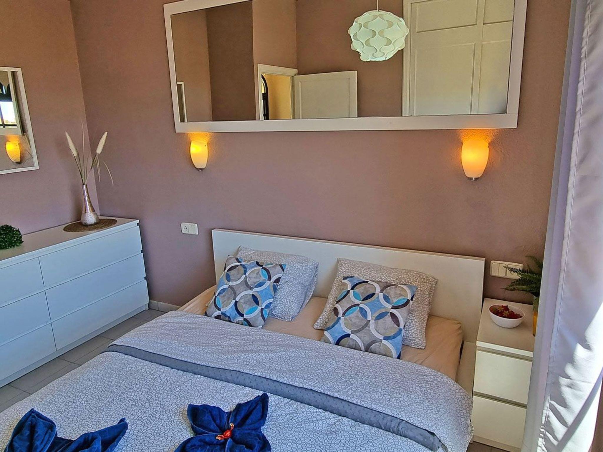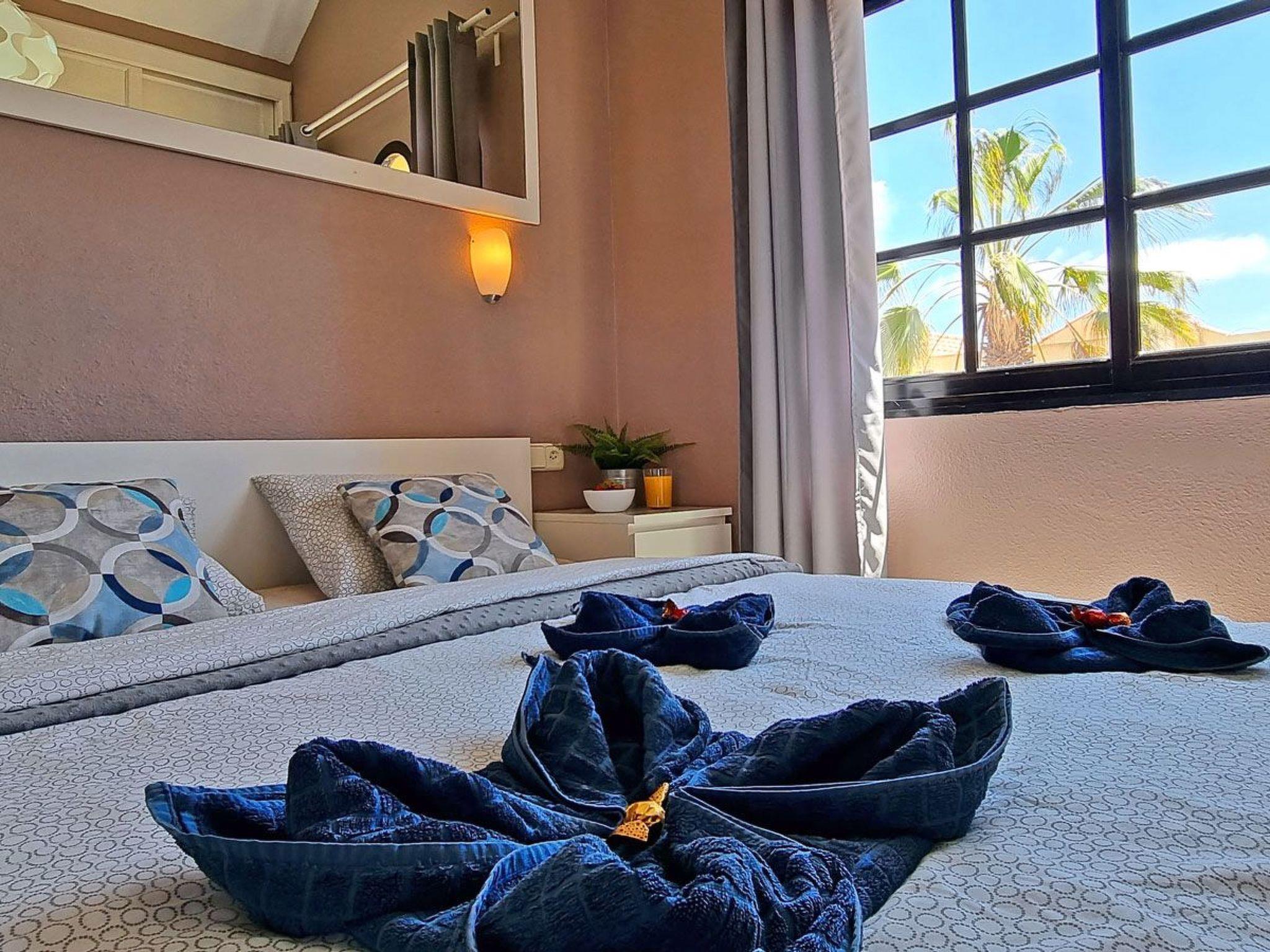 The 2-storey flat for max. 4 people is a modern and cosily furnished terraced bungalow in a quiet residential complex on Costa Calma, Fuerteventura. Downstairs there is a living room with an open-plan kitchenette and dining area, as well as direct access to the terrace. The stairs lead upstairs to the bedroom with double bed and the bathroom with bathtub, washbasin, toilet and window. The entire flat is fully furnished and equipped with all the useful things you need for everyday life, such as bed linen, towels, cutlery, cooking utensils, plates, cups and glasses. In the bedroom you will find a double bed, a large chest of drawers and a large wardrobe. In the kitchen you will find a fridge, kettle, coffee machine, cooker and microwave. In the open-plan living area there is space for a dining area, sofa bed, coffee table and TV. The terrace is also equipped with a table, seating and a tumble dryer. In fact, you have everything you need to feel almost at home.bedroom: