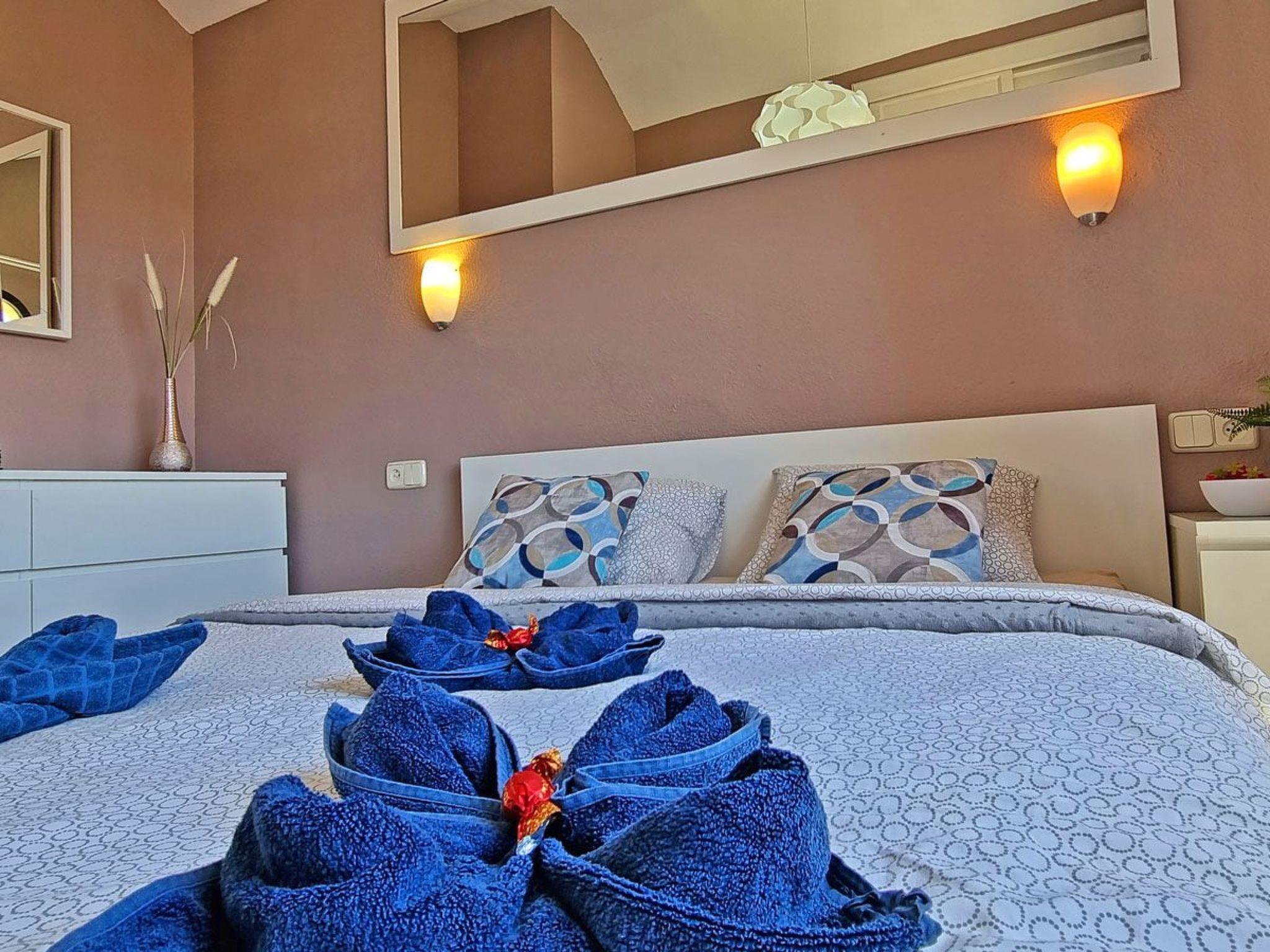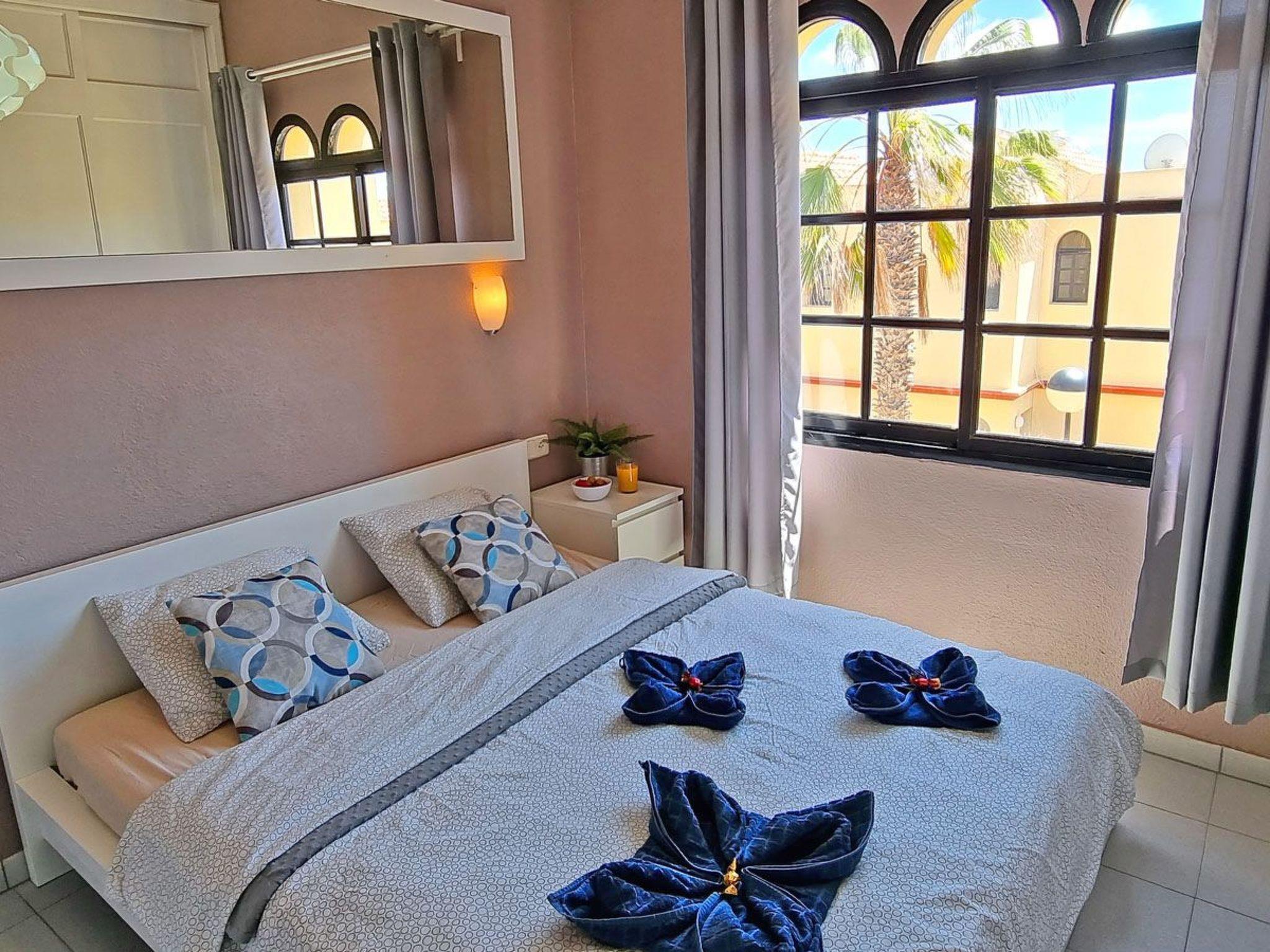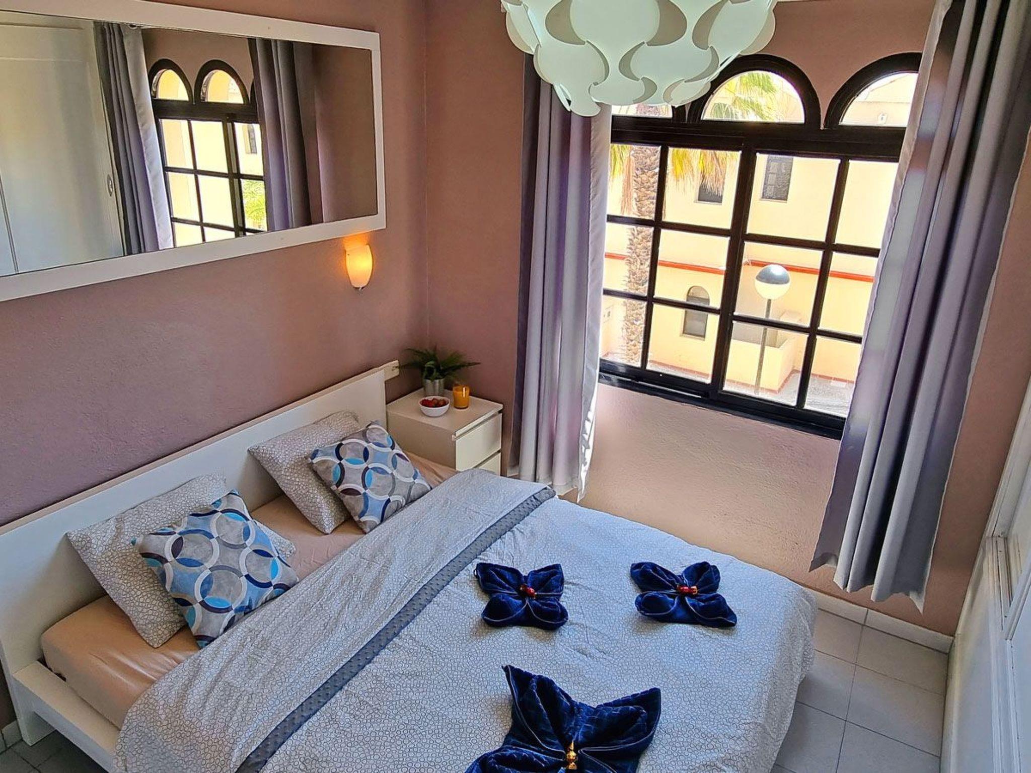 The 2-storey flat for max. 4 people is a modern and cosily furnished terraced bungalow in a quiet residential complex on Costa Calma, Fuerteventura. Downstairs there is a living room with an open-plan kitchenette and dining area, as well as direct access to the terrace. The stairs lead upstairs to the bedroom with double bed and the bathroom with bathtub, washbasin, toilet and window. The entire flat is fully furnished and equipped with all the useful things you need for everyday life, such as bed linen, towels, cutlery, cooking utensils, plates, cups and glasses. In the bedroom you will find a double bed, a large chest of drawers and a large wardrobe. In the kitchen you will find a fridge, kettle, coffee machine, cooker and microwave. In the open-plan living area there is space for a dining area, sofa bed, coffee table and TV. The terrace is also equipped with a table, seating and a tumble dryer. In fact, you have everything you need to feel almost at home.bedroom: