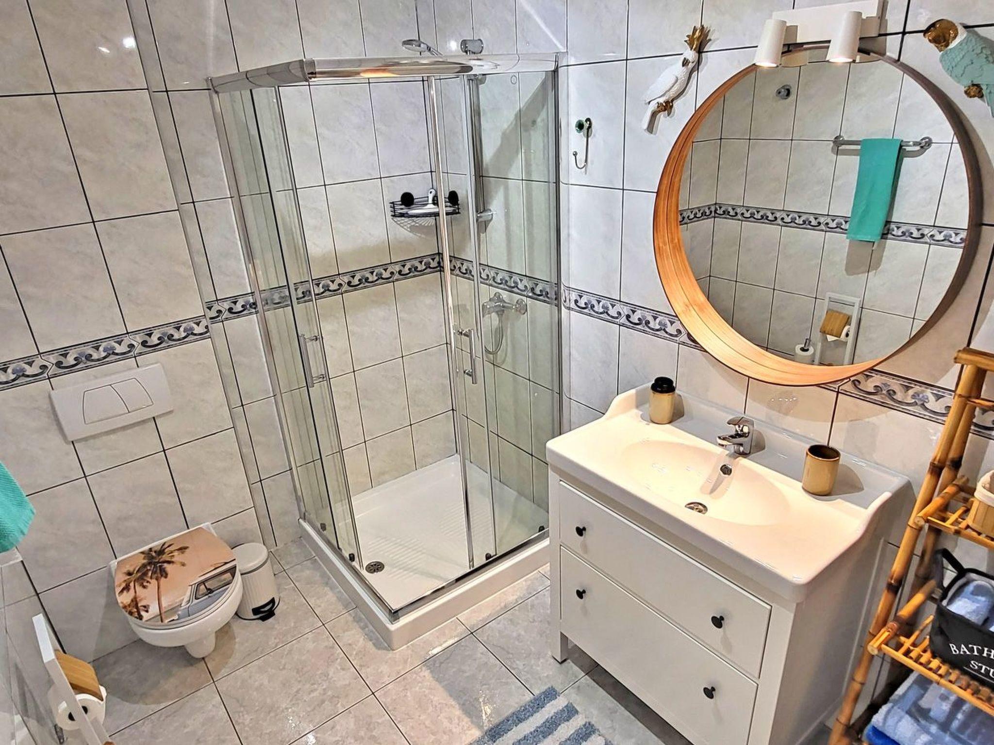 In the living room there is a comfortable pull-out sofa bed for 2 people, with an open-plan kitchen and dining area. The kitchen is equipped with everything you need for everyday use, and many small details create a pleasant ambience to make you feel right at home. The bright bathroom has a shower, washbasin and toilet.
