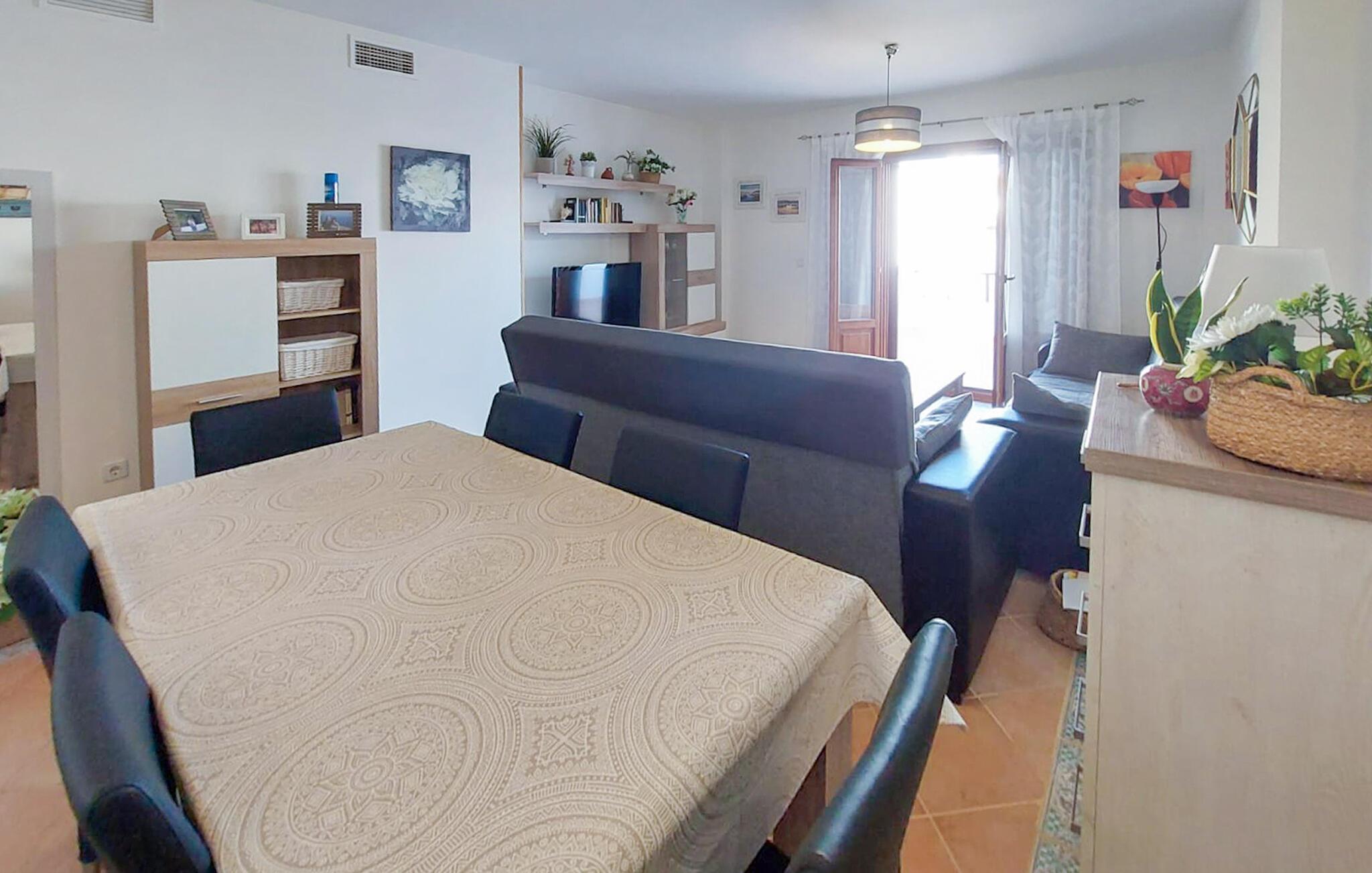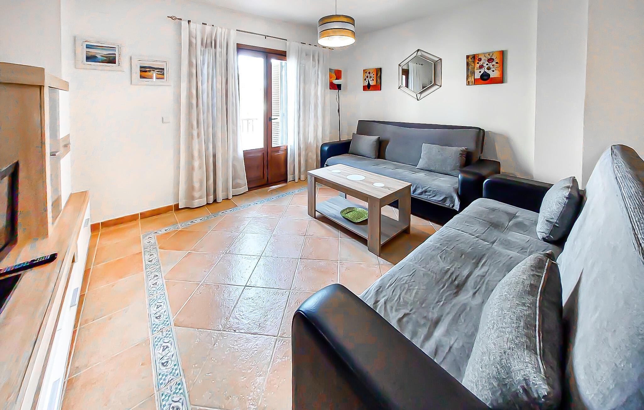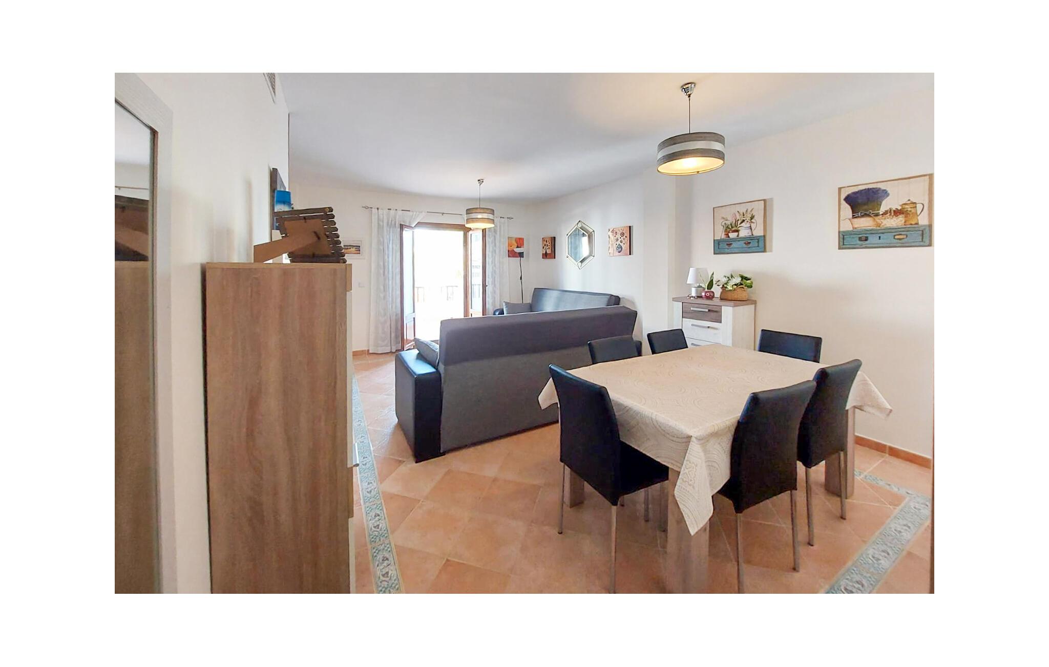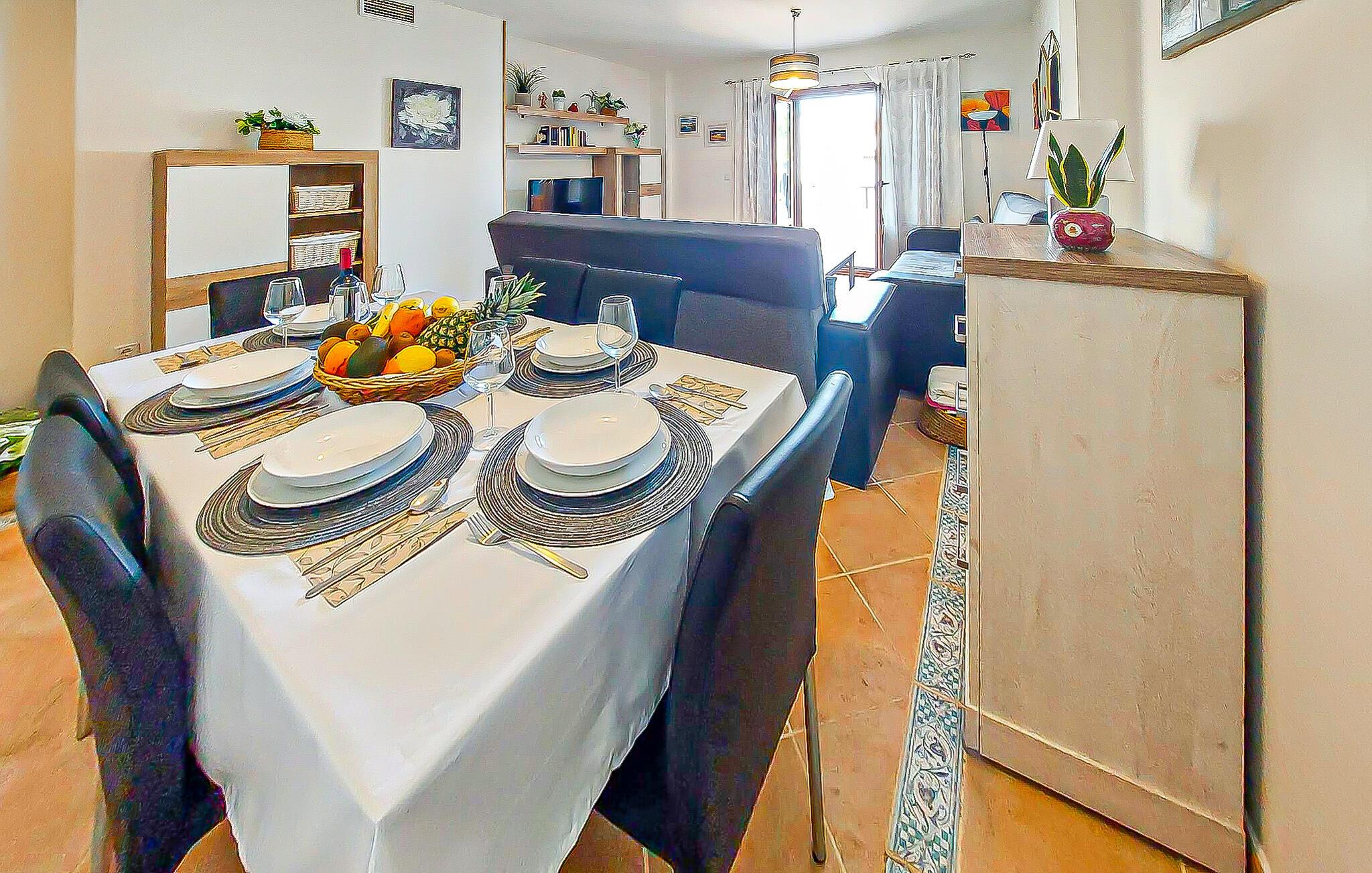 Denne rummelige lejlighed er ideel til at tilbringe solrige dage med venner eller familie. Føl jer hjemme i det smagfuldt møblerede interiør, planlæg jeres aktiviteter over afslappede måltider og slap af efter en lang dag med en spændende serie på den komfortable sofa.