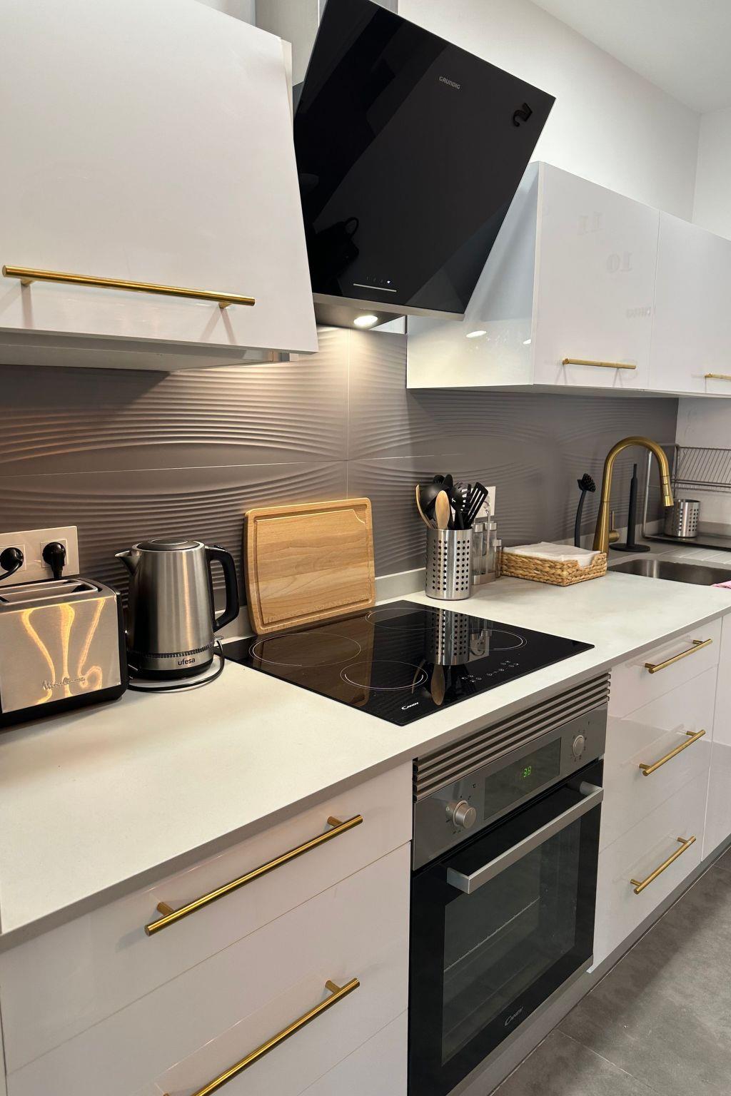 The kitchen, adjacent to the living room, is fully equipped: