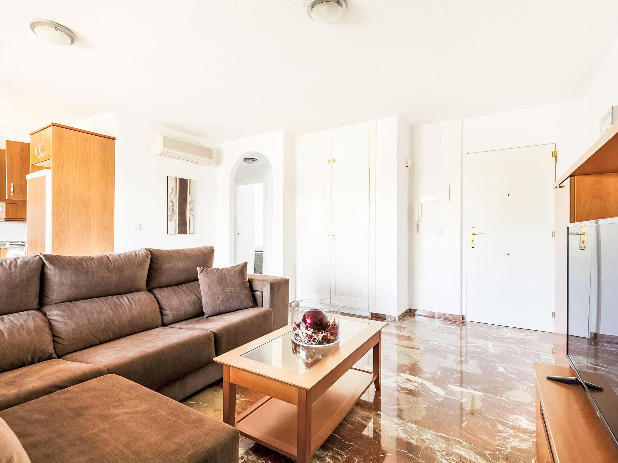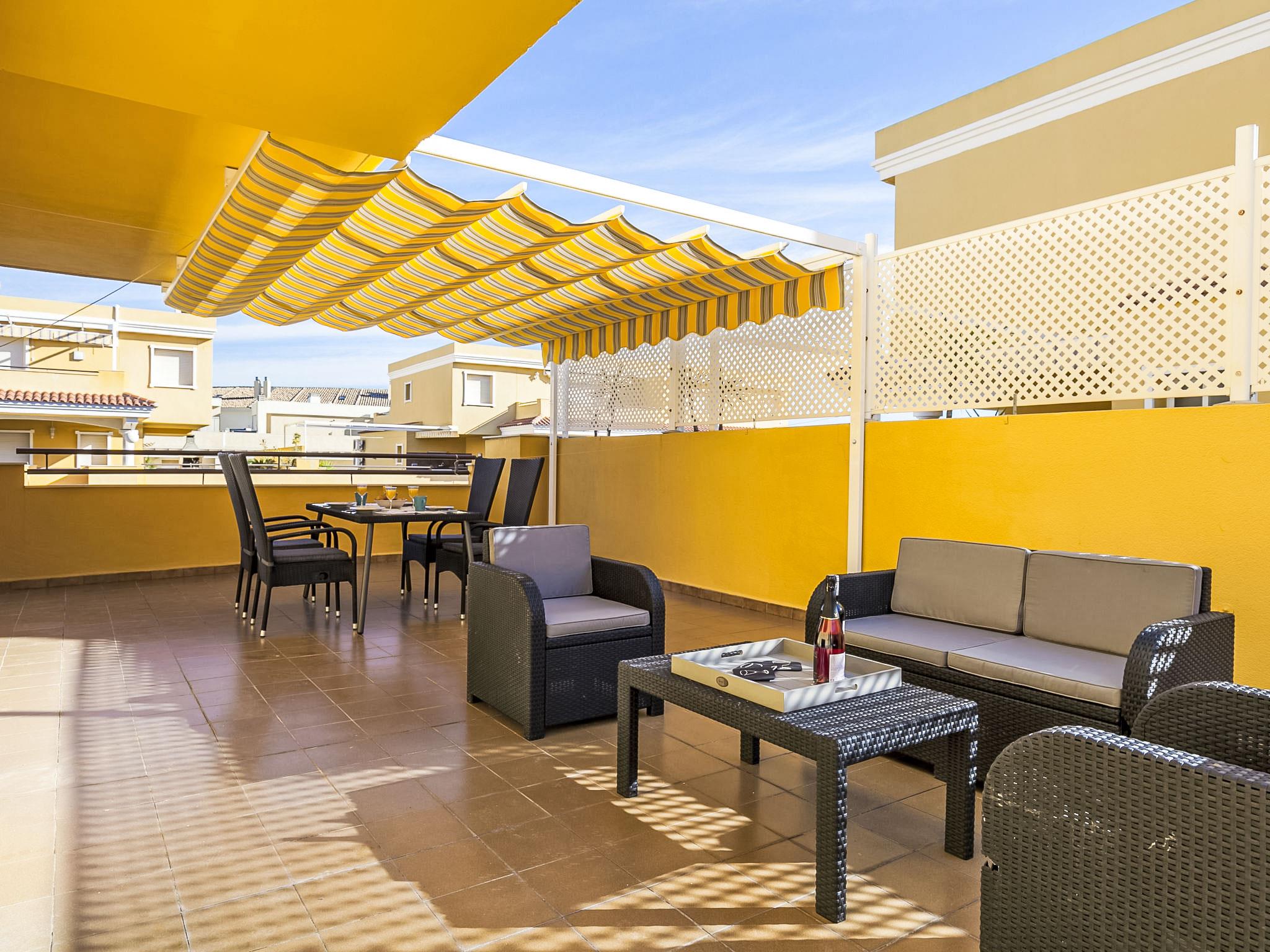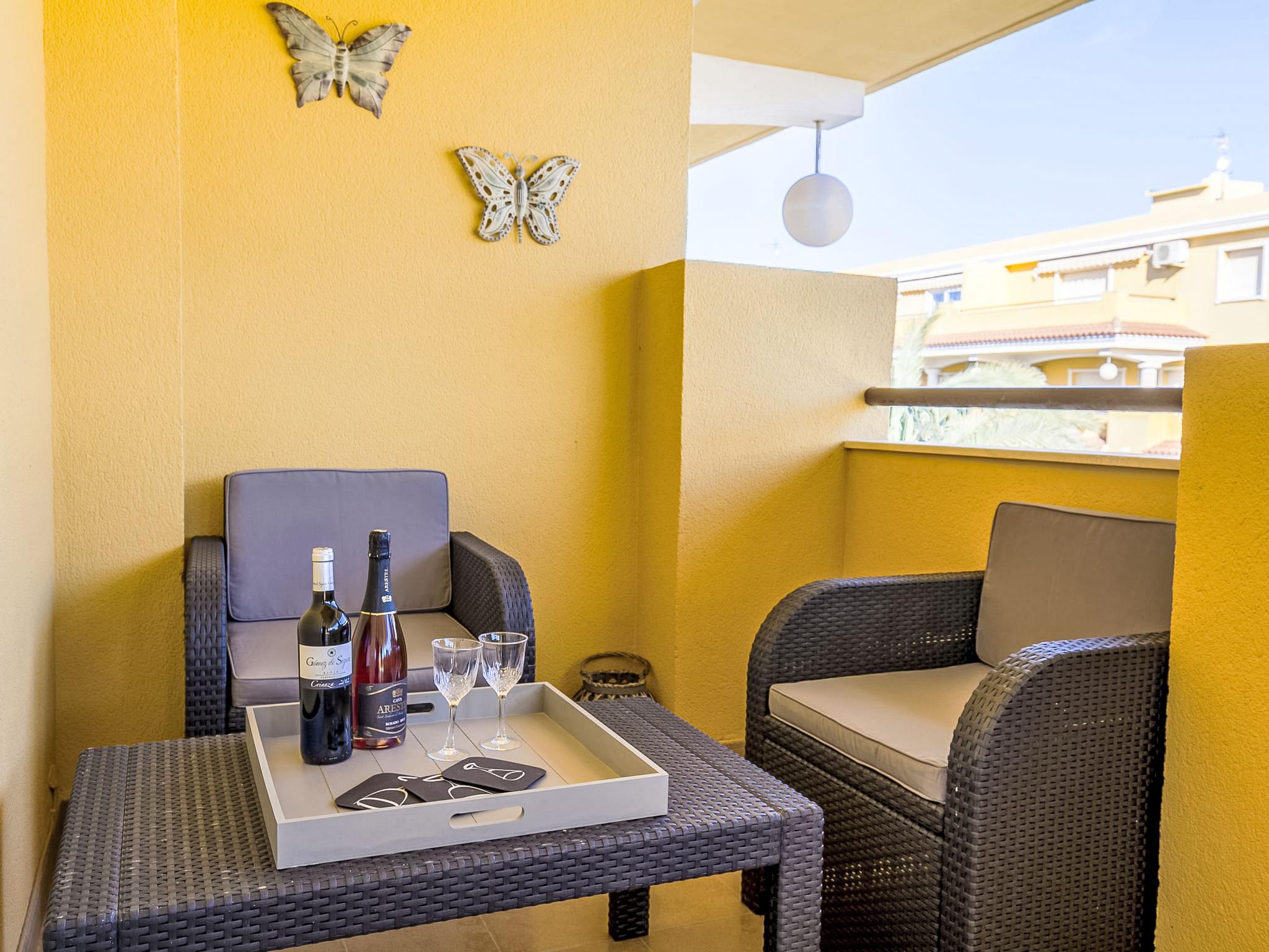 "Cascadas de la Marina", 3-room apartment 63 m2 on 3rd floor. Comfortable and modern furnishings: living/dining room with satellite TV, hi-fi system, air conditioning and forced-air heating. Exit to the terrace. 1 double bedroom with 2 beds (90 cm, length 190 cm), air conditioning and forced-air heating. 1 room with 1 french bed (150 cm, length 190 cm), air conditioning and forced-air heating. Open kitchen (oven, microwave, freezer). Shower/WC. Large terrace 45 m2, terrace 16 m2, roofed. Terrace furniture, deck chairs. View of the sea, the swimming pool and the garden. Facilities: washing machine, iron. Internet (WiFi, free). Garage space n 51. CV-VUT0424810-A // Reg. Nr.: ESFCTU00000304500055580500000000000000CV-VUT0427810A8