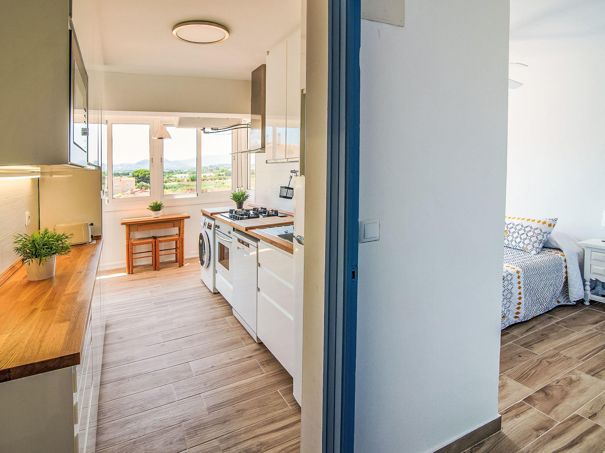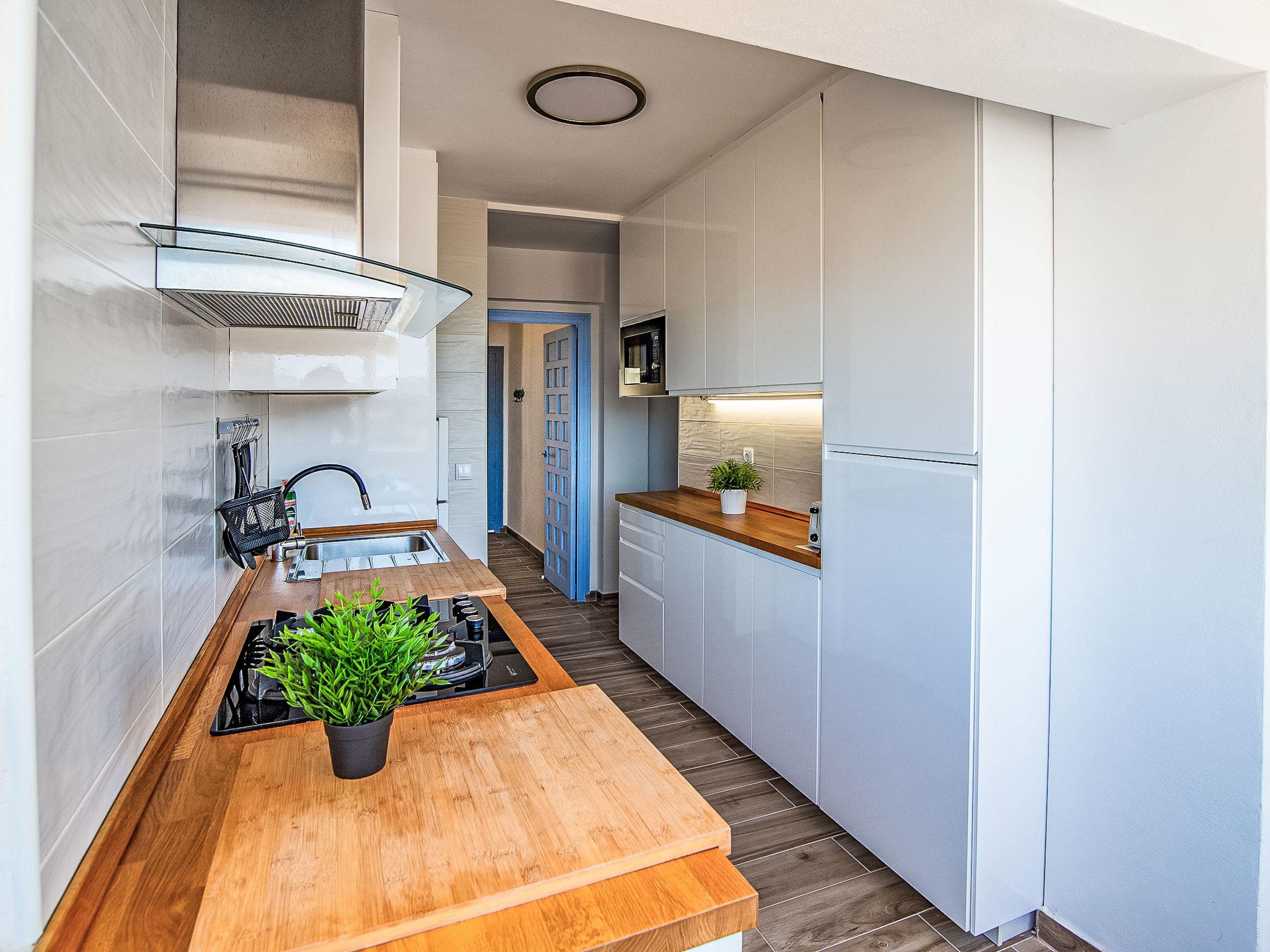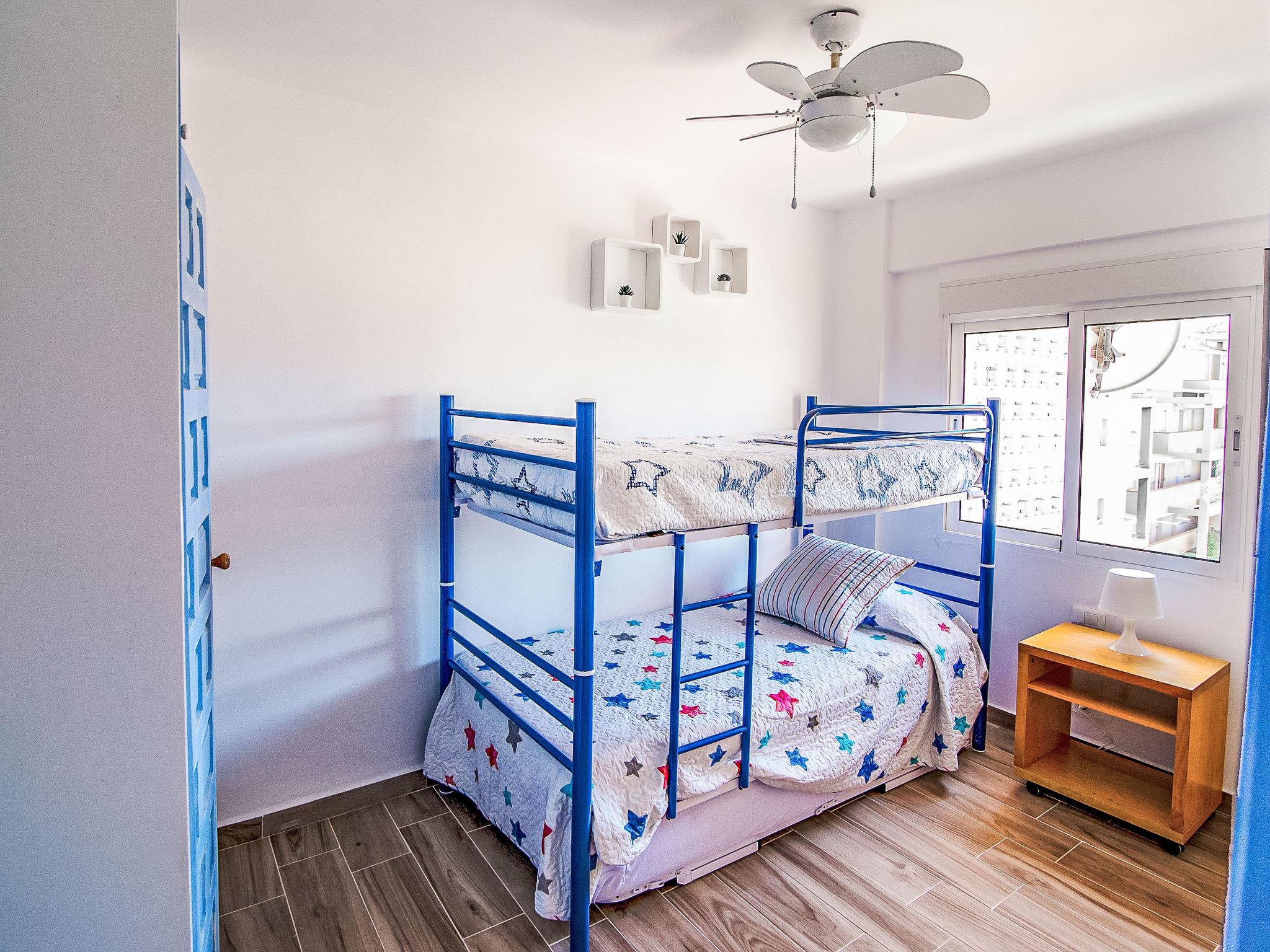 "Golden Park", 3-room apartment 60 m2. Spacious and bright, renovated, very beautiful and stylish furnishings: living/dining room with digital TV. Exit to the terrace. 1 room with 1 french bed (150 cm, length 200 cm), fan. 1 room with 1 x 2 bunk beds (80 cm, length 180 cm), fan. Kitchen (oven, dishwasher, 4 gas rings, toaster, microwave, freezer). Shower/bidet/WC. Large terrace. Terrace furniture. Beautiful view of the mountains and the swimming pool. Facilities: washing machine, iron, hair dryer. Parking. Please note: TV only ES. CV-VUT0494569-A // Reg. Nr.: ESFCTU0000030450002470070000000000000CV-VUT0494569-A2