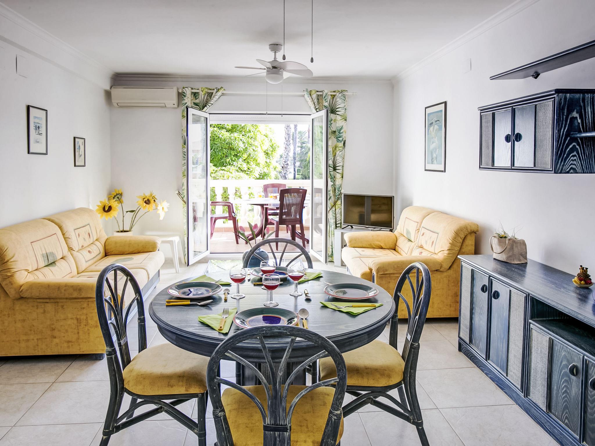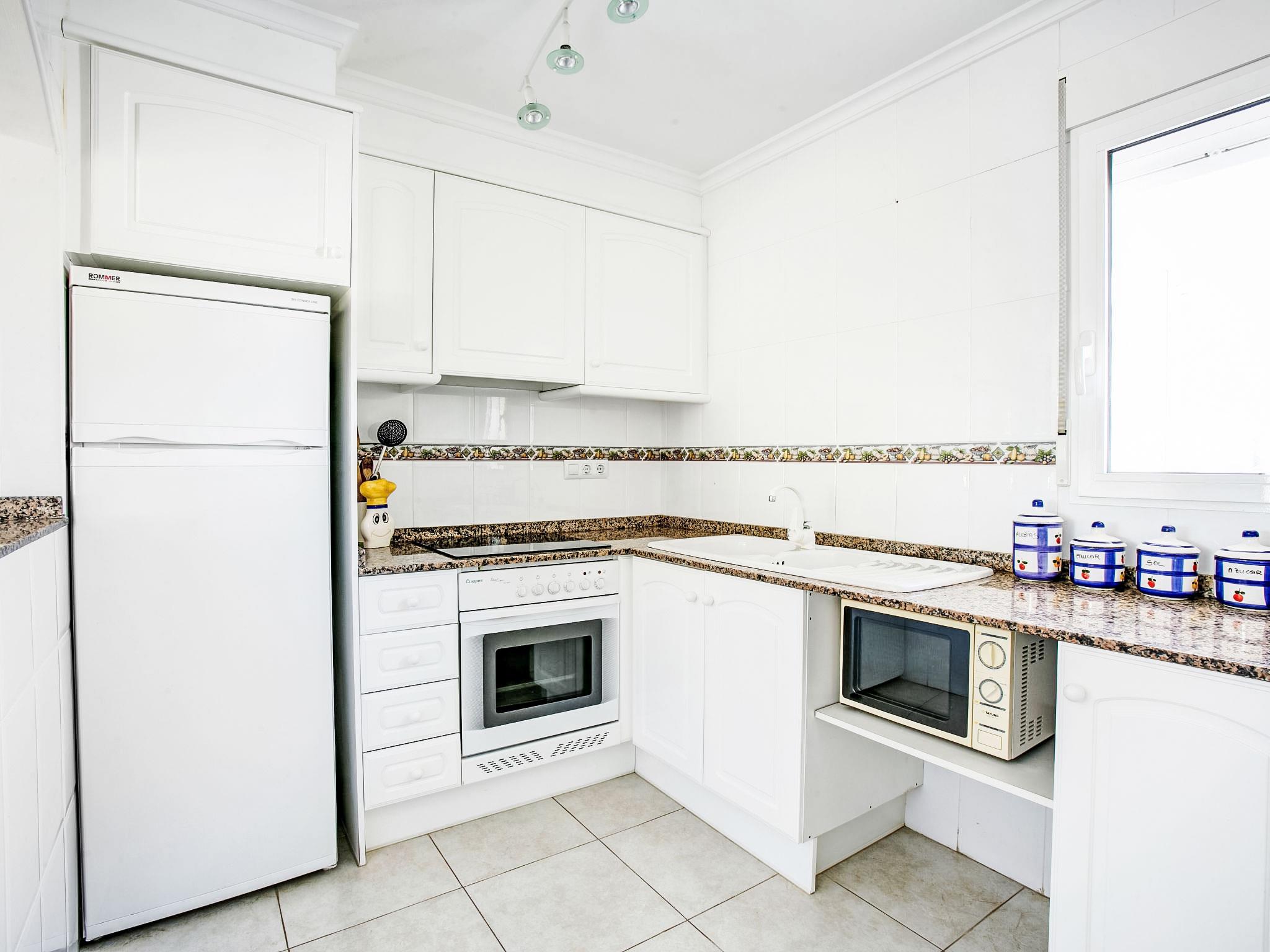 "La Giralda", 3-room apartment 69 m2 on 1st floor. Bright, practical furnishings: living/dining room with digital TV, flat screen, air conditioning and forced-air heating. Exit to the terrace. 1 room with 1 french bed (150 cm), air conditioning and forced-air heating. 1 room with 2 beds (90 cm, length 180 cm), electric heater. Kitchen (oven, 4 ceramic glass hob hotplates, toaster, kettle, microwave, freezer, electric coffee machine). Shower/WC. Terrace 10 m2. Terrace furniture. View of the swimming pool and the garden. Facilities: washing machine, iron, children's high chair, baby cot, hair dryer. Internet (WiFi, free). Please note: TV only ES. AT-458578-A // Reg. Nr.: ESFCTU00000304500056492000000000000000000AT-458578-A1
