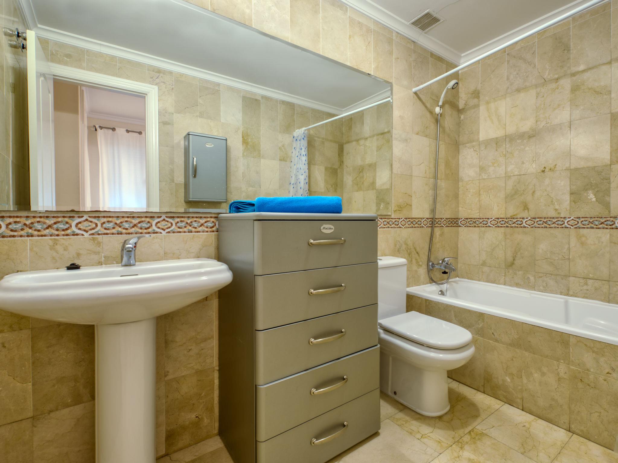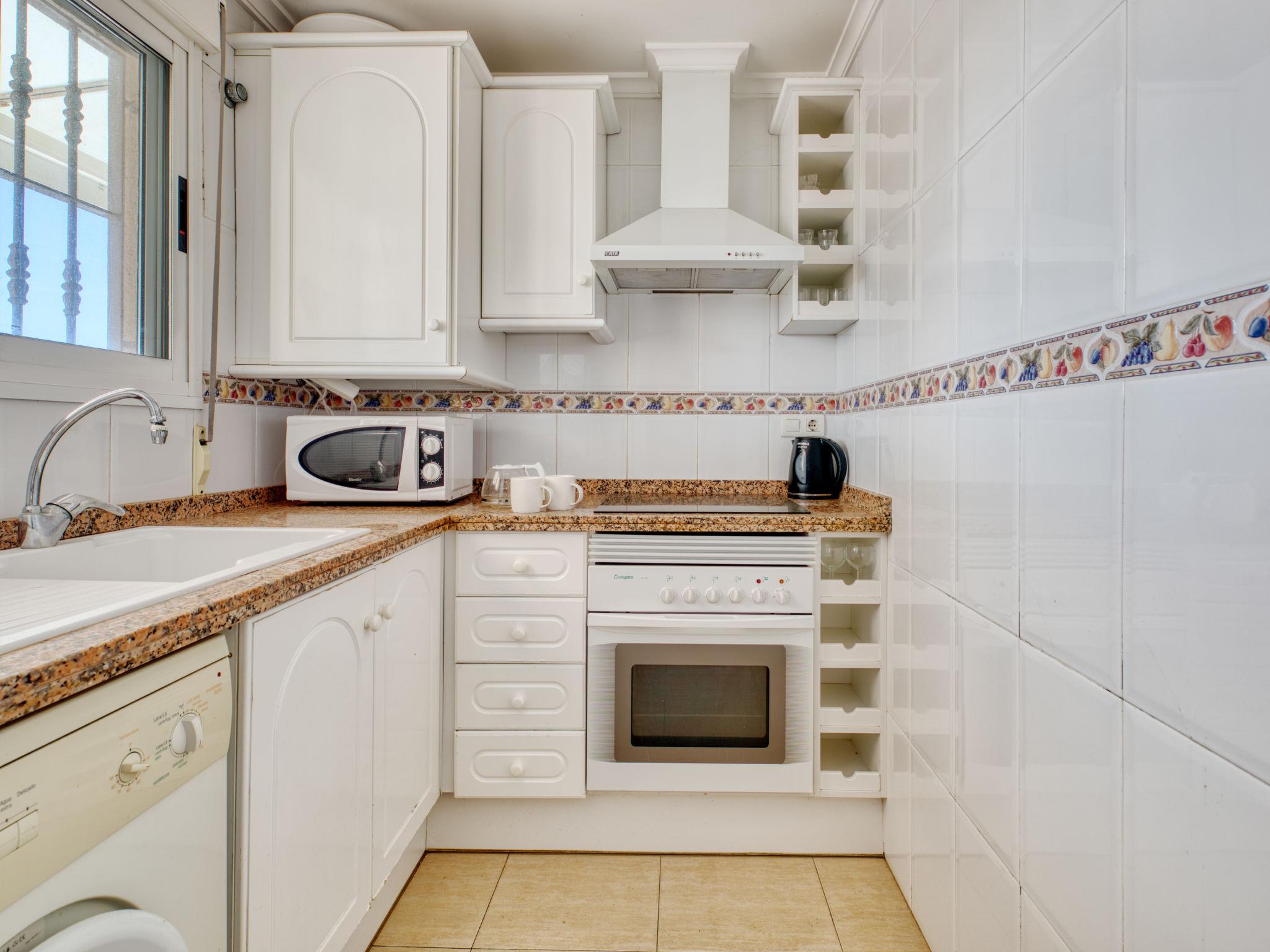 "Bahia Blanca", 2-room penthouse 50 m2 on 3rd floor. Practical and cosy furnishings: living/dining room with 1 sofabed, digital TV, international TV channels, flat screen, air conditioning and forced-air heating. Exit to the terrace. 1 room with 1 french bed, bath/WC and electric heating. Kitchen (oven, 3 ceramic glass hob hotplates, toaster, kettle, microwave, freezer, electric coffee machine). Terrace partly roofed. Terrace furniture. View of the swimming pool and the garden. Facilities: washing machine, iron, children's high chair, baby cot for up to 2 year olds, hair dryer. Internet (WiFi, free). Parking space n 13. Maximum 1 pet/ dog allowed. CV-VUT0434565A // Reg. Nr.: ESFCTU000003045000538822000000000000000CV-VUT434565A5